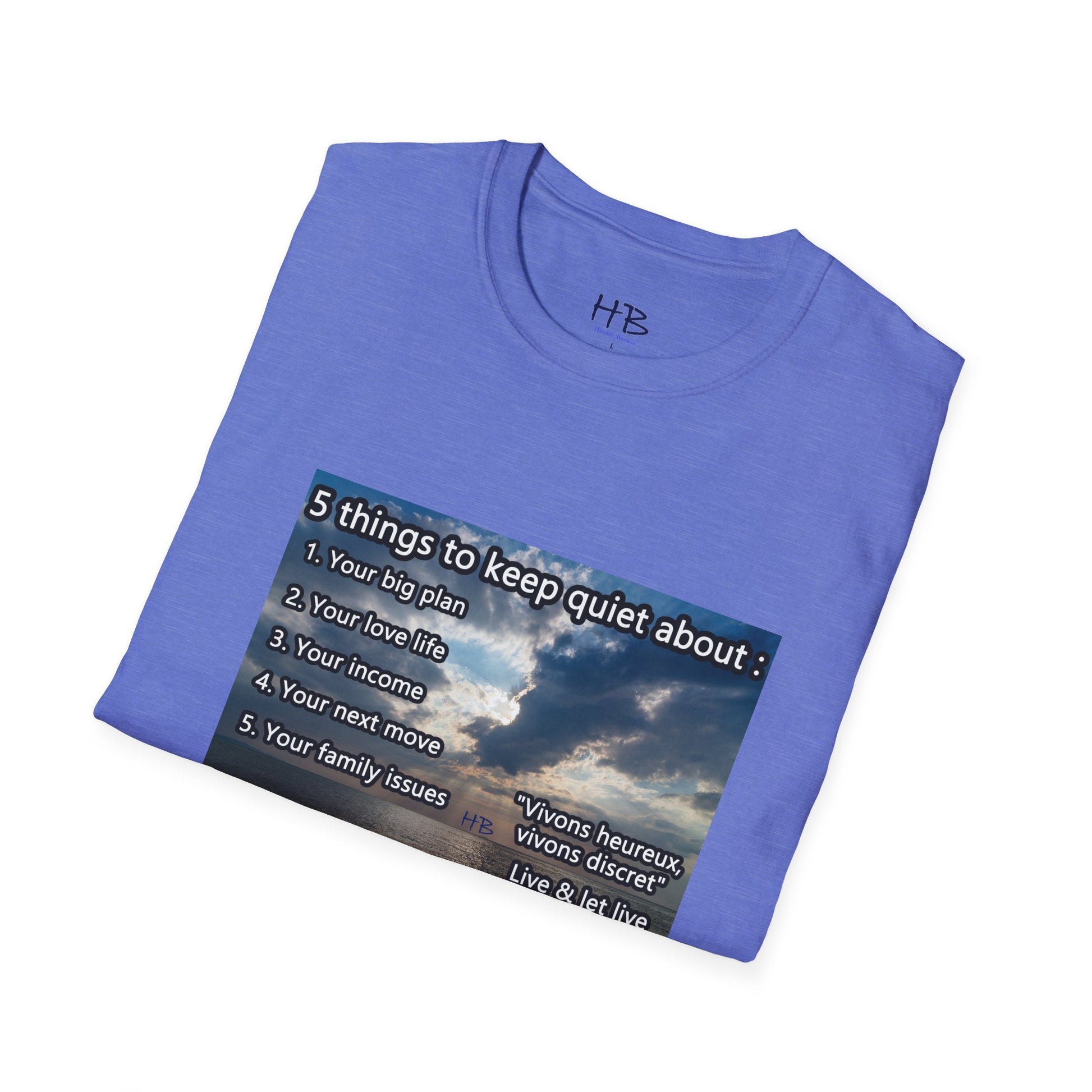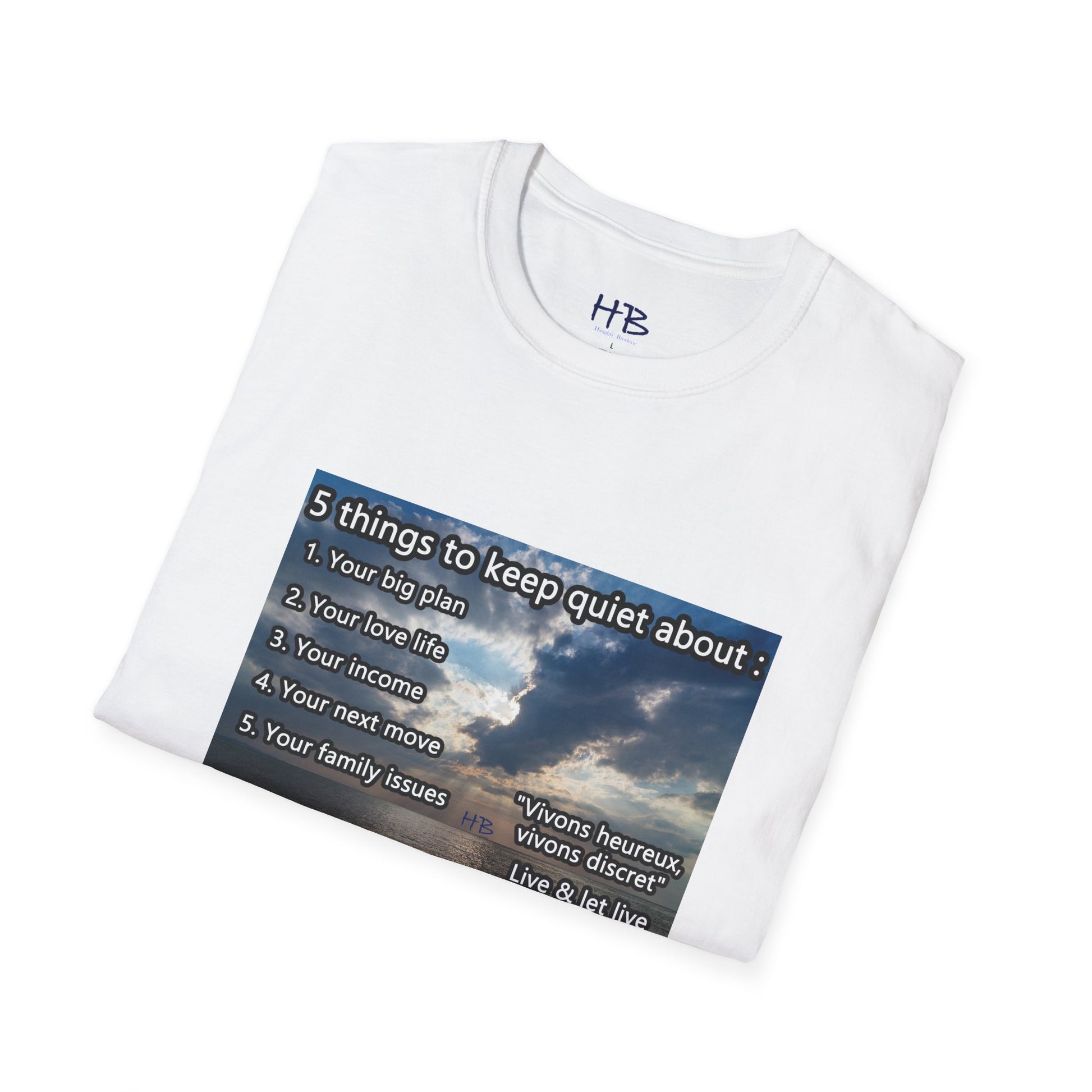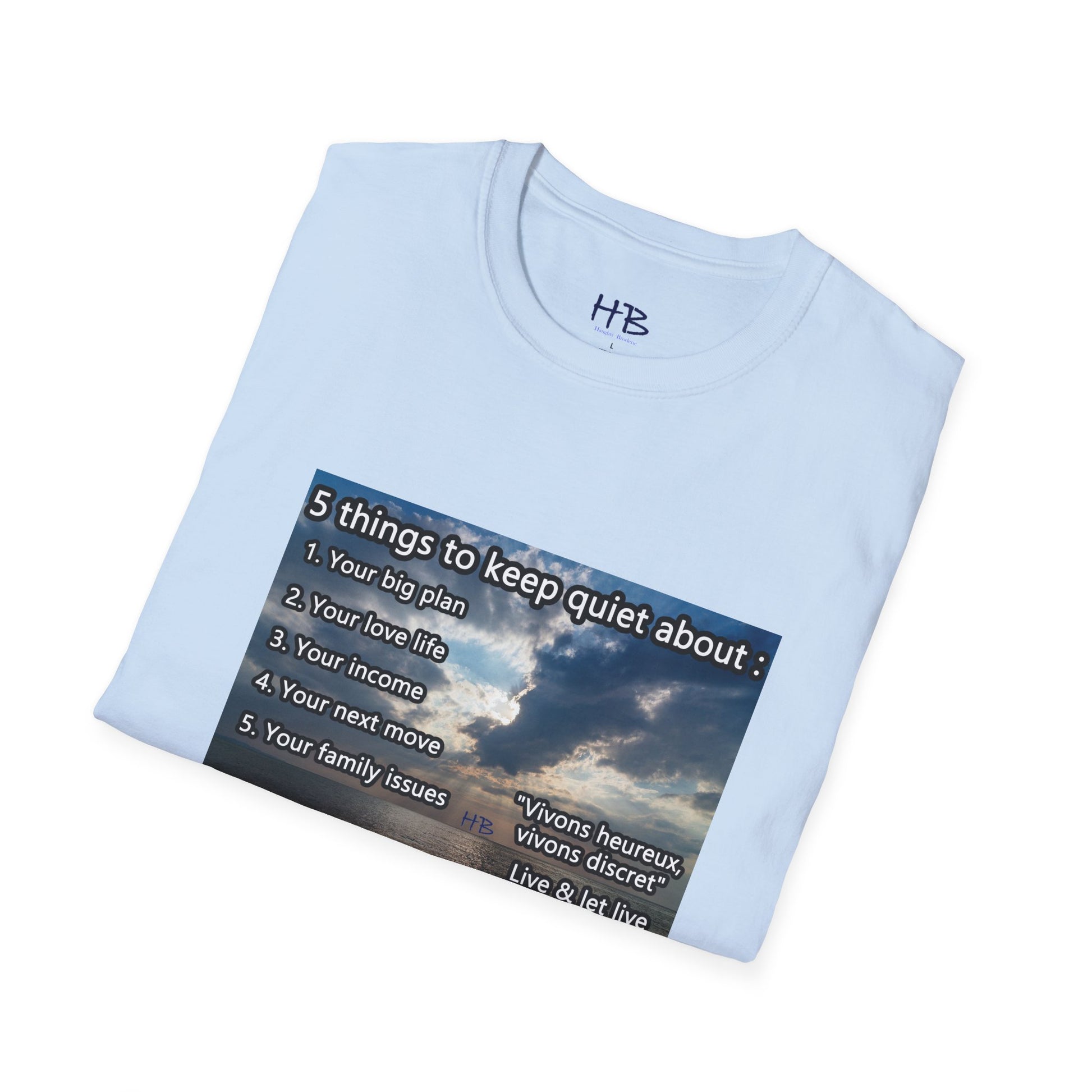 Introducing our gorgeous tee shirt featuring a stunning backdrop of a breathtaking sunset, complete with vast and billowy clouds that will surely take your breath away. The design includes a thought-provoking message, with the text reading "5 Things to Keep Quiet About", reminding you of the importance of discretion in certain aspects of your life. The message is crystal clear, reminding you to keep your big plans, love life, income, next move, and family issues under wraps.