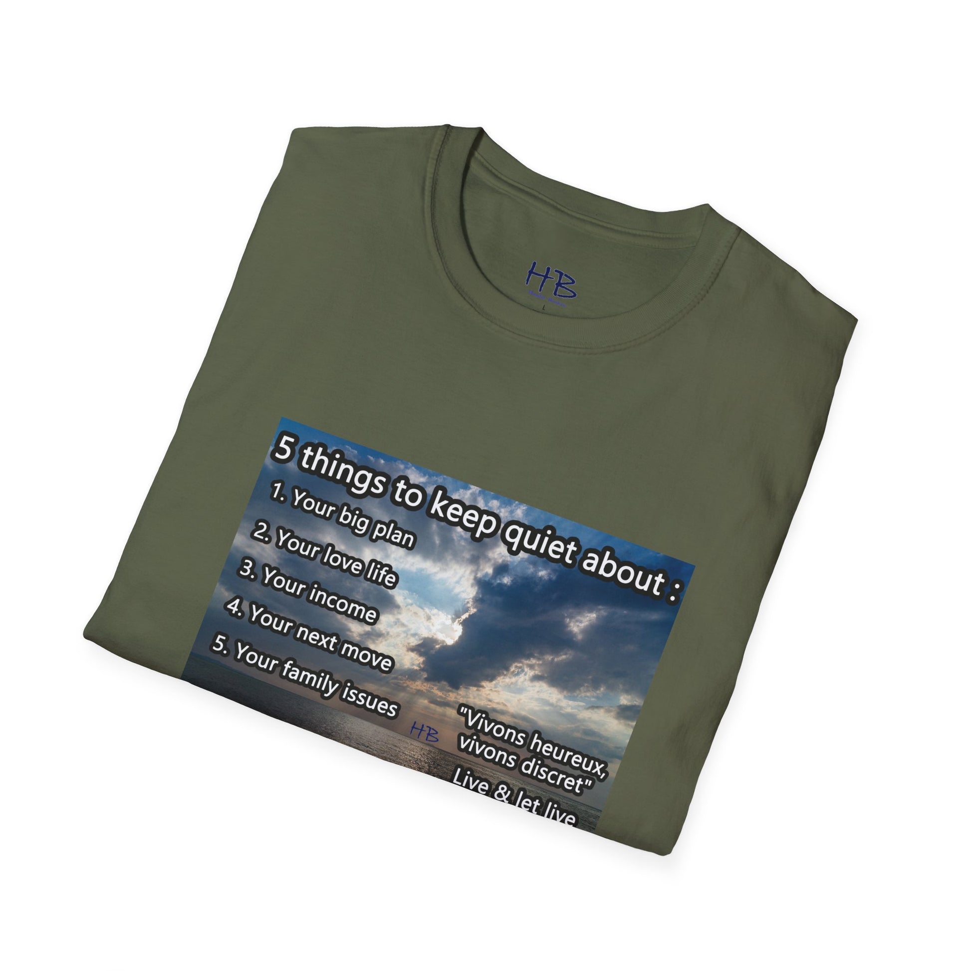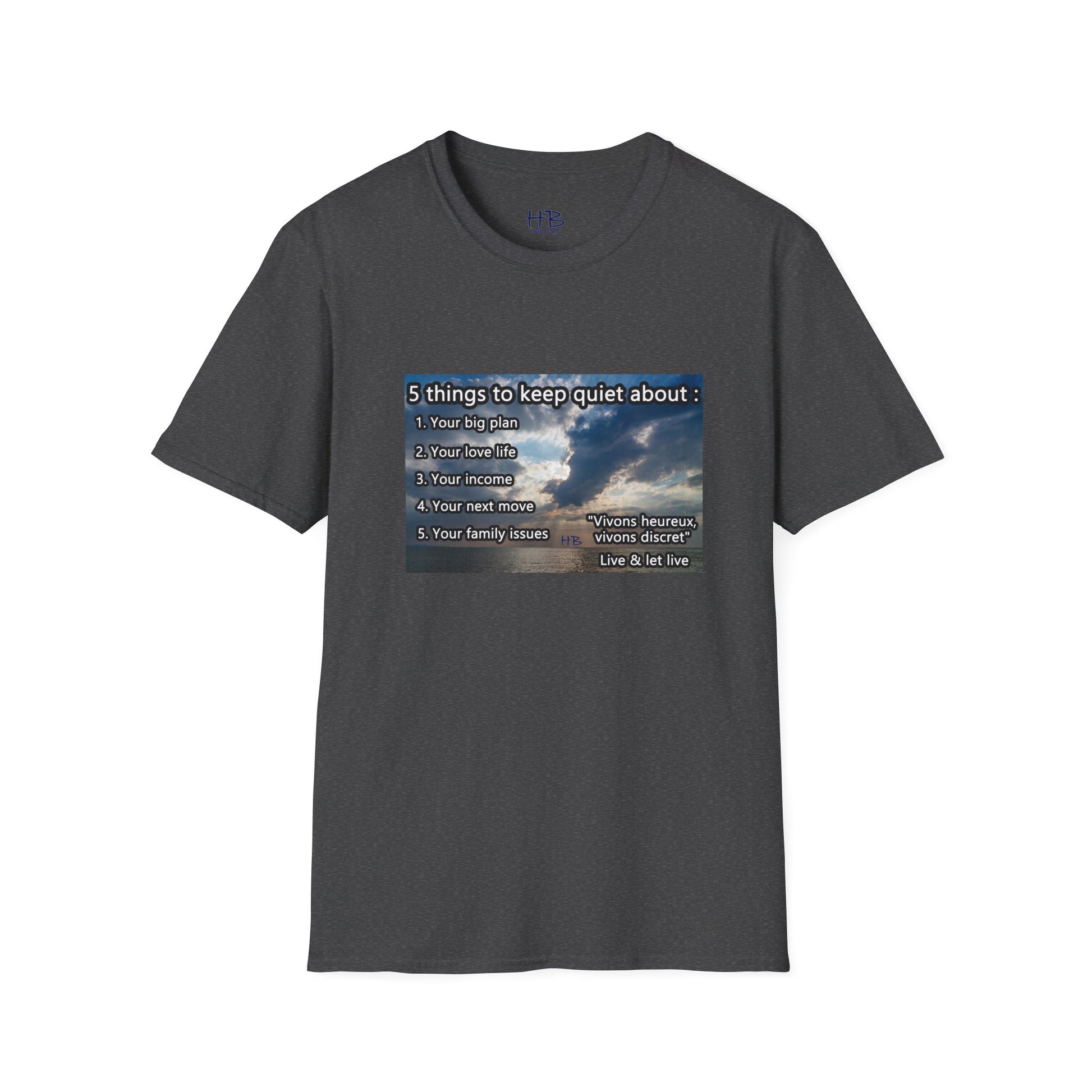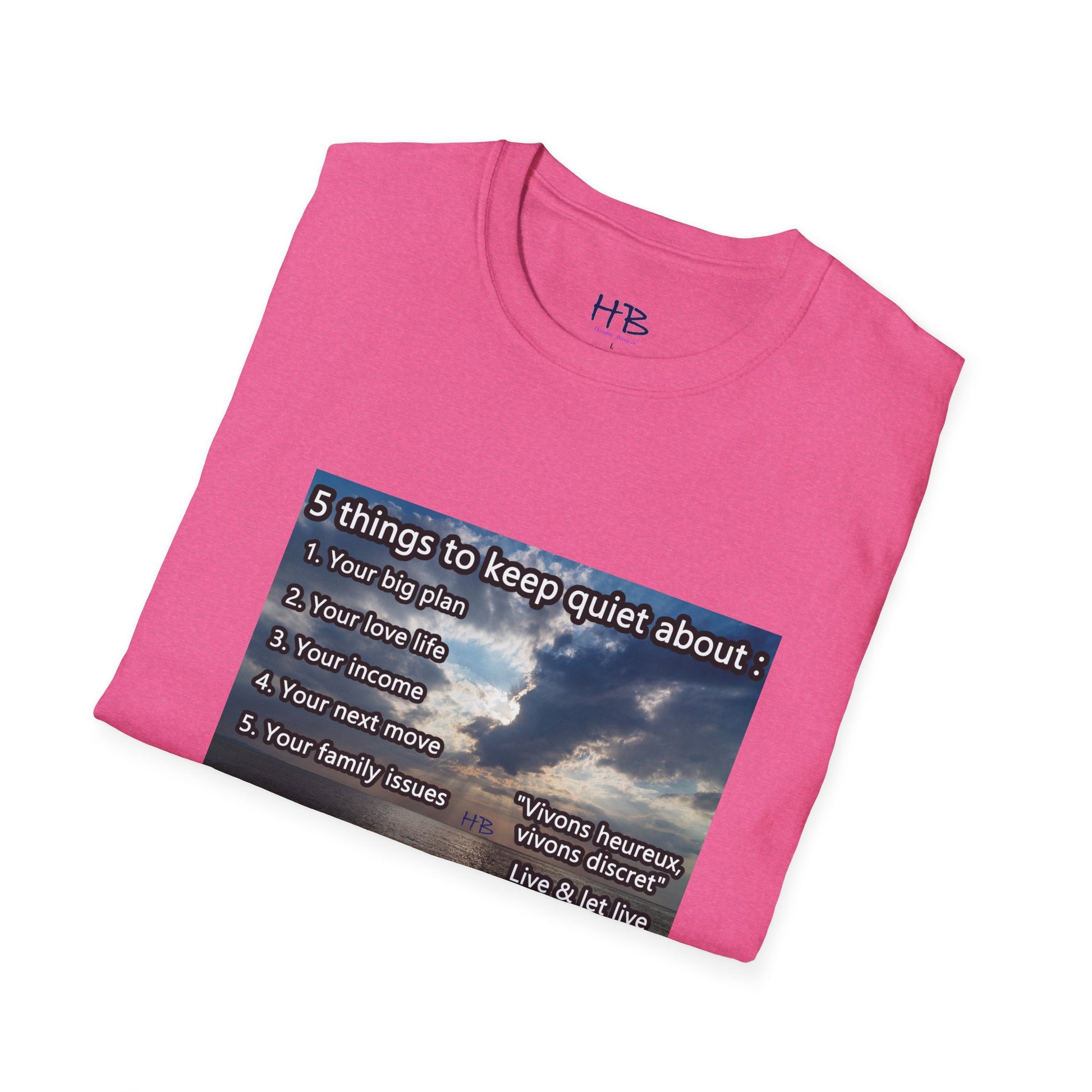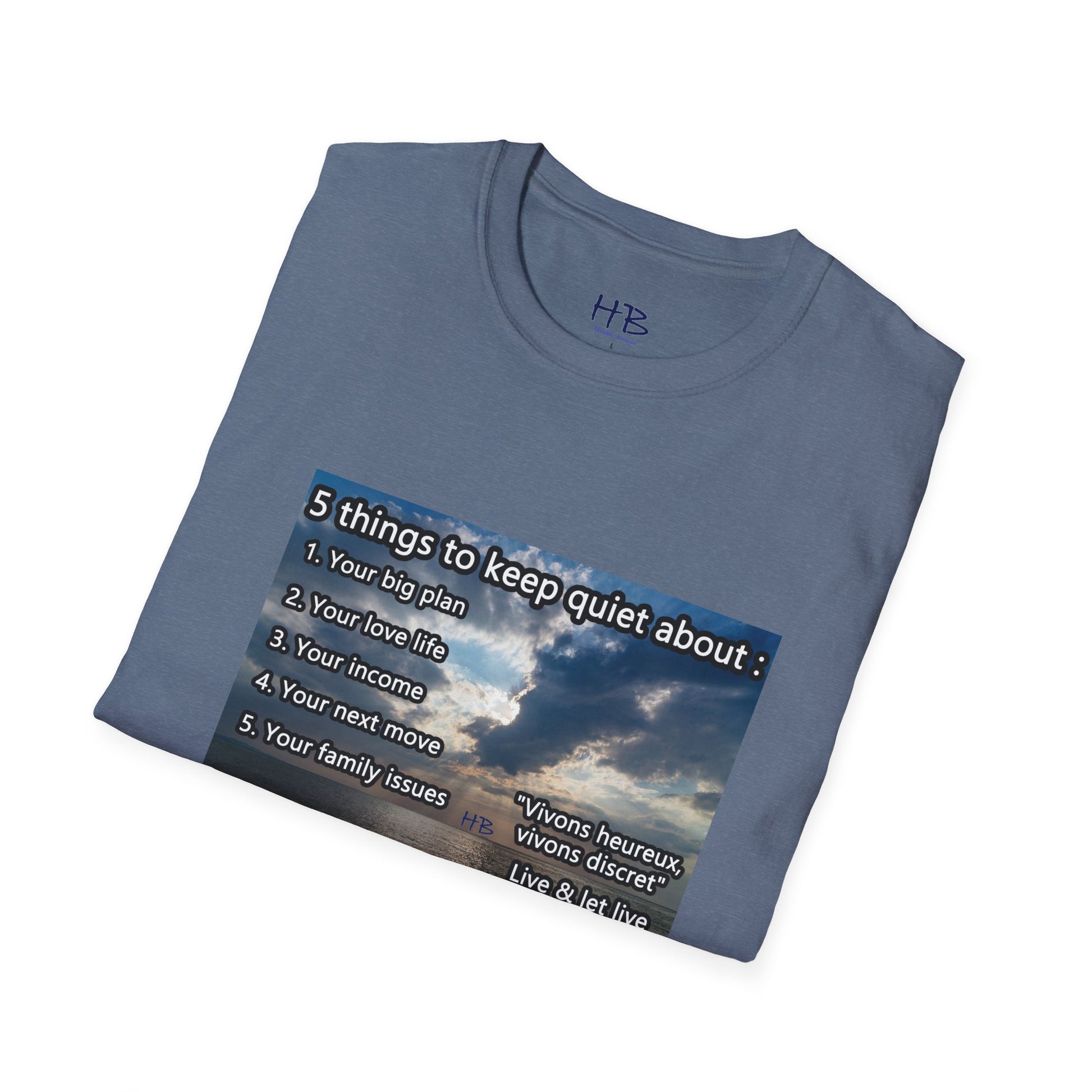 Introducing our gorgeous tee shirt featuring a stunning backdrop of a breathtaking sunset, complete with vast and billowy clouds that will surely take your breath away. The design includes a thought-provoking message, with the text reading "5 Things to Keep Quiet About", reminding you of the importance of discretion in certain aspects of your life. The message is crystal clear, reminding you to keep your big plans, love life, income, next move, and family issues under wraps.