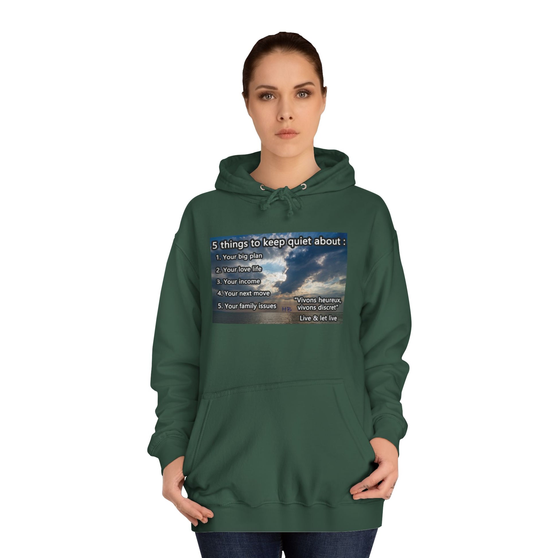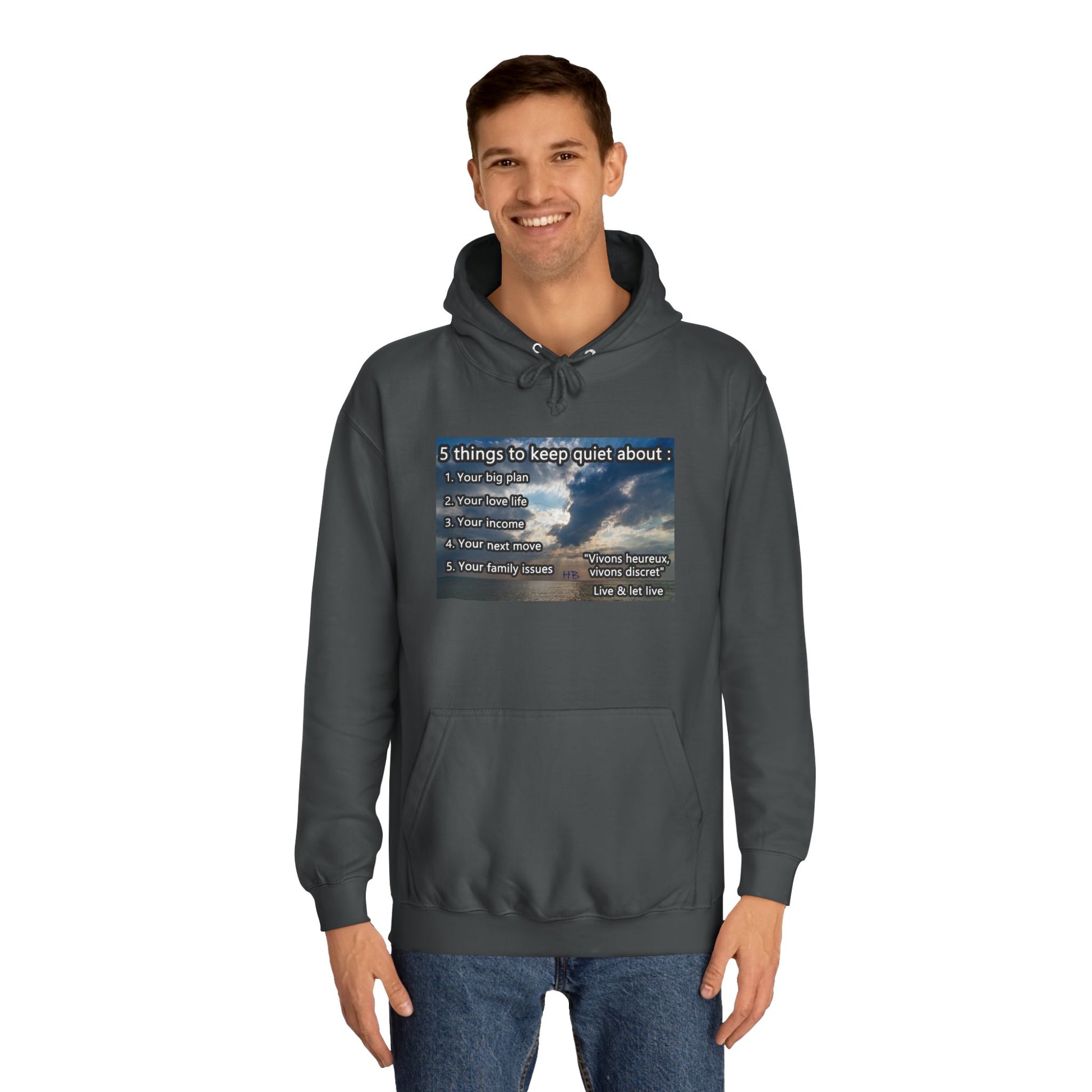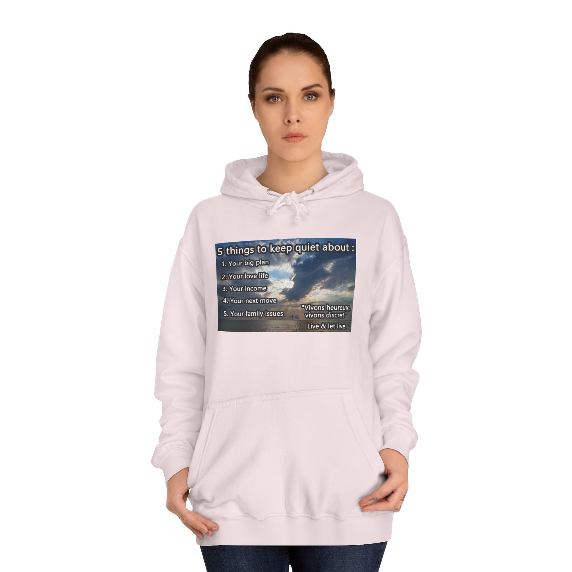 5 things to keep discret or quiet about. Vivons heureux vivons cacher/discret live and let live (Hoodie - Cozy and Durable)