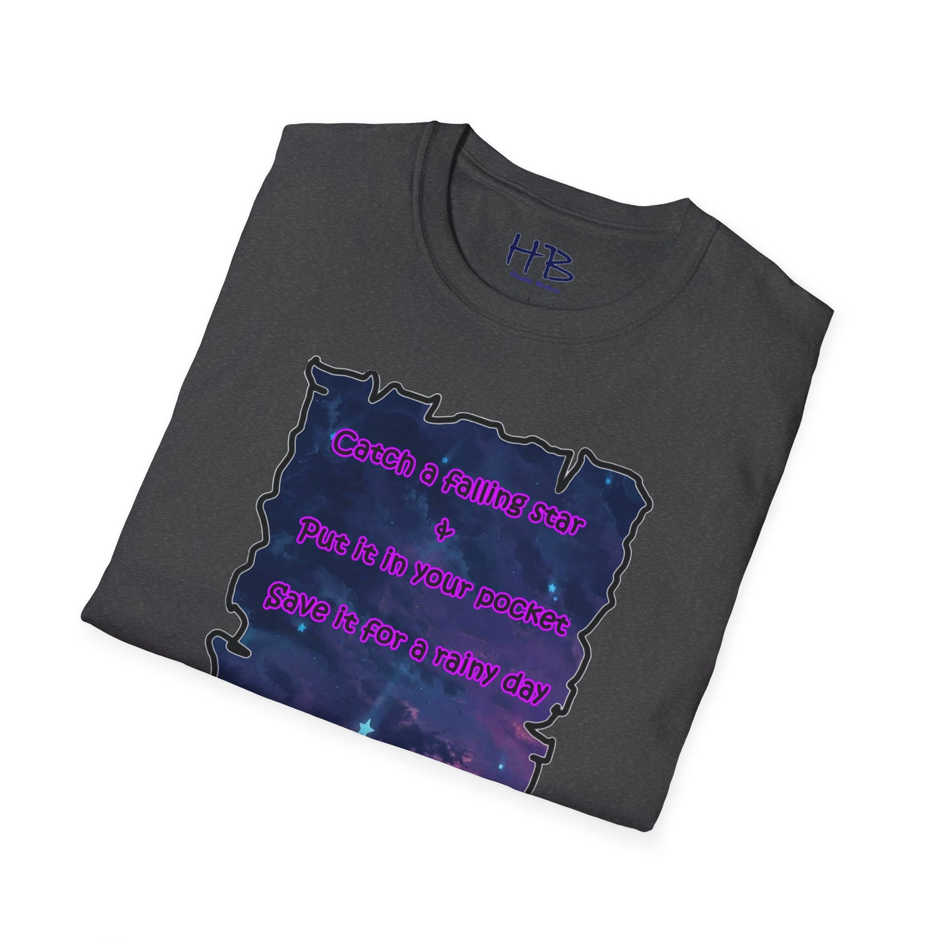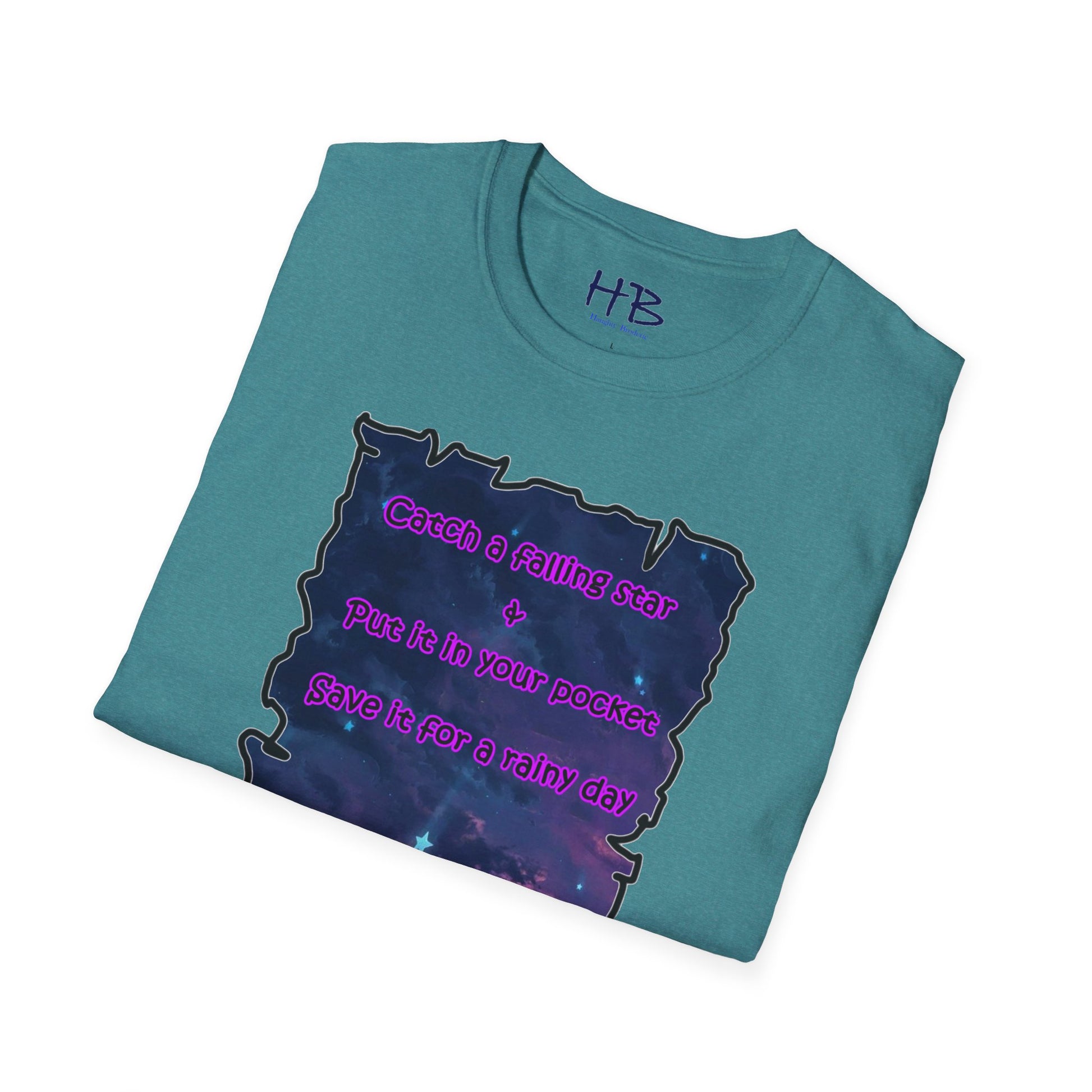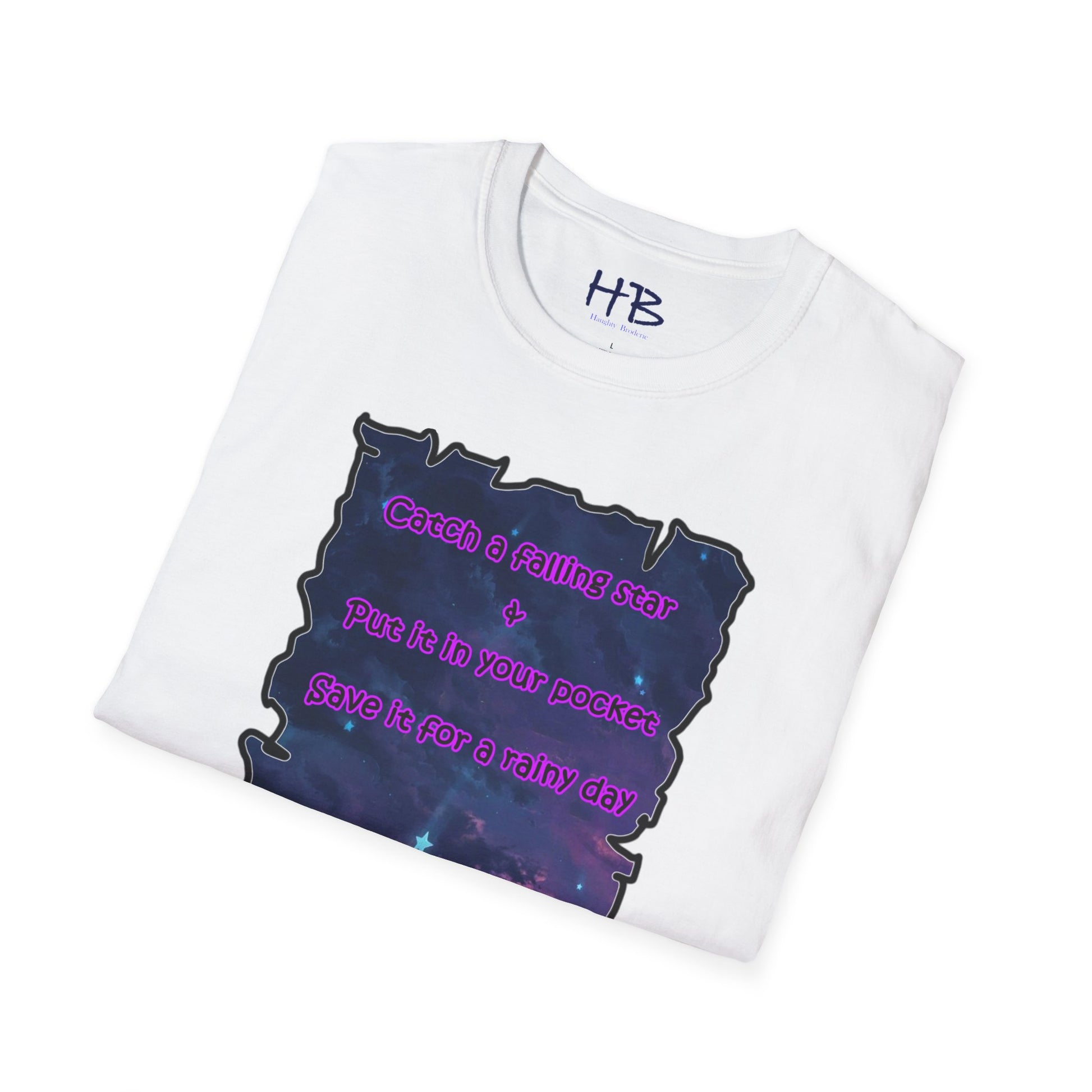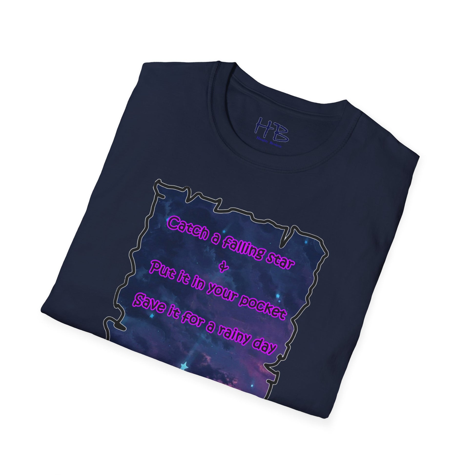 In this ethereal moment frozen in time, a single star descends gracefully from the heavens, descending into the girl's open palms. It's as if the universe itself has conspired to gift her this radiant treasure. The accompanying text emblazoned on the shirt reads, "Catch a falling star + put it in your pocket, save it for a rainy day."