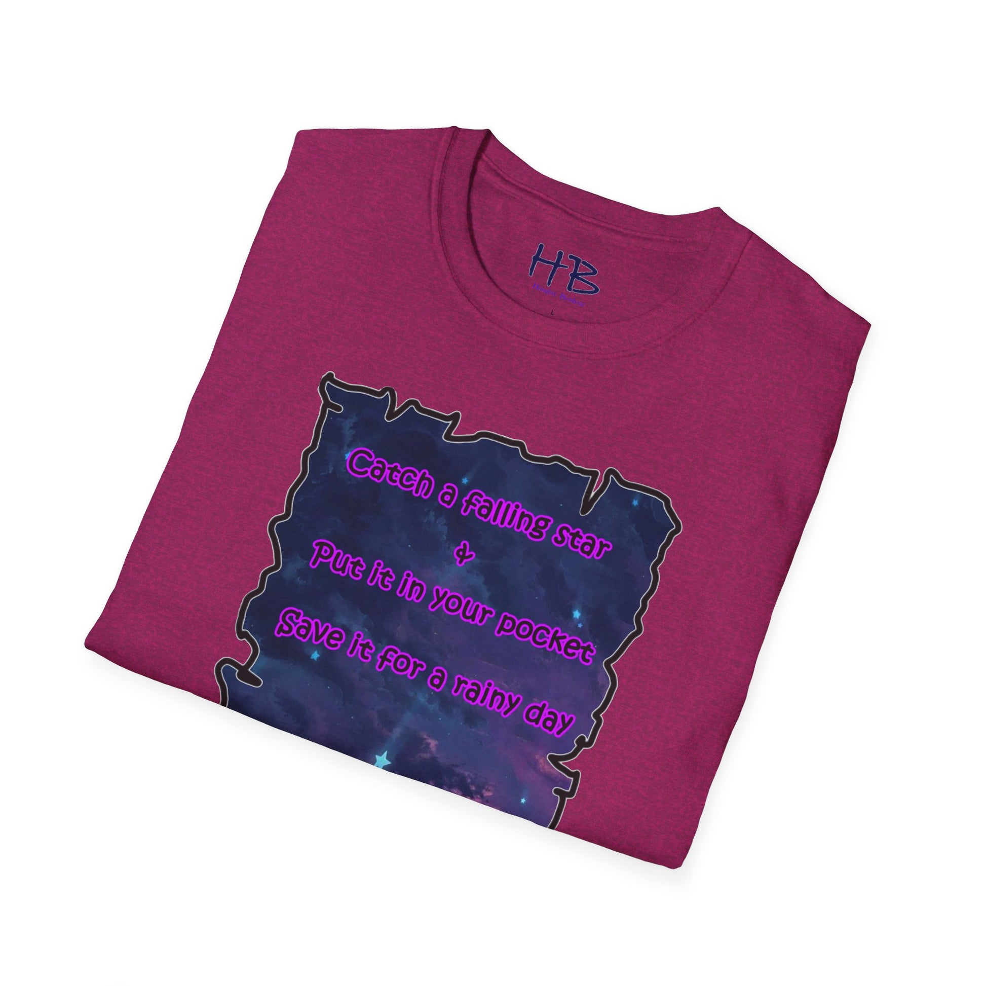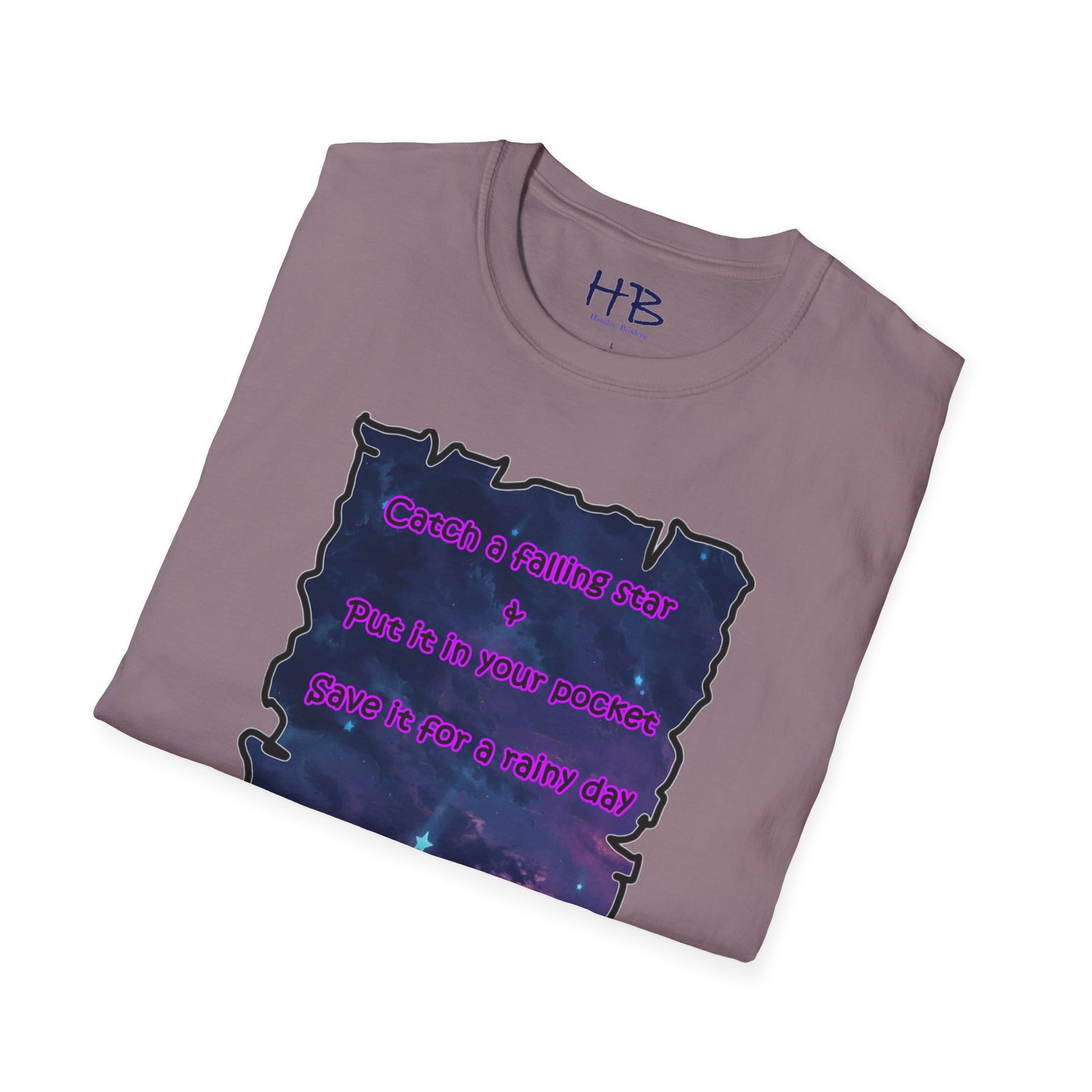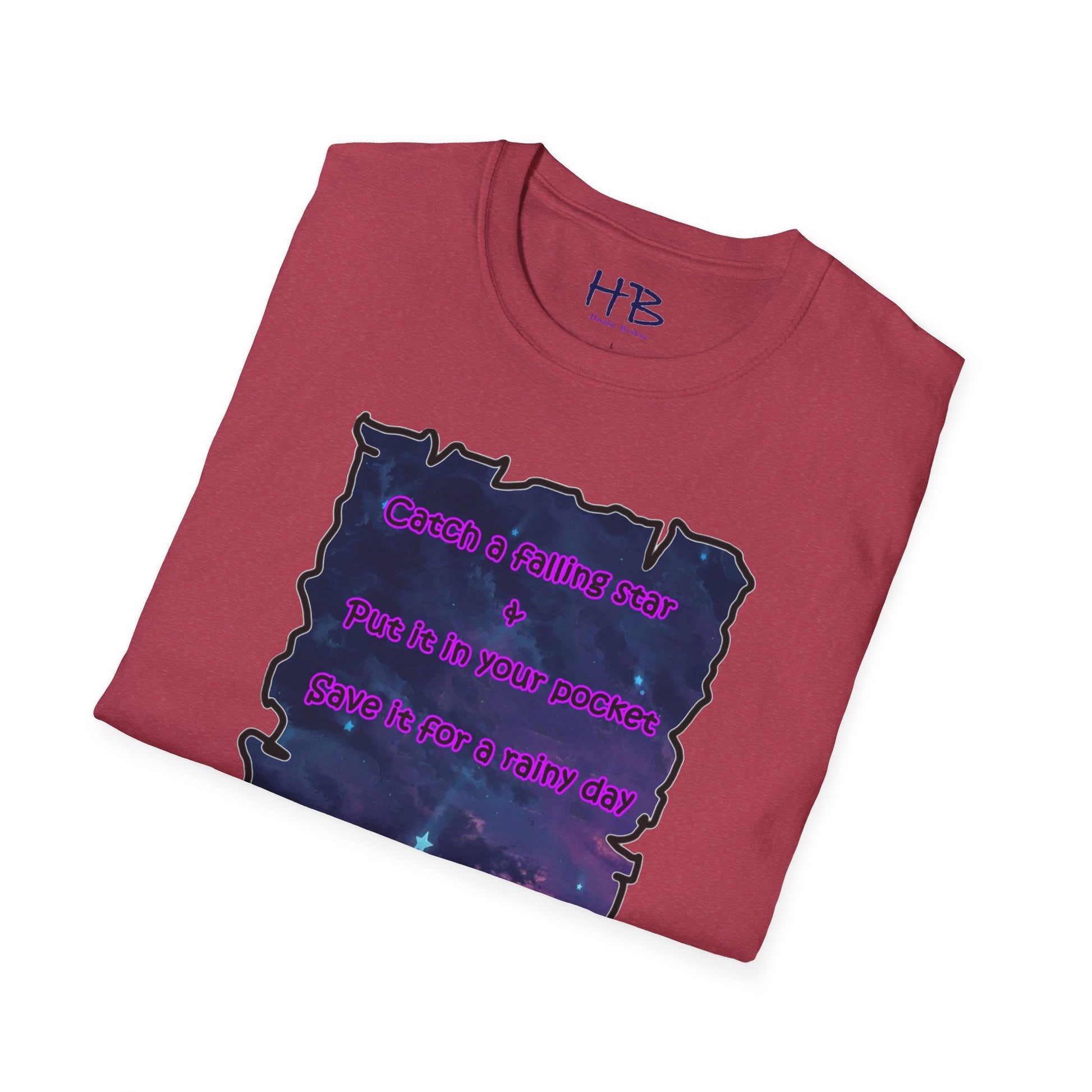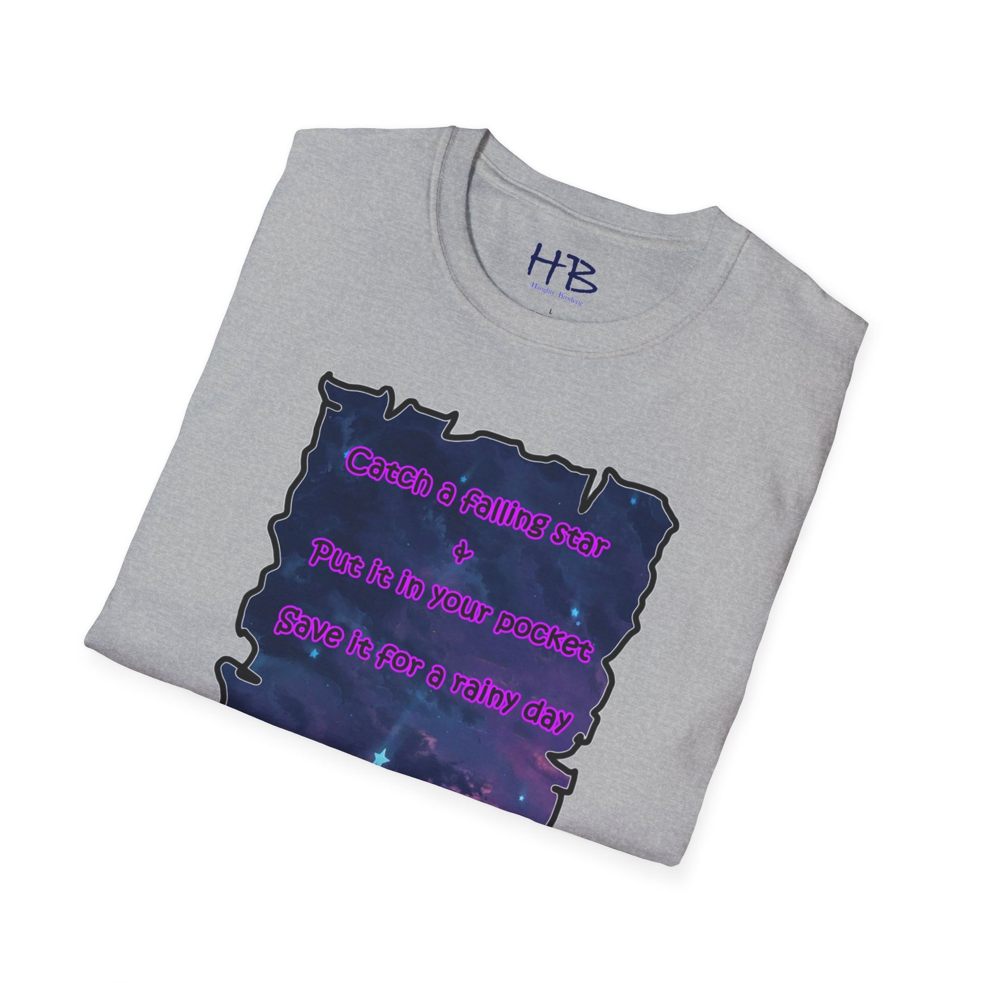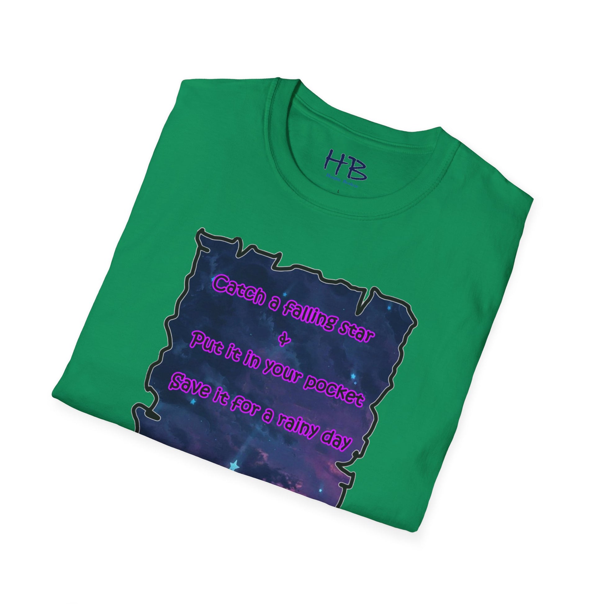 In this ethereal moment frozen in time, a single star descends gracefully from the heavens, descending into the girl's open palms. It's as if the universe itself has conspired to gift her this radiant treasure. The accompanying text emblazoned on the shirt reads, "Catch a falling star + put it in your pocket, save it for a rainy day."