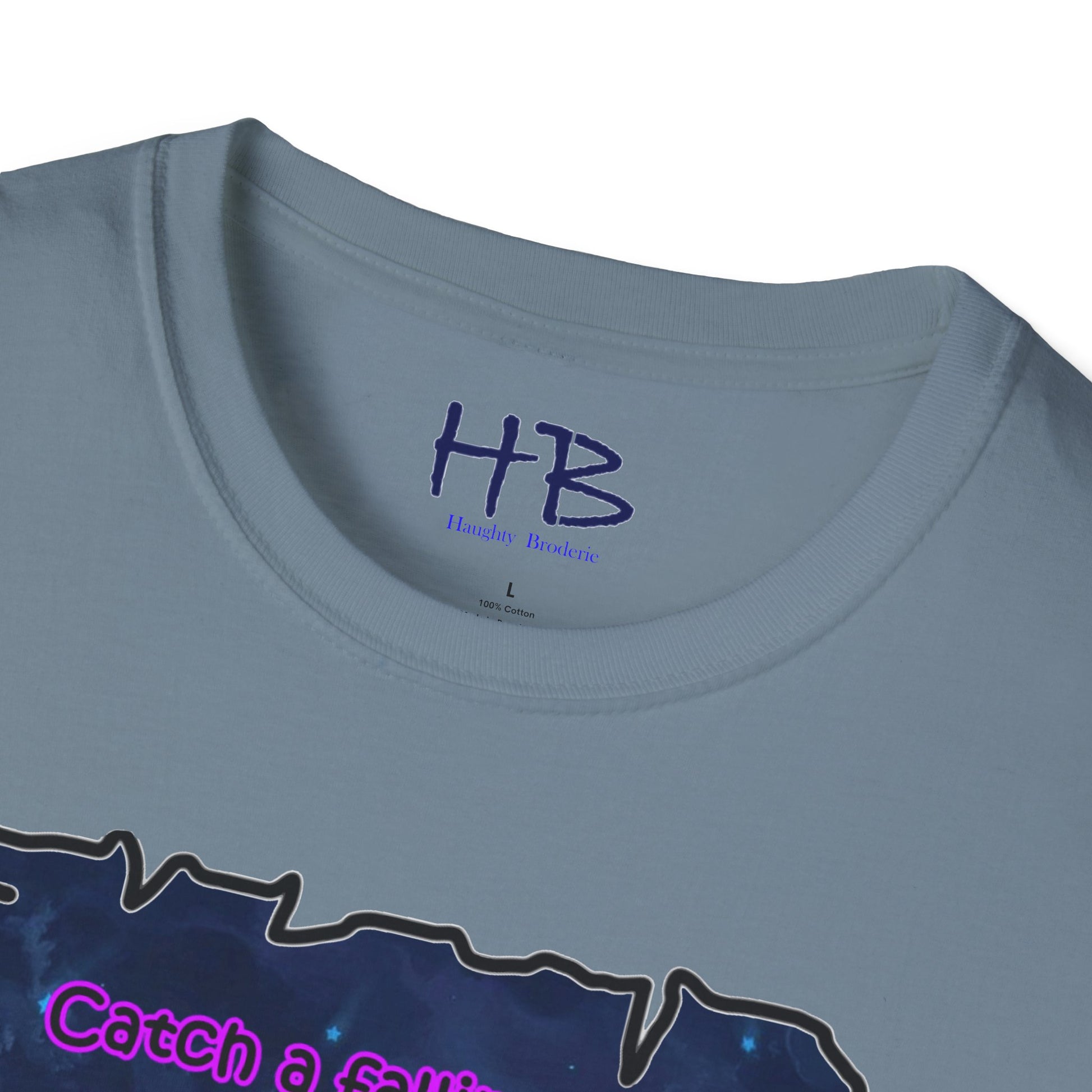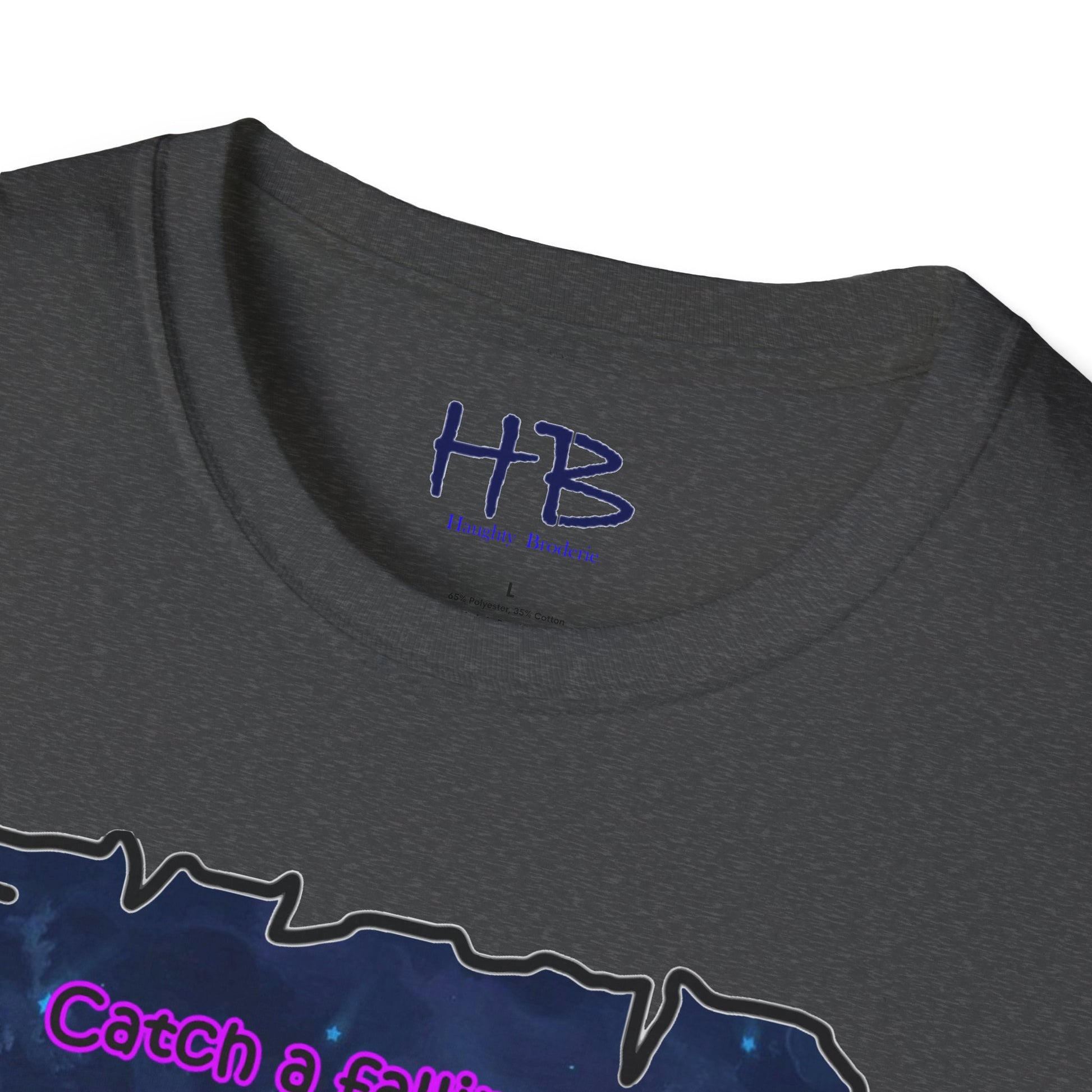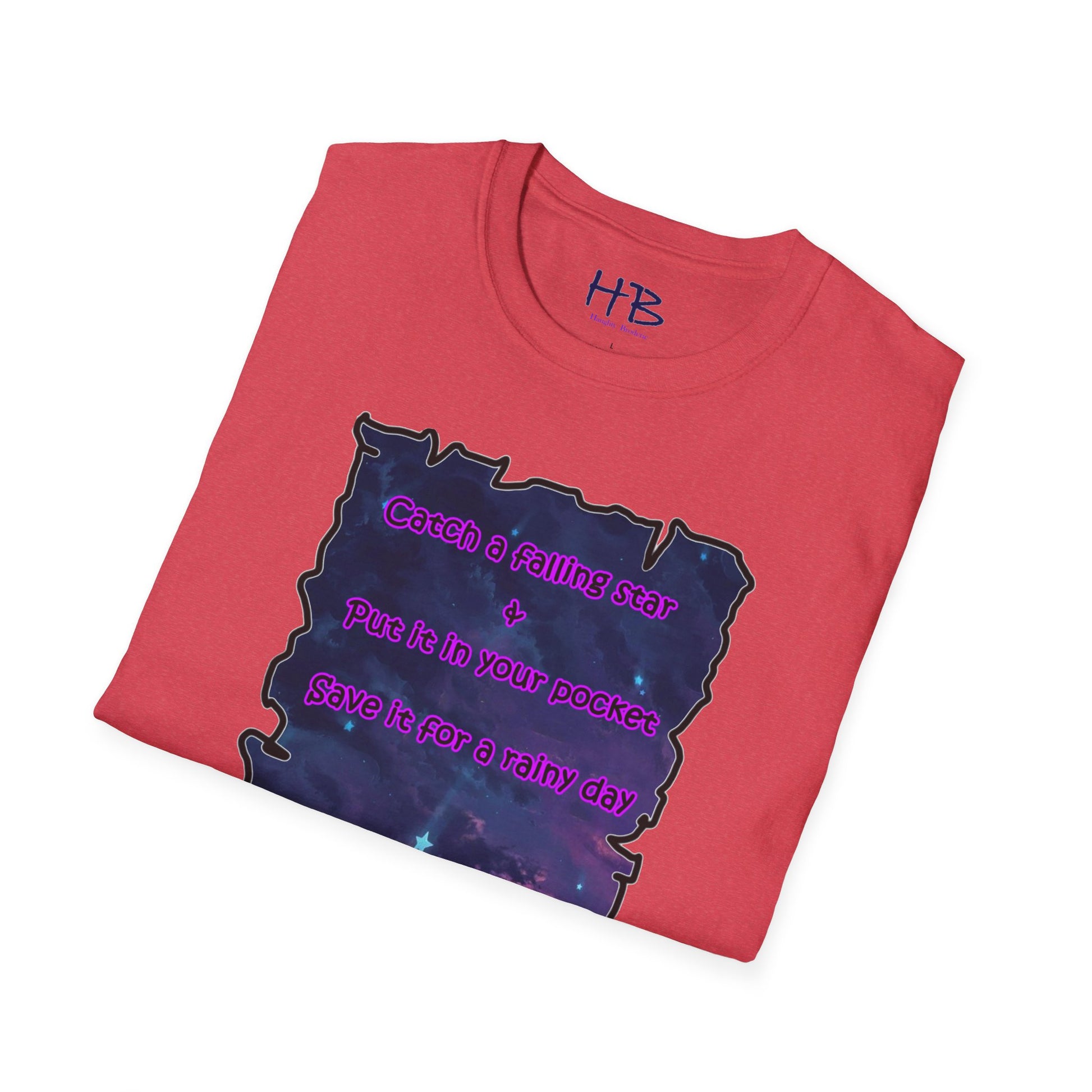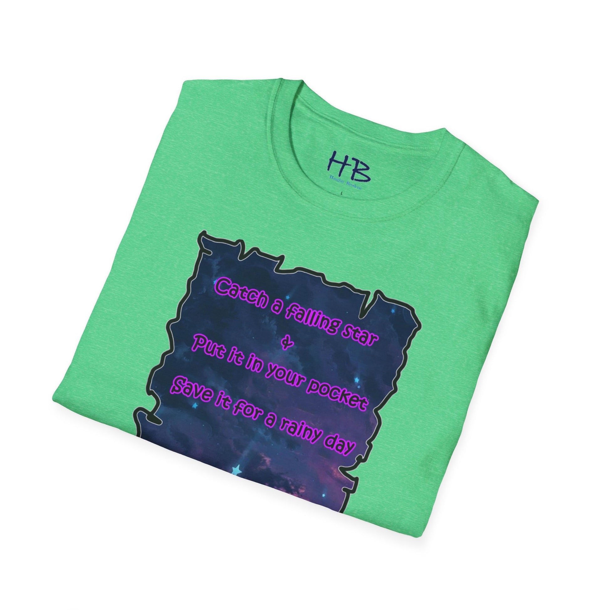 In this ethereal moment frozen in time, a single star descends gracefully from the heavens, descending into the girl's open palms. It's as if the universe itself has conspired to gift her this radiant treasure. The accompanying text emblazoned on the shirt reads, "Catch a falling star + put it in your pocket, save it for a rainy day."