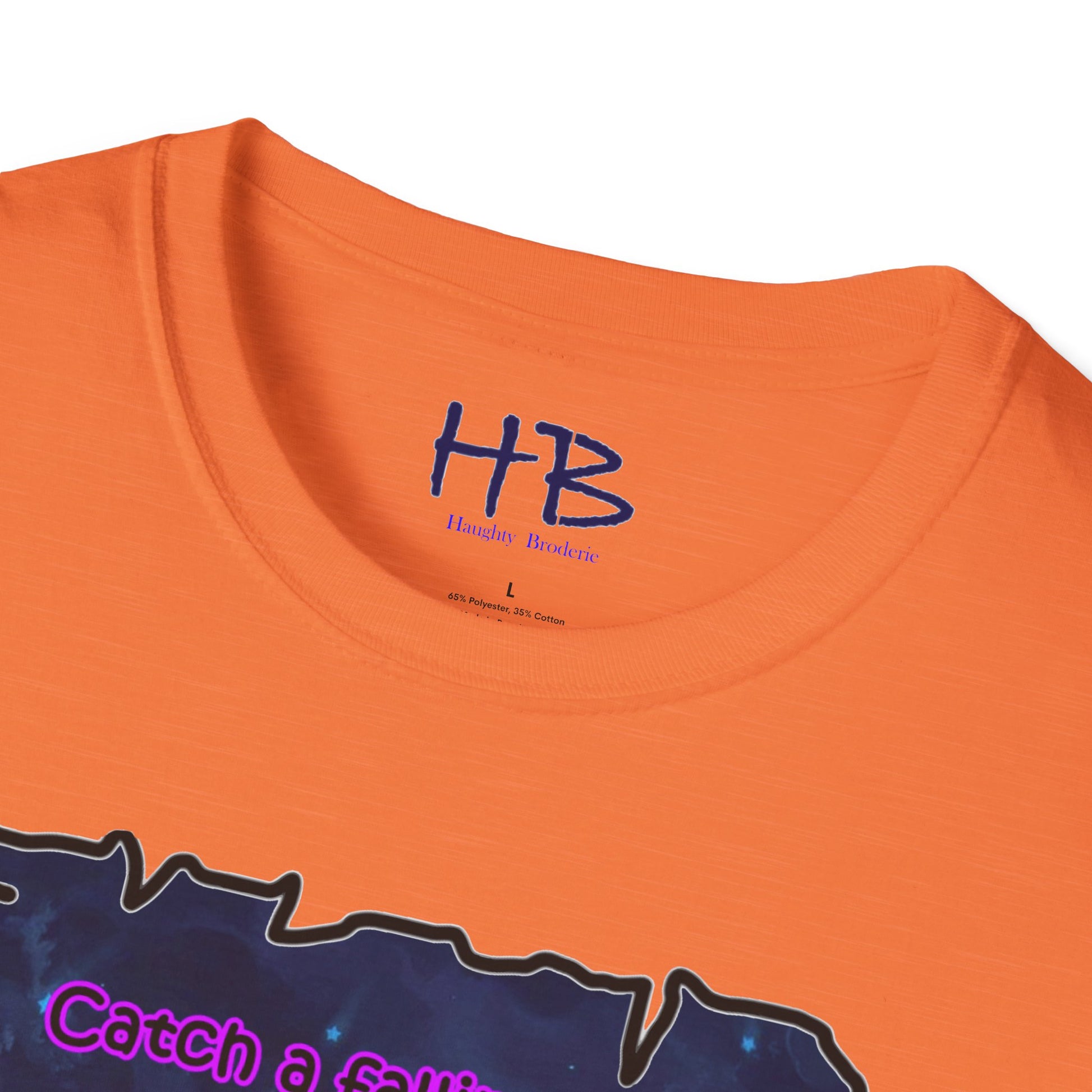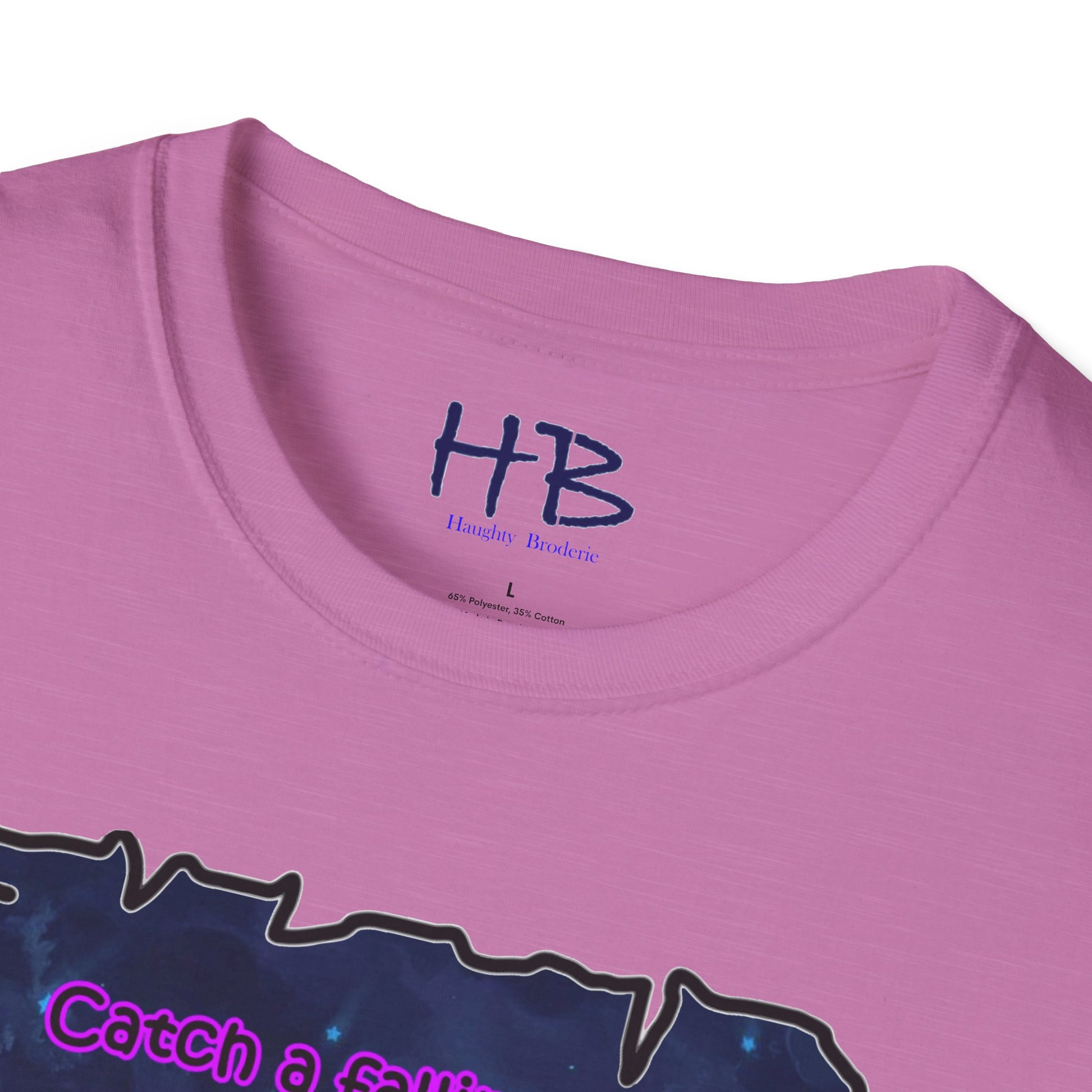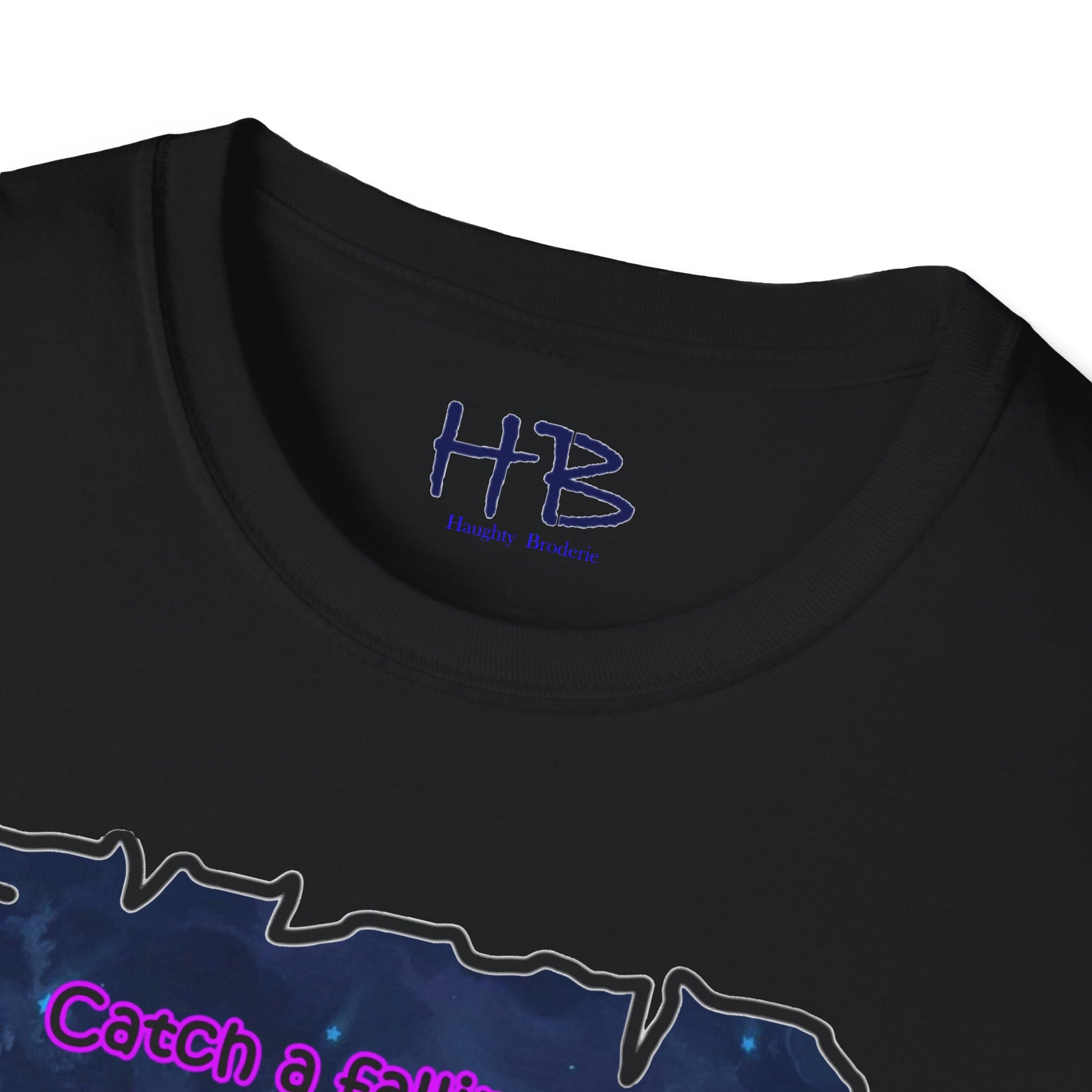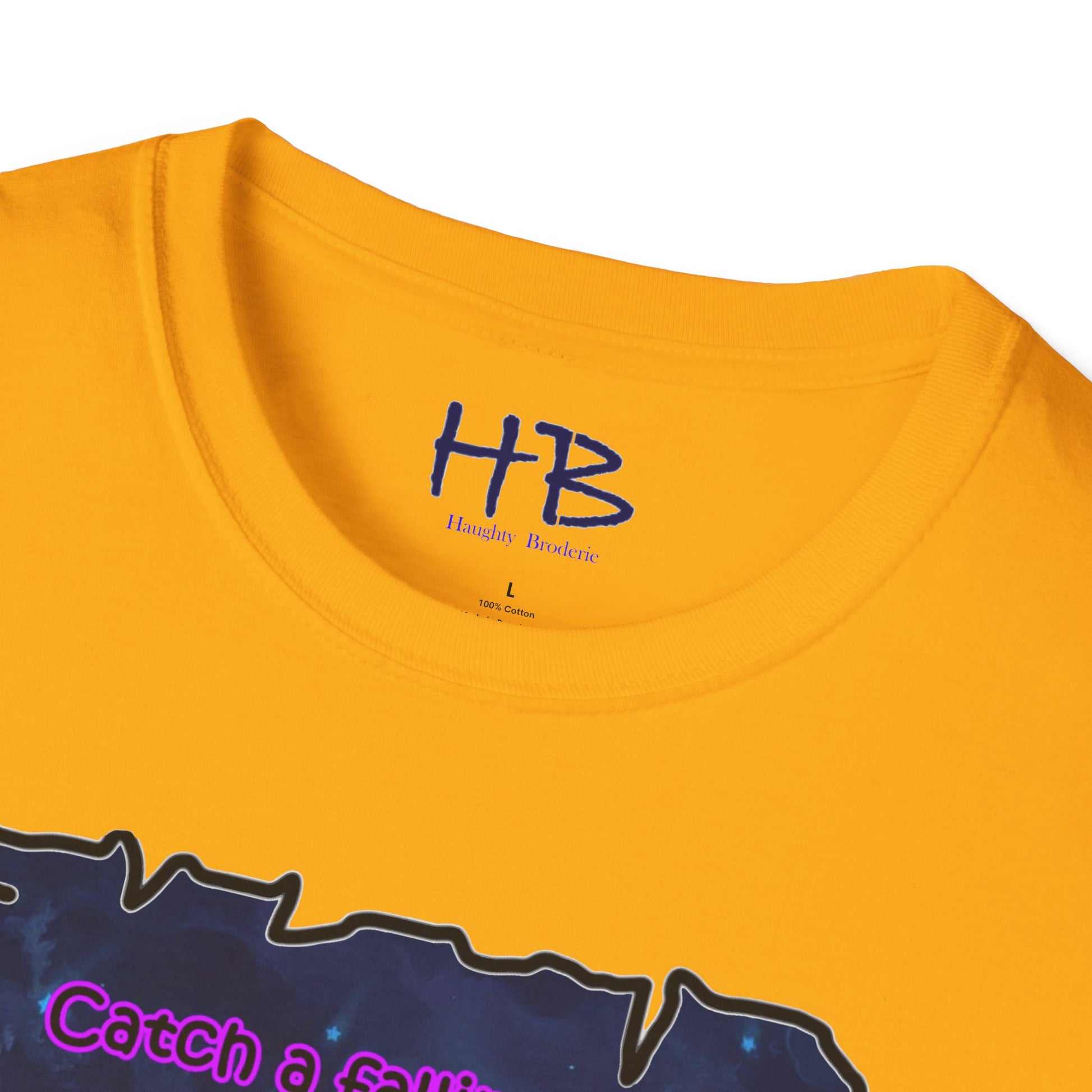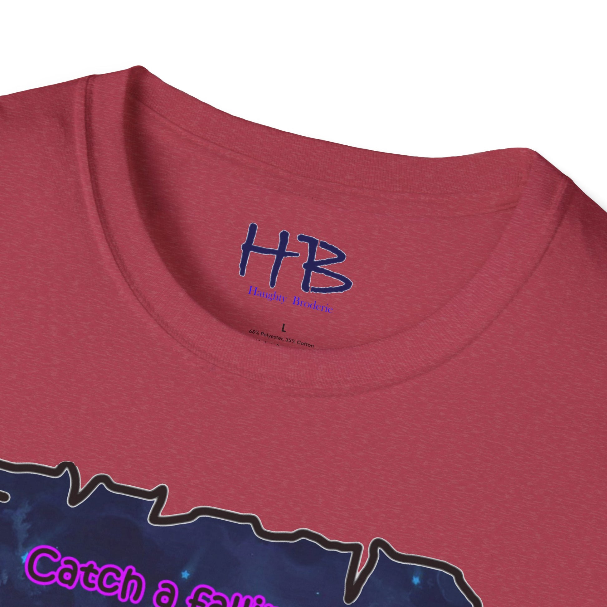 In this ethereal moment frozen in time, a single star descends gracefully from the heavens, descending into the girl's open palms. It's as if the universe itself has conspired to gift her this radiant treasure. The accompanying text emblazoned on the shirt reads, "Catch a falling star + put it in your pocket, save it for a rainy day."