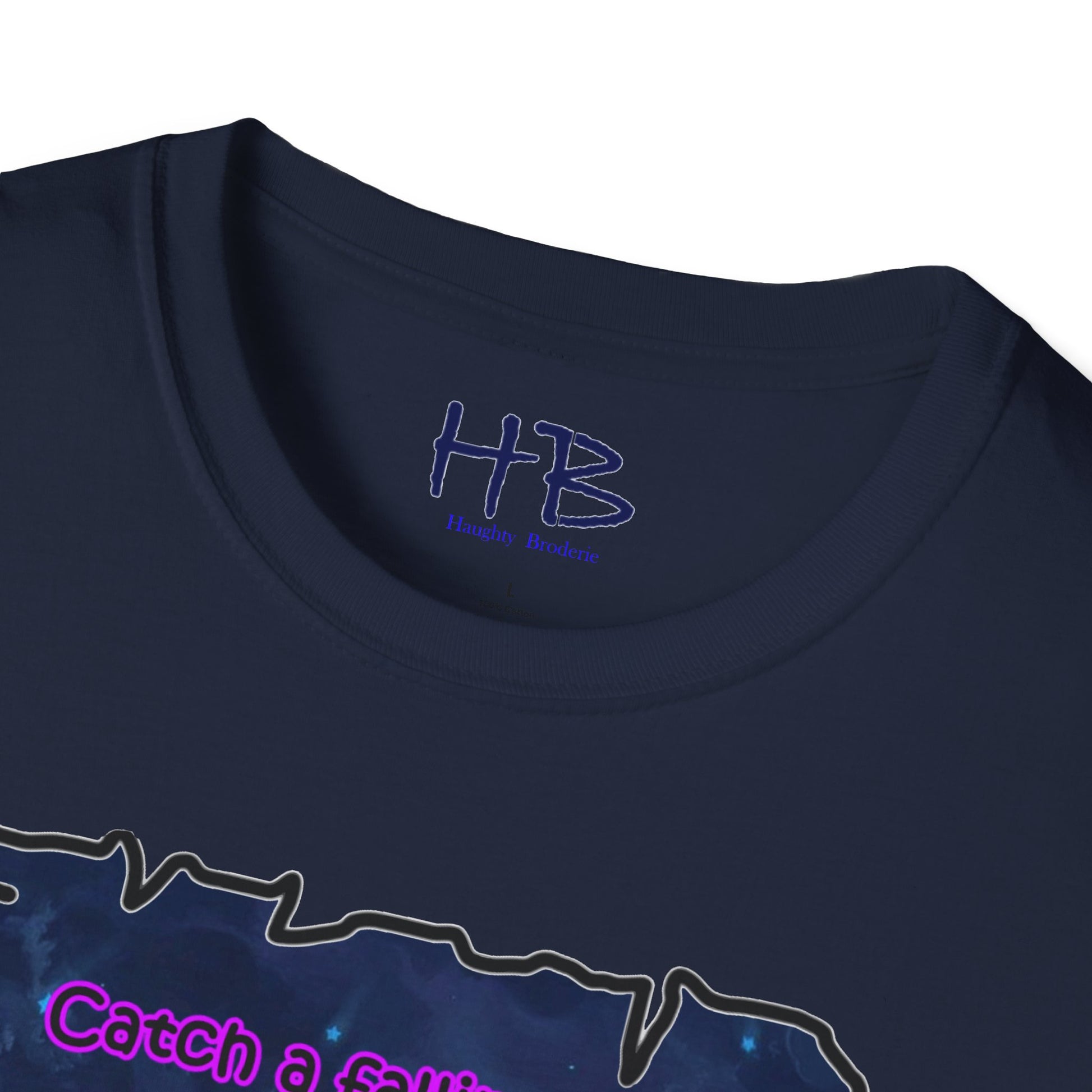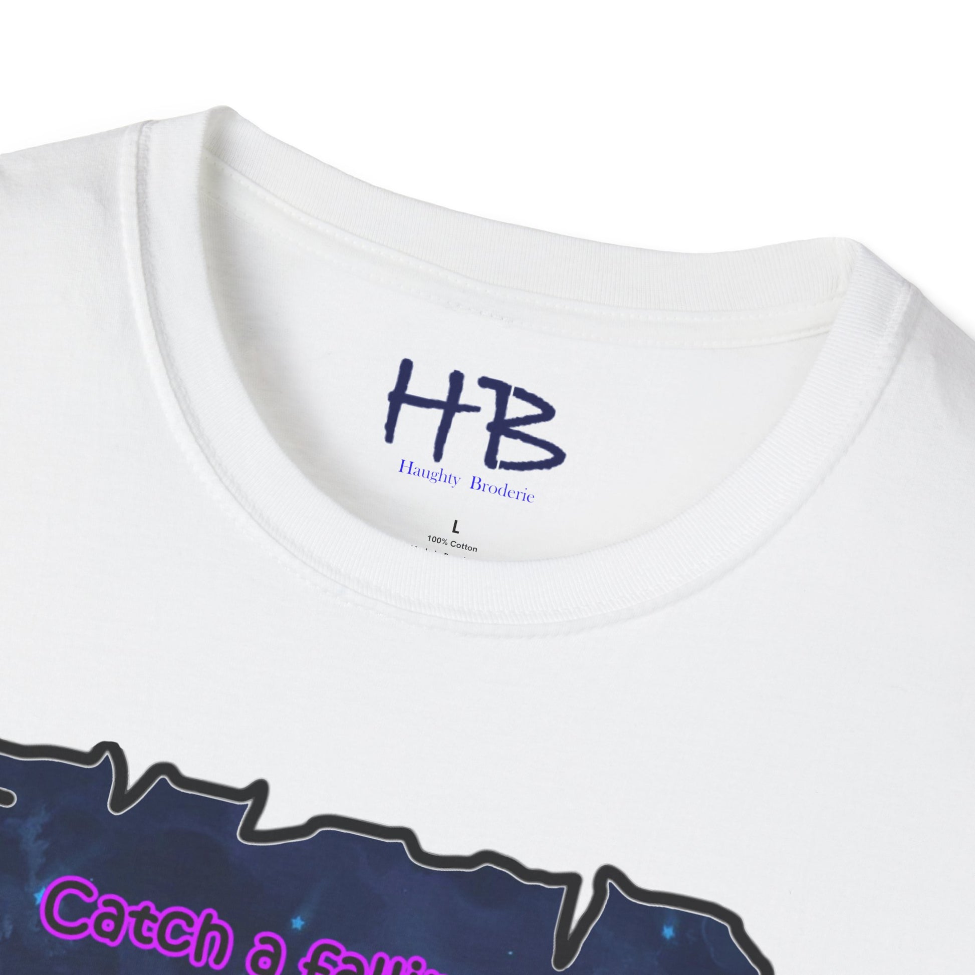 Introducing our enchanting tee shirt, featuring a captivating scene that will transport you to a realm of dreams and possibilities. Picture a breathtaking sky painted in shades of celestial blue and mystical purple, adorned with a myriad of shimmering stars. As you gaze at this mesmerizing sight, you'll notice a young girl standing beneath the heavens, her delicate hands outstretched.