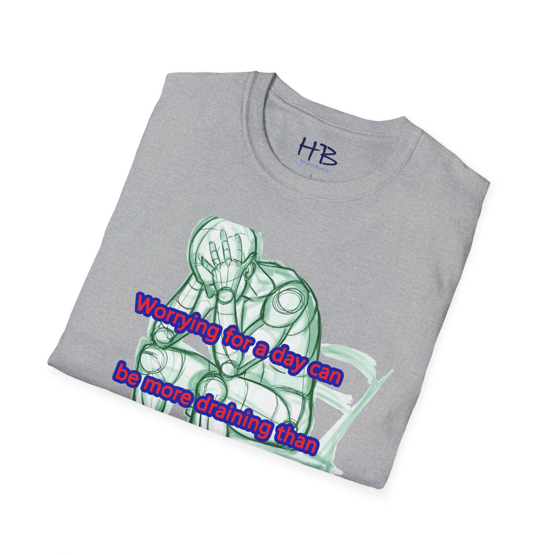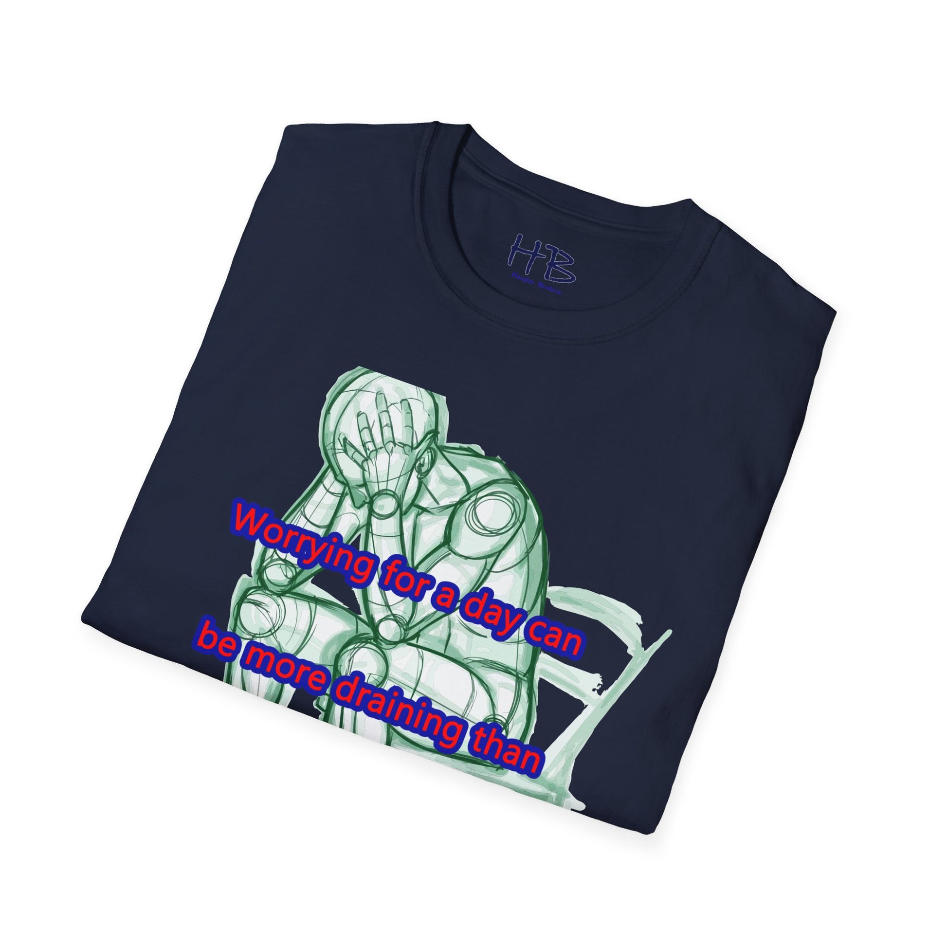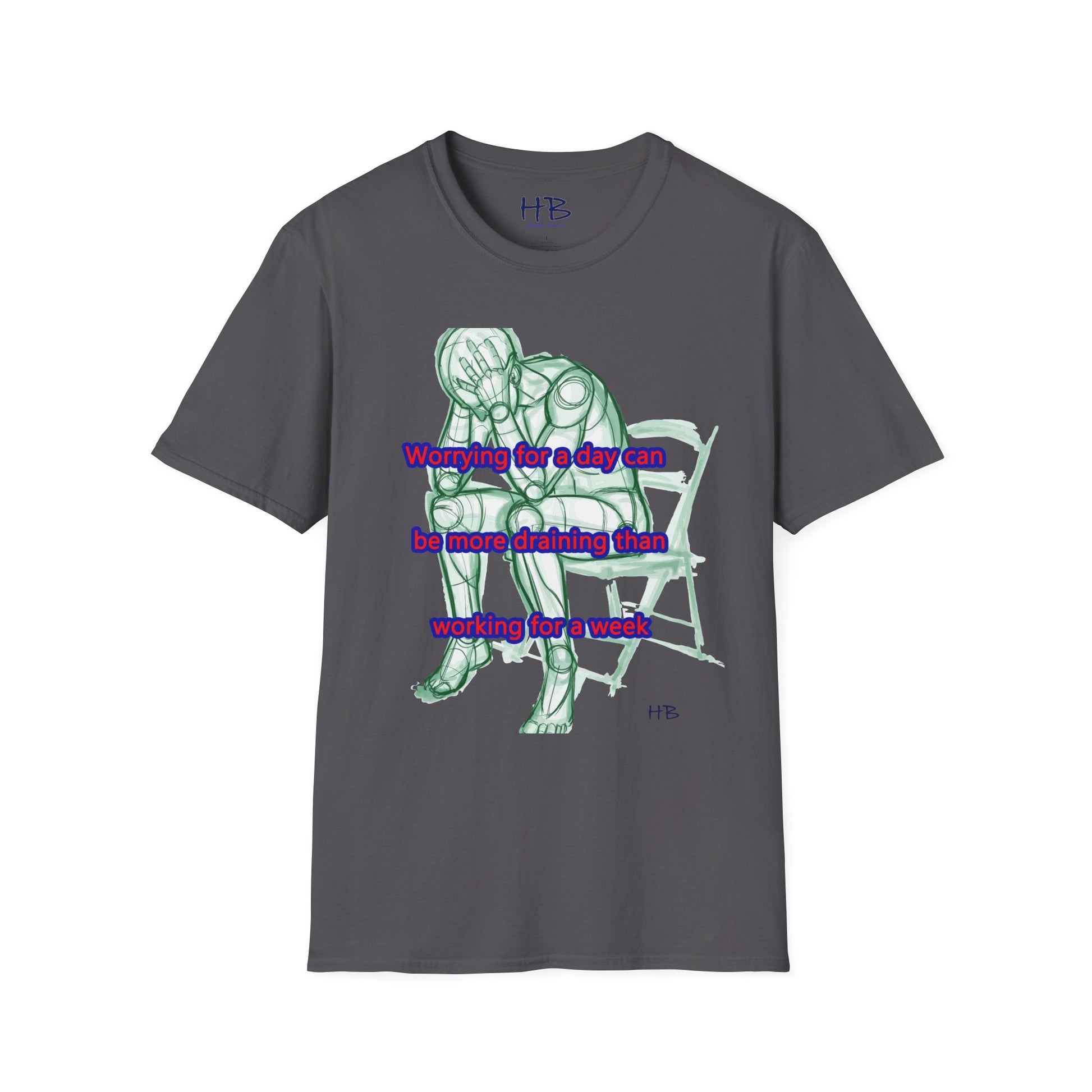 Introducing our new t-shirt featuring a captivating illustration of a gentleman seated in a chair, with both hands firmly grasping his head in despair. The detailed sketch accurately portrays the somber mood of the man as he contemplates the weight of his worries. The image is accompanied by the poignant text, "A day of worry is more exhausting than a week of work."