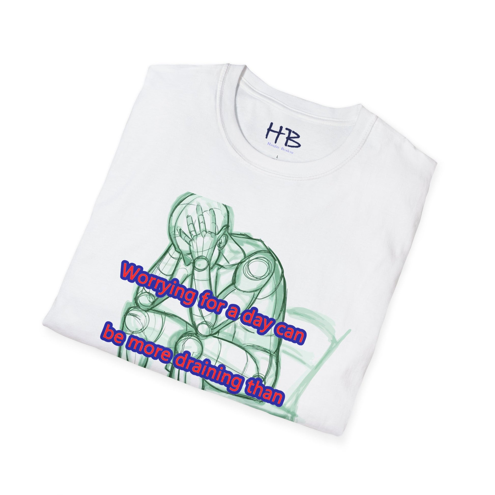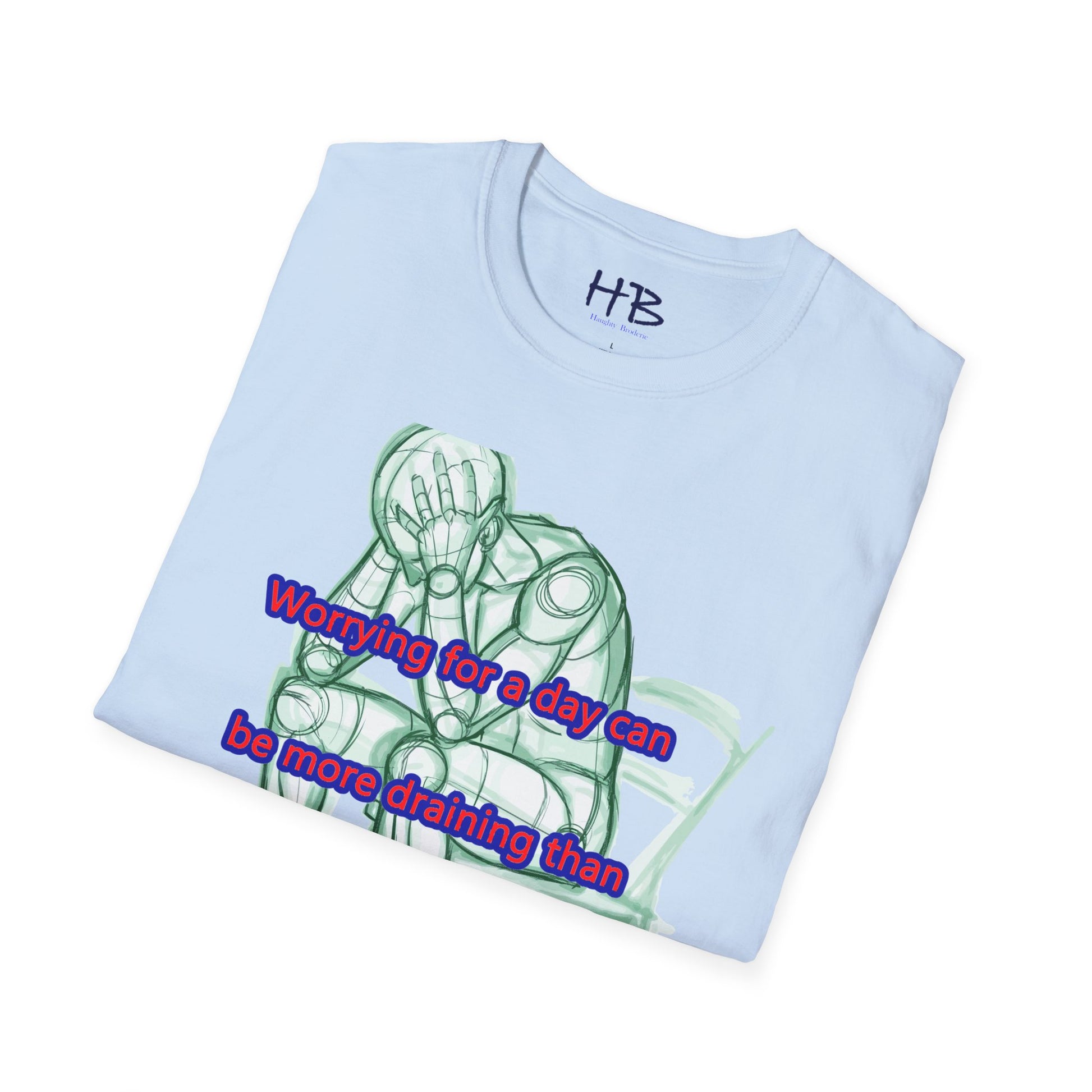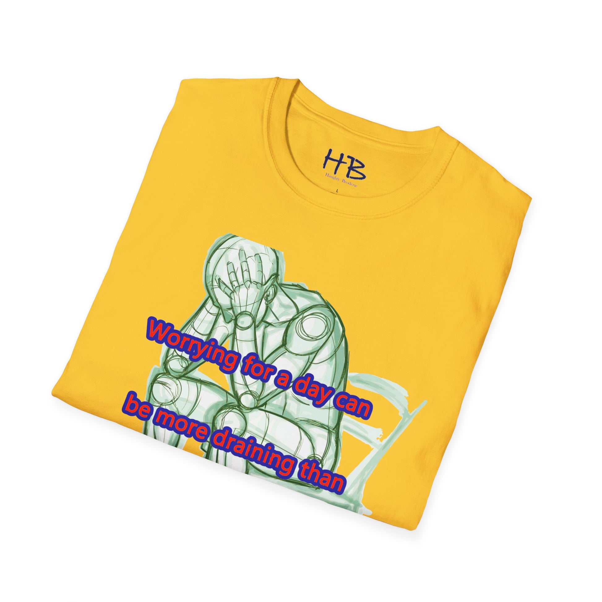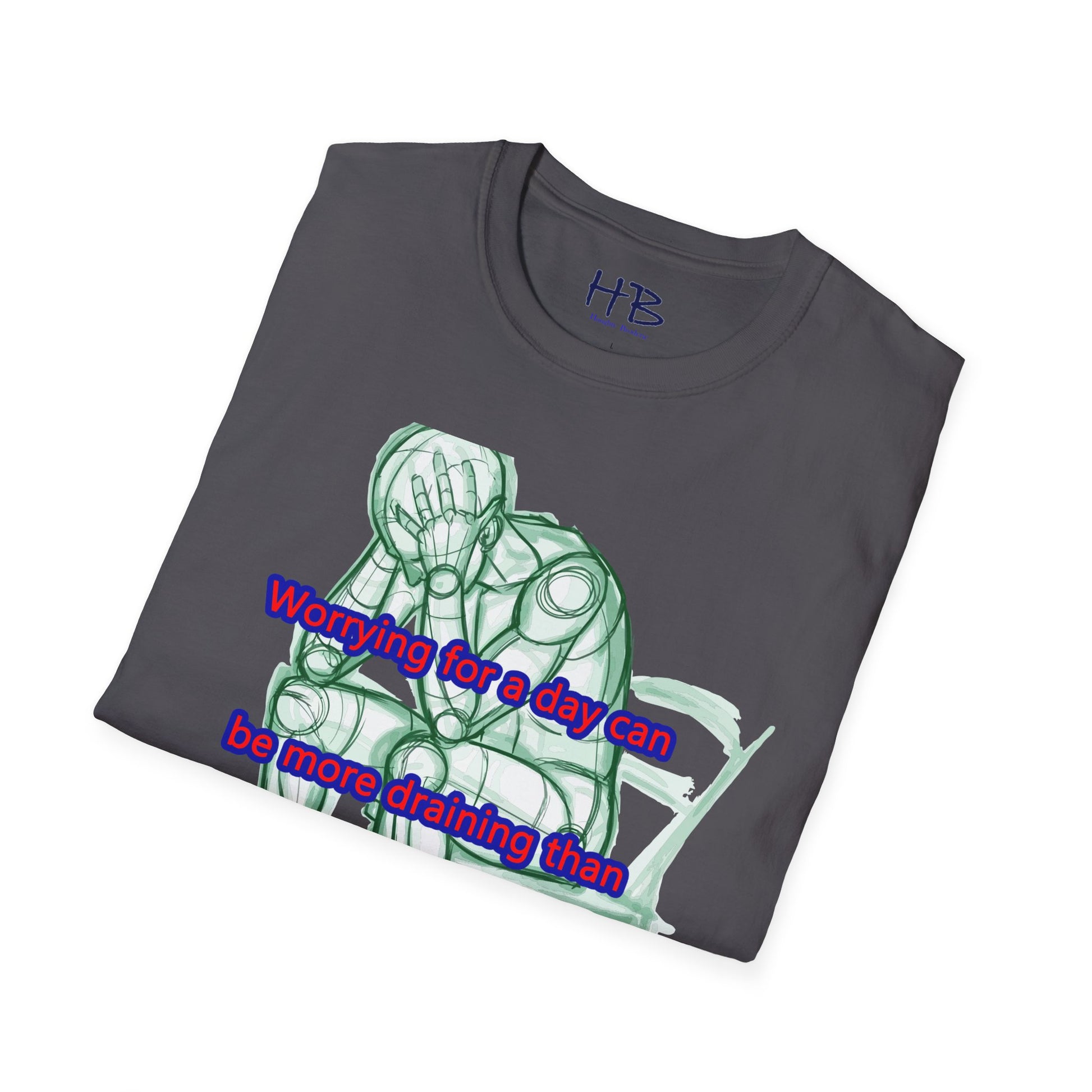 Introducing our new t-shirt featuring a captivating illustration of a gentleman seated in a chair, with both hands firmly grasping his head in despair. The detailed sketch accurately portrays the somber mood of the man as he contemplates the weight of his worries. The image is accompanied by the poignant text, "A day of worry is more exhausting than a week of work."