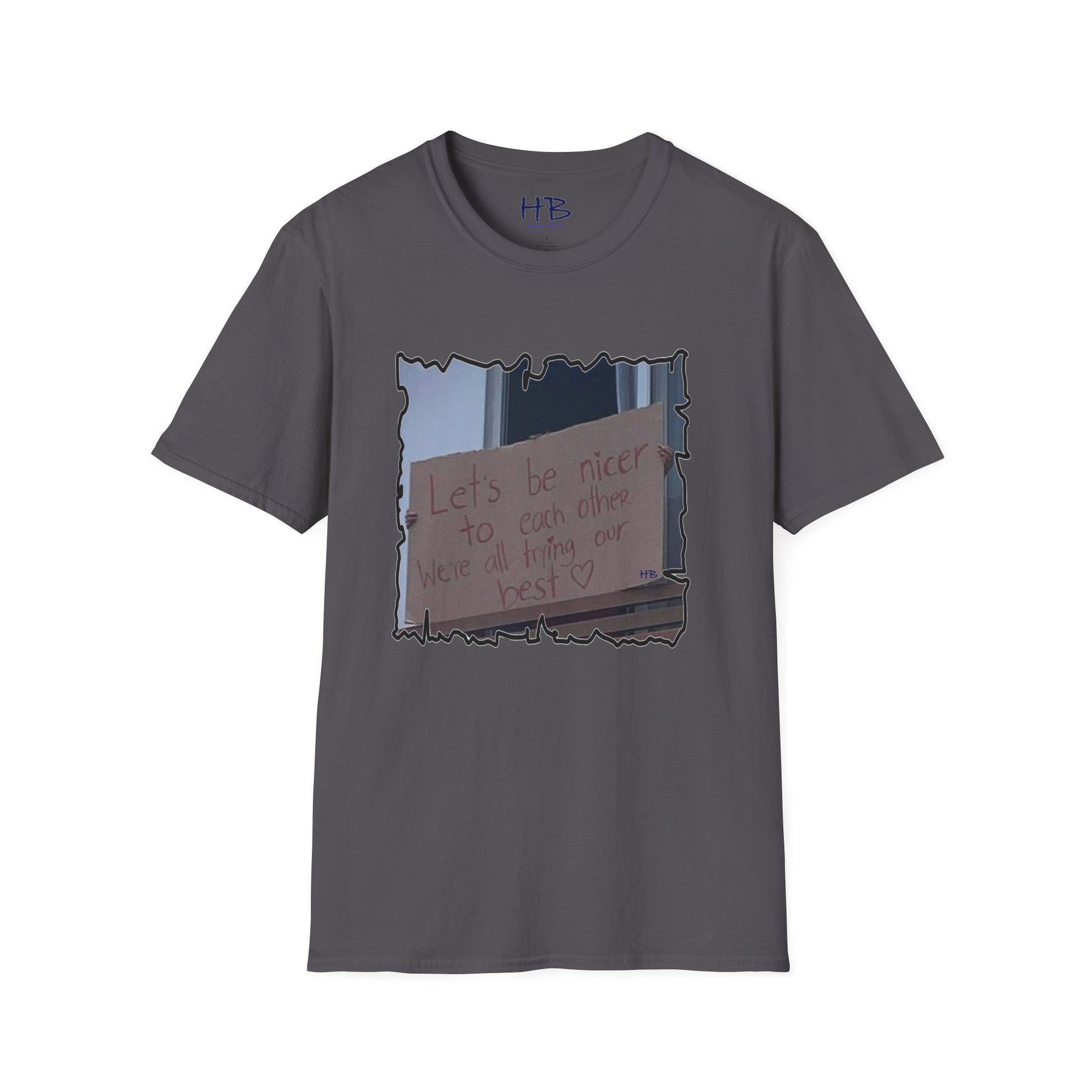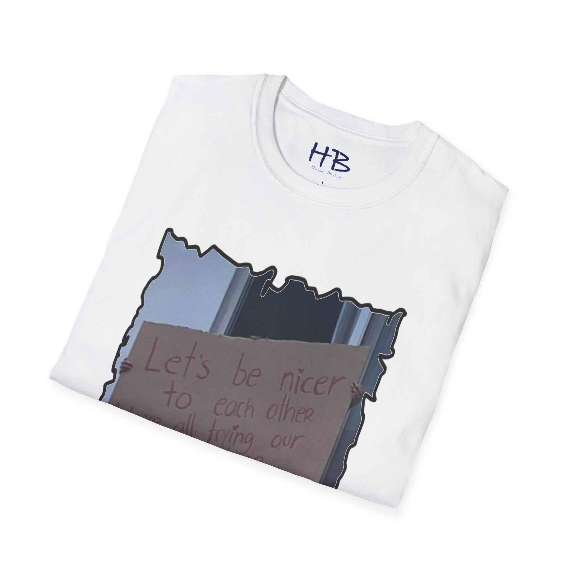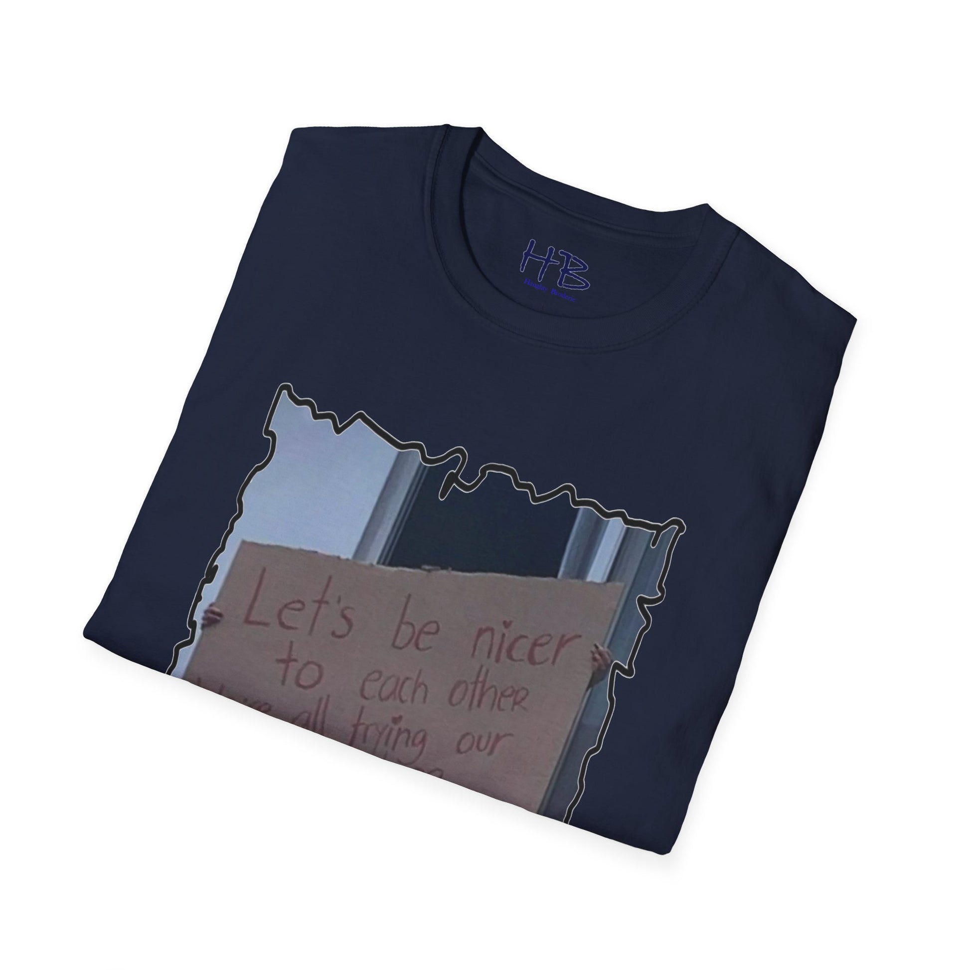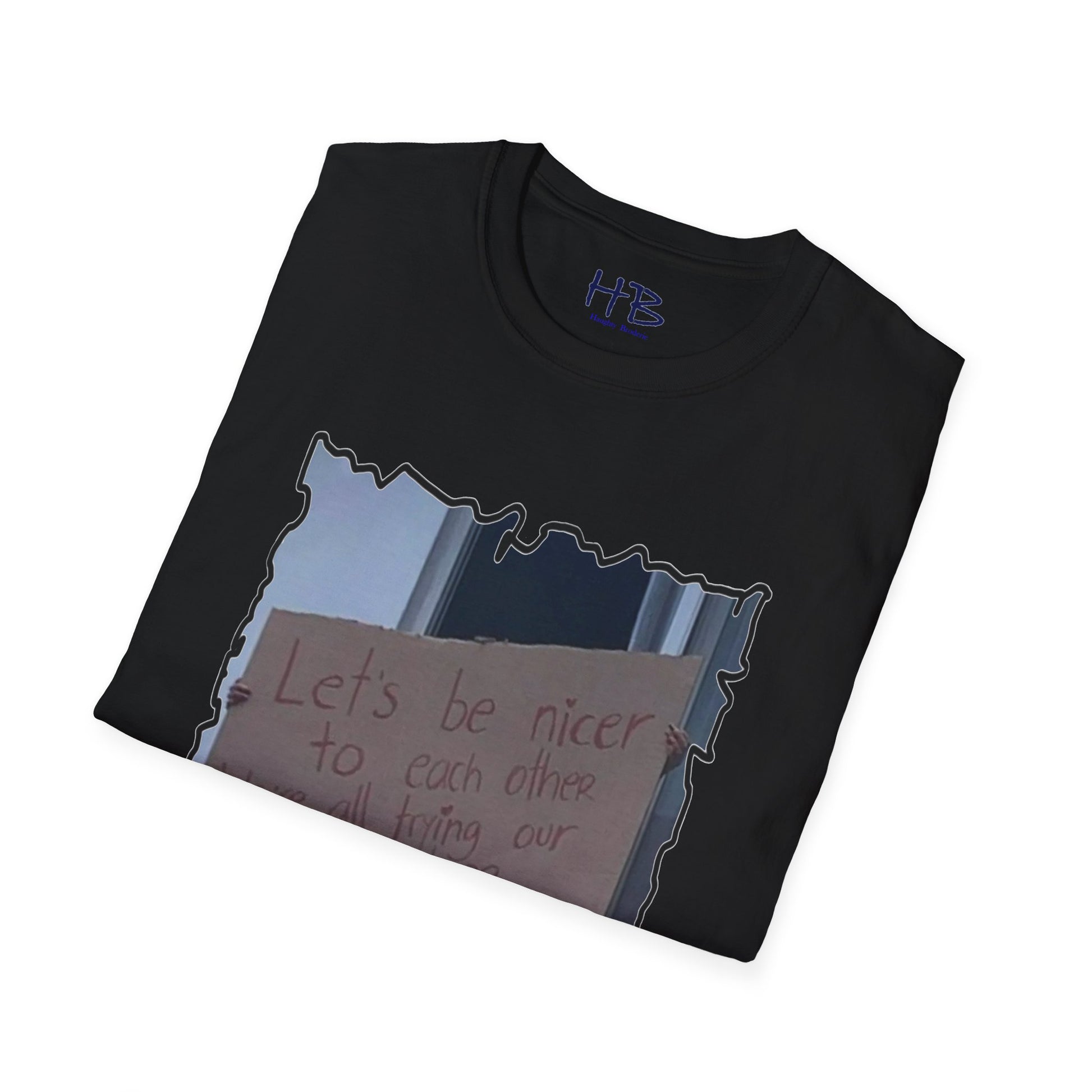 Behold, our emblematic emblem, a visual manifestation of compassion and unity that transcends words and communicates a profound message. This exquisitely crafted piece of attire showcases a large cardboard bearing an earnest declaration, "Let's be gentler to each other. We're all striving for our best <3." This profound statement, adorned with heartfelt graffiti, resonates with the deepest chords of empathy.