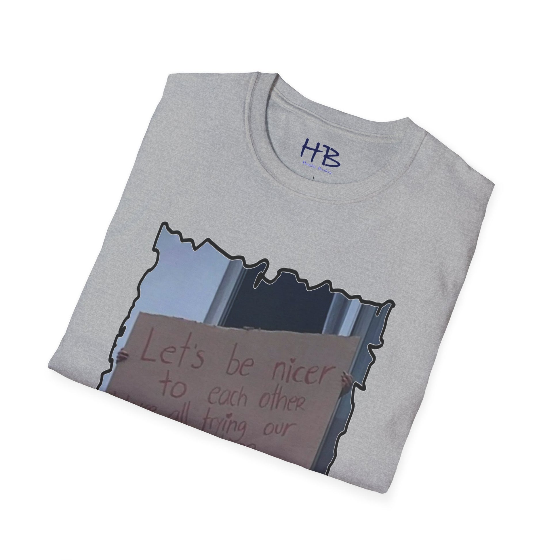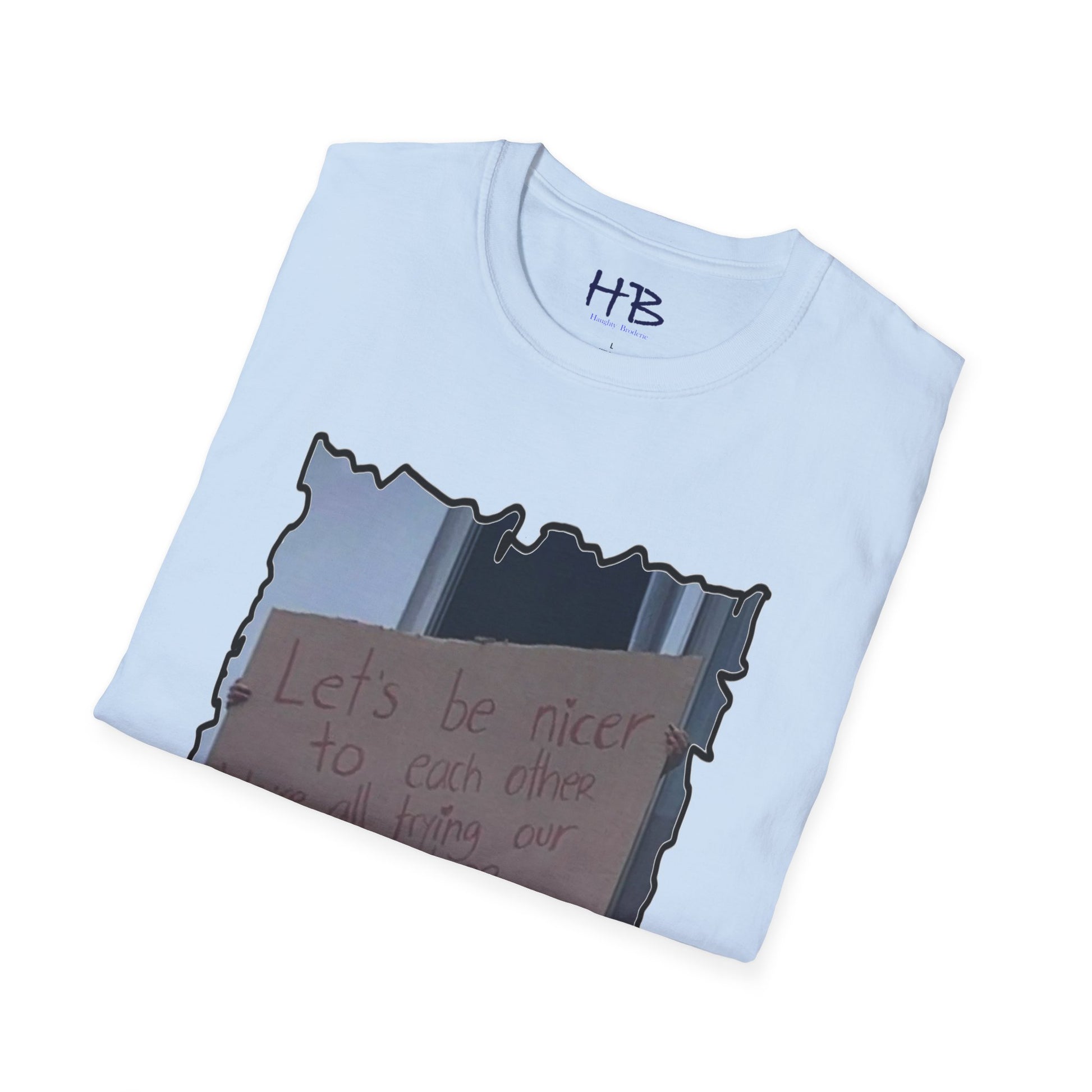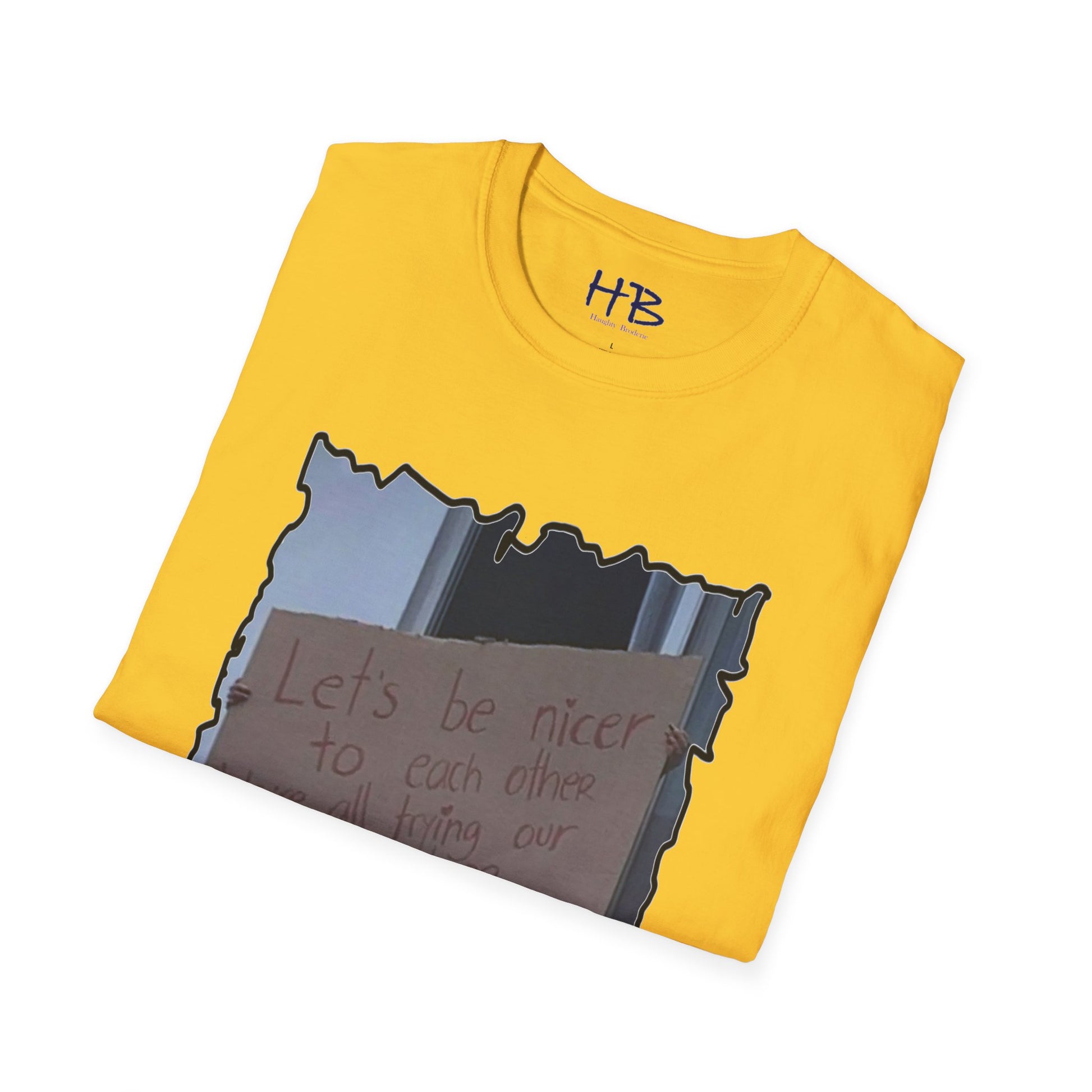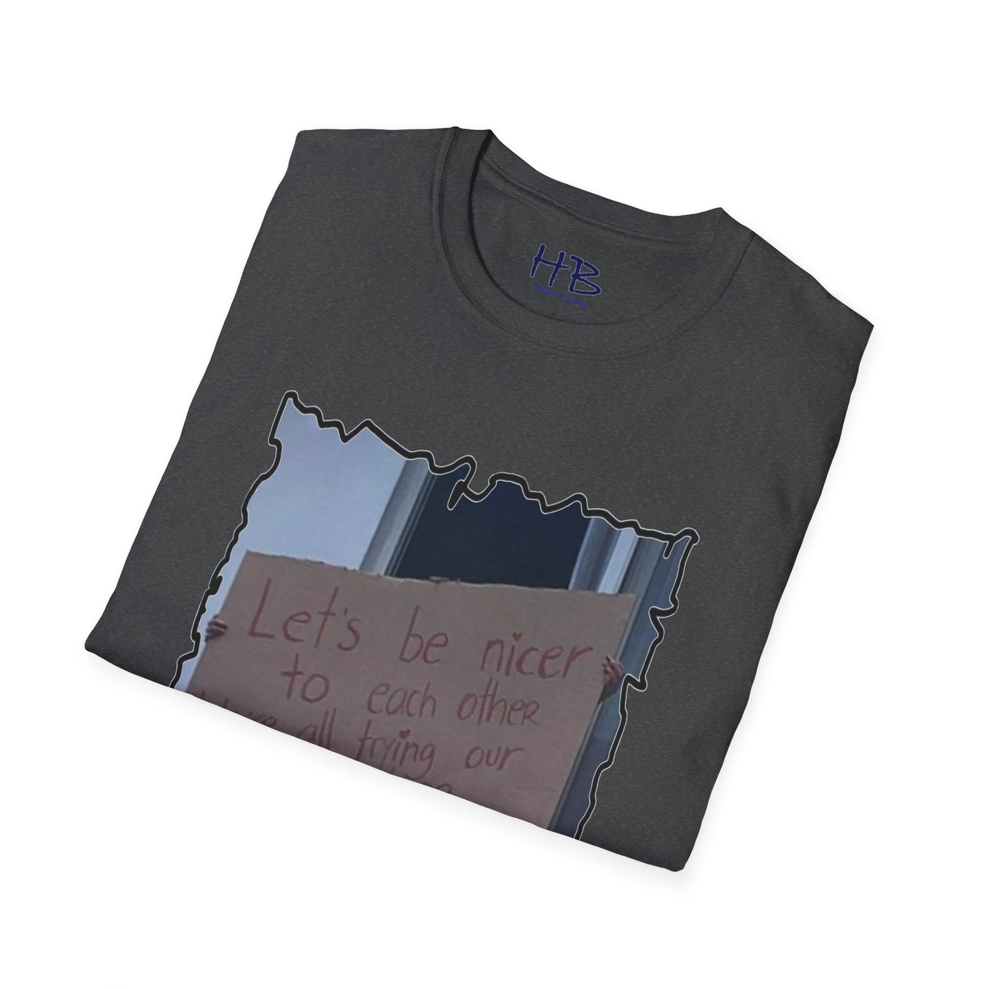 Behold, our emblematic emblem, a visual manifestation of compassion and unity that transcends words and communicates a profound message. This exquisitely crafted piece of attire showcases a large cardboard bearing an earnest declaration, "Let's be gentler to each other. We're all striving for our best <3." This profound statement, adorned with heartfelt graffiti, resonates with the deepest chords of empathy.