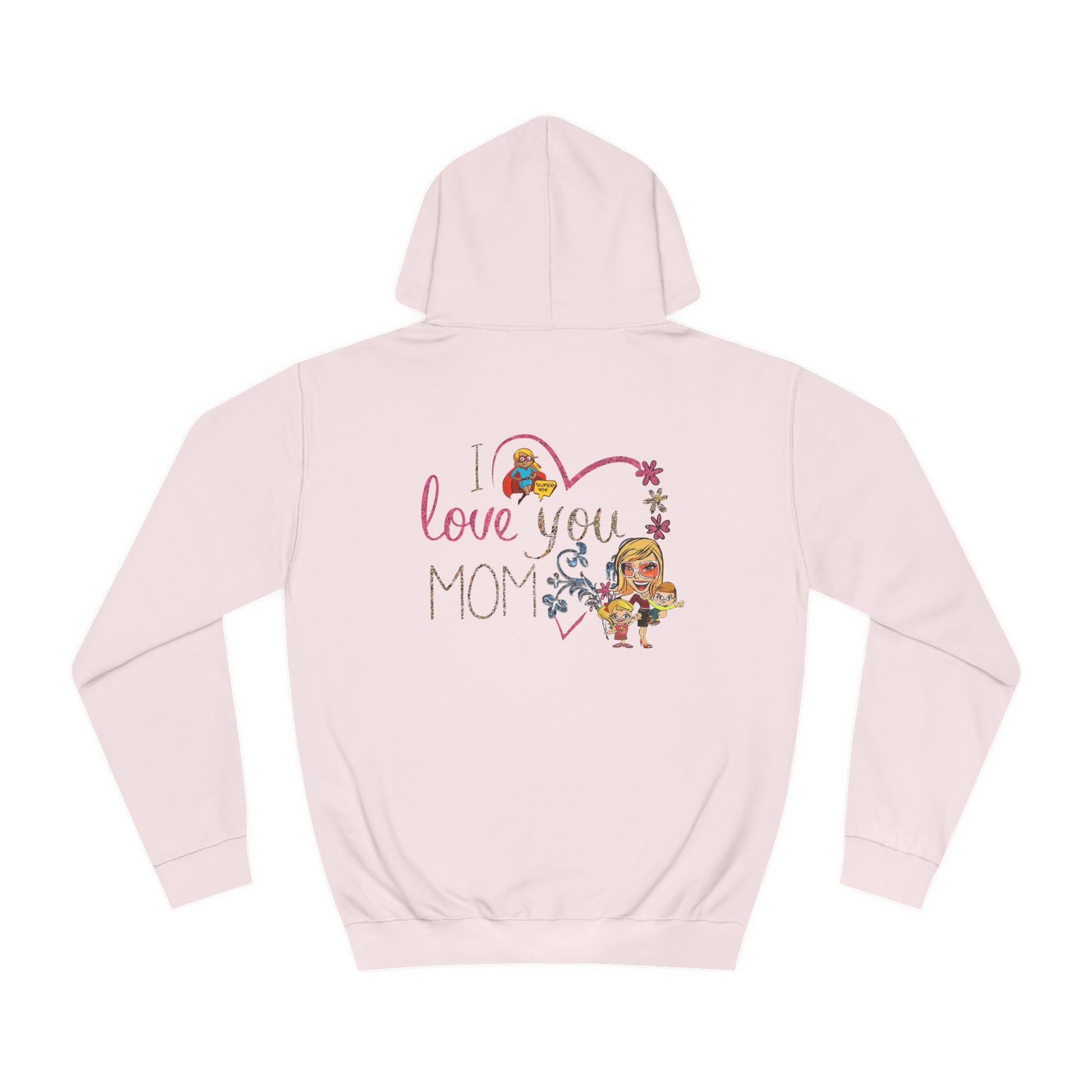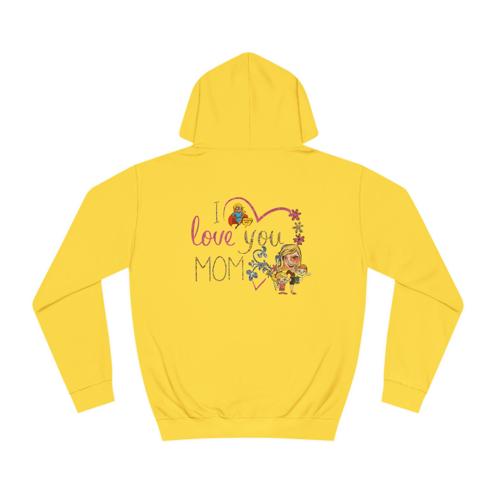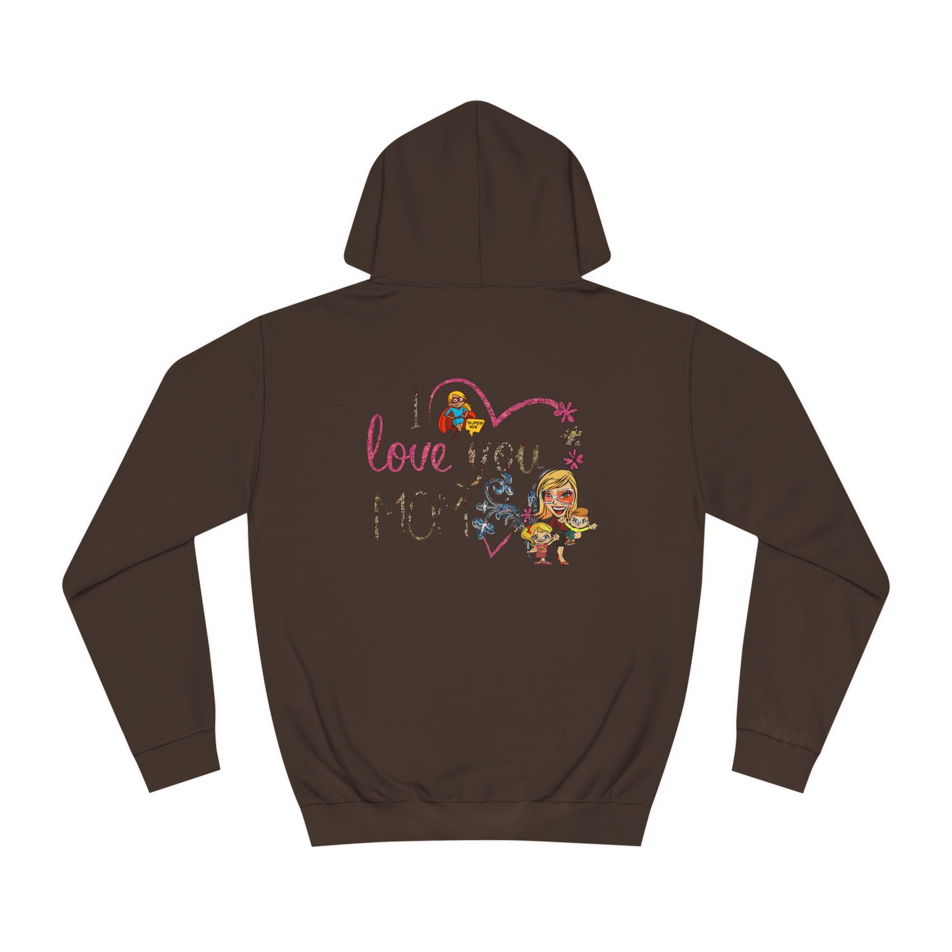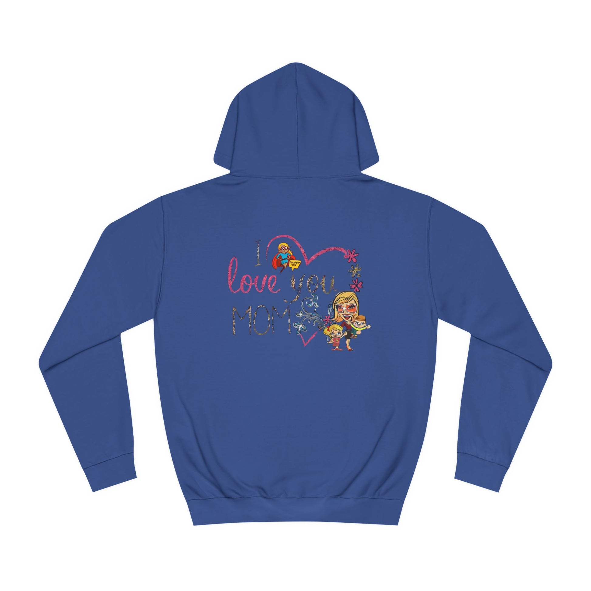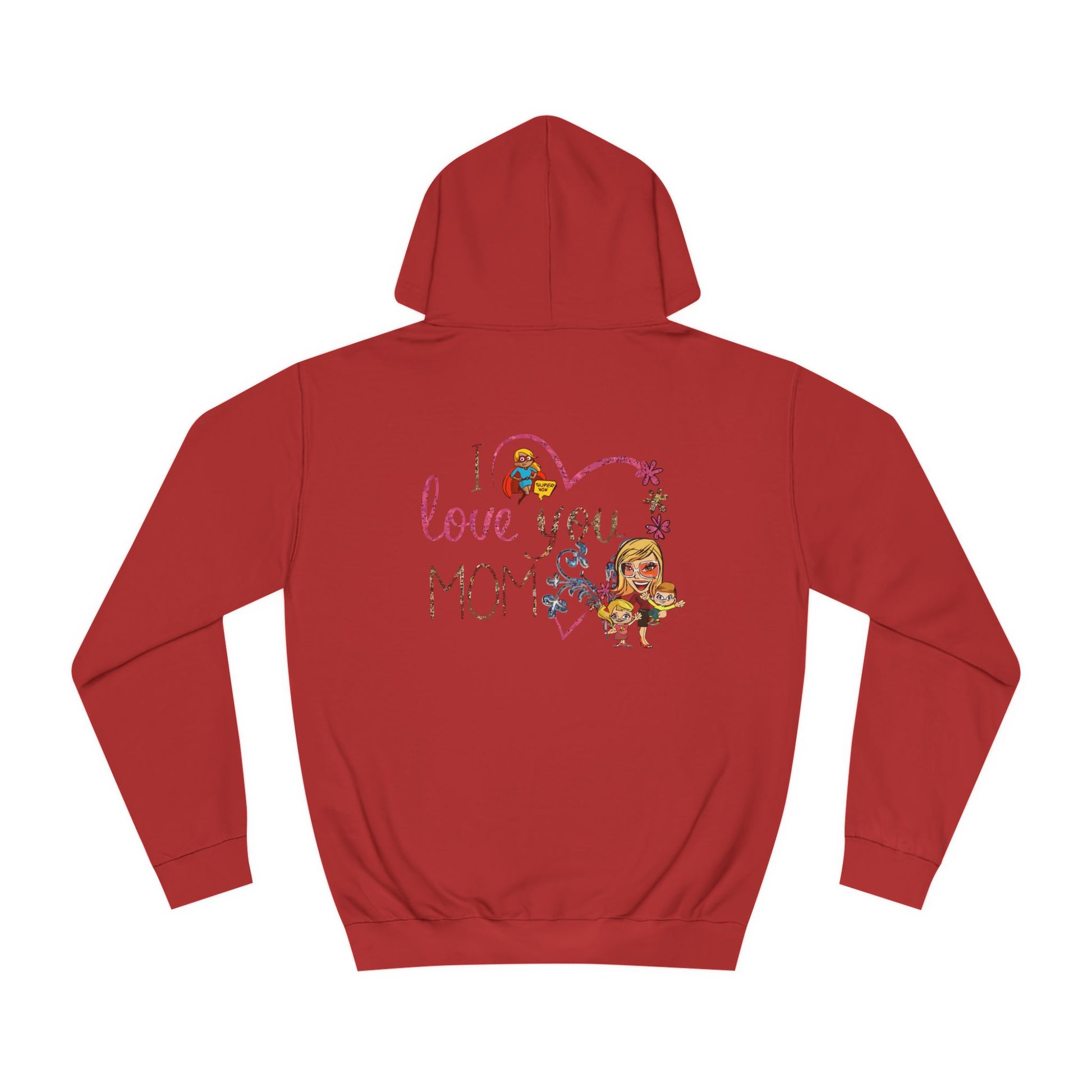 On the back of the tee shirt, you'll find a large heart graphic with the heartfelt sentiment, "I love you Mom." Additionally, the tee shirt features two striking images of strong and stylish moms. The first image depicts a chic mom wearing pink see-through sunglasses, a skirt, and red heels while standing with her son and daughter by her side. The second image showcases a flying mom donning a superhero uniform, complete with a "Super Mom" insignia.