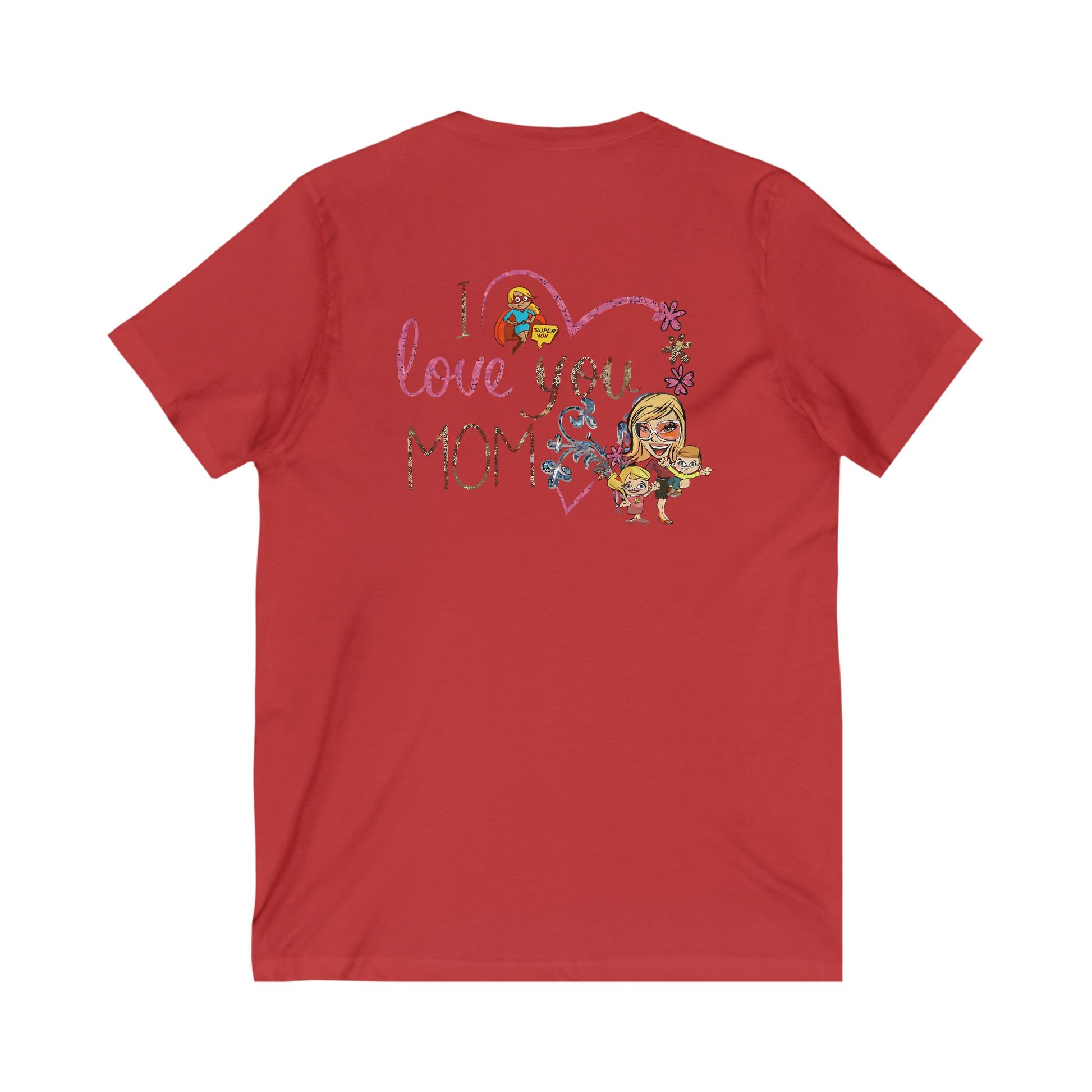 On the back of the tee shirt, you'll find a large heart graphic with the heartfelt sentiment, "I love you Mom." Additionally, the tee shirt features two striking images of strong and stylish moms. The first image depicts a chic mom wearing pink see-through sunglasses, a skirt, and red heels while standing with her son and daughter by her side. The second image showcases a flying mom donning a superhero uniform, complete with a "Super Mom" insignia.