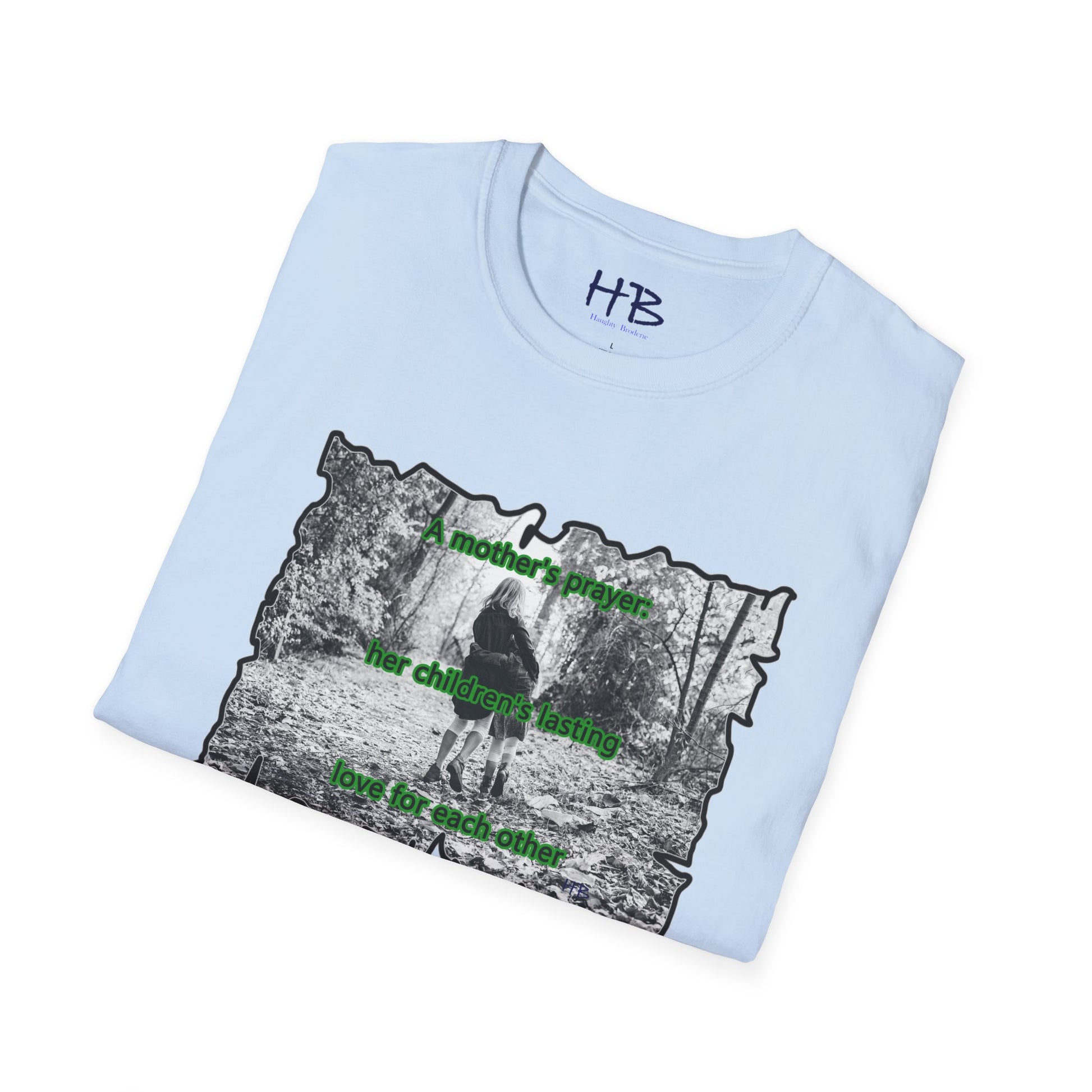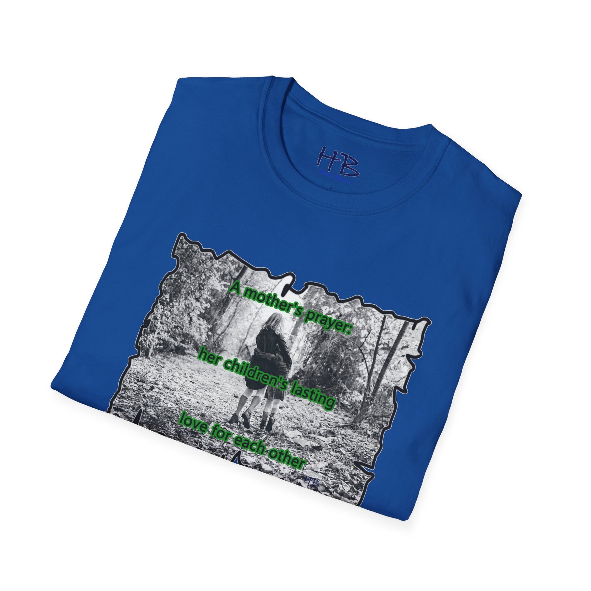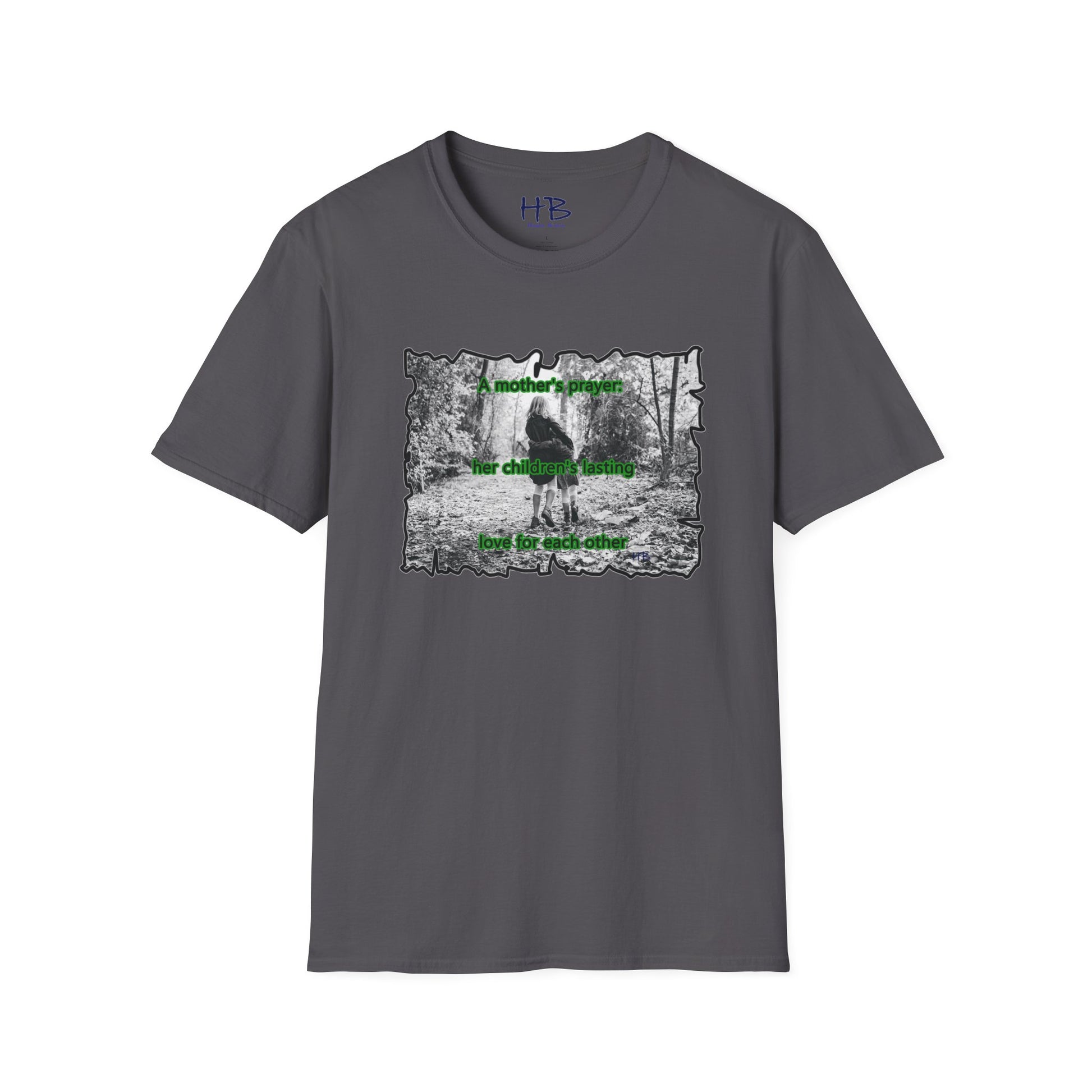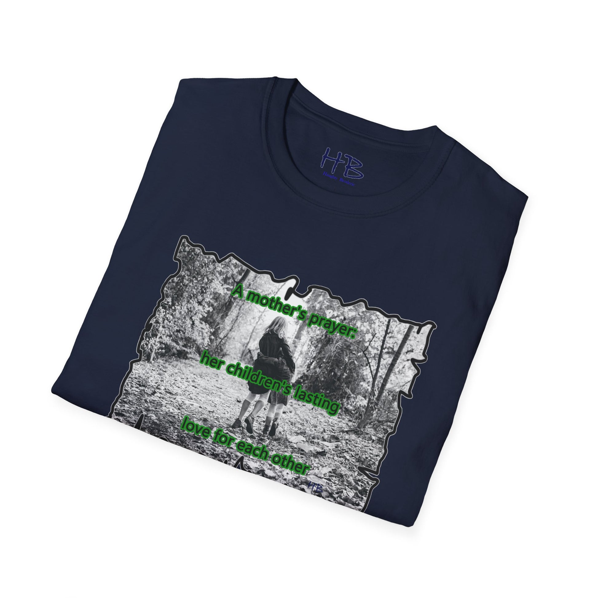 The heartwarming image on the tee shirt portrays the timeless bond between siblings, and is accompanied by a poignant message that reads, "A mother's prayer is that her children will love each other long after she is gone." This powerful statement is a testament to the enduring nature of family love, and is sure to resonate with anyone who holds the value of familial bonds dear to their heart.