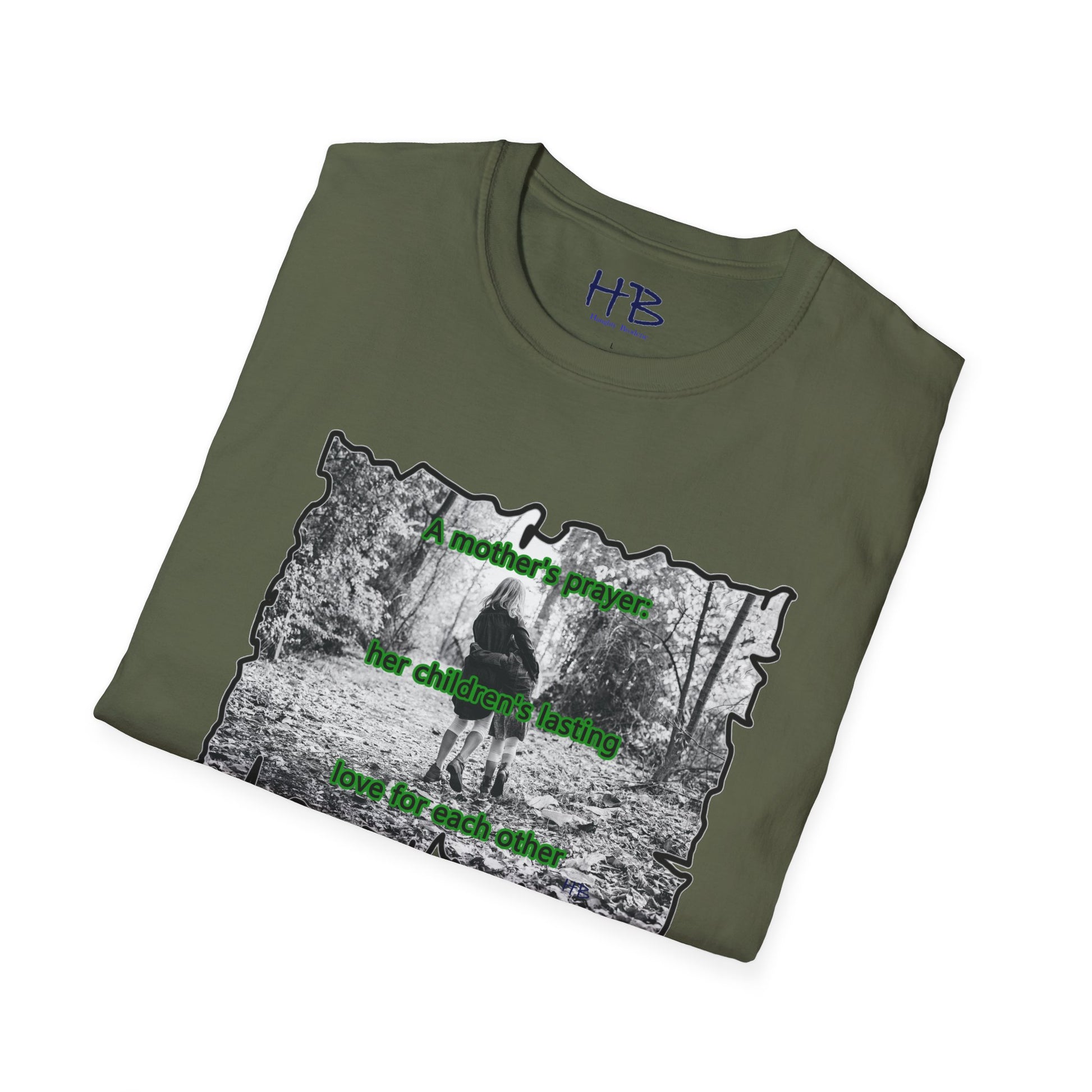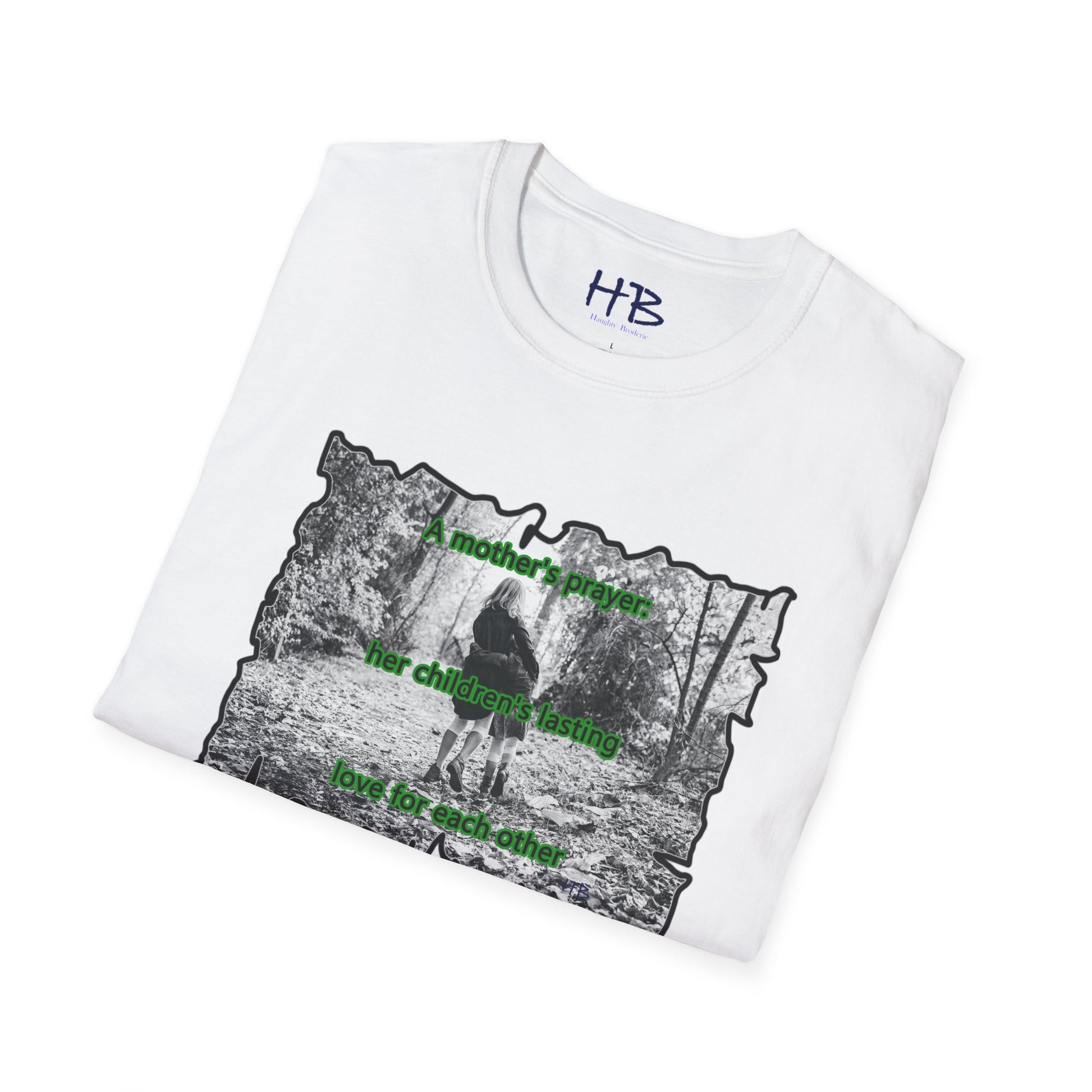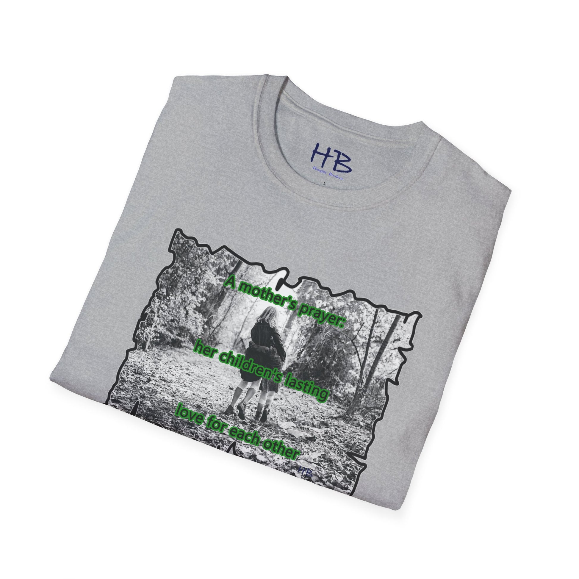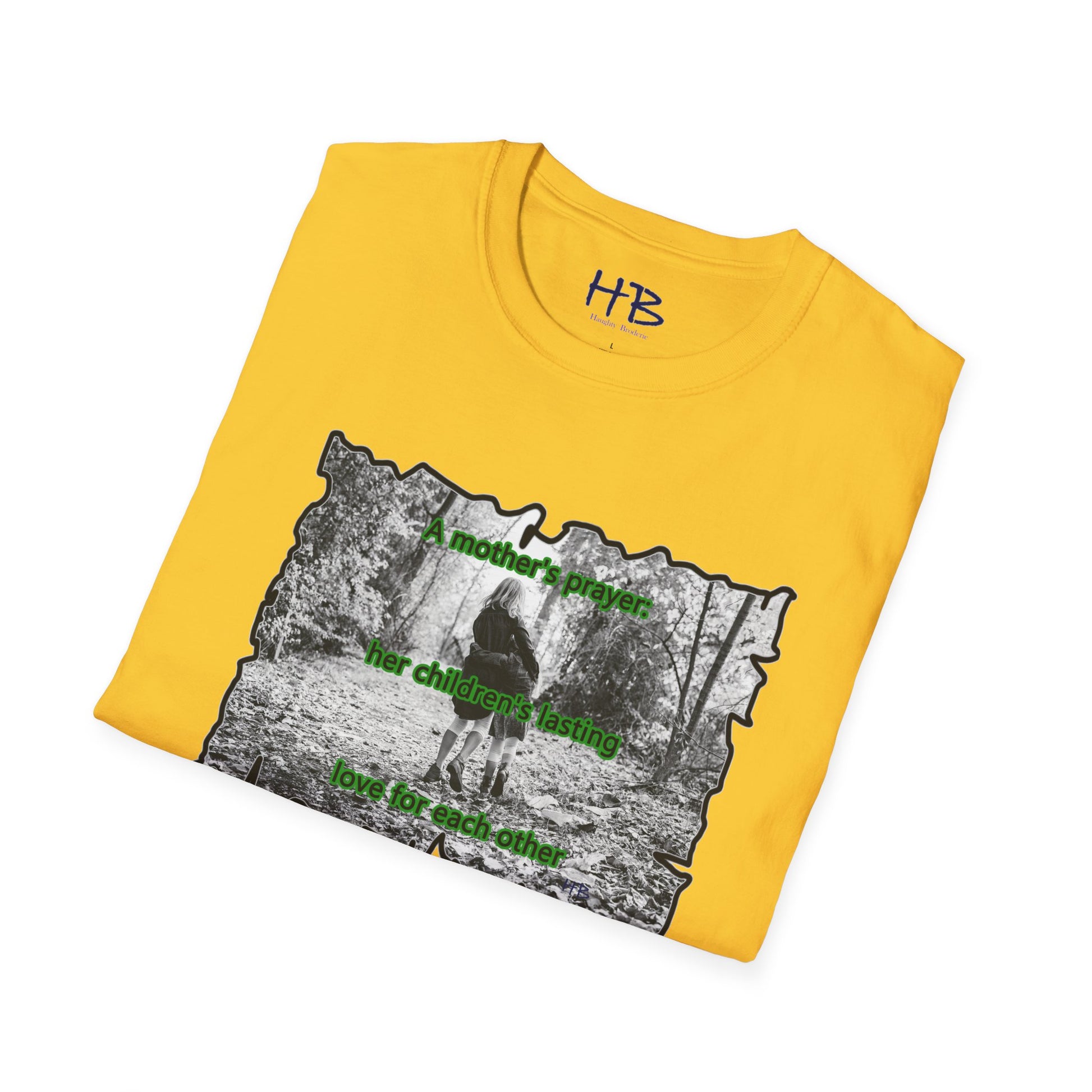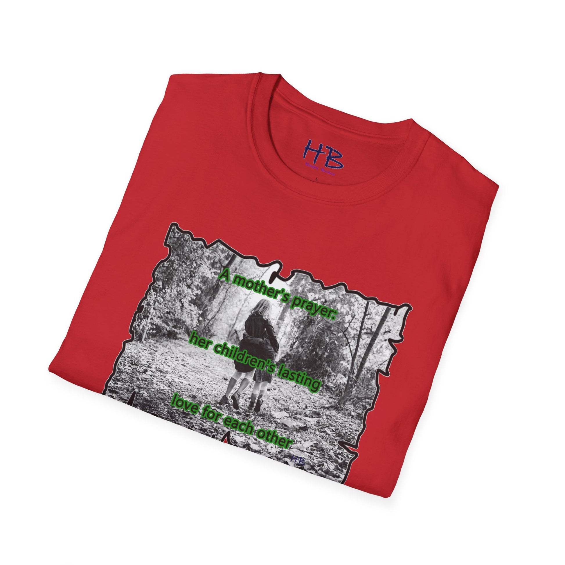 The heartwarming image on the tee shirt portrays the timeless bond between siblings, and is accompanied by a poignant message that reads, "A mother's prayer is that her children will love each other long after she is gone." This powerful statement is a testament to the enduring nature of family love, and is sure to resonate with anyone who holds the value of familial bonds dear to their heart.