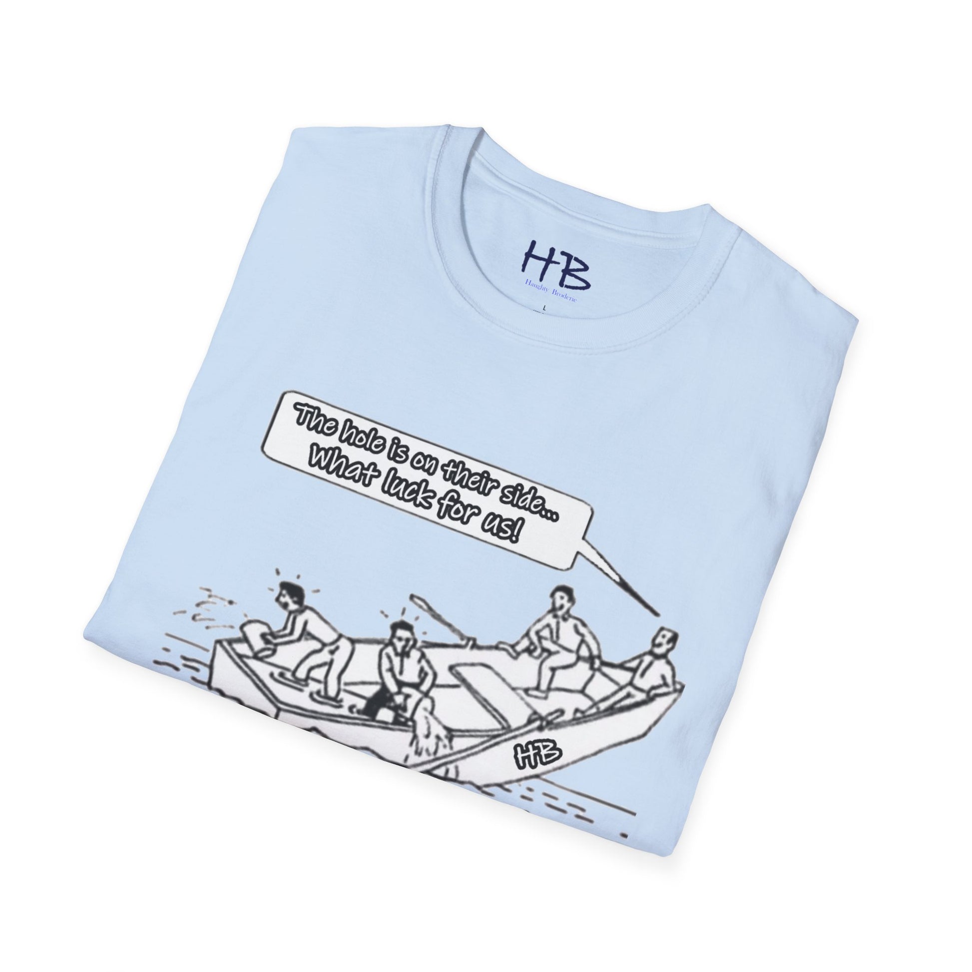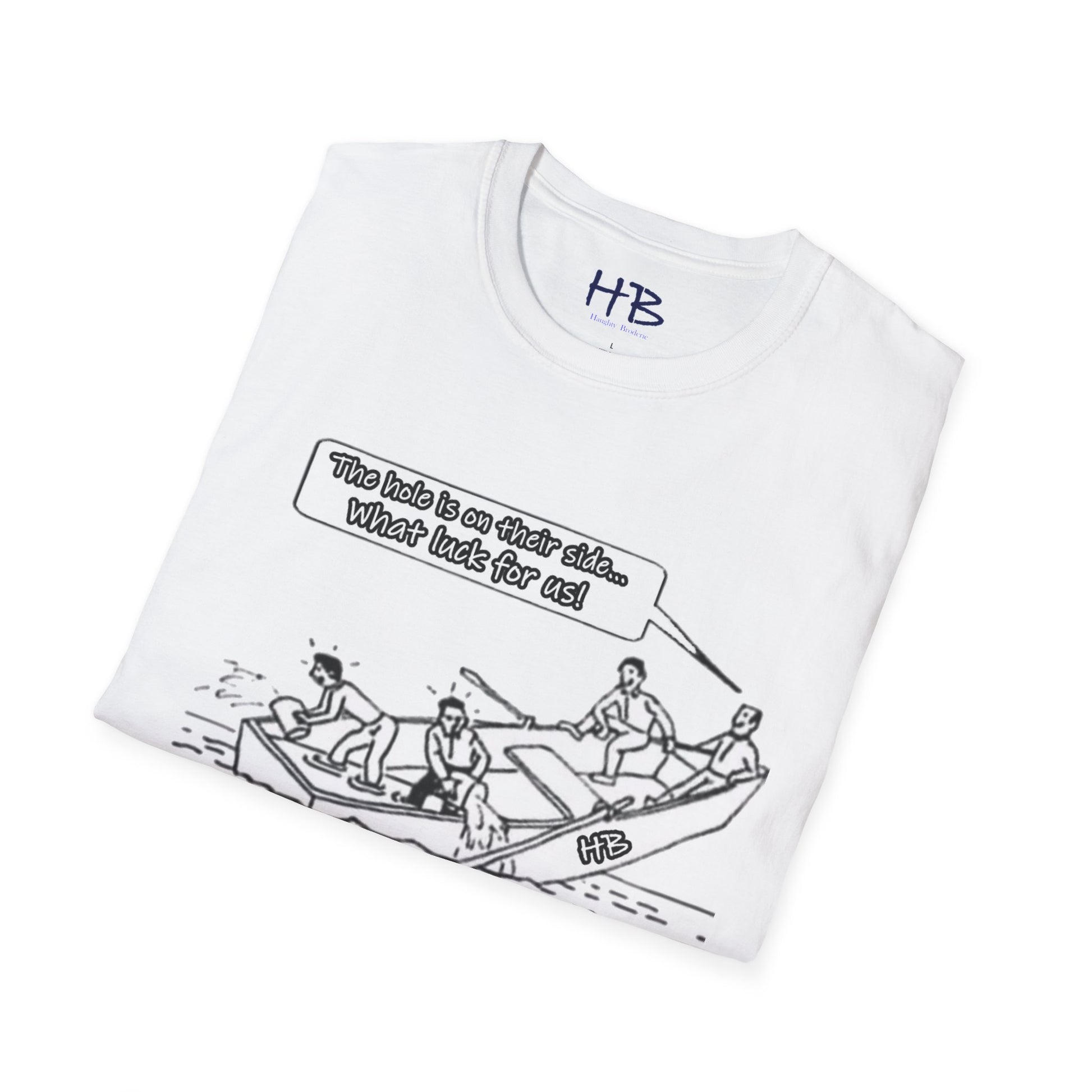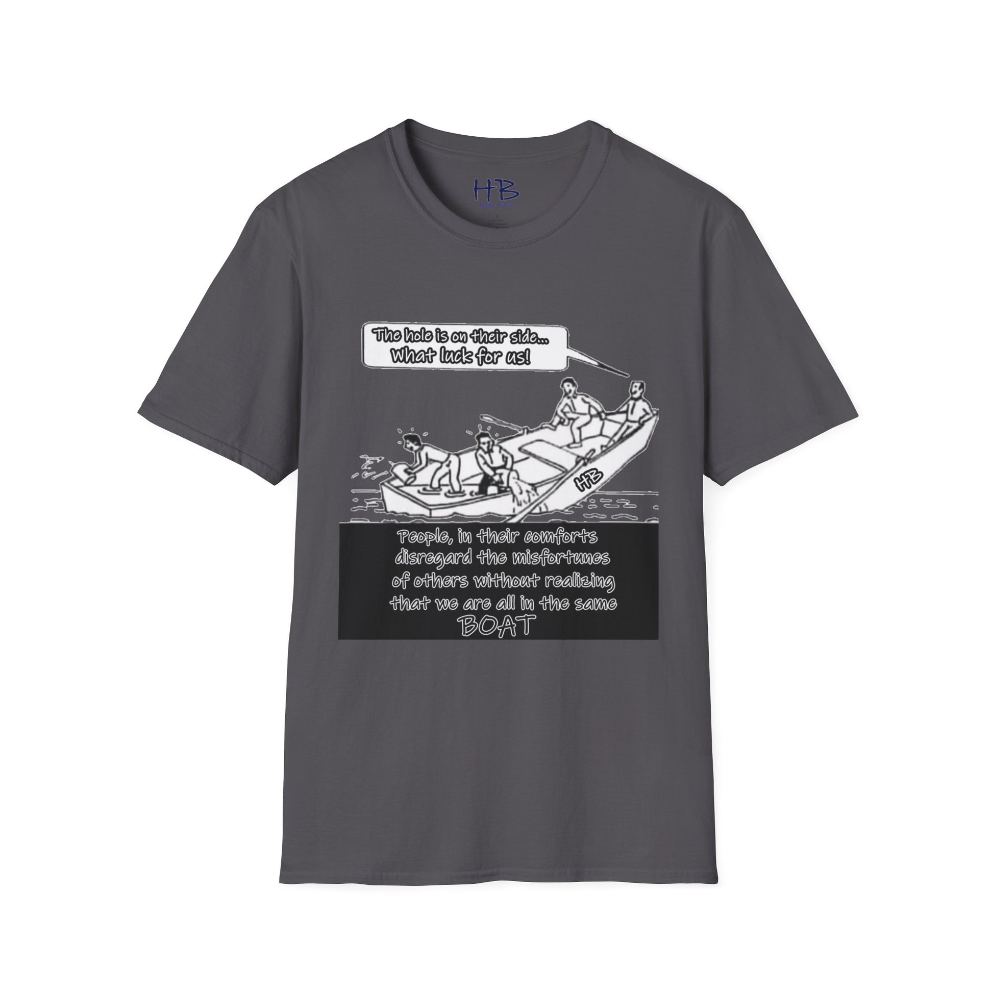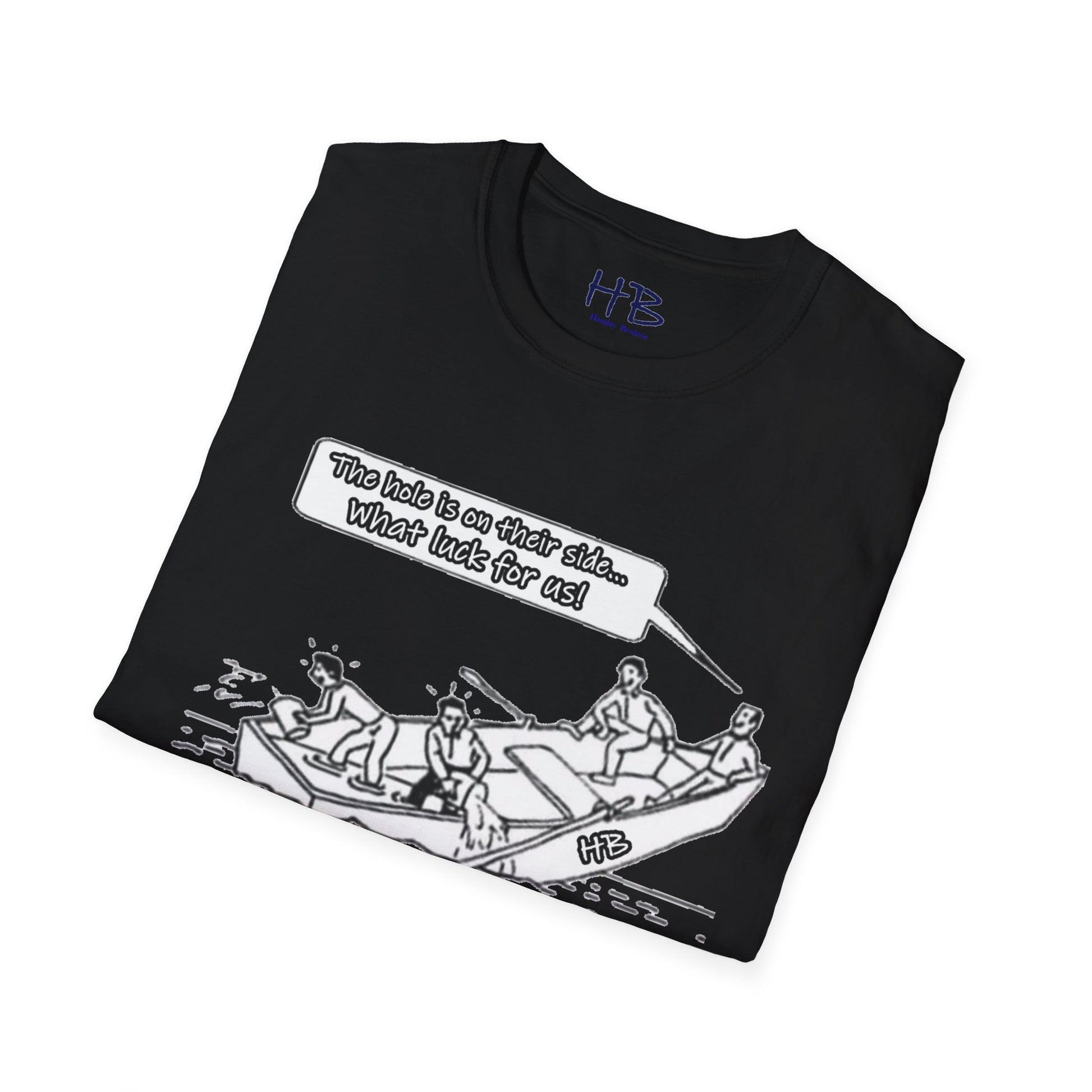 Introducing our captivating and thought-provoking tee shirt, adorned with a compelling image that echoes the subtle nuances of the human experience. Picture this: a whimsical drawing featuring a boat, caught in a precarious situation with a noticeable hole, on the brink of sinking. What sets this design apart is the profound narrative it weaves.