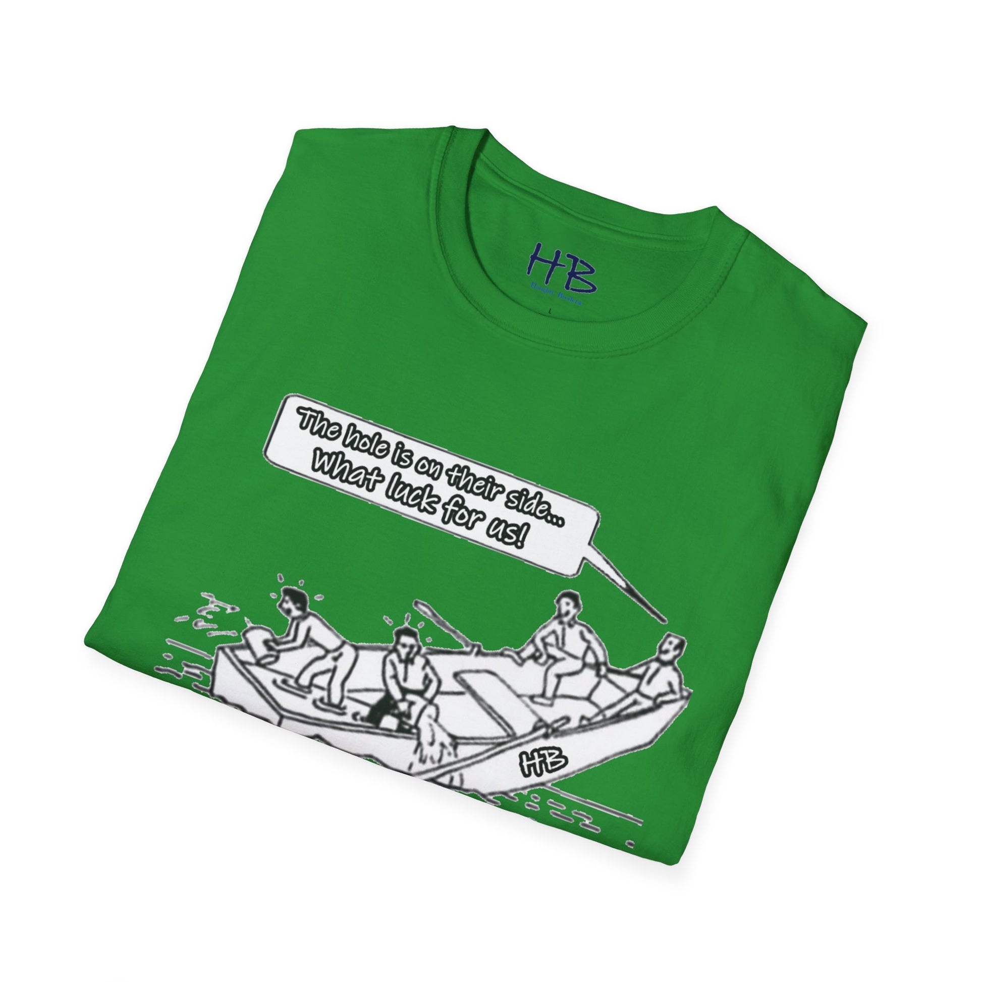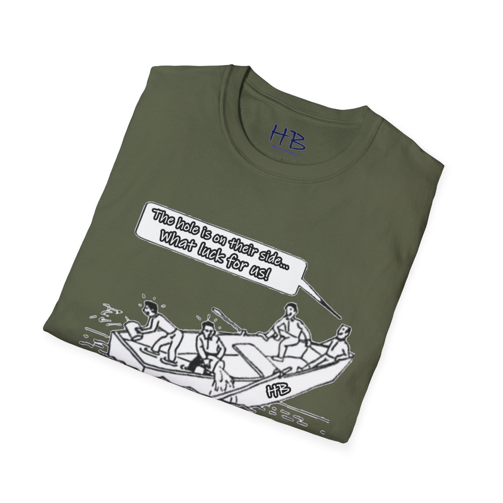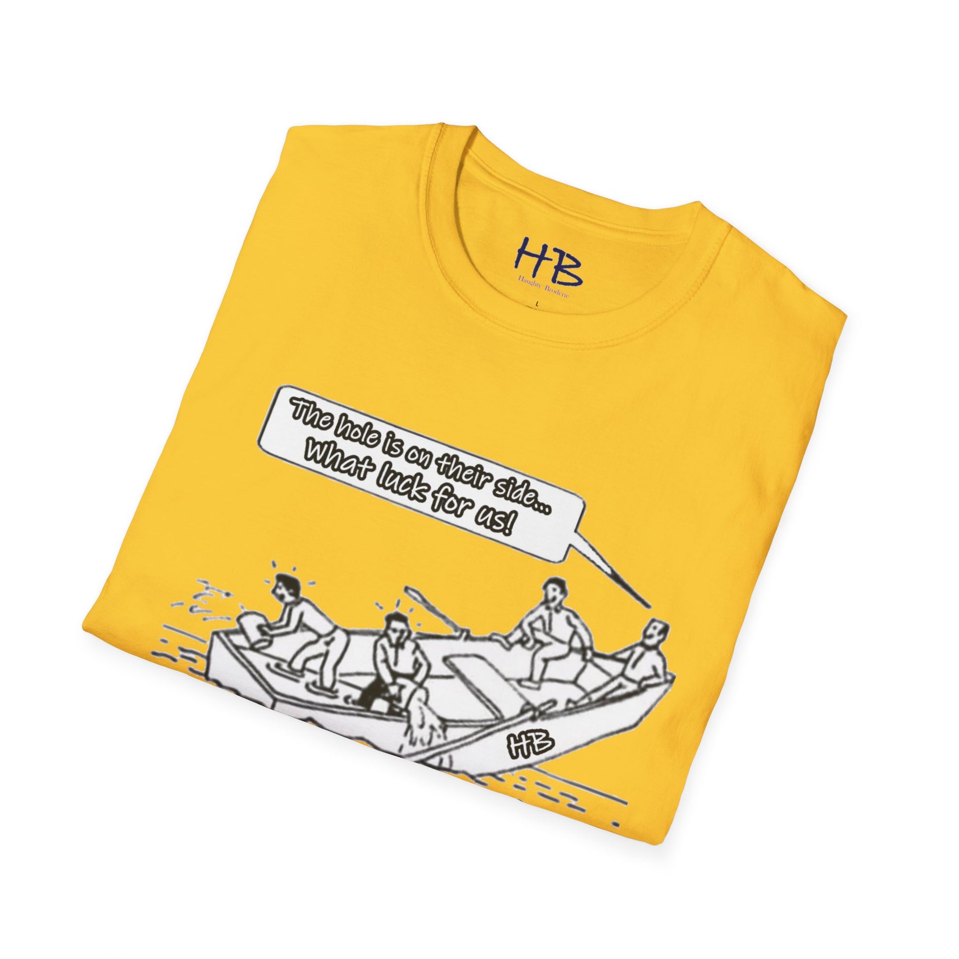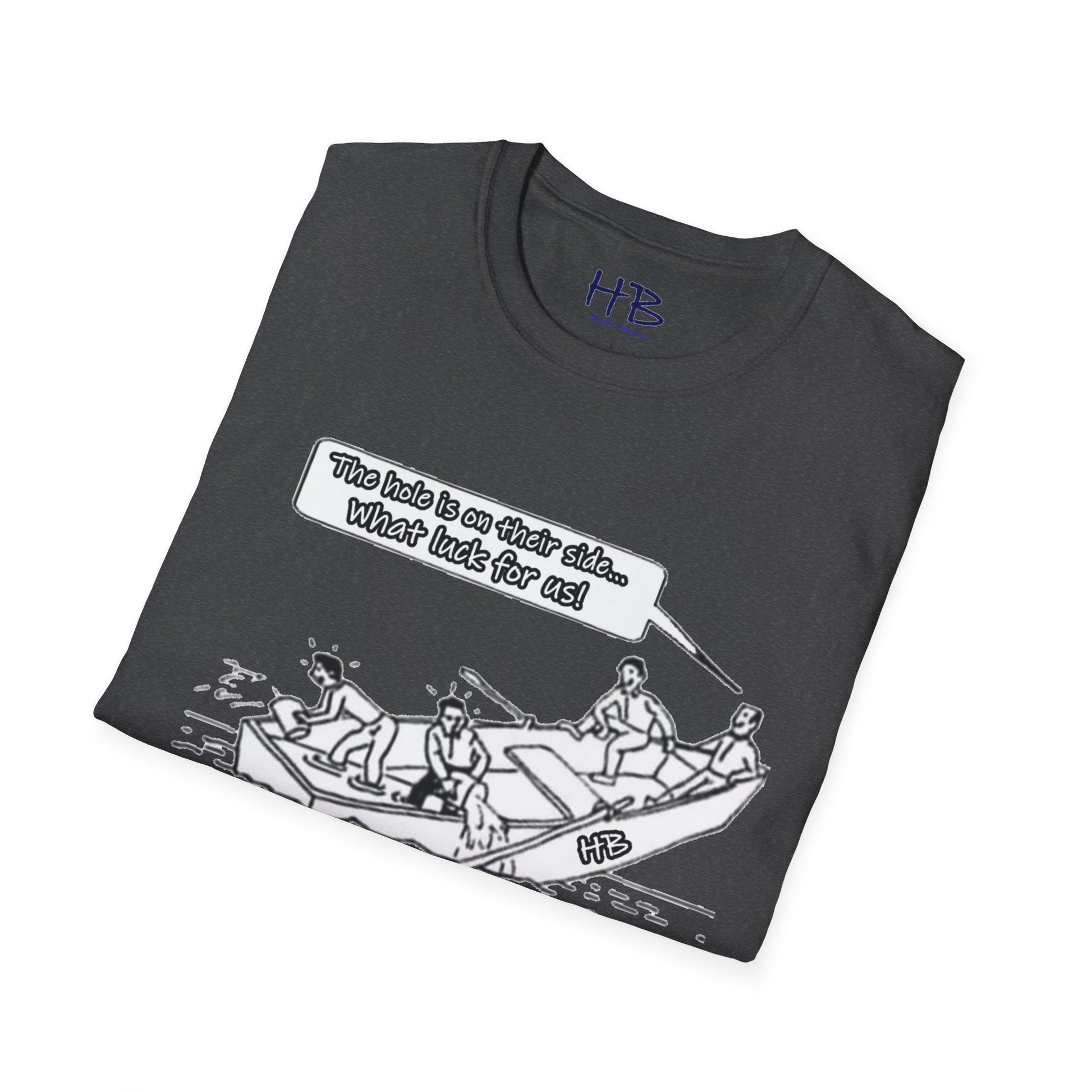 Introducing our captivating and thought-provoking tee shirt, adorned with a compelling image that echoes the subtle nuances of the human experience. Picture this: a whimsical drawing featuring a boat, caught in a precarious situation with a noticeable hole, on the brink of sinking. What sets this design apart is the profound narrative it weaves.