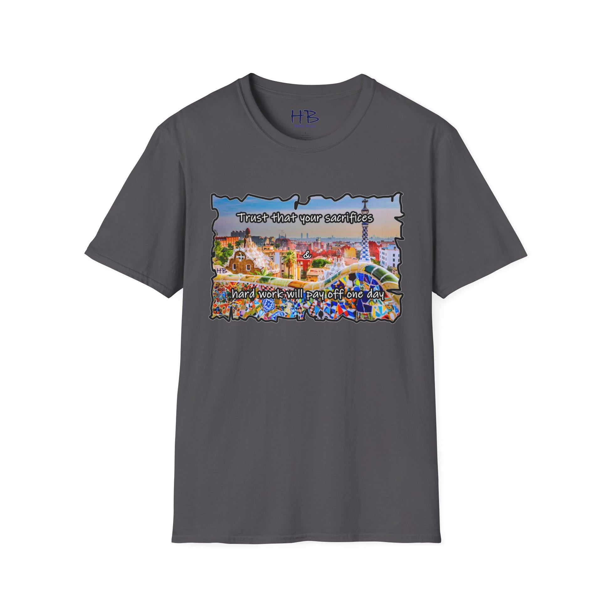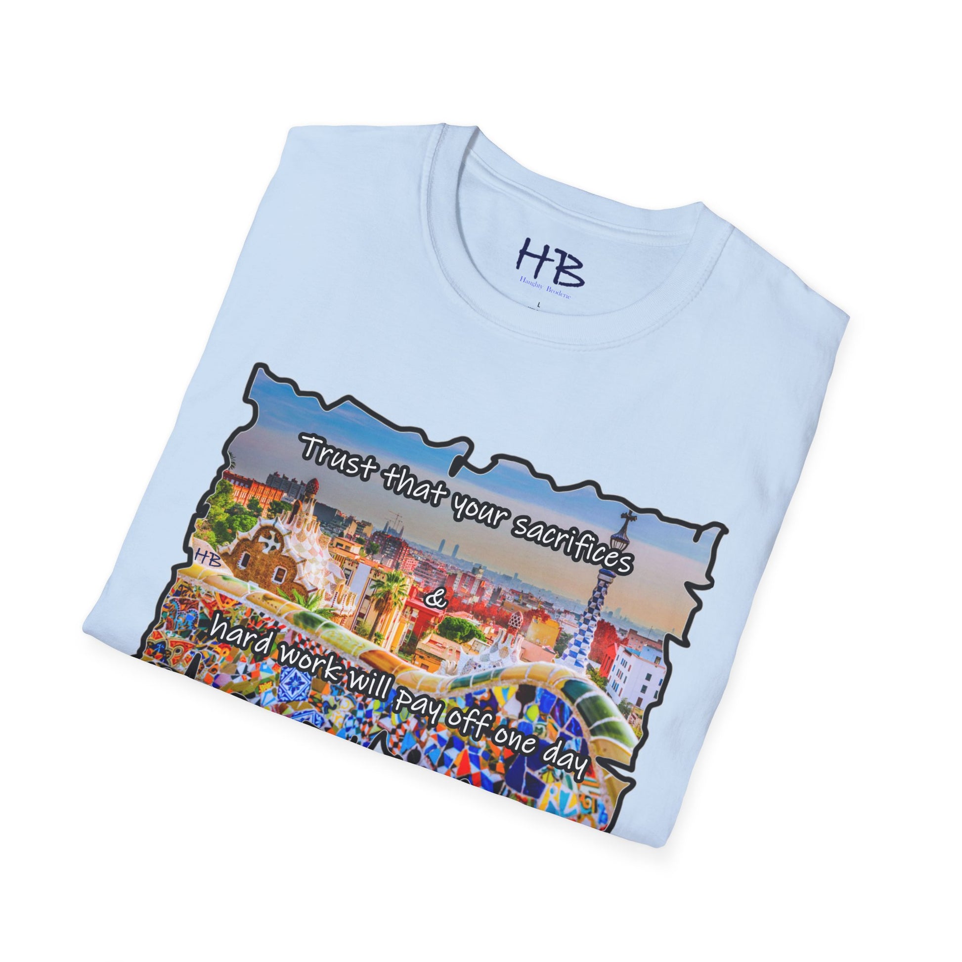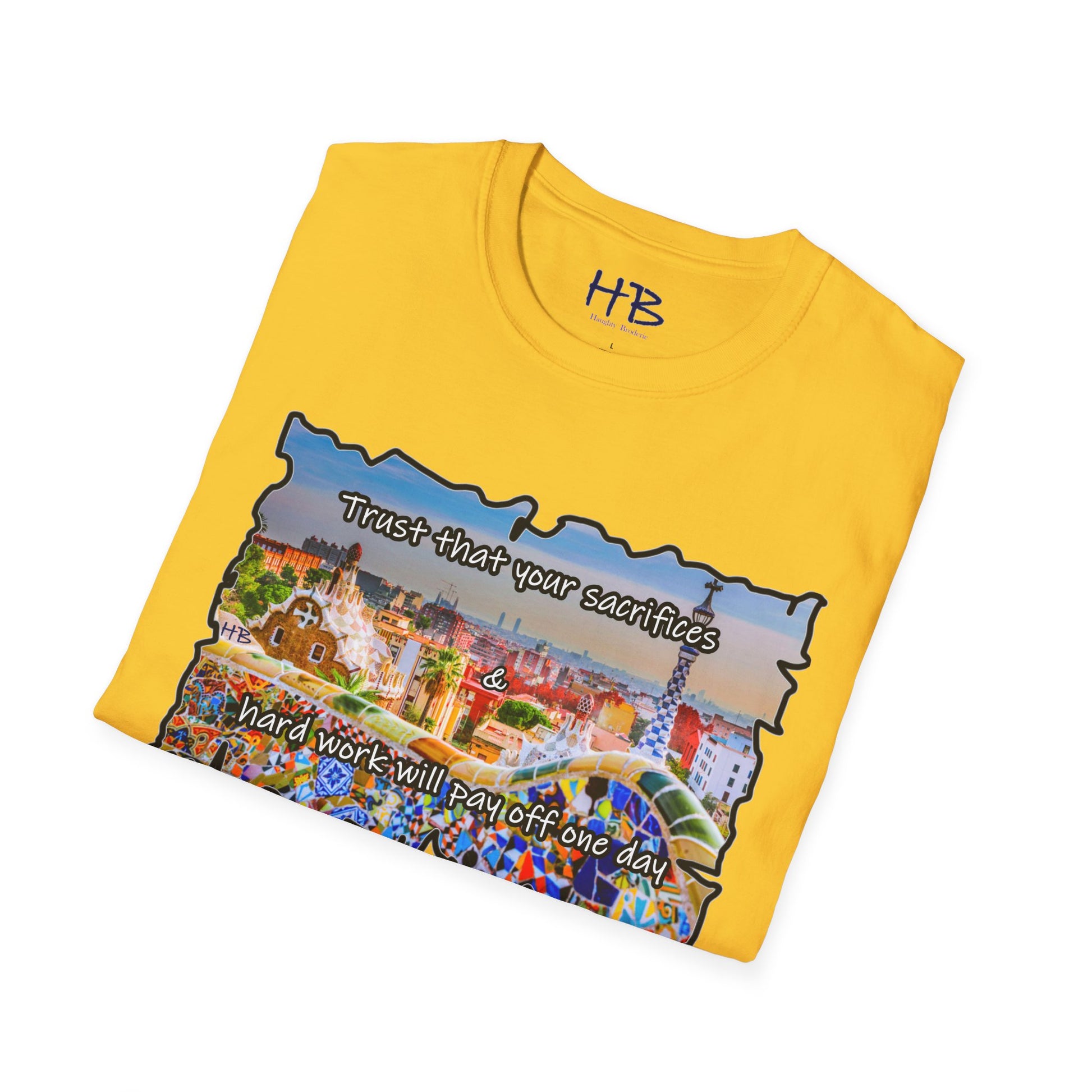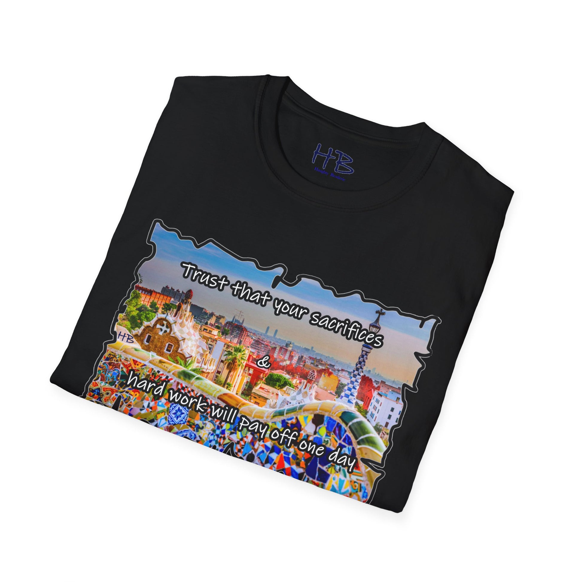 This wearable masterpiece goes beyond being just a garment; it's an embodiment of aspiration and dedication. The central message, elegantly scripted amid this picturesque panorama, reads, "Trust that your sacrifices & hard work will pay off one day." It's a rallying cry for those who navigate the challenging waters of hard work, bypassing the allure of fleeting pleasures to forge a path toward the realization of their most coveted desires.