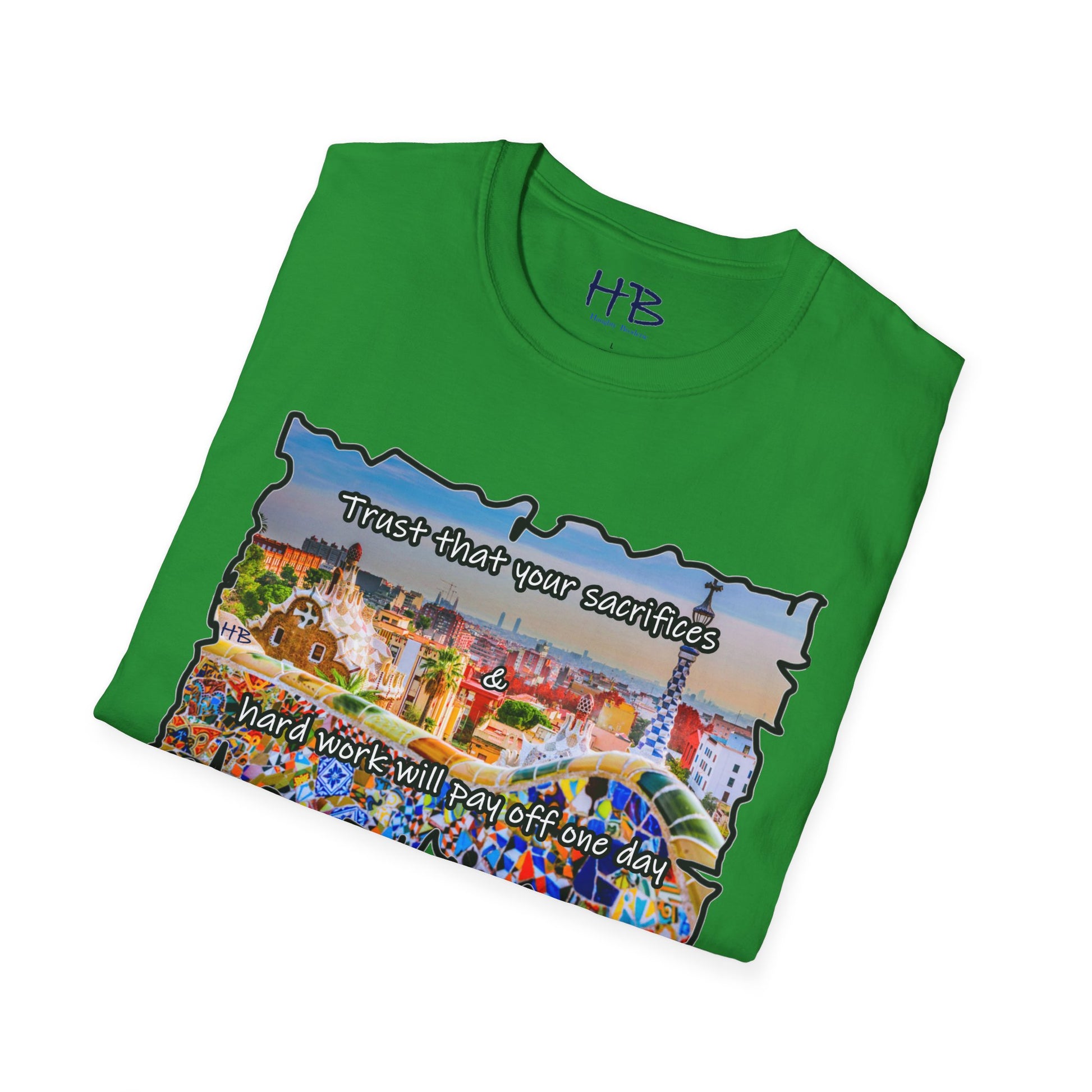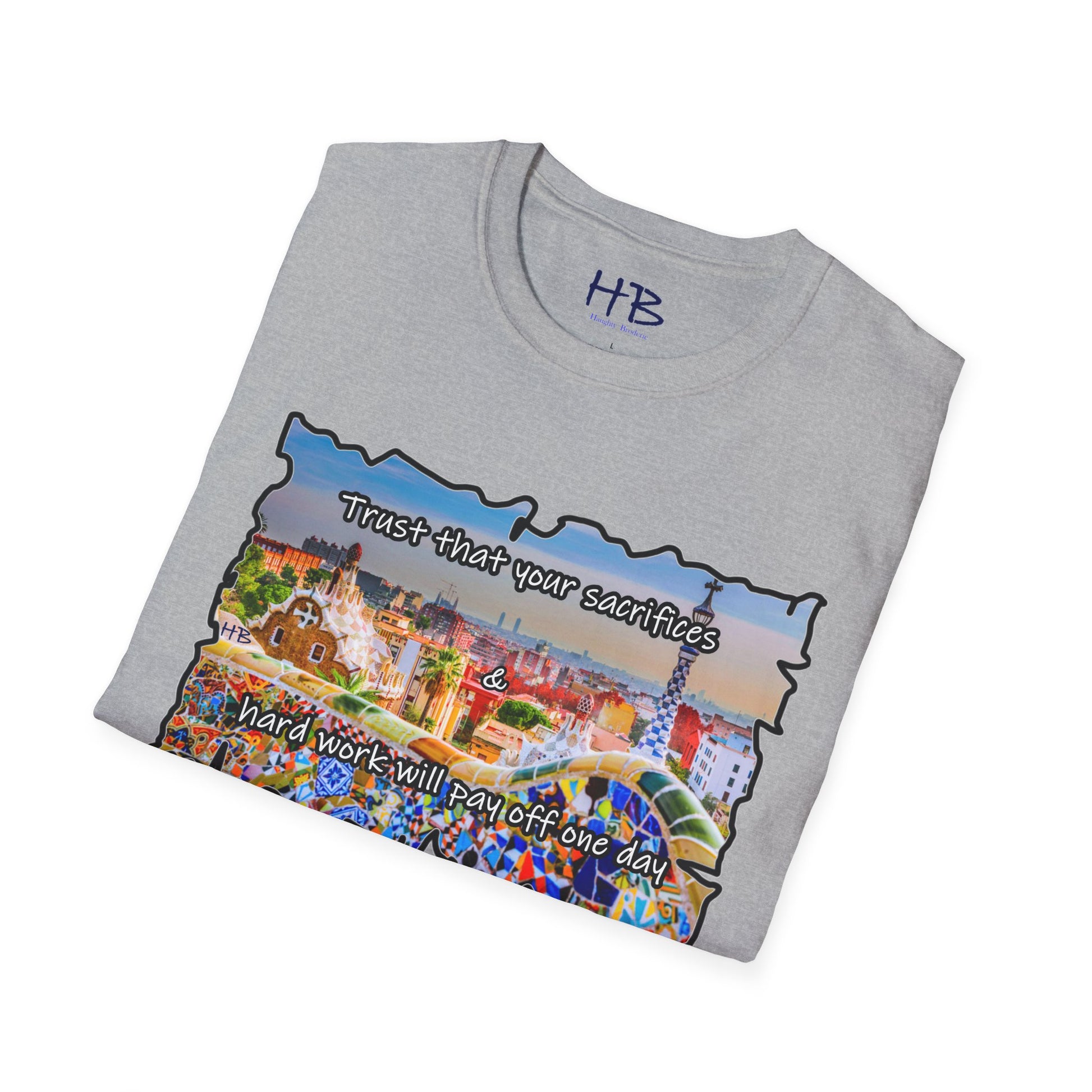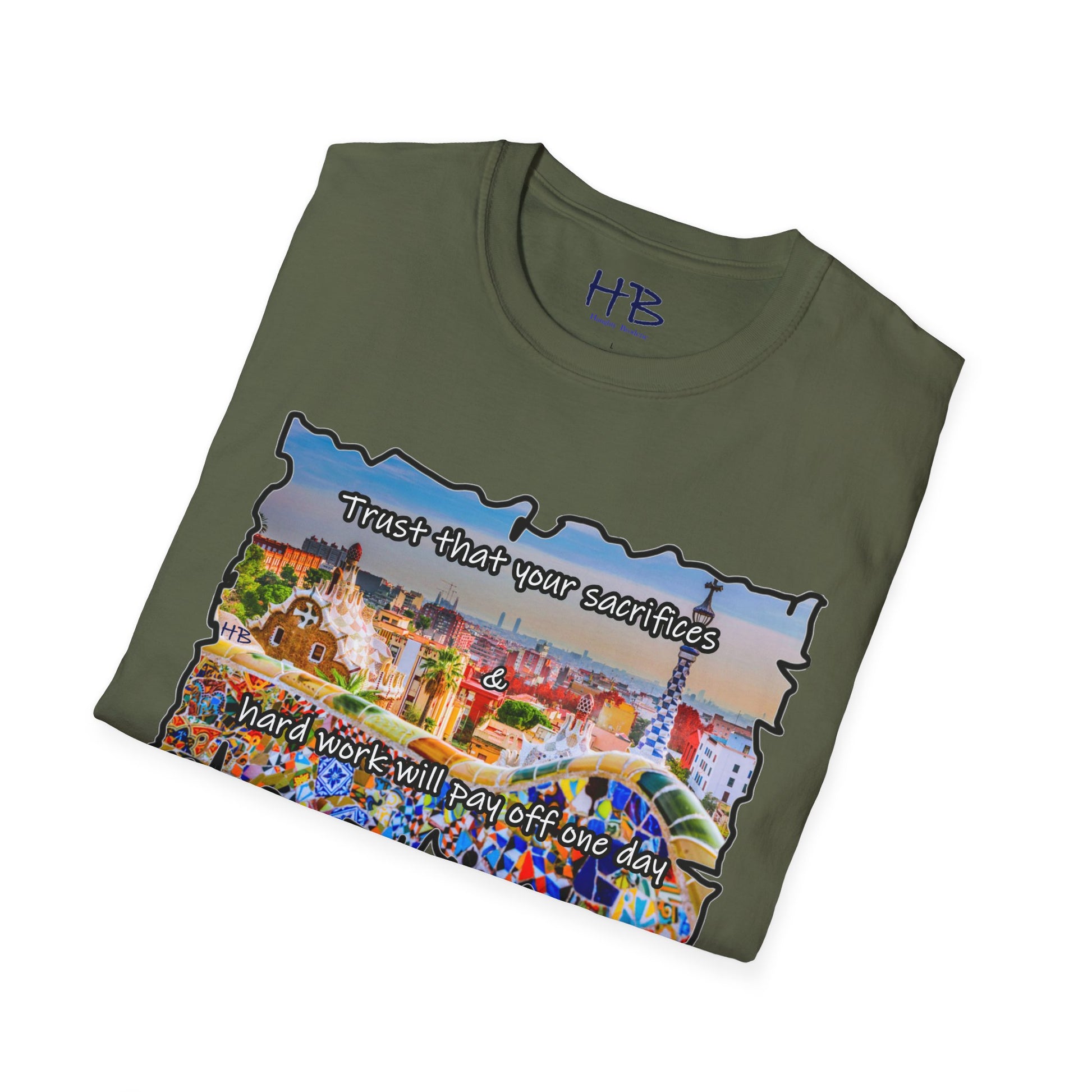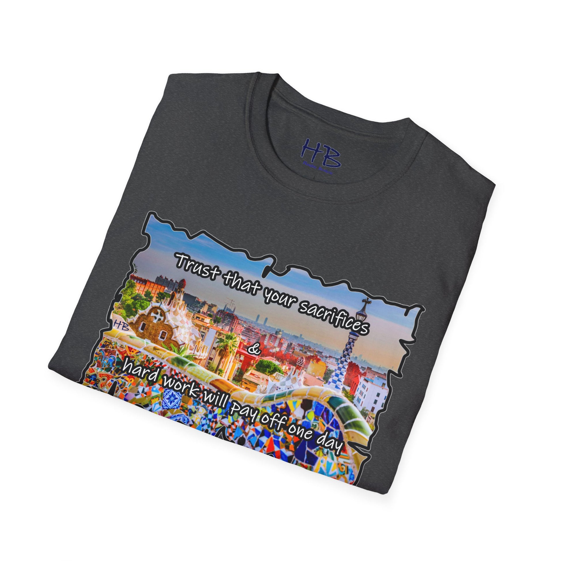 This wearable masterpiece goes beyond being just a garment; it's an embodiment of aspiration and dedication. The central message, elegantly scripted amid this picturesque panorama, reads, "Trust that your sacrifices & hard work will pay off one day." It's a rallying cry for those who navigate the challenging waters of hard work, bypassing the allure of fleeting pleasures to forge a path toward the realization of their most coveted desires.