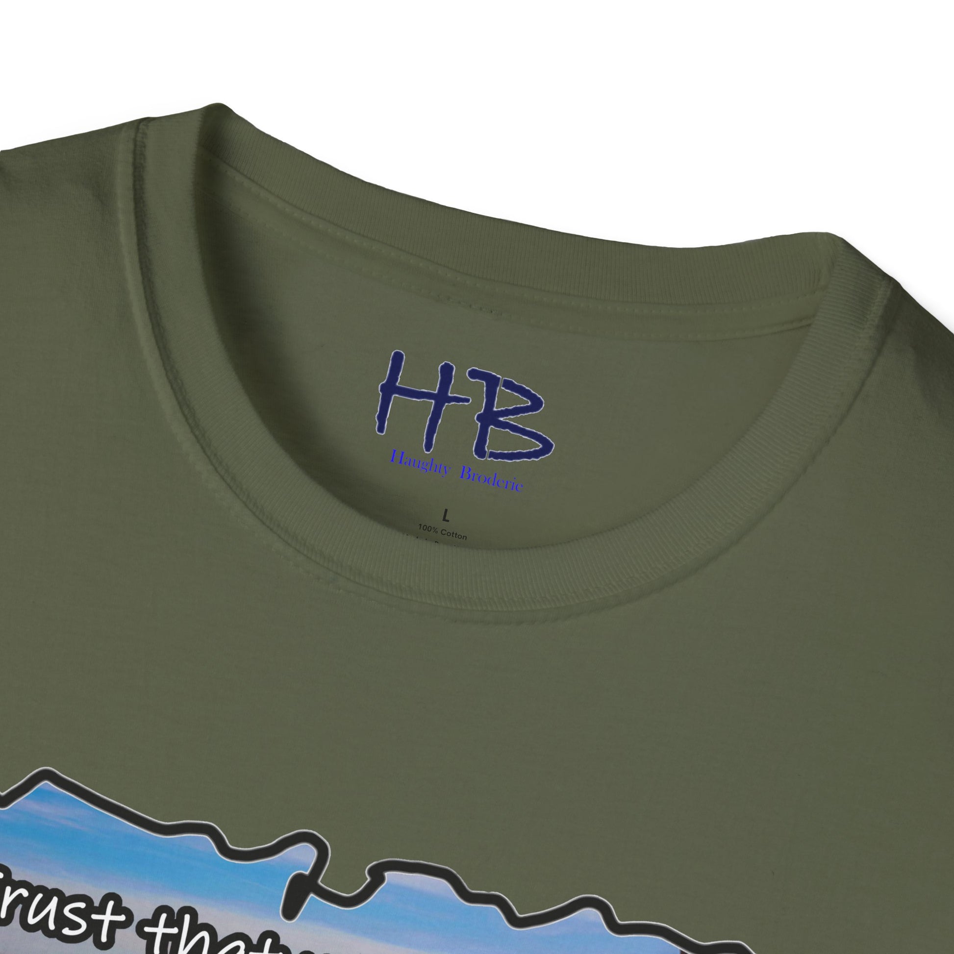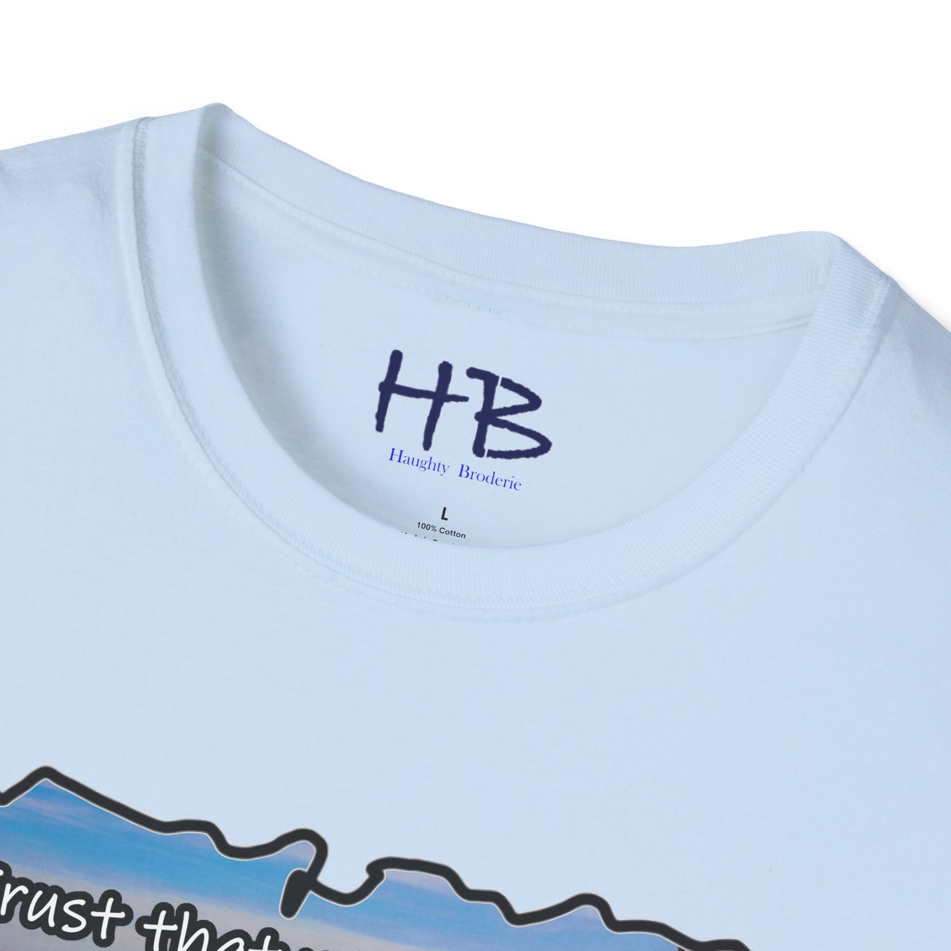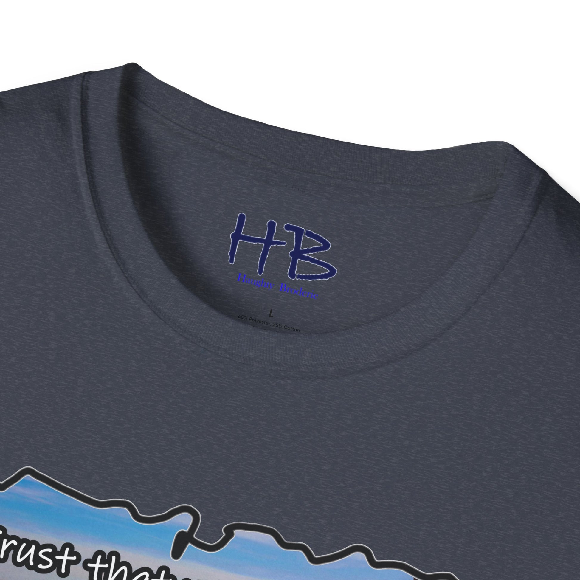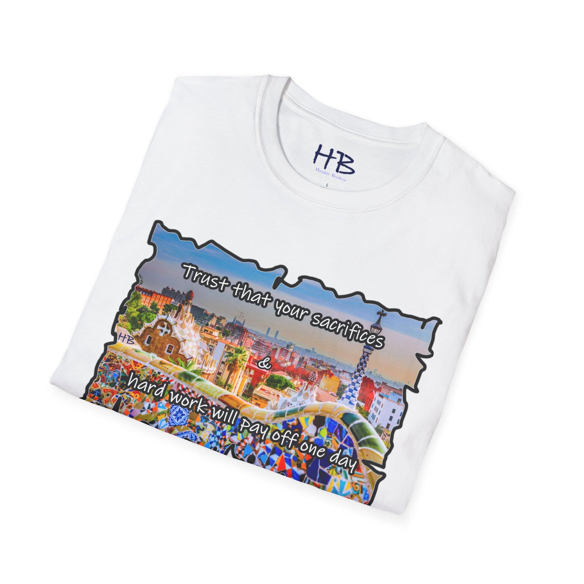 This wearable masterpiece goes beyond being just a garment; it's an embodiment of aspiration and dedication. The central message, elegantly scripted amid this picturesque panorama, reads, "Trust that your sacrifices & hard work will pay off one day." It's a rallying cry for those who navigate the challenging waters of hard work, bypassing the allure of fleeting pleasures to forge a path toward the realization of their most coveted desires.