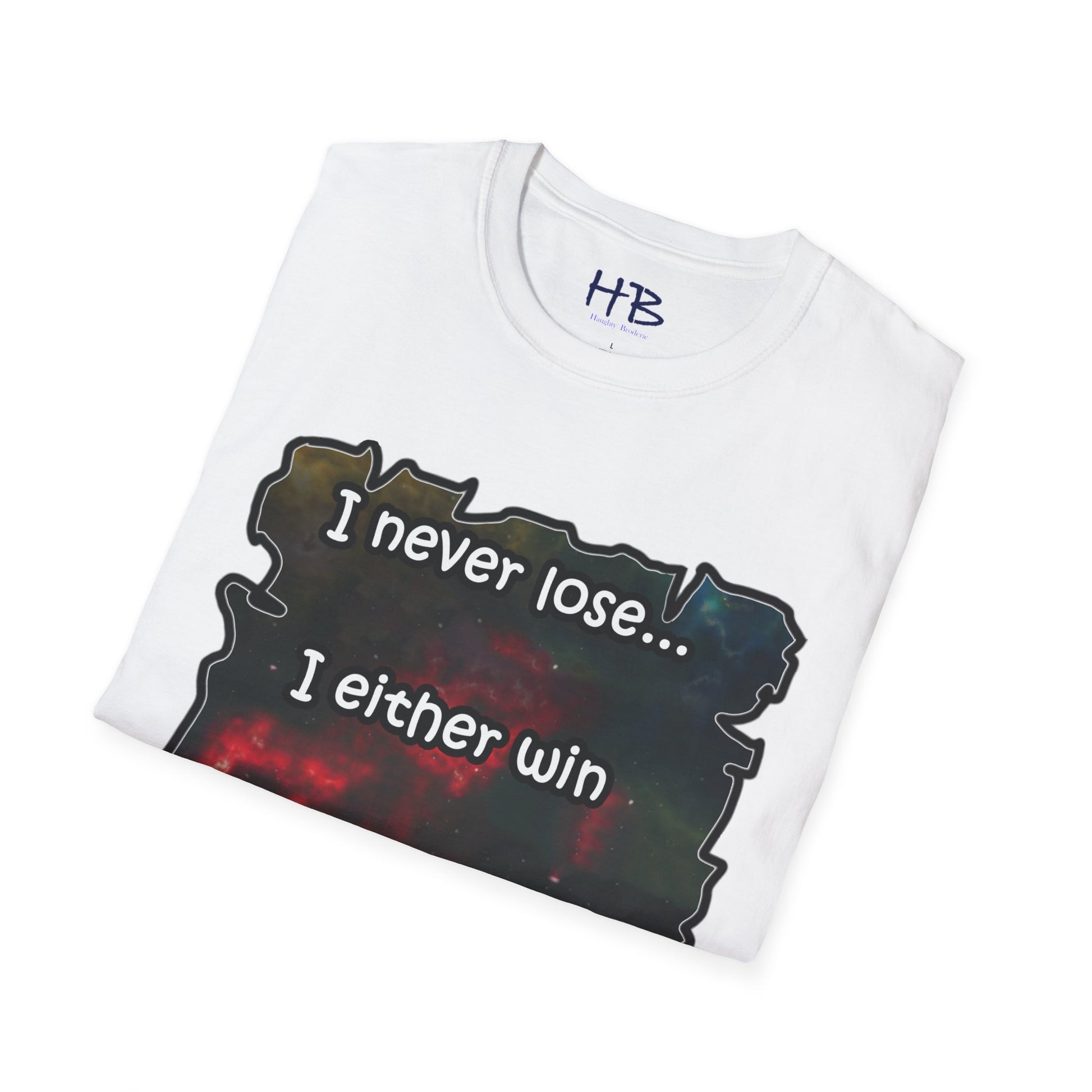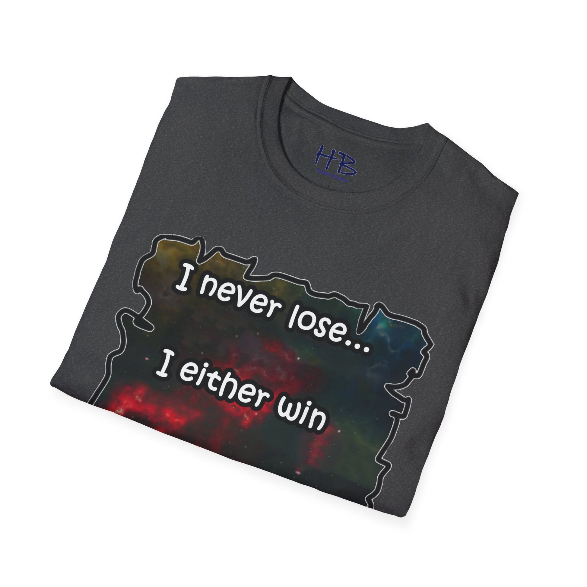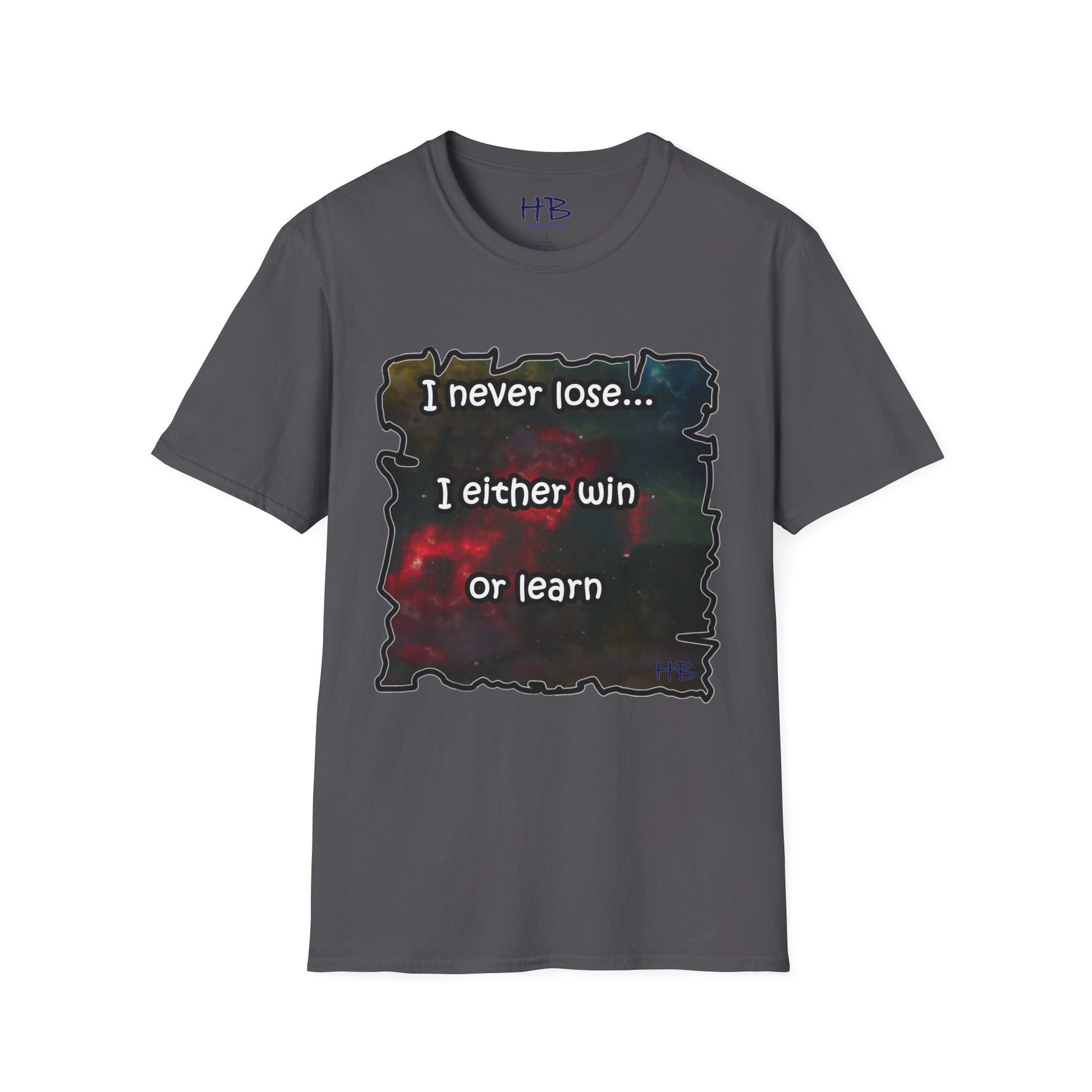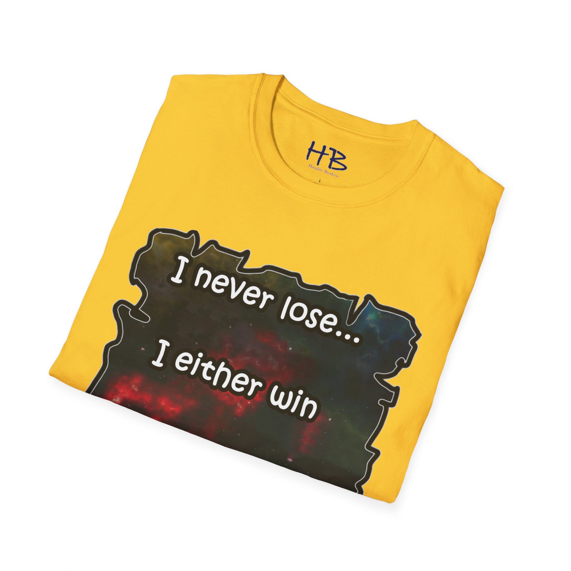 Introducing a remarkable garment that encapsulates the cosmic wonders of our universe, portrayed in a vibrant and captivating manner. This extraordinary piece carries an illustration of the cosmos, where resplendent galaxies coexist harmoniously, adorned with countless stars that twinkle like precious gemstones. The text inscribed beneath, "I never lose... I either win or learn," serves as an empowering mantra, echoing the resilience and growth inherent in every individual's journey.