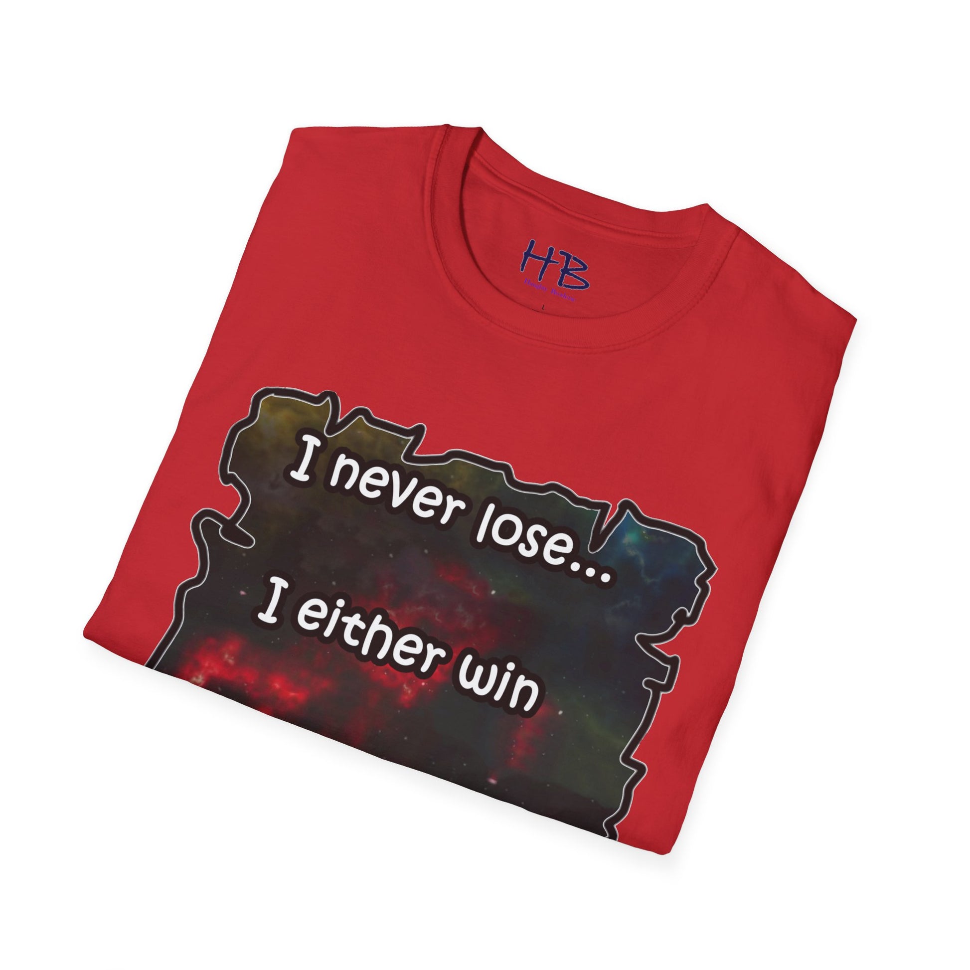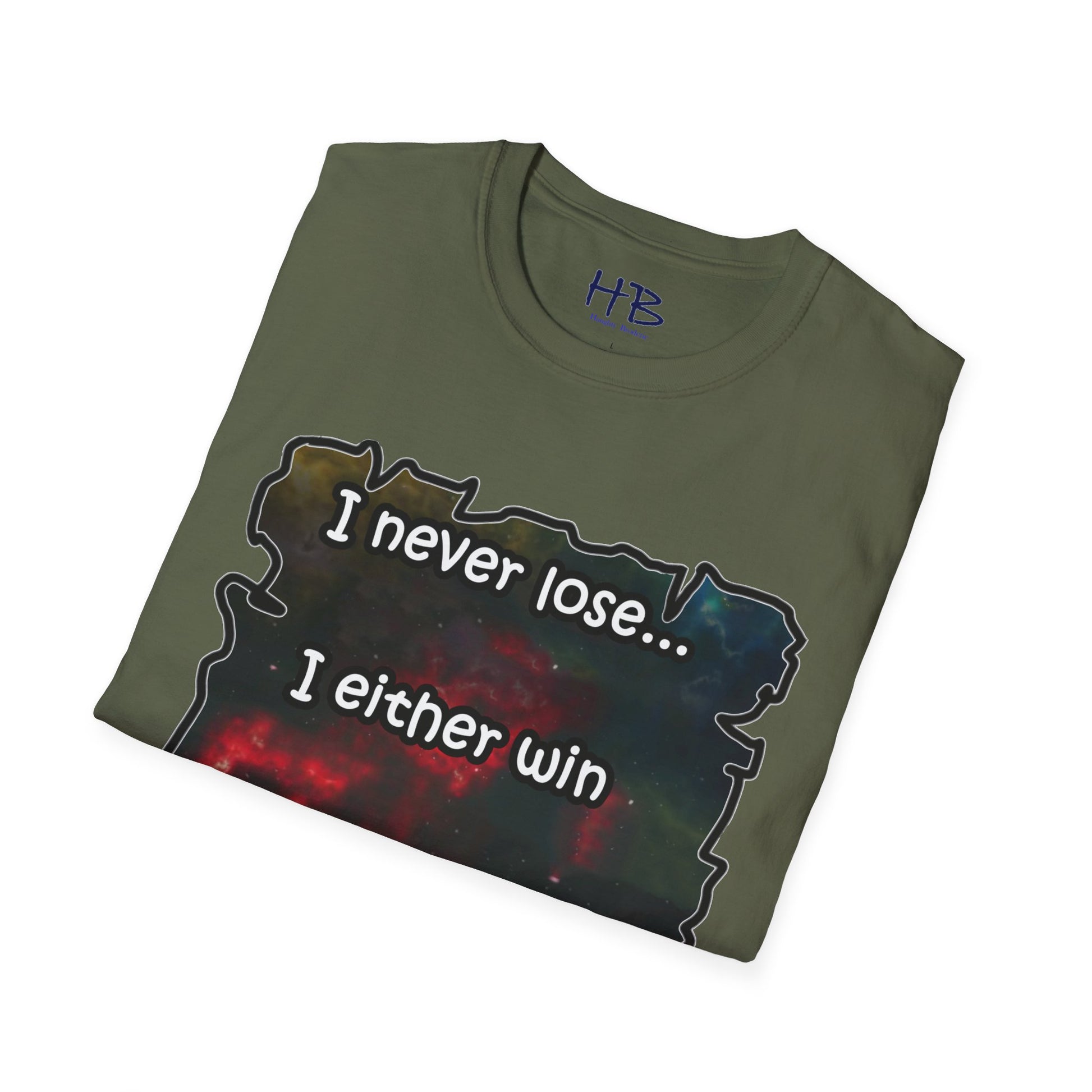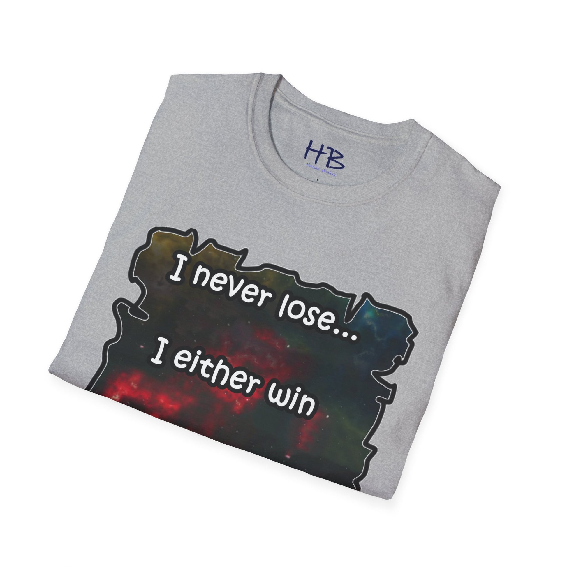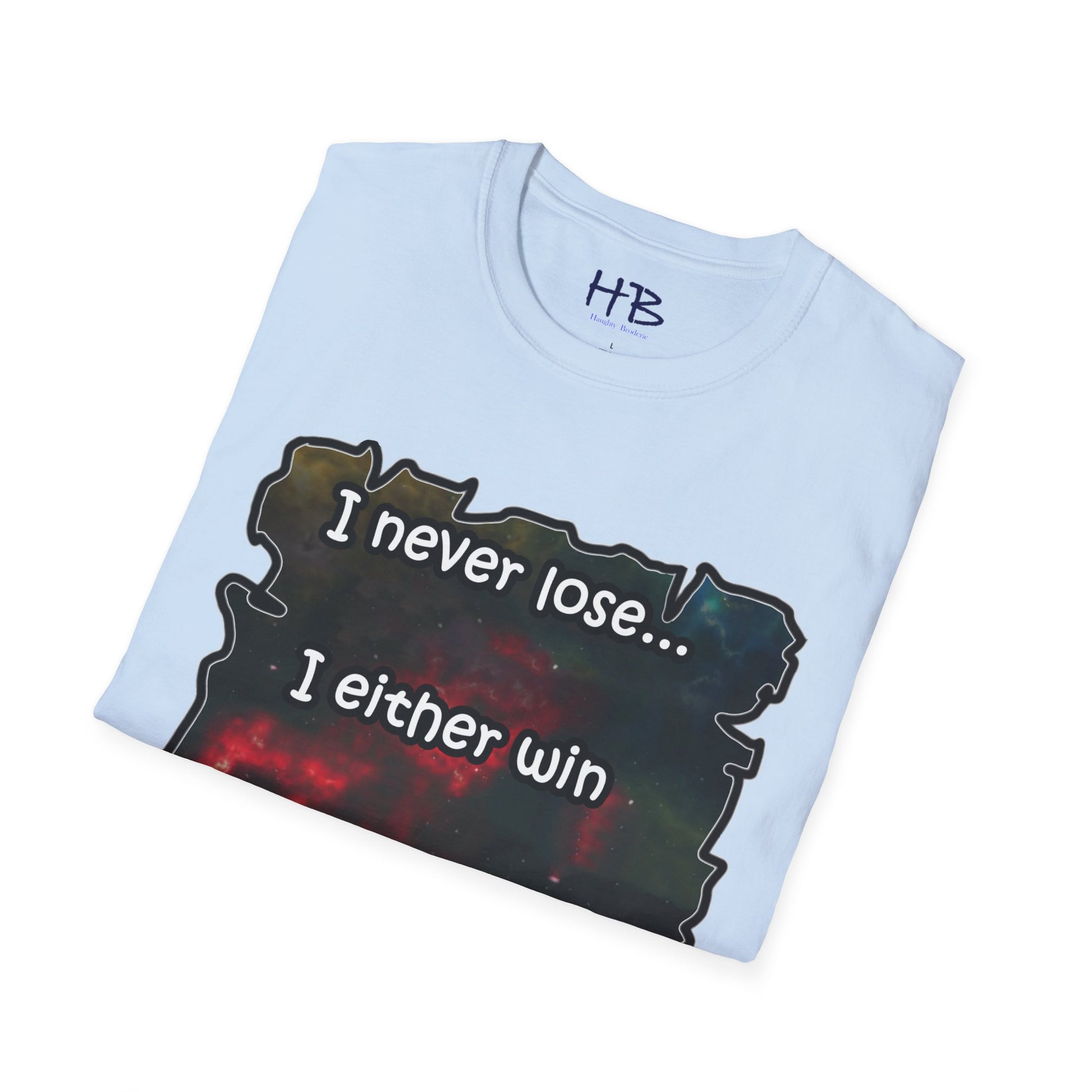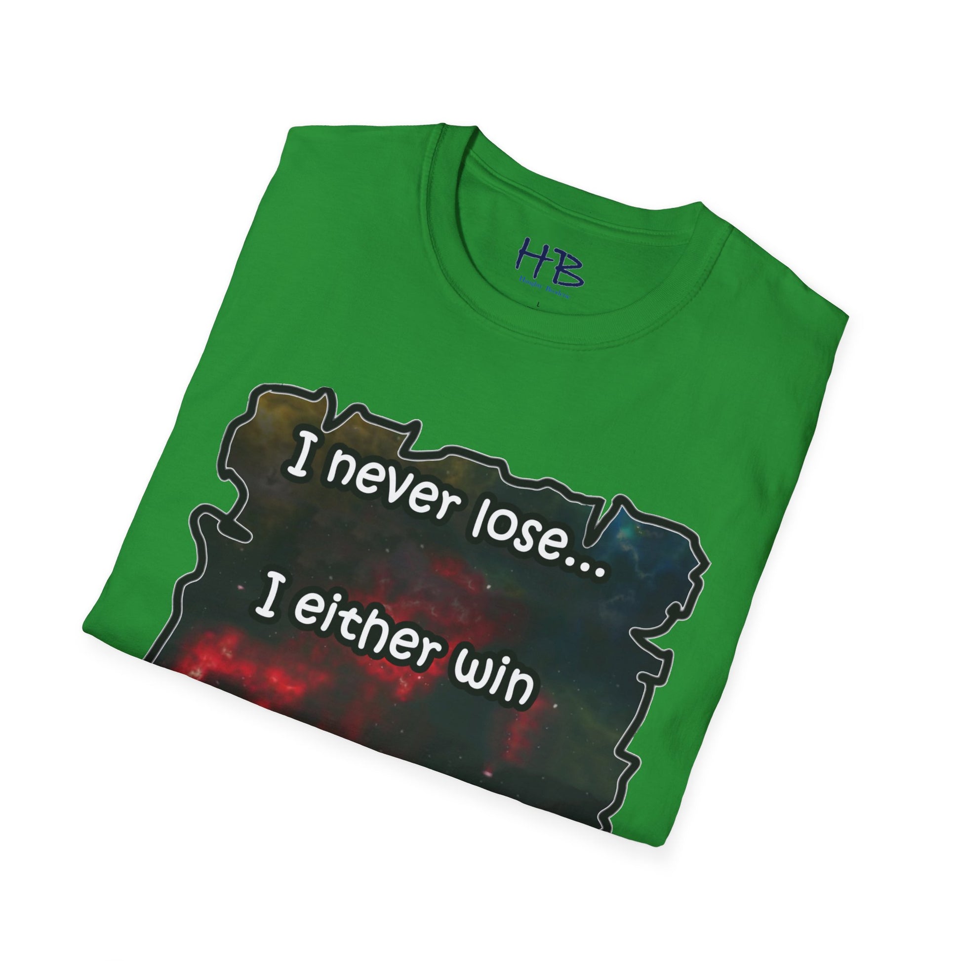 Introducing a remarkable garment that encapsulates the cosmic wonders of our universe, portrayed in a vibrant and captivating manner. This extraordinary piece carries an illustration of the cosmos, where resplendent galaxies coexist harmoniously, adorned with countless stars that twinkle like precious gemstones. The text inscribed beneath, "I never lose... I either win or learn," serves as an empowering mantra, echoing the resilience and growth inherent in every individual's journey.