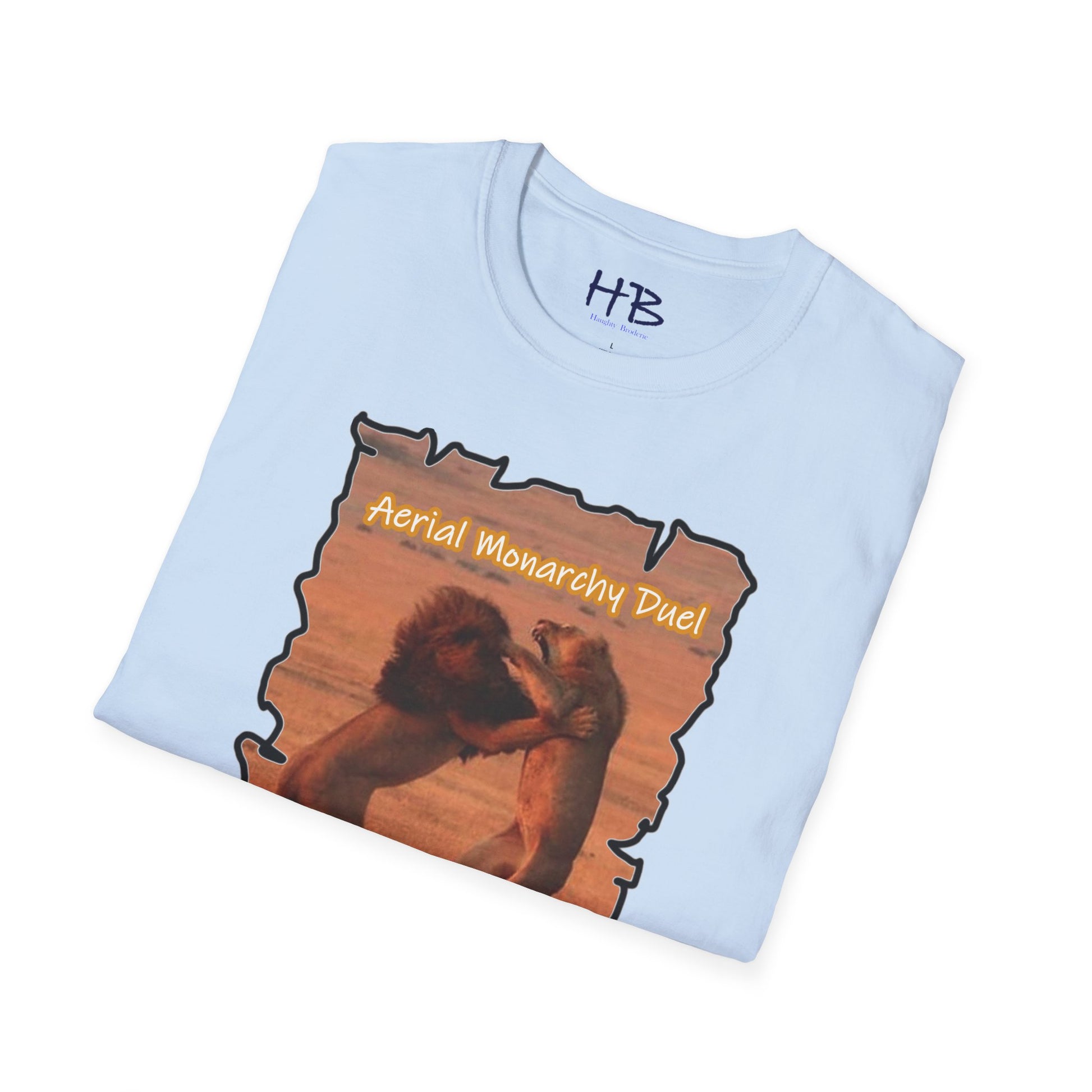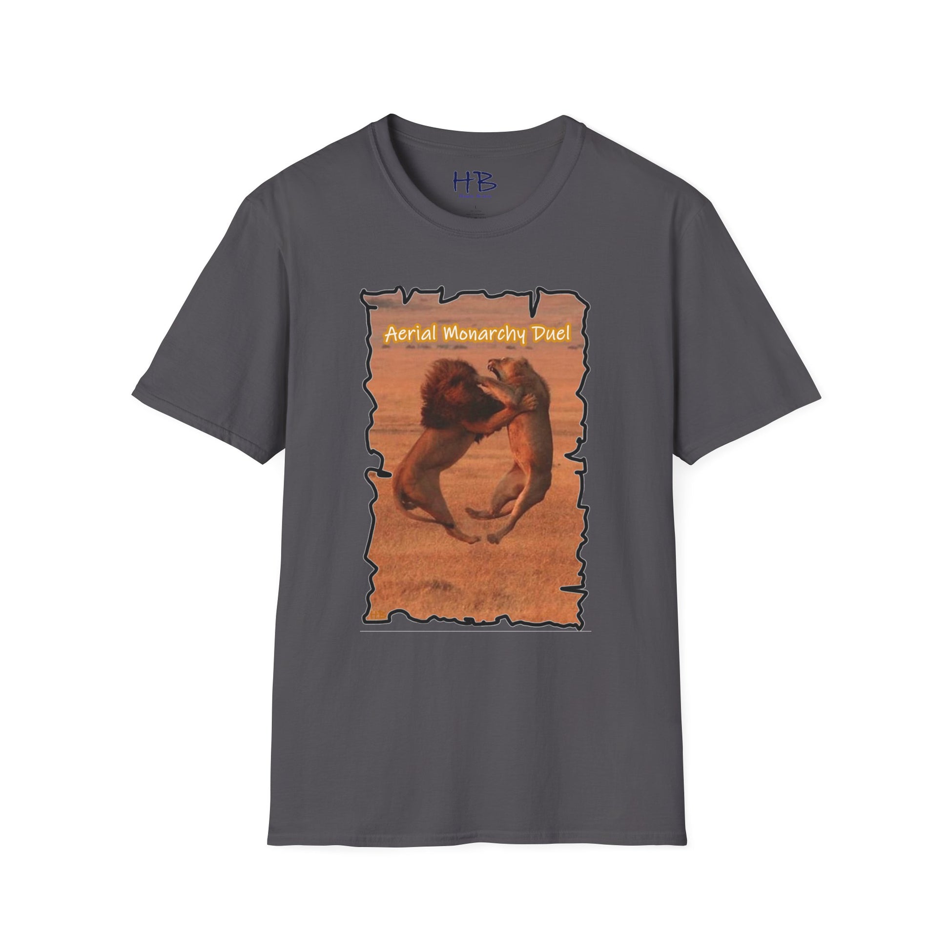 Introducing the epitome of dominance and ambition encapsulated in fabric – our "Aerial Monarchy Duel" T-shirt. Picture this: a breathtaking tableau of a young lion soaring through the air, engaged in a fierce battle of wills with a mature lion, both roaring with mouths wide open. This magnificent clash symbolizes the struggle for leadership, an audacious bid for the throne of the Pride. The vivid imagery transcends the jungle, serving as a potent metaphor for the contemporary world, where every individual strives to assert their capabilities and emerge as the leader of their domain.