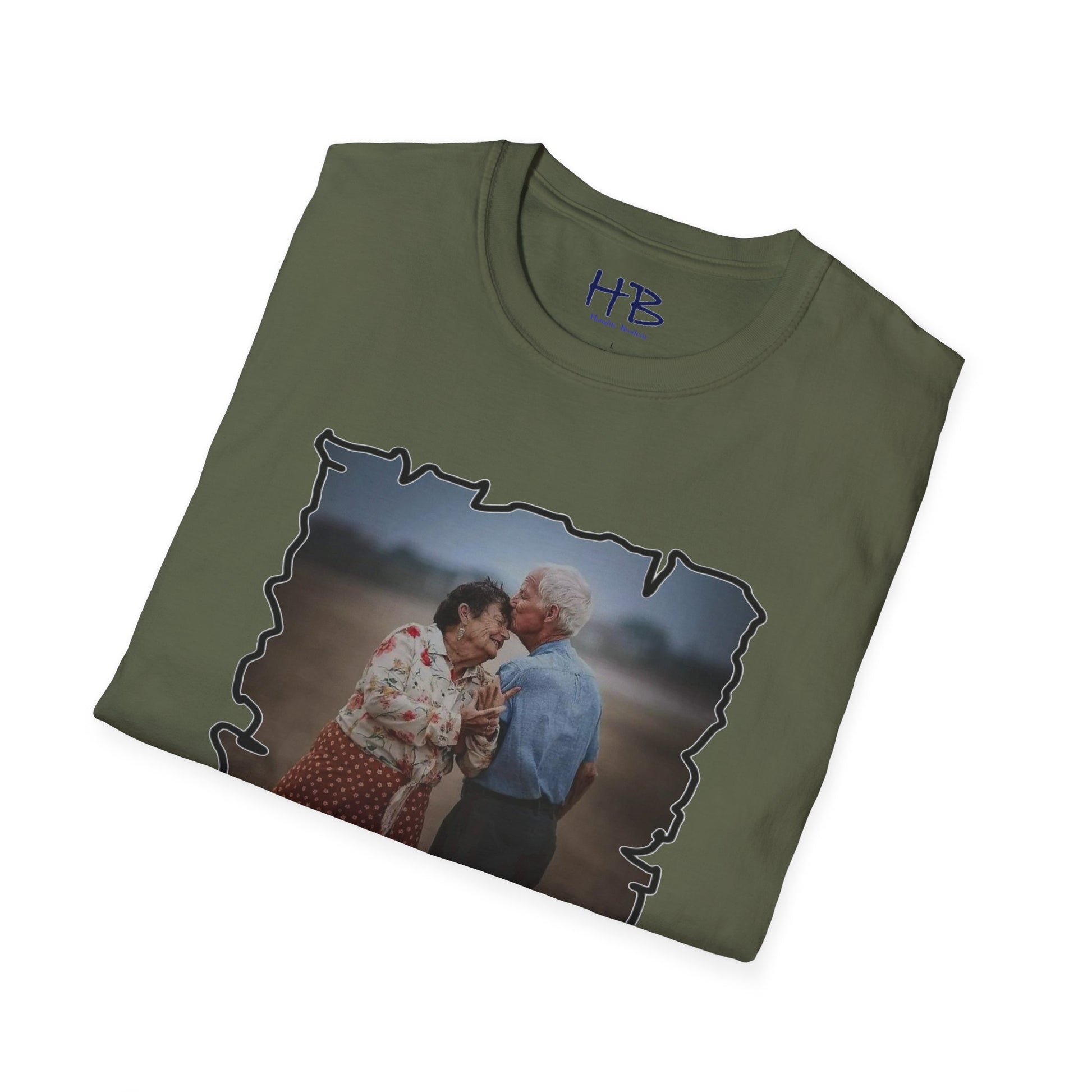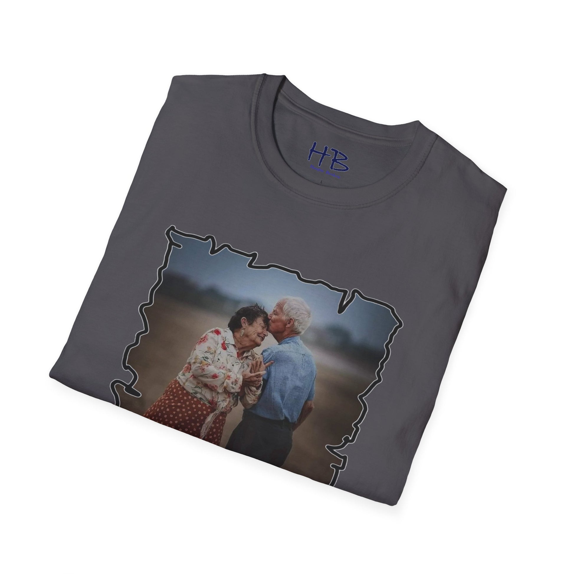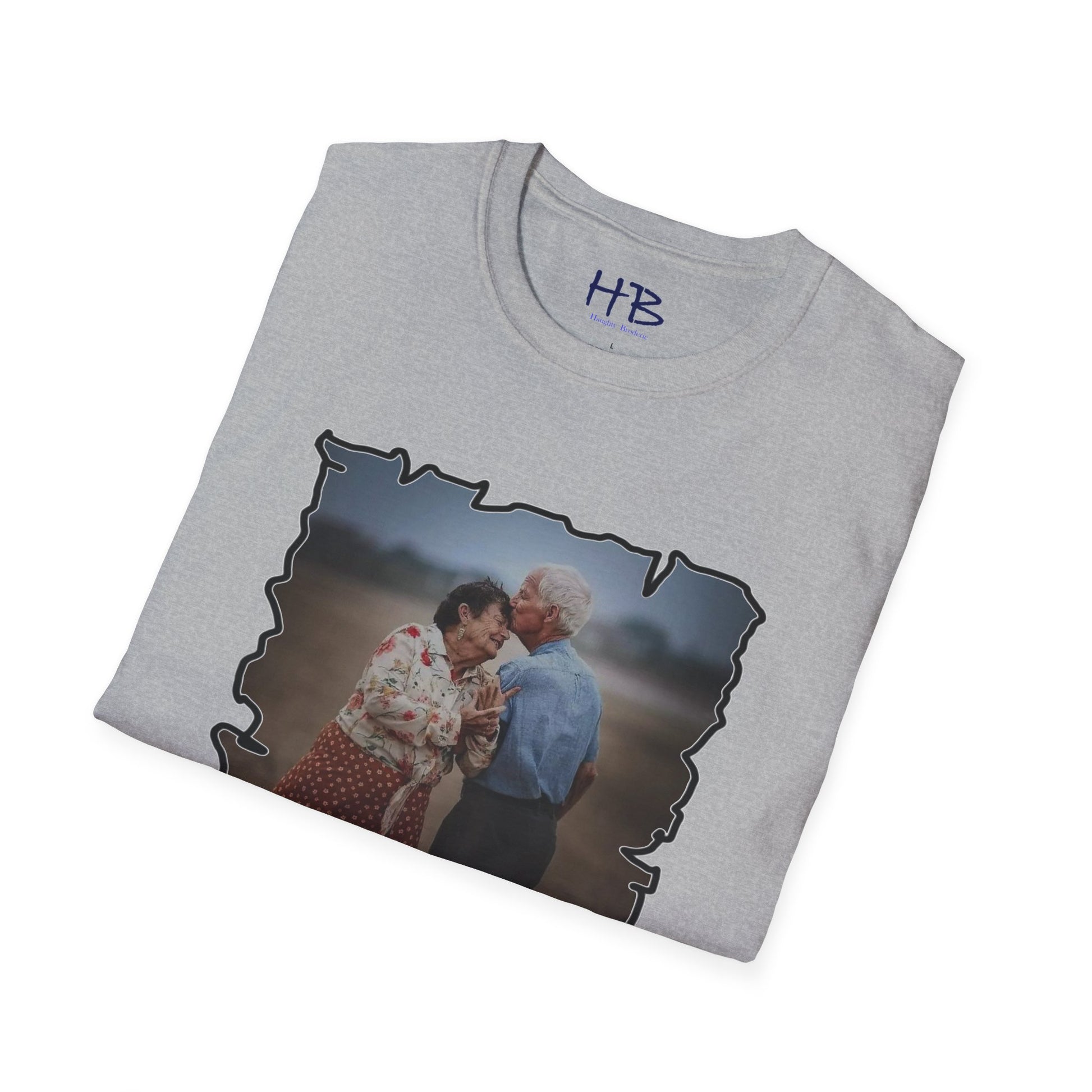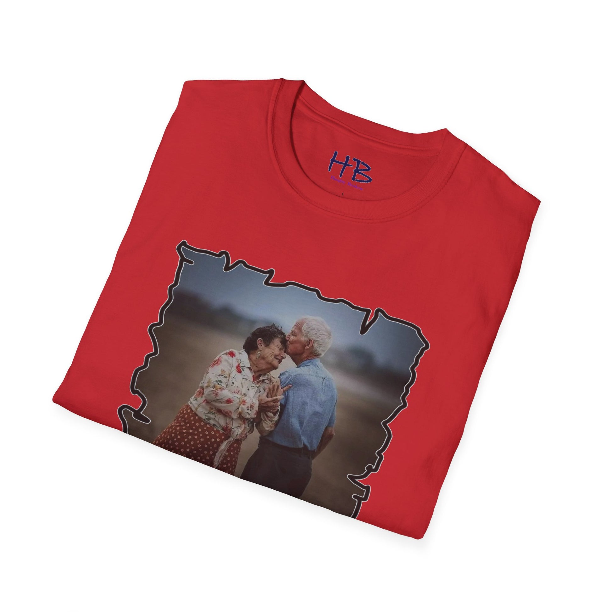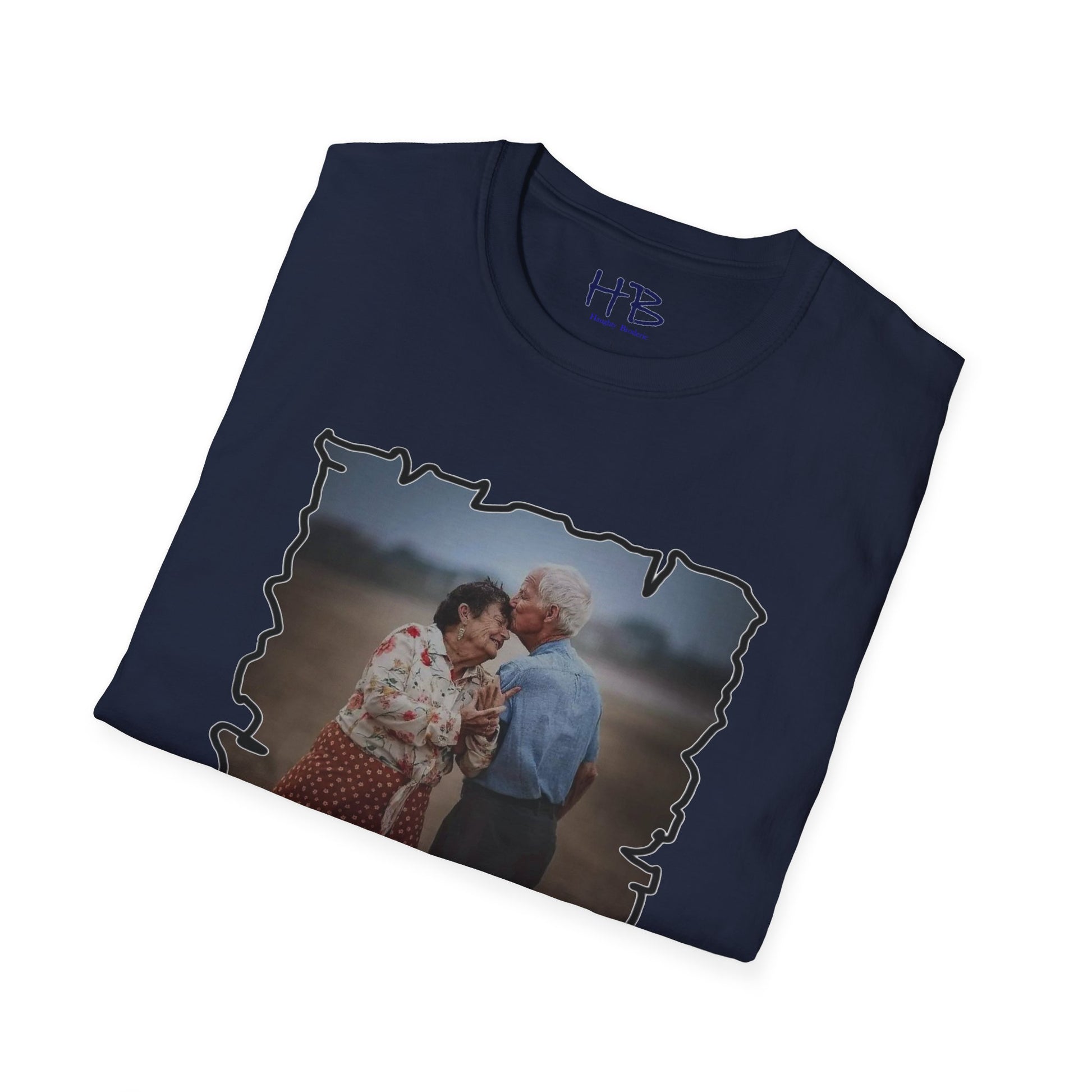 Introducing a timeless garment that embodies the essence of love and devotion - a tee shirt featuring a heartwarming image of an elderly gentleman gently pressing his lips to his cherished wife's forehead, as she affectionately embraces his arm. This poignant portrayal encapsulates the profound truth that love is not mere words, but a tangible display of affection and care.