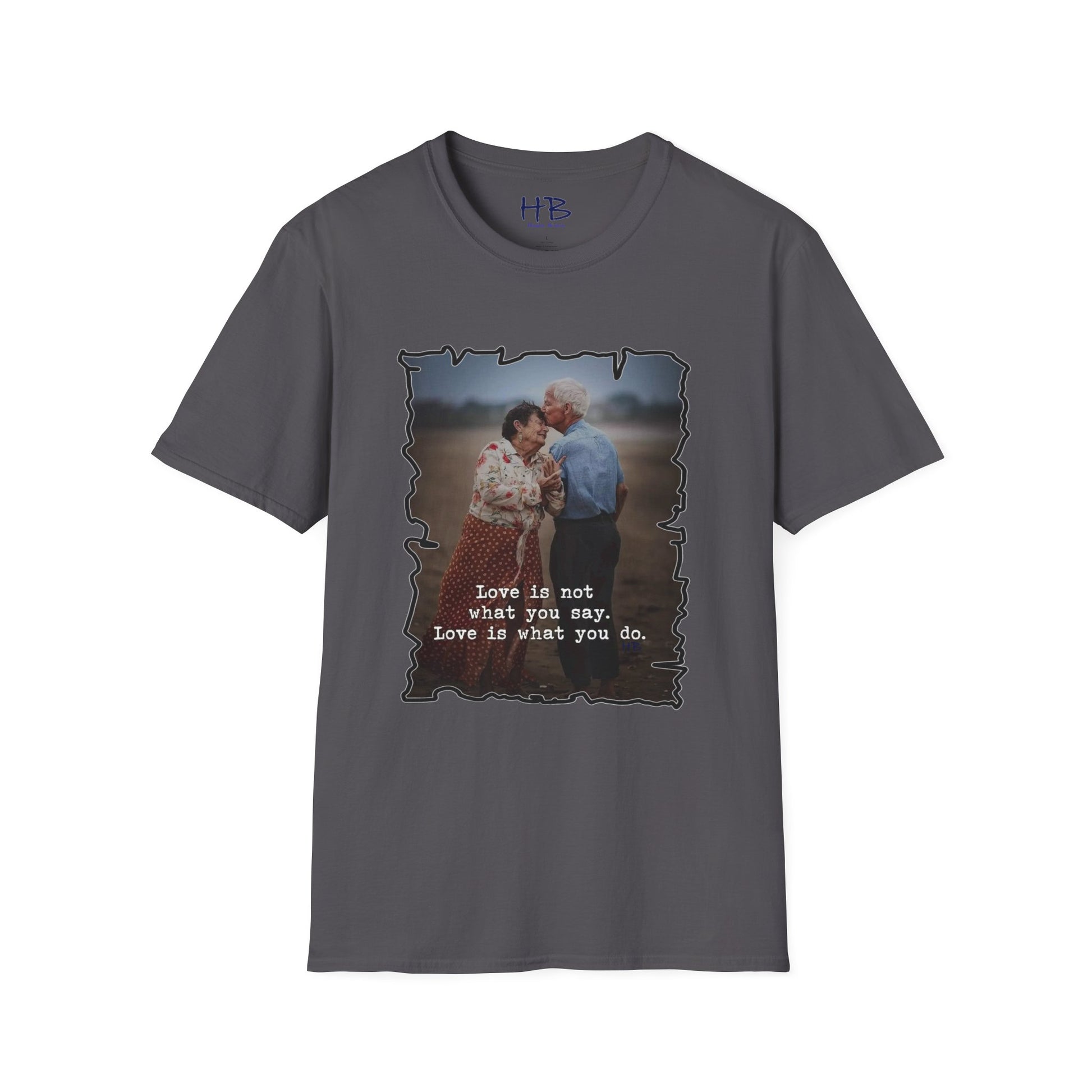 Crafted with meticulous attention to detail, this remarkable tee shirt bears the inscription "Love is not what you say, it is what you do," a powerful reminder of the significance of actions in nurturing relationships. The image speaks volumes about the enduring bond shared by two souls who have weathered the storms of life together and emerged stronger.