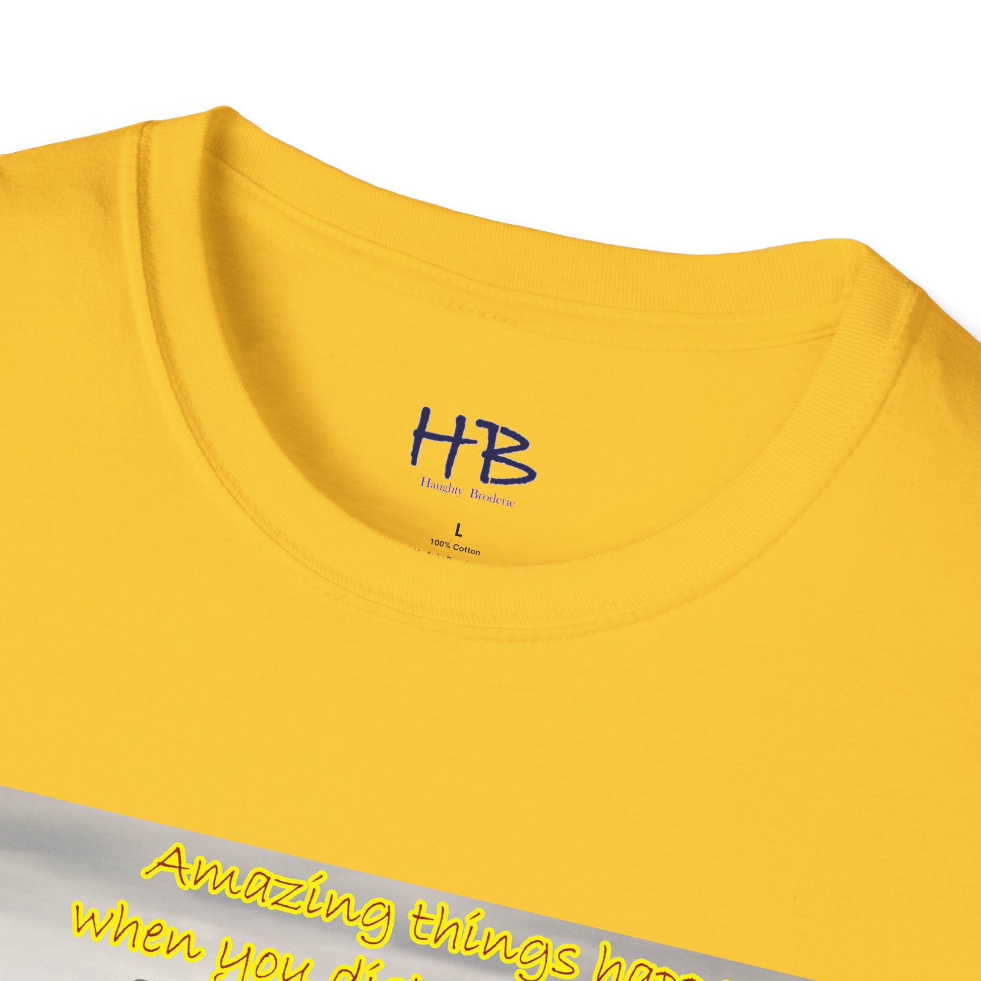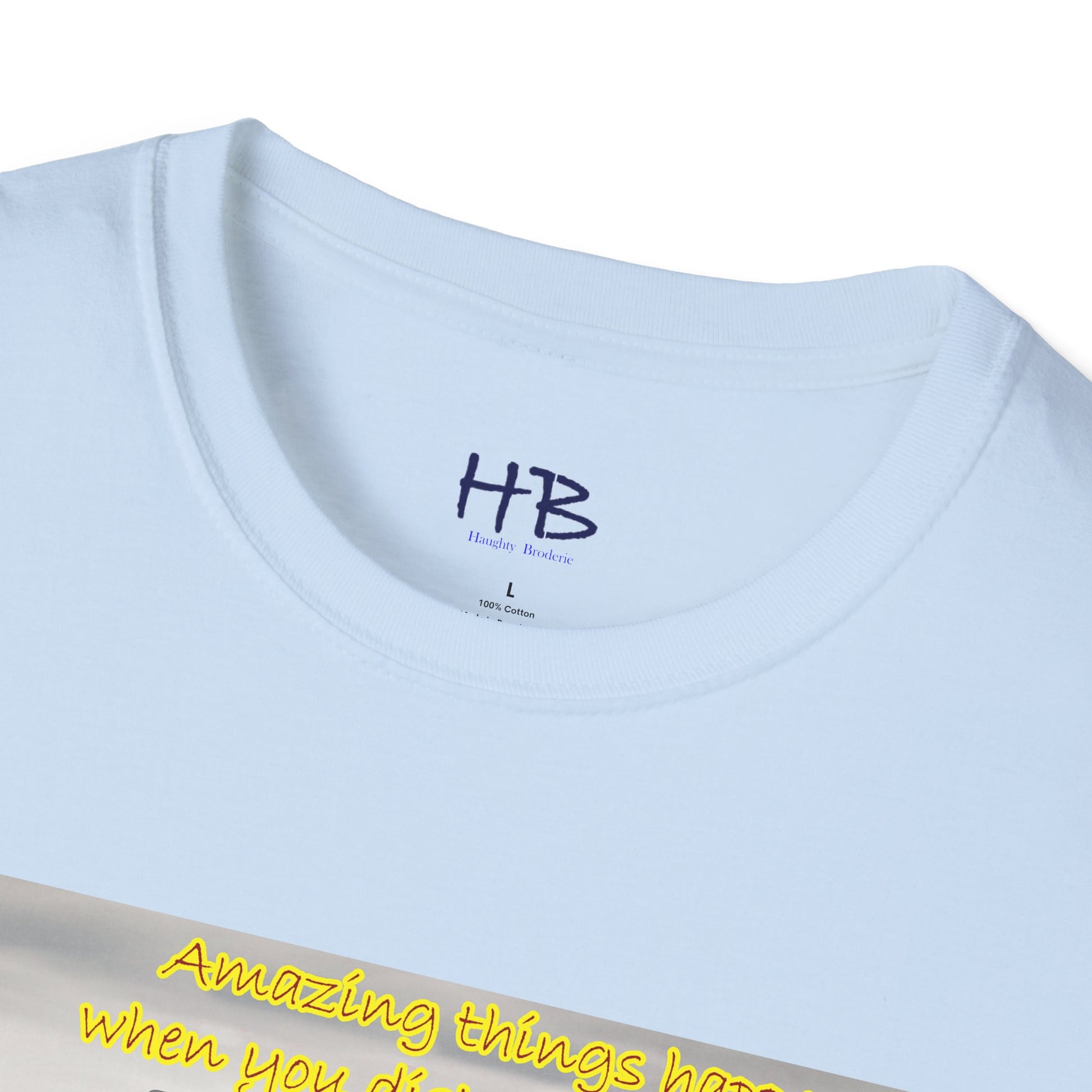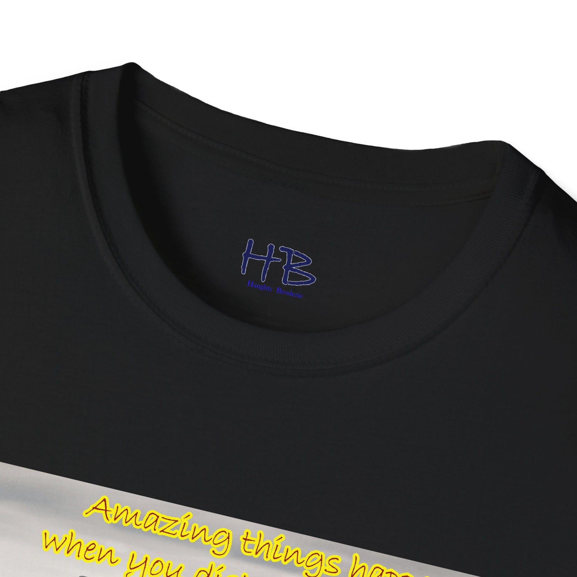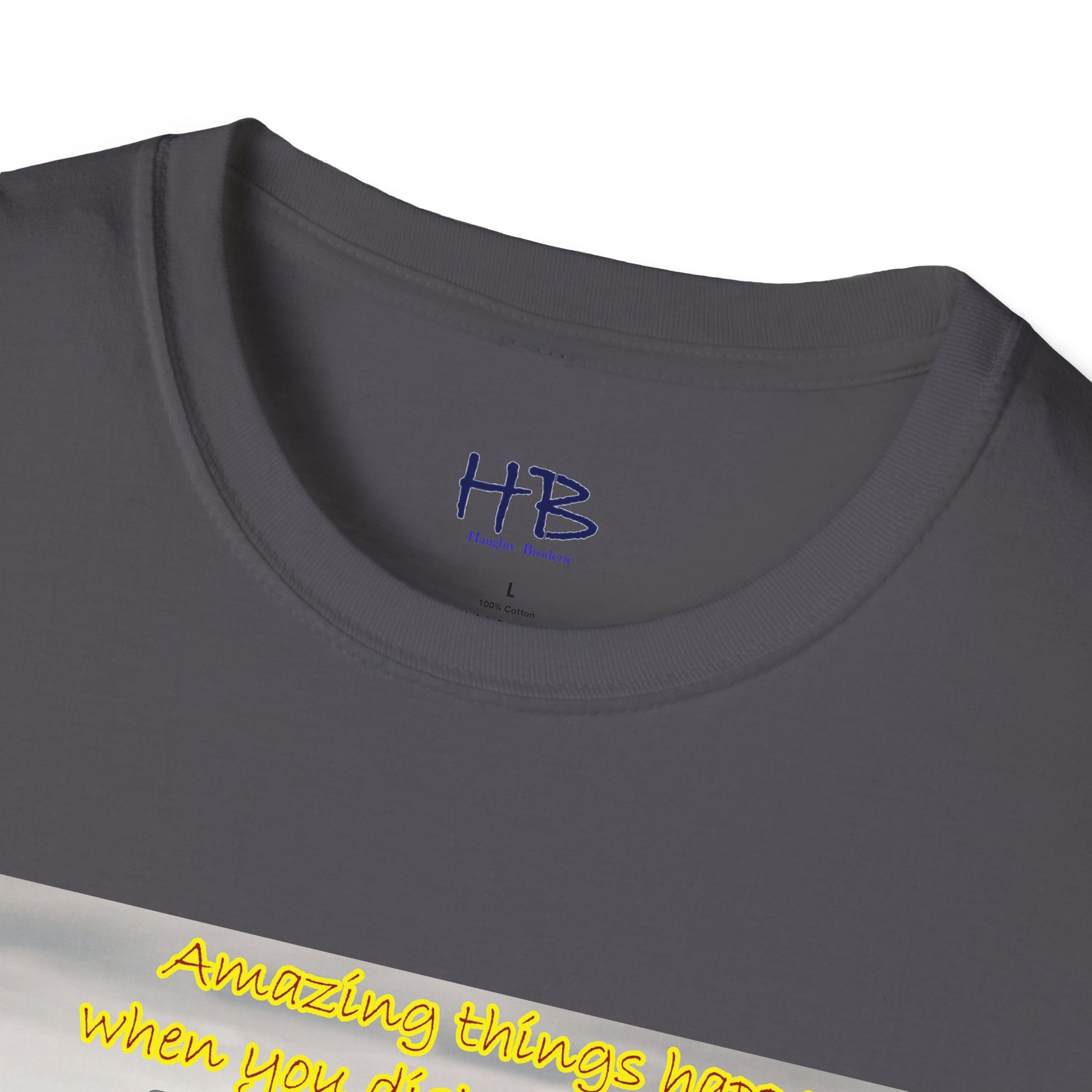 The accompanying text on the tee shirt reads "Amazing things happen when you keep negativity at bay," conveying the message that negativity only brings sorrow, worry, and bad energy. It's important to keep negativity out of our lives and focus on positivity, as it can lead us towards a happier, more fulfilling life.