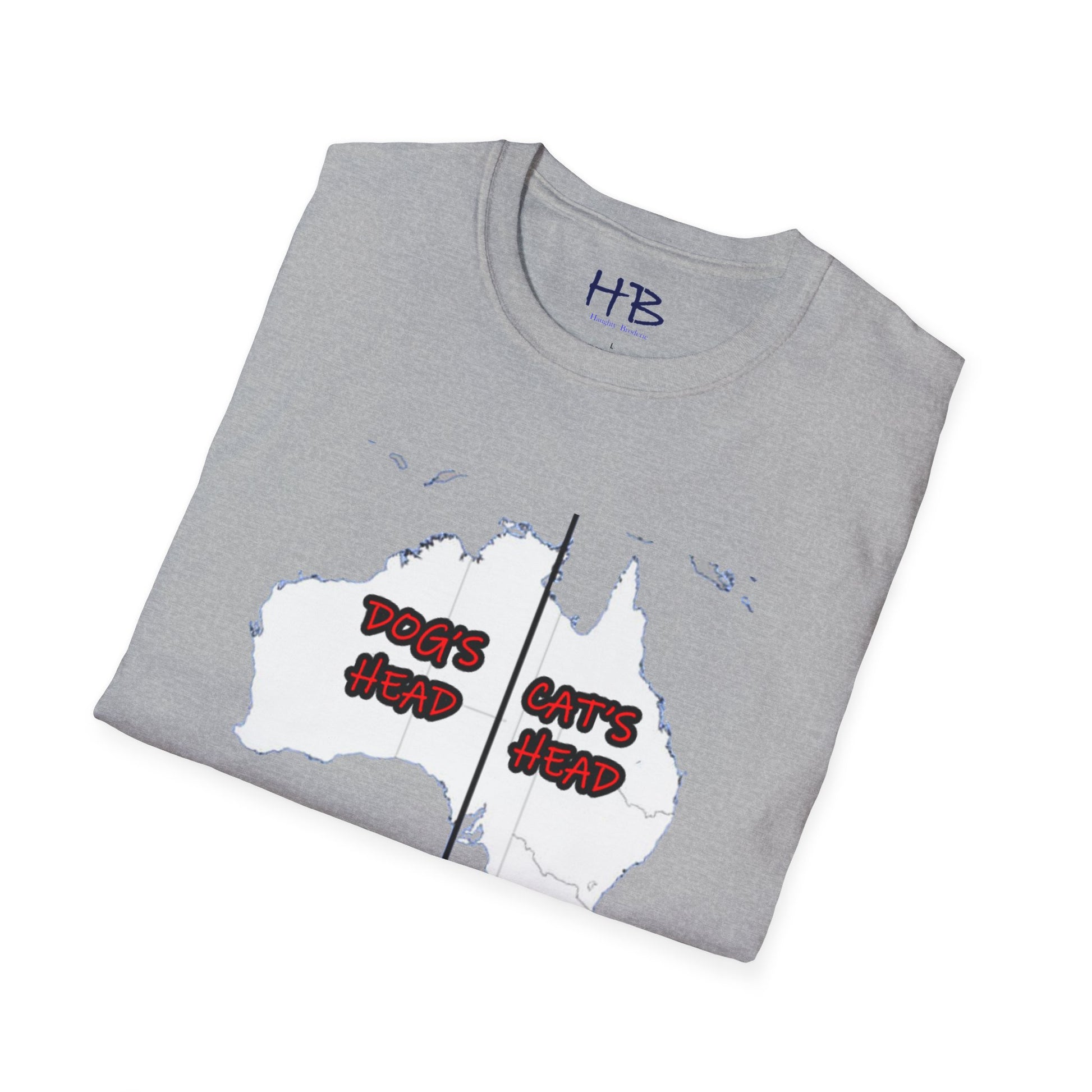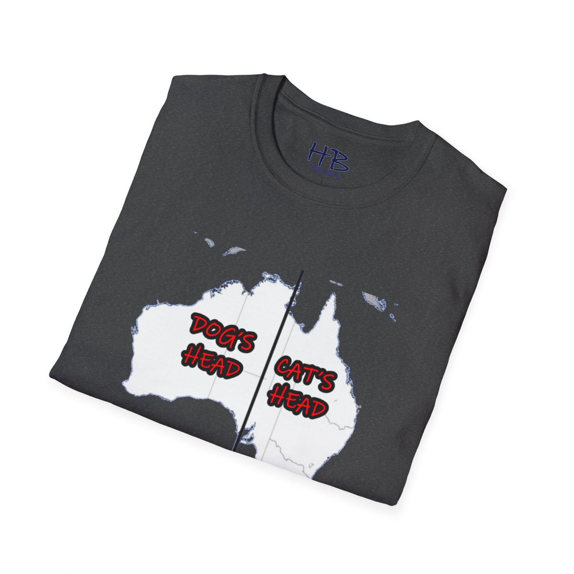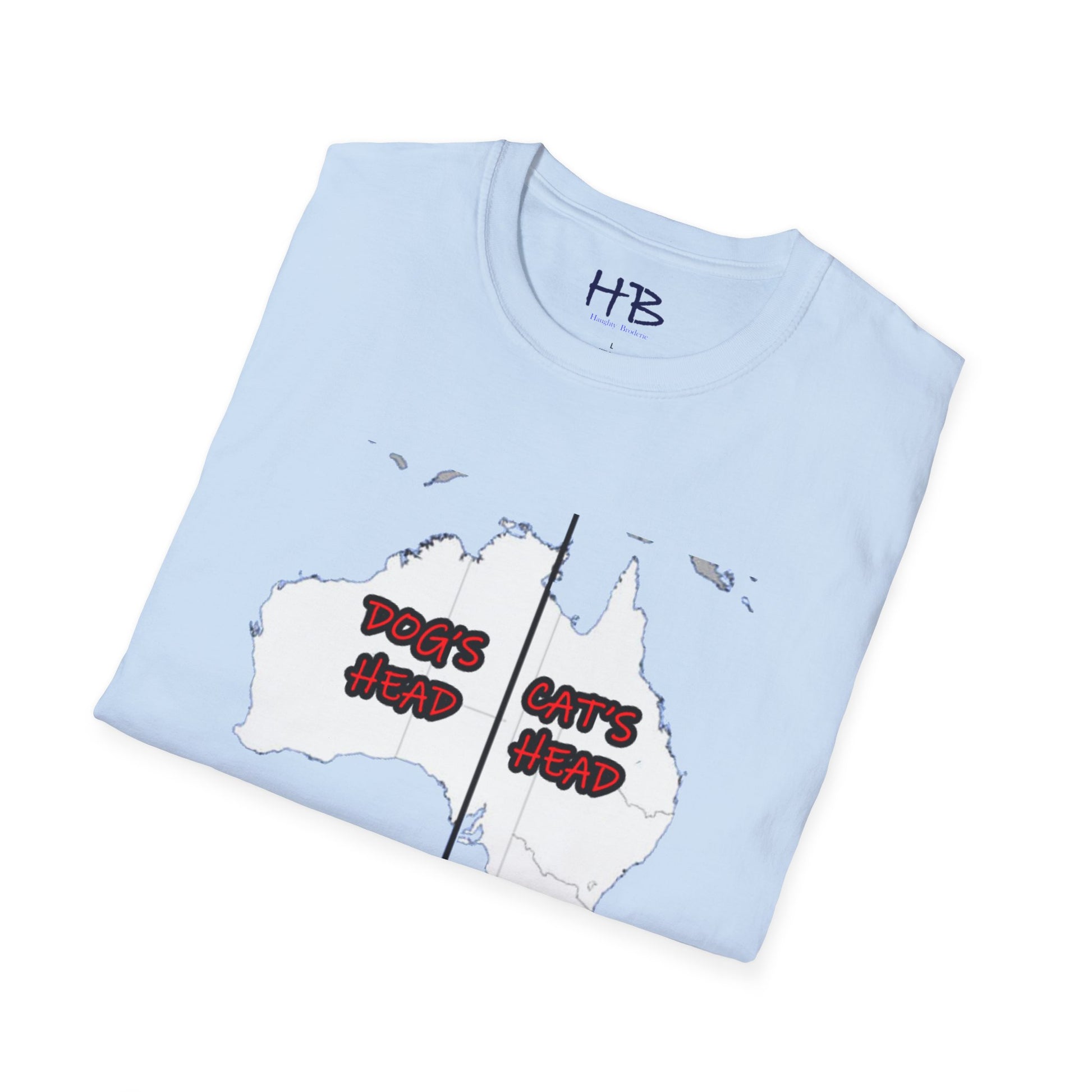 Introducing our uniquely designed shirt, an amusing perspective on the world! Behold, a shirt that reimagines the geography of Australia with an entertaining twist. On the left side, you'll spot the unmistakable shape of a dog's head, while on the right, the landmass takes the form of a cat's head. And as if that weren't whimsical enough, there's a tiny island beneath the cat's head that perfectly resembles cat food.