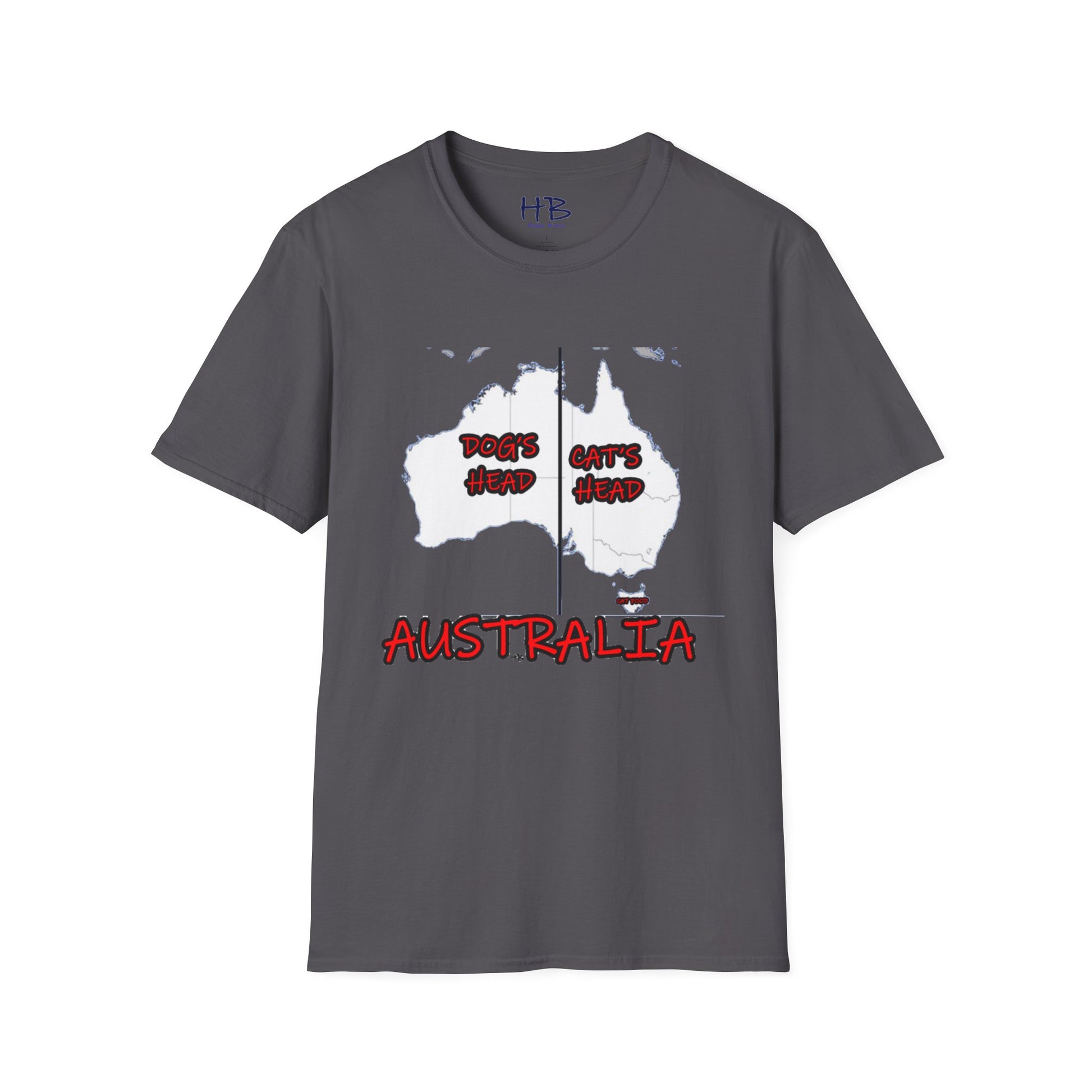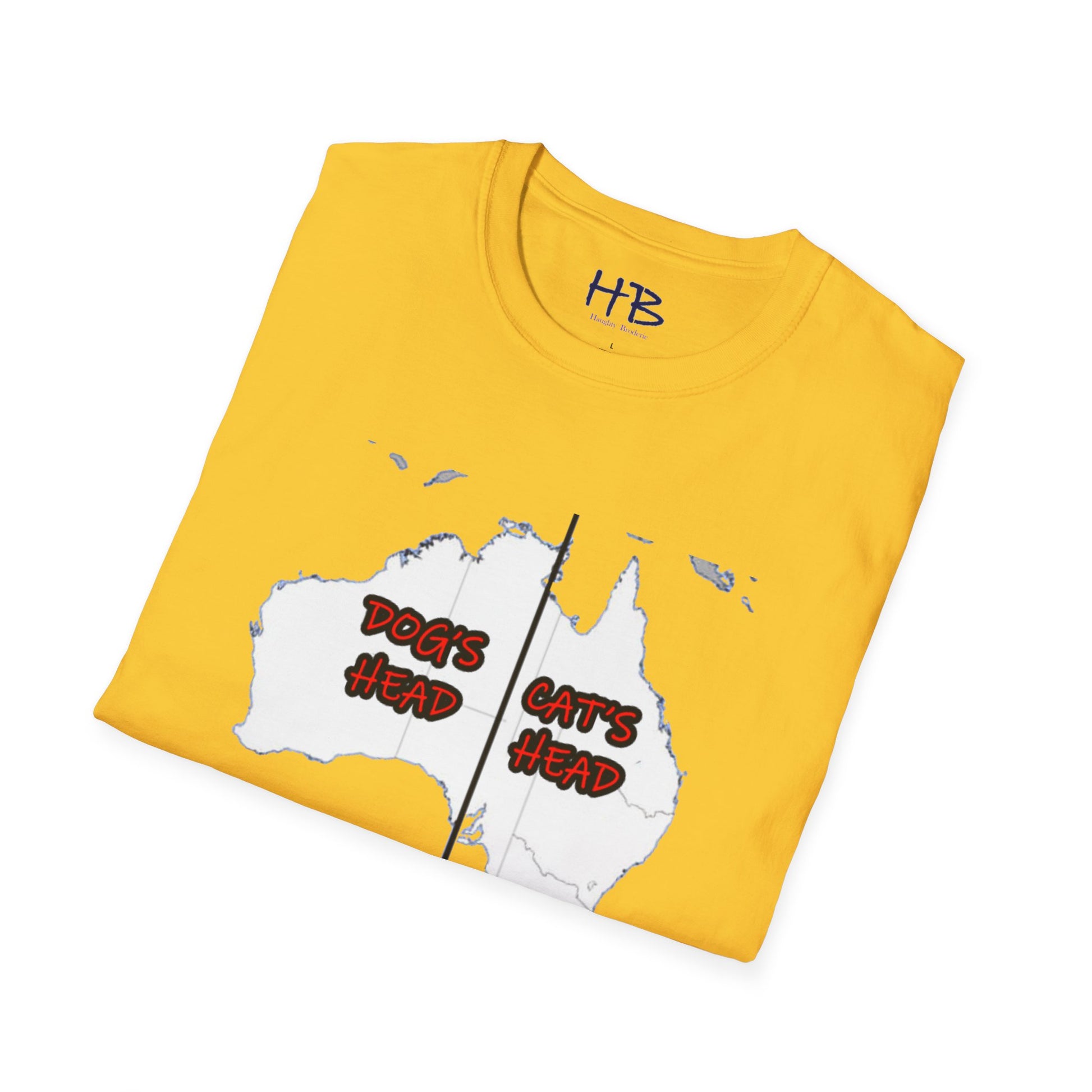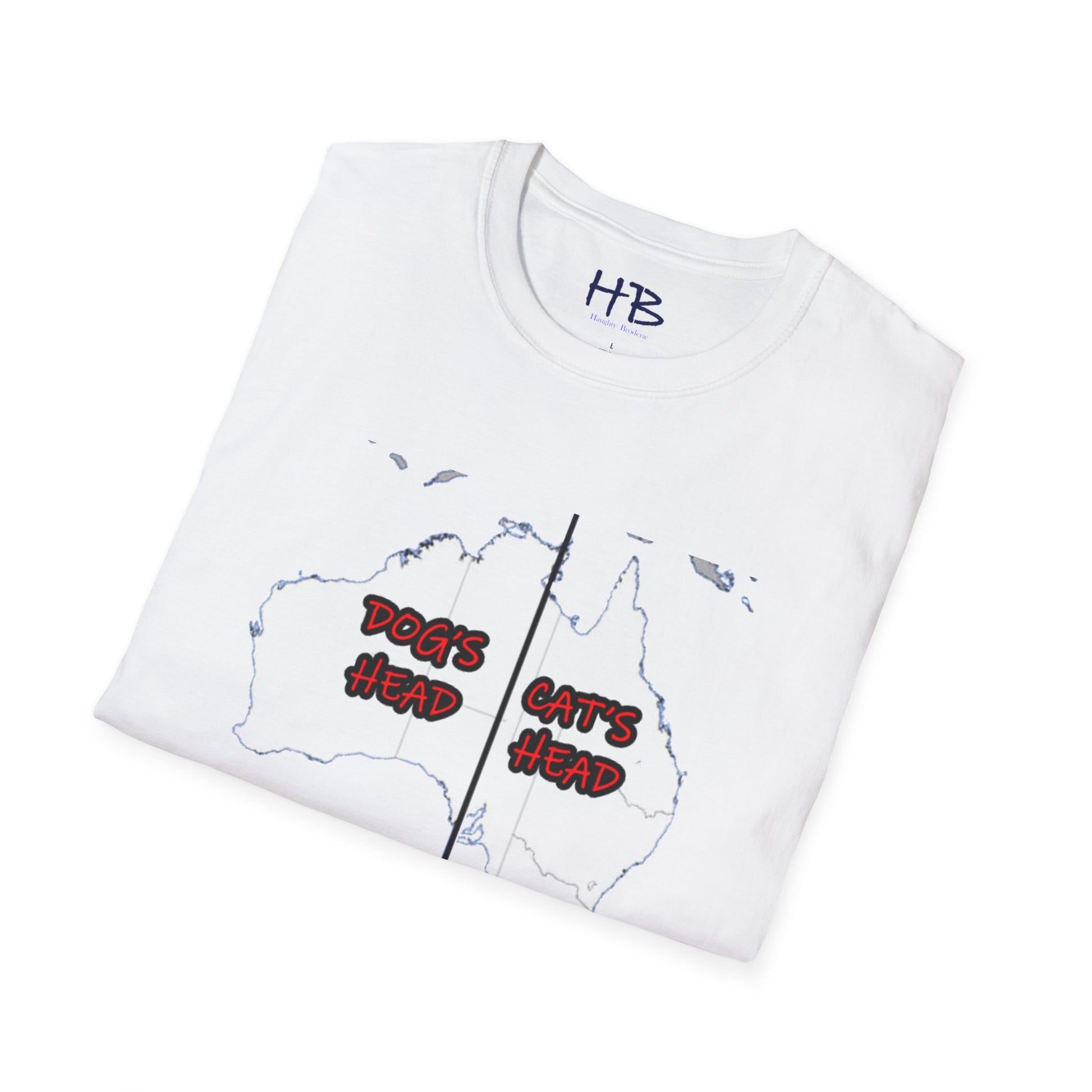 Introducing our uniquely designed shirt, an amusing perspective on the world! Behold, a shirt that reimagines the geography of Australia with an entertaining twist. On the left side, you'll spot the unmistakable shape of a dog's head, while on the right, the landmass takes the form of a cat's head. And as if that weren't whimsical enough, there's a tiny island beneath the cat's head that perfectly resembles cat food.
