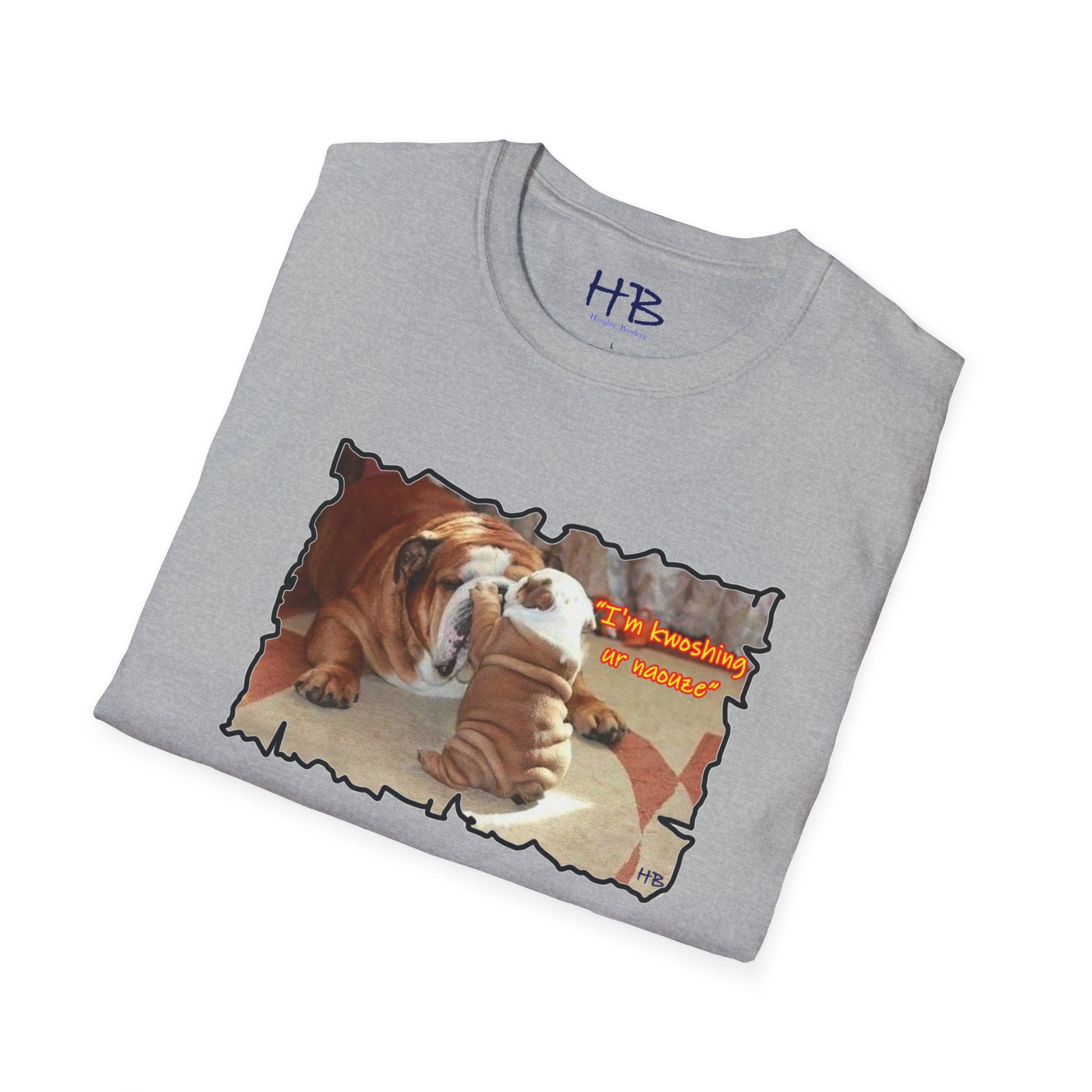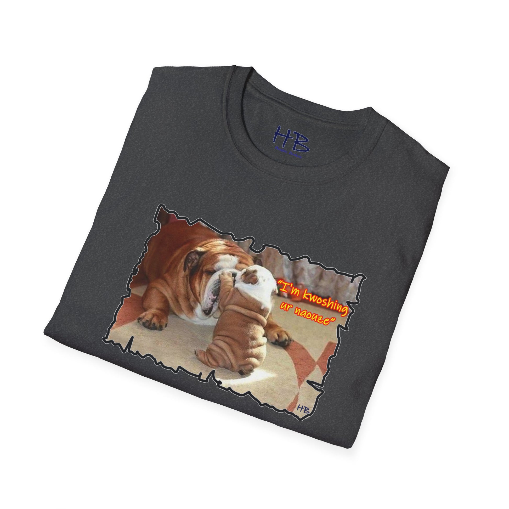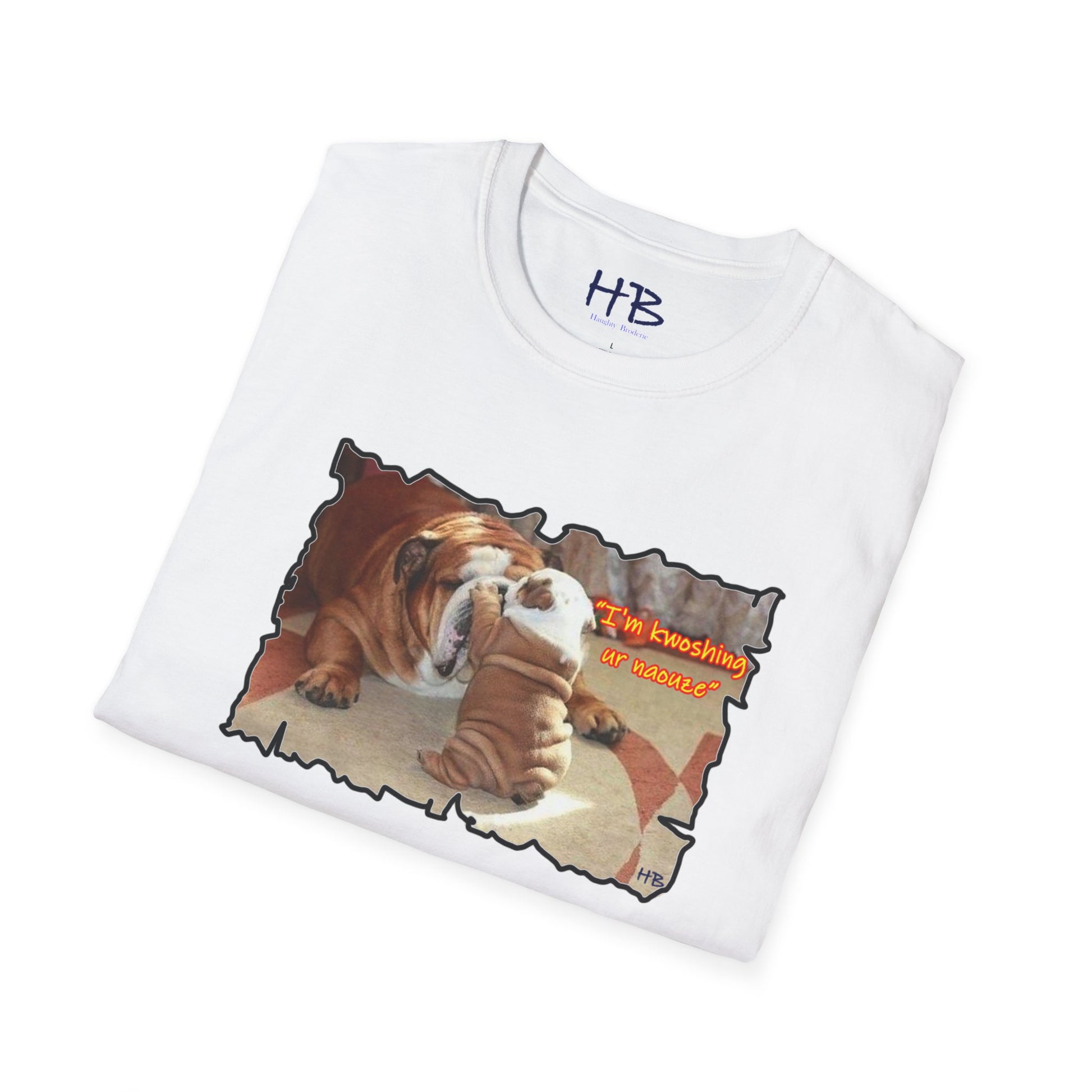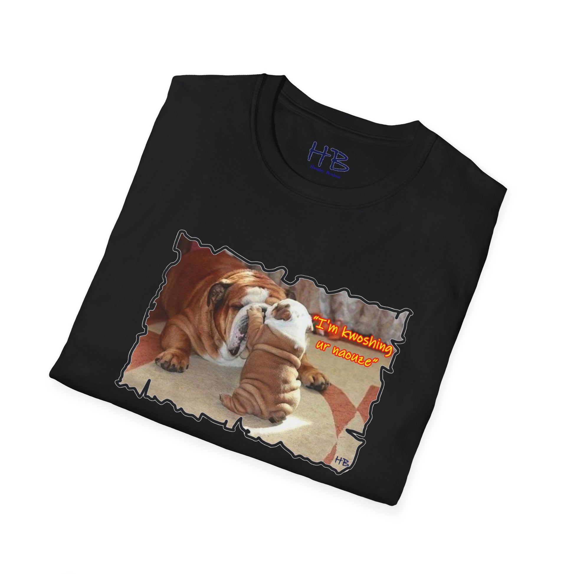 Introducing our newest tee shirt design that is sure to steal your heart! Featuring an adorable baby bulldog standing on its hind legs, with its front paws playfully squishing its mommy's nose, and the text reading "I'm kwoshing ur naouze".