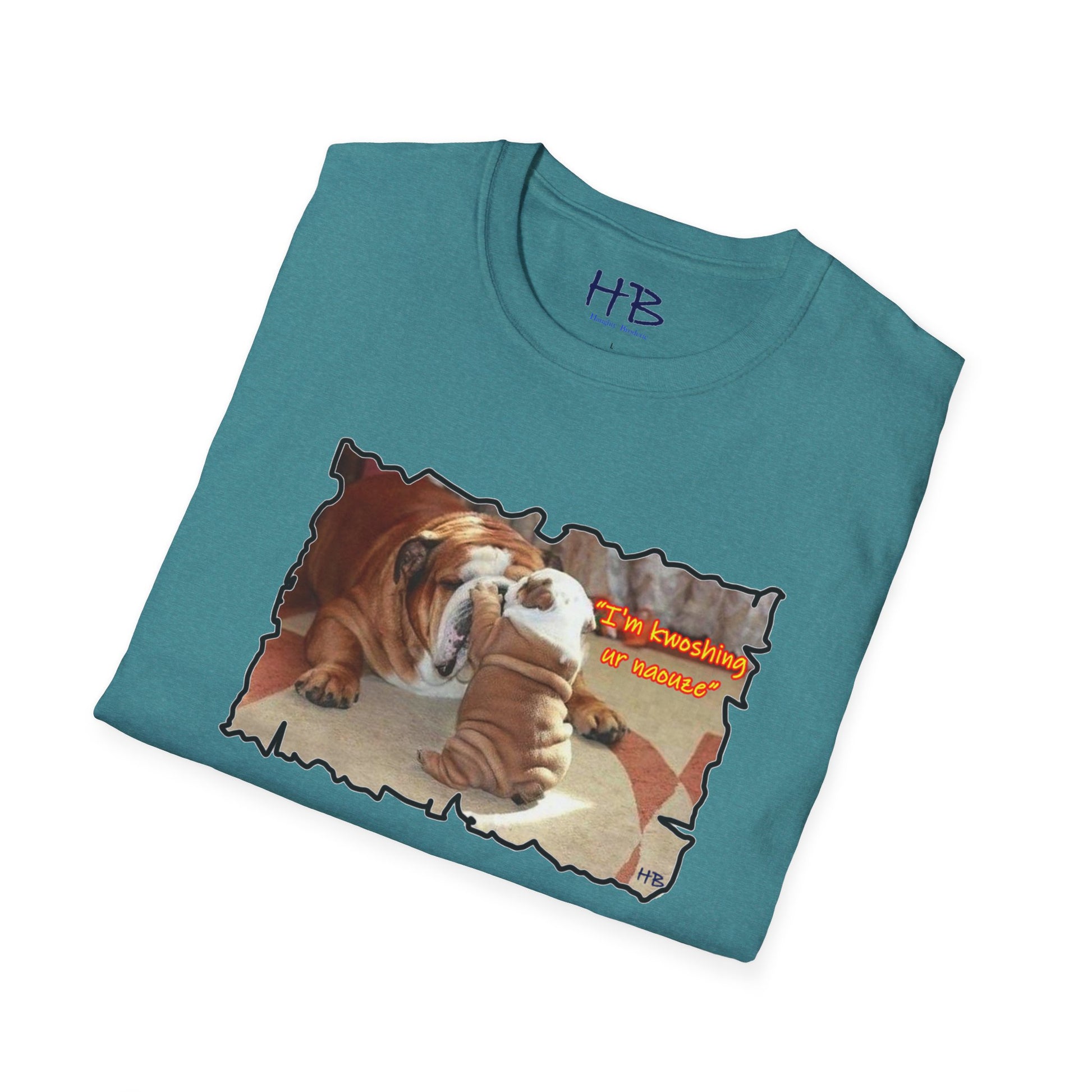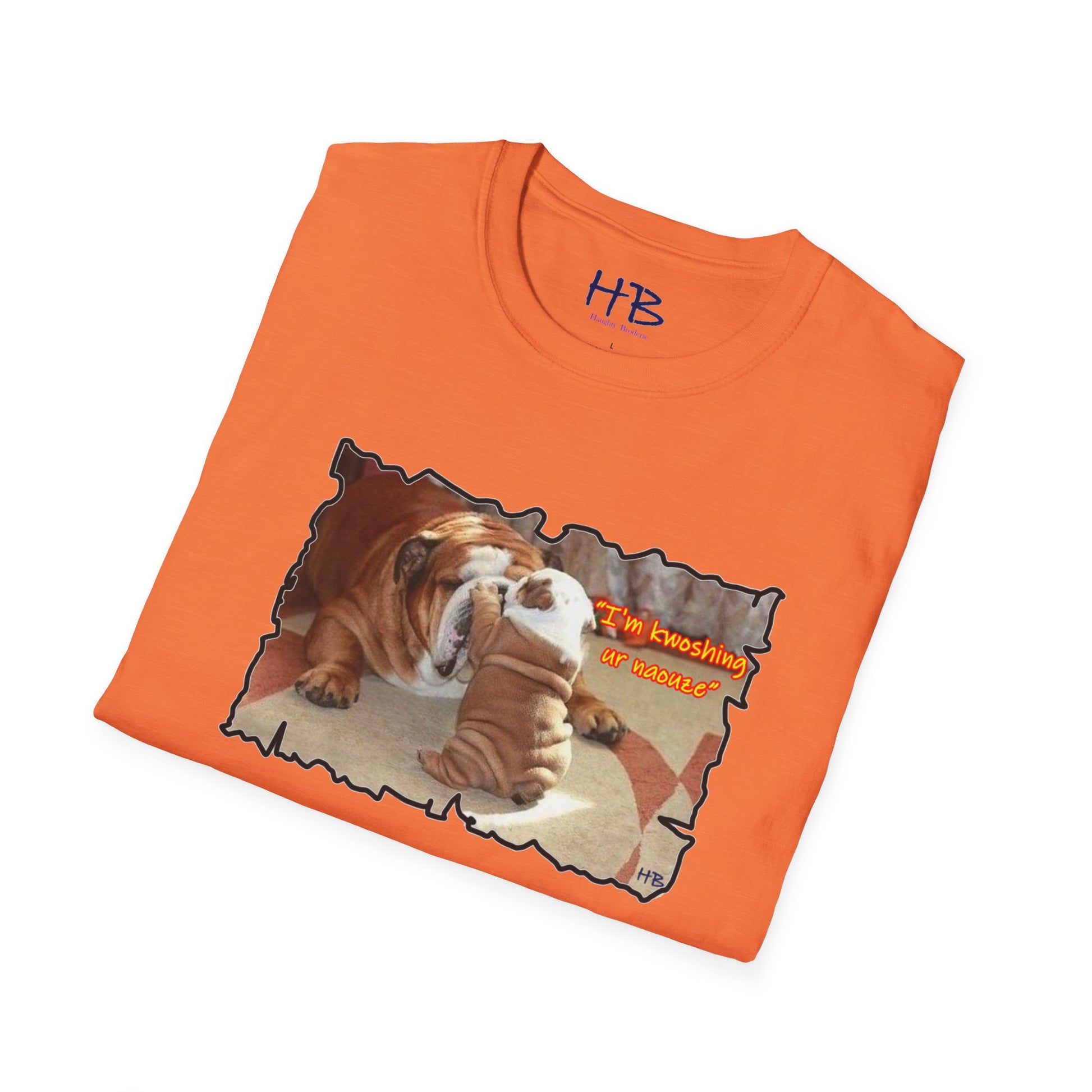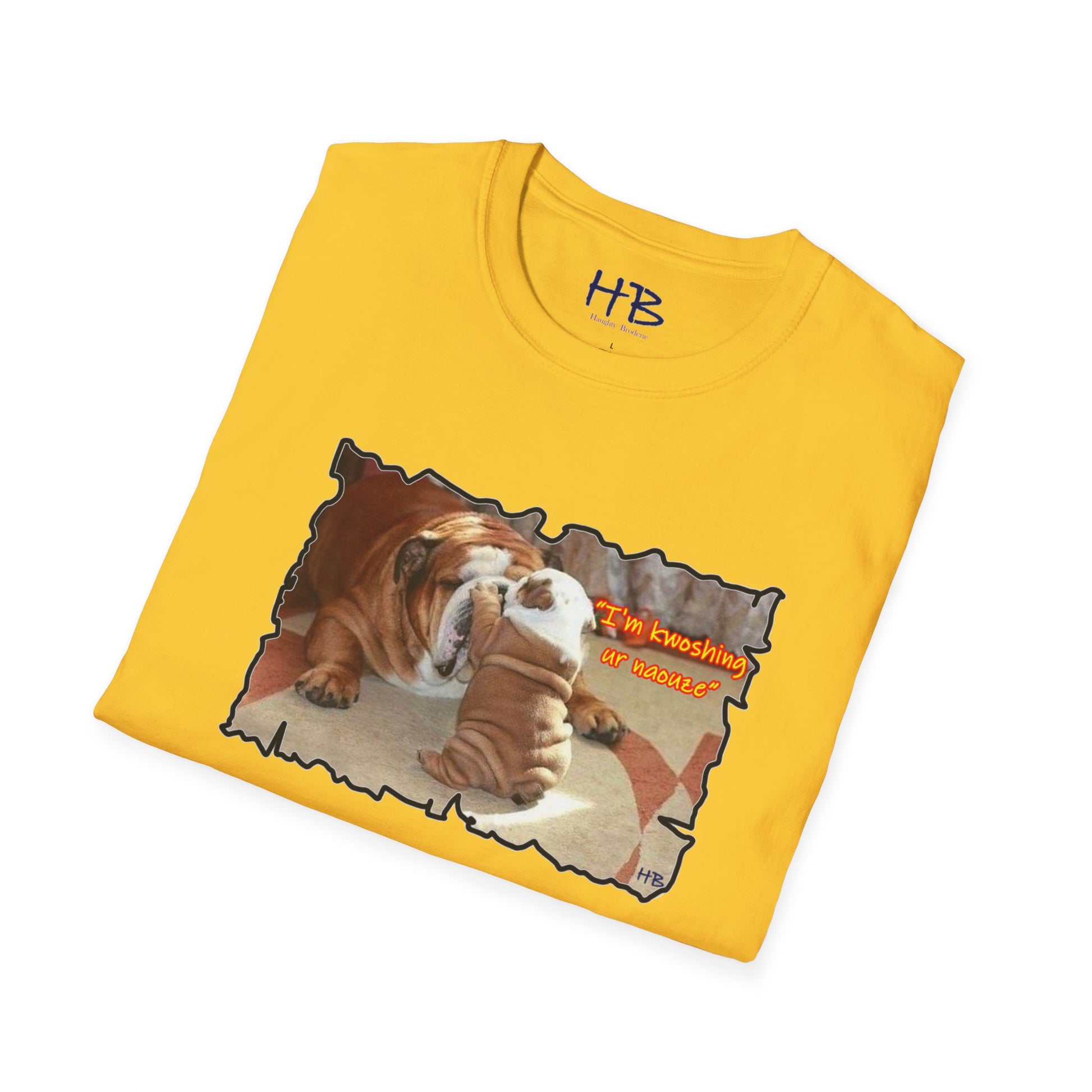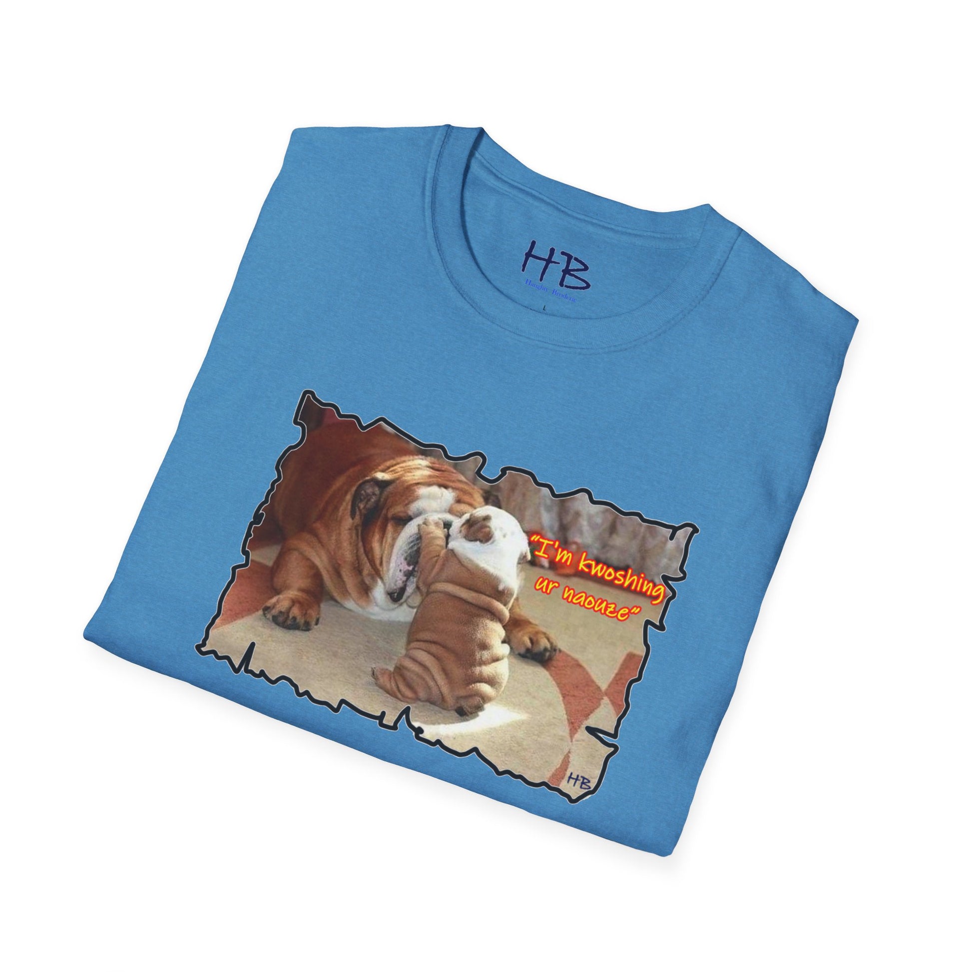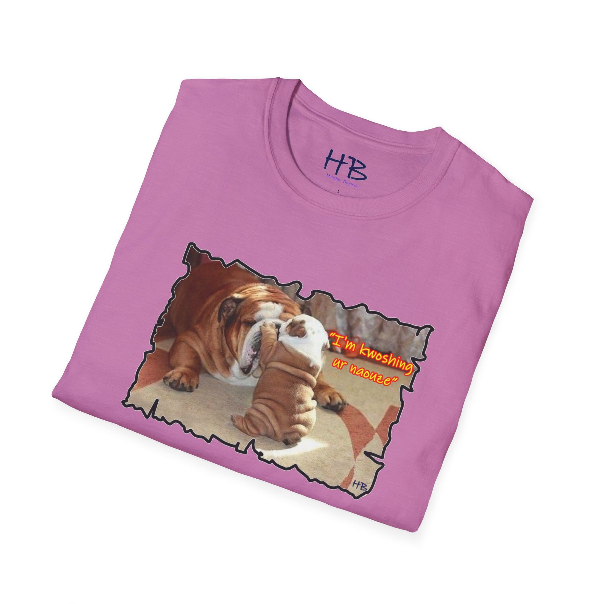 Introducing our newest tee shirt design that is sure to steal your heart! Featuring an adorable baby bulldog standing on its hind legs, with its front paws playfully squishing its mommy's nose, and the text reading "I'm kwoshing ur naouze".