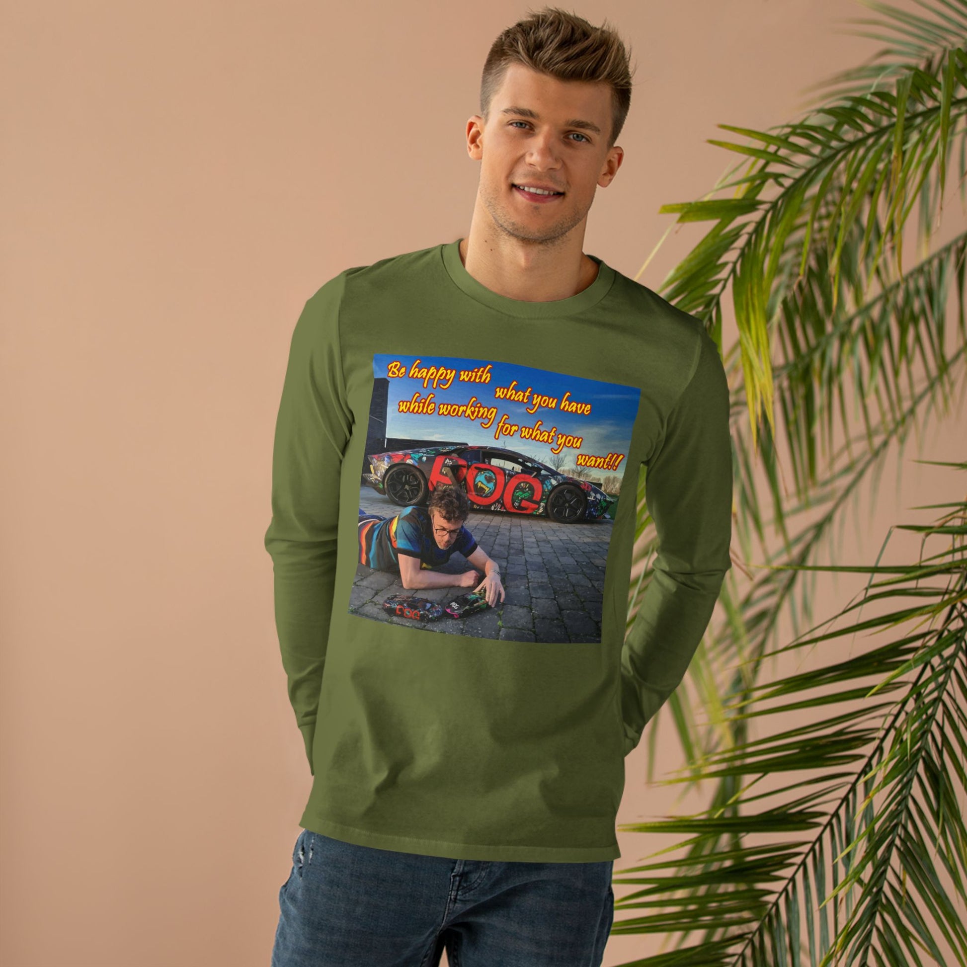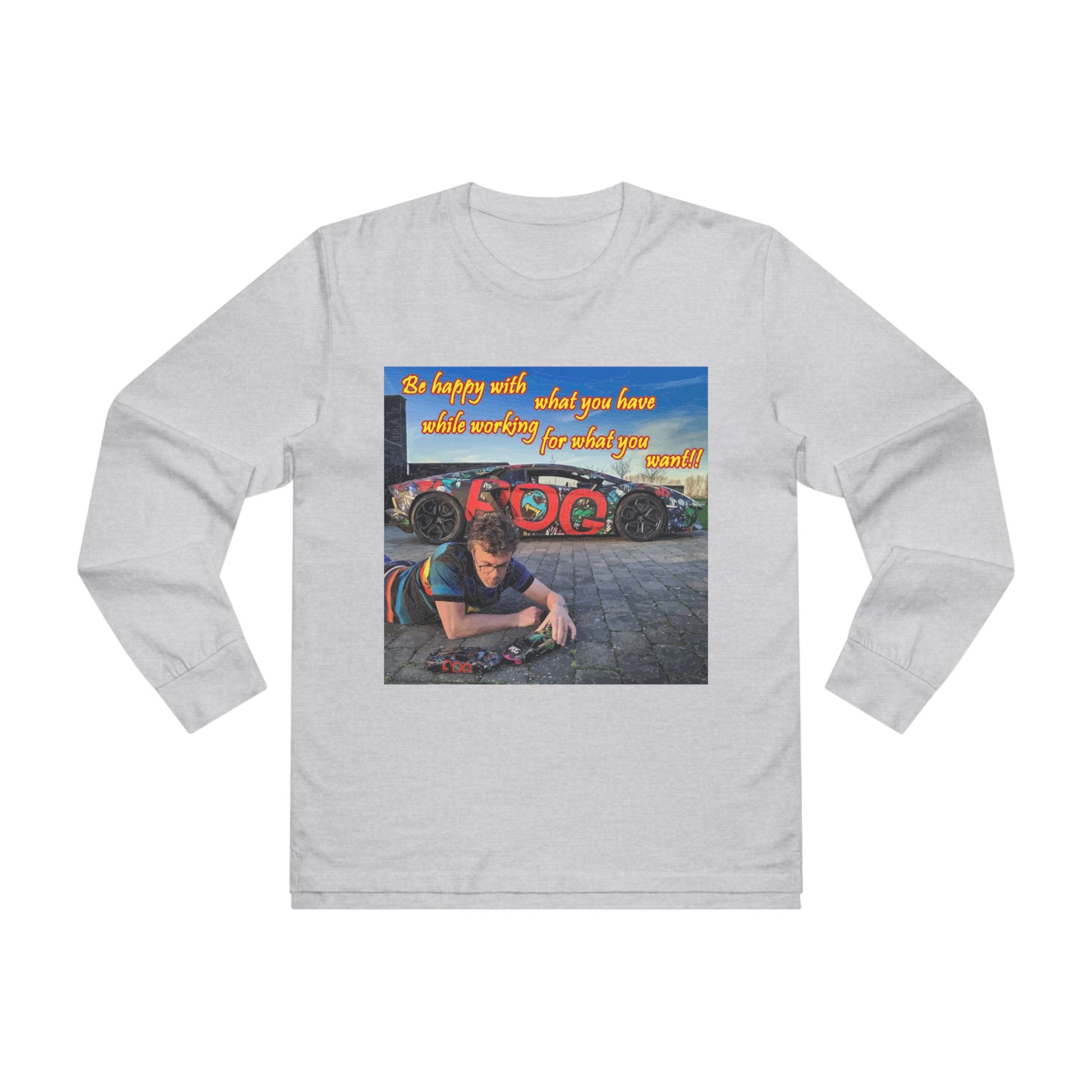 Introducing our exclusive tee shirt that encapsulates the essence of gratitude and determination! Our premium-quality tee shirt features a captivating image of a young man playing with two miniature cars on the floor, with a magnificent Lamborghini Murcielago parked right behind him. The real-life car is painted in an identical design to the toy car that the man is playing with, emphasizing the message that it's crucial to appreciate what you already have while striving for your dreams.