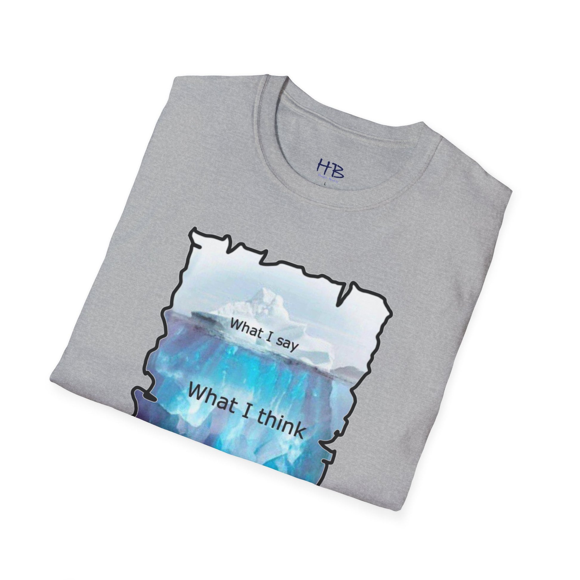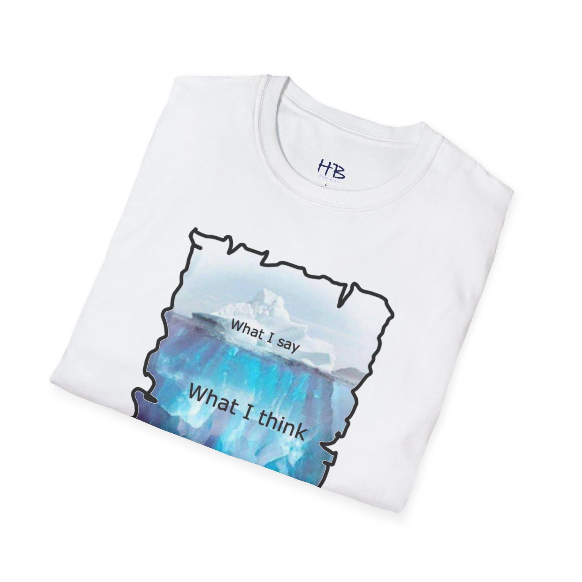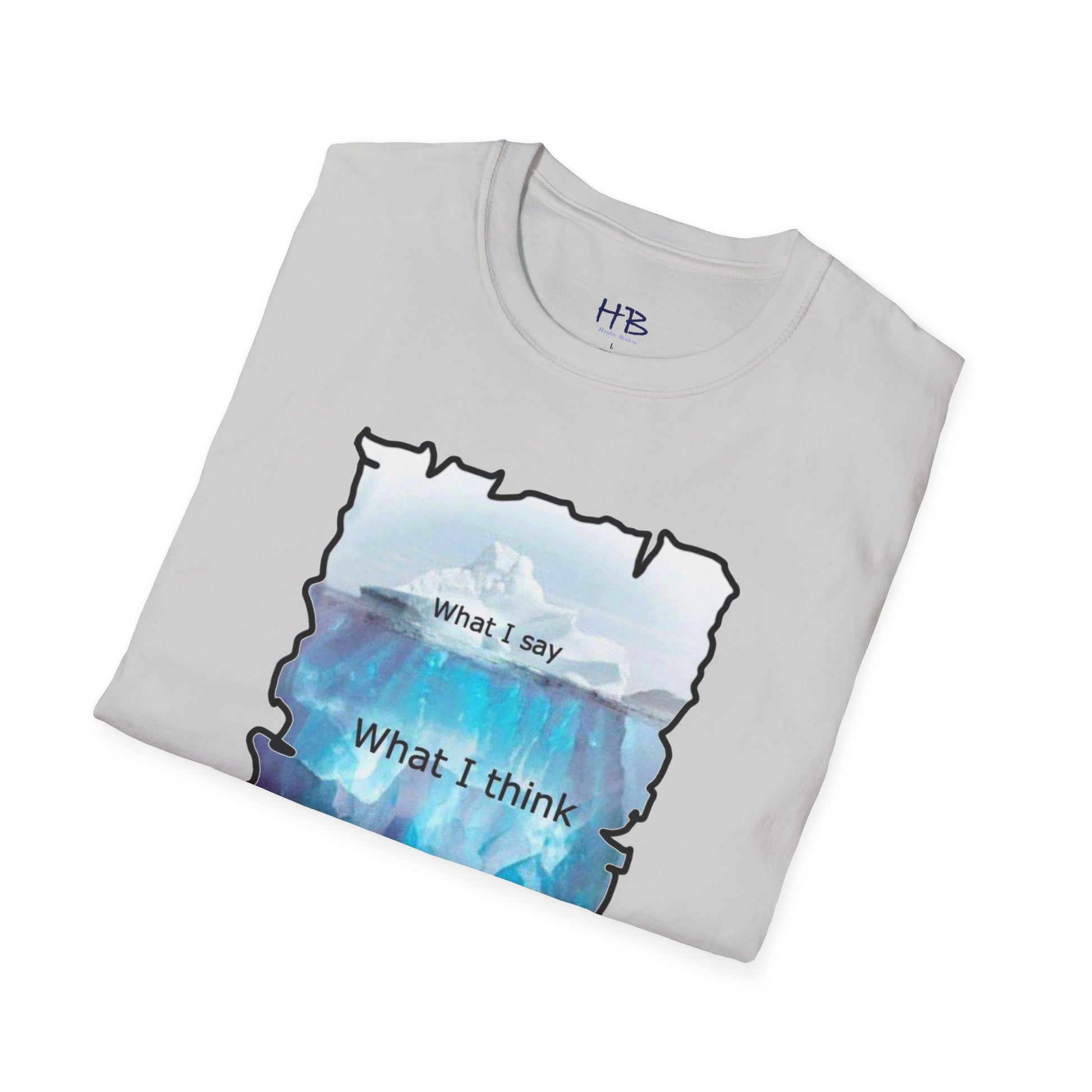 Featuring a stunning image of a massive iceberg, this tee shirt is sure to grab attention. The visible portion of the iceberg above the water reads "What I Say," while the hidden portion below the surface says "What I Think." This design perfectly captures the idea that we often keep our true thoughts and feelings concealed, only sharing a small portion of what we truly think.