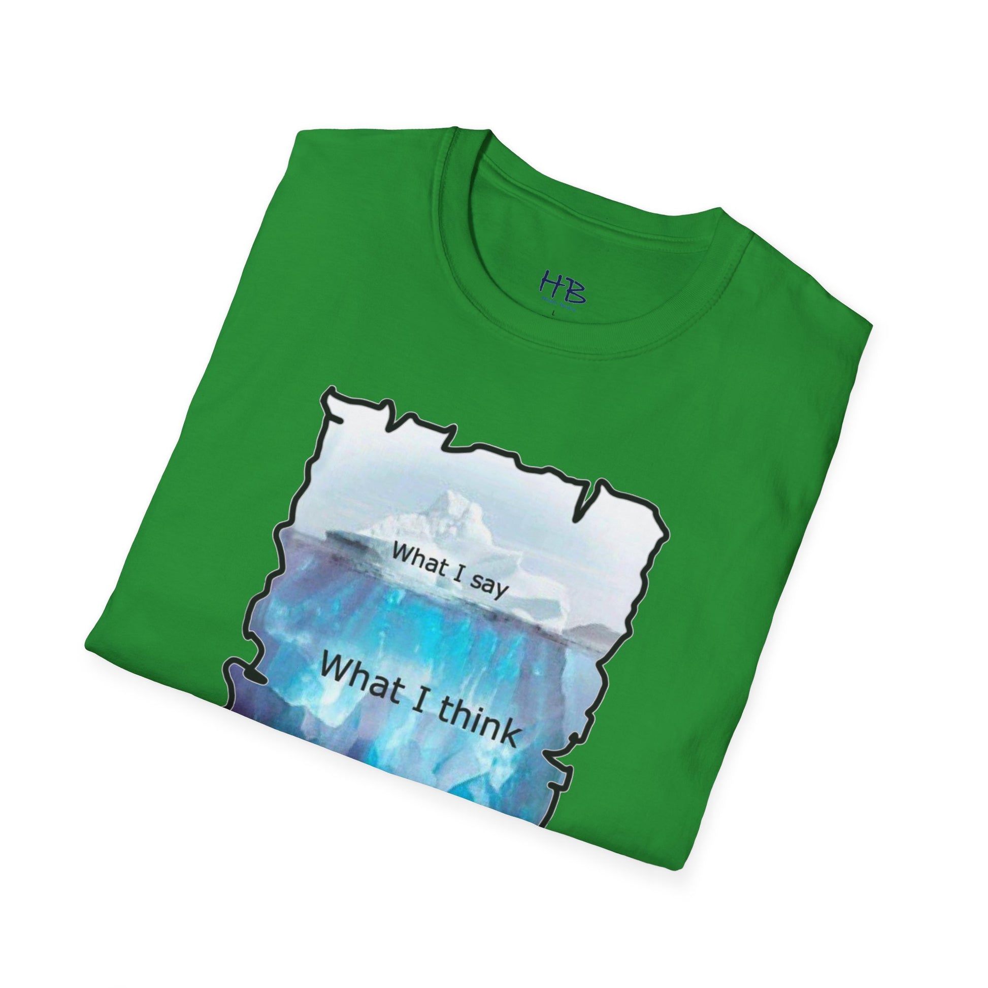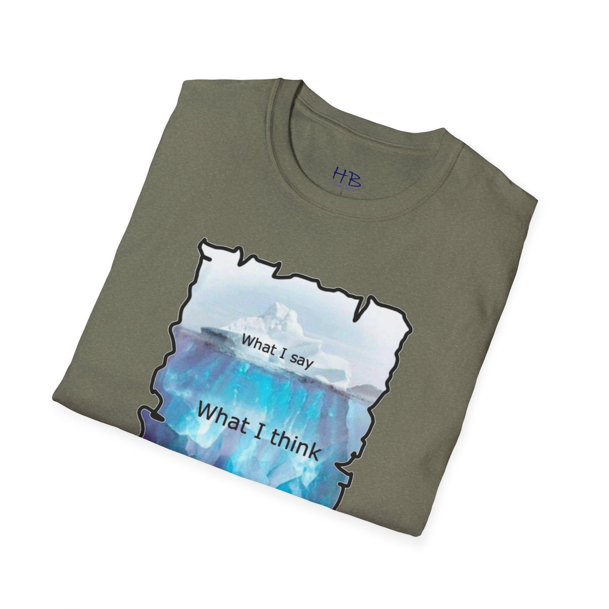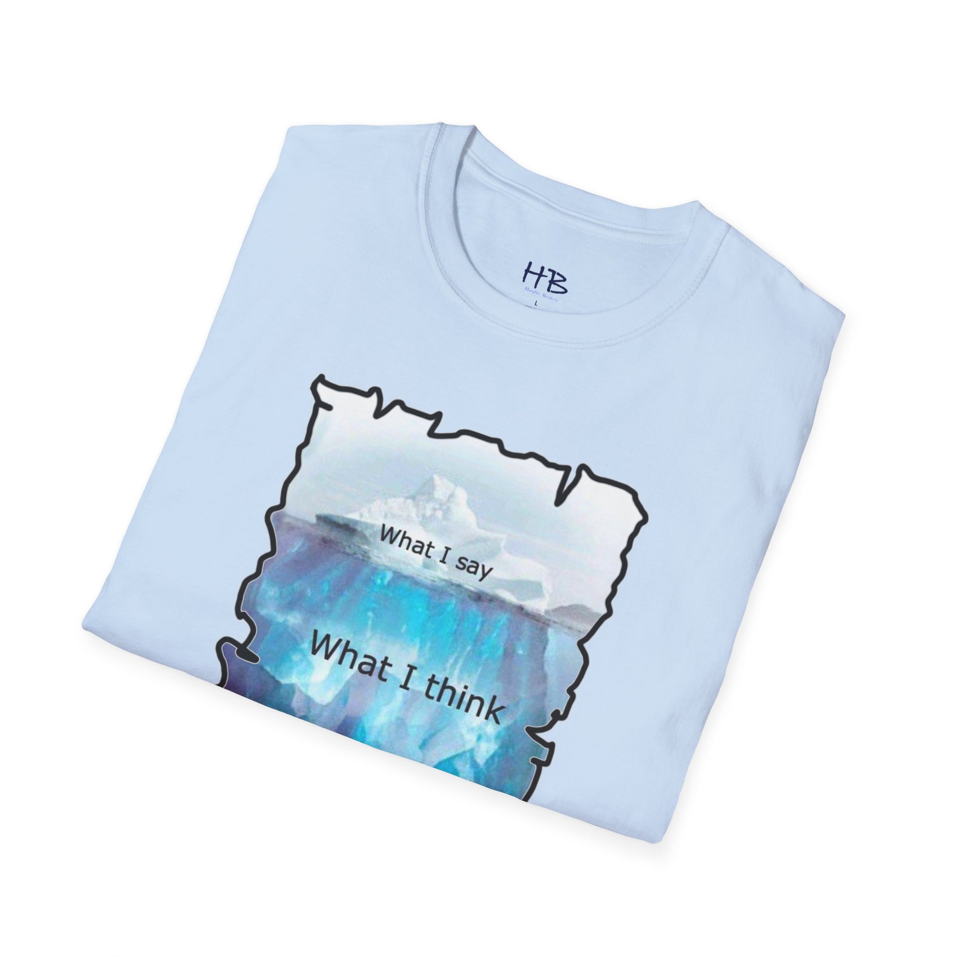 Featuring a stunning image of a massive iceberg, this tee shirt is sure to grab attention. The visible portion of the iceberg above the water reads "What I Say," while the hidden portion below the surface says "What I Think." This design perfectly captures the idea that we often keep our true thoughts and feelings concealed, only sharing a small portion of what we truly think.