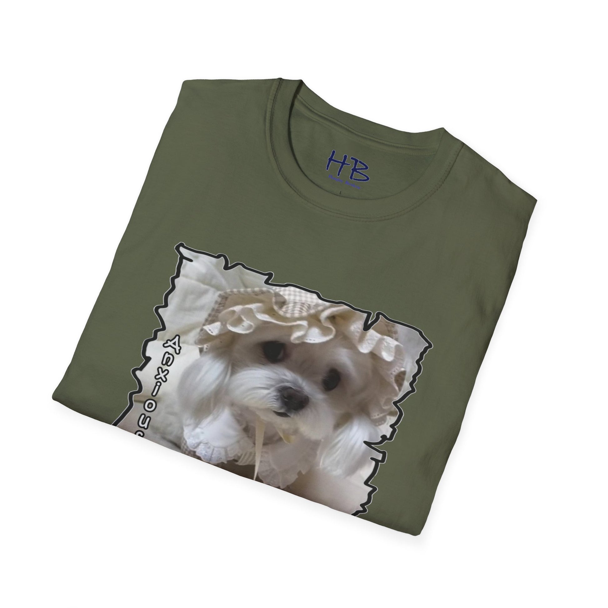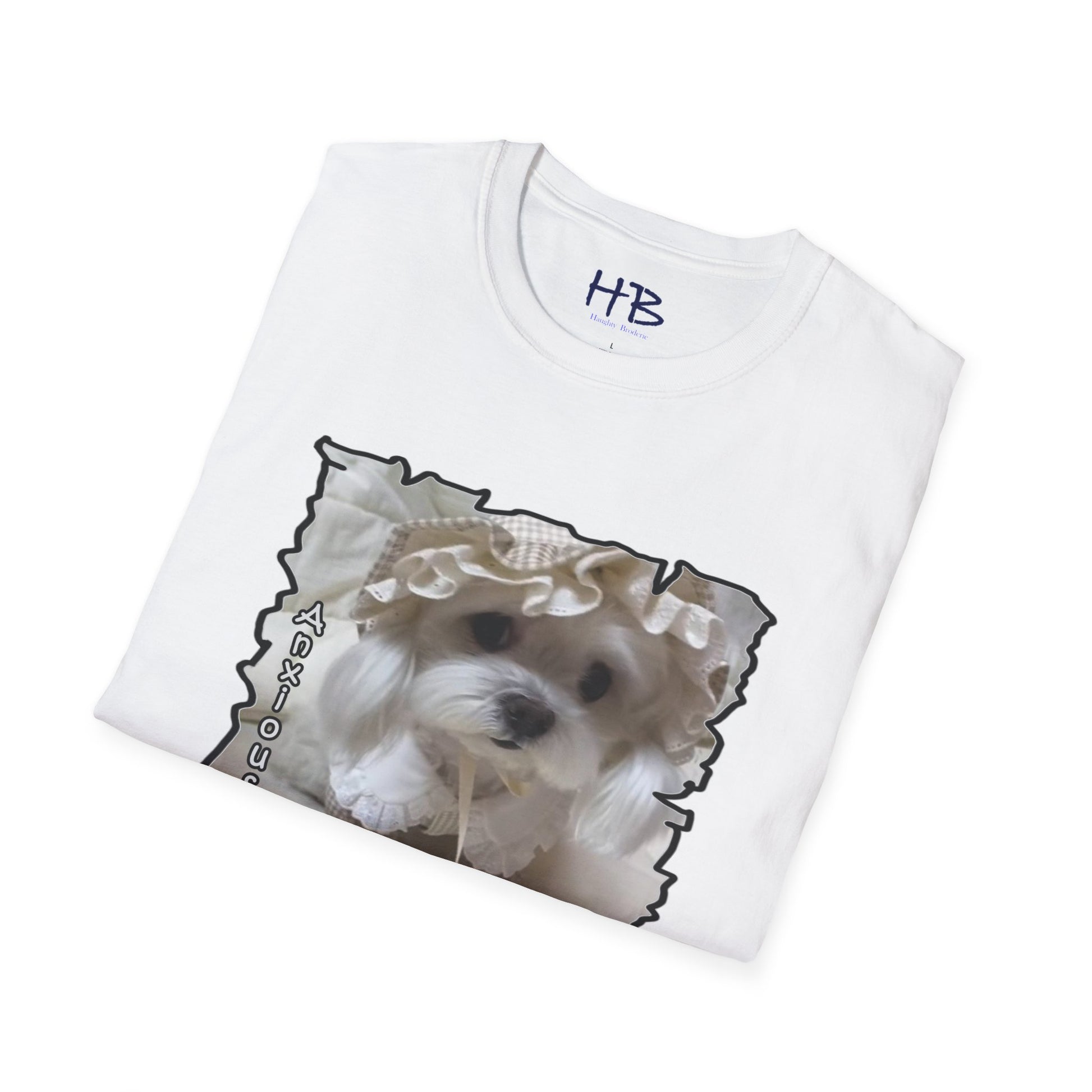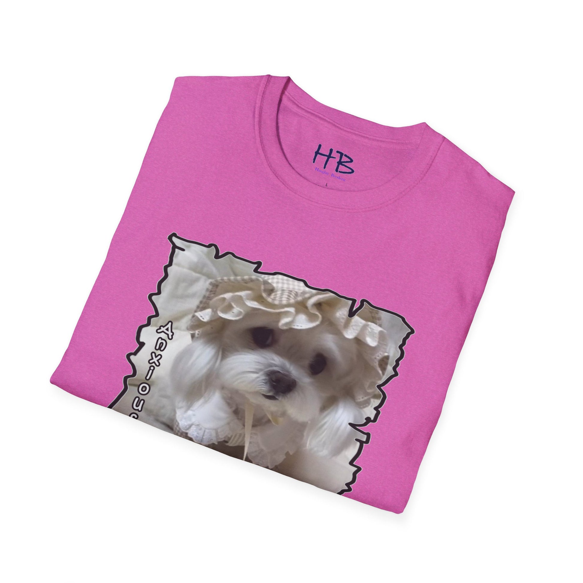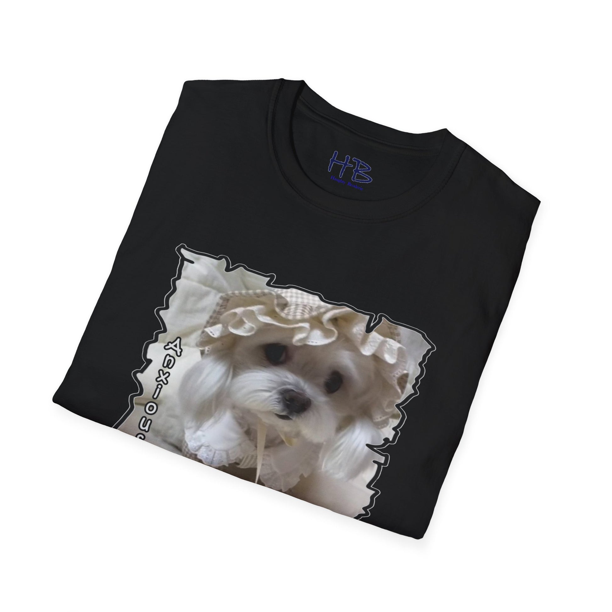 Introducing our latest tee shirt featuring a darling and adorable little Maltese puppy, with a snowy white coat and a dainty size that will surely melt your heart. This cute and charming bichon is captured wearing a fancy and elegant hat and night uniform that complements its delicate features perfectly. The image showcases a look of anxiety in the puppy's eyes, which adds to the cuteness factor and makes it all the more endearing.