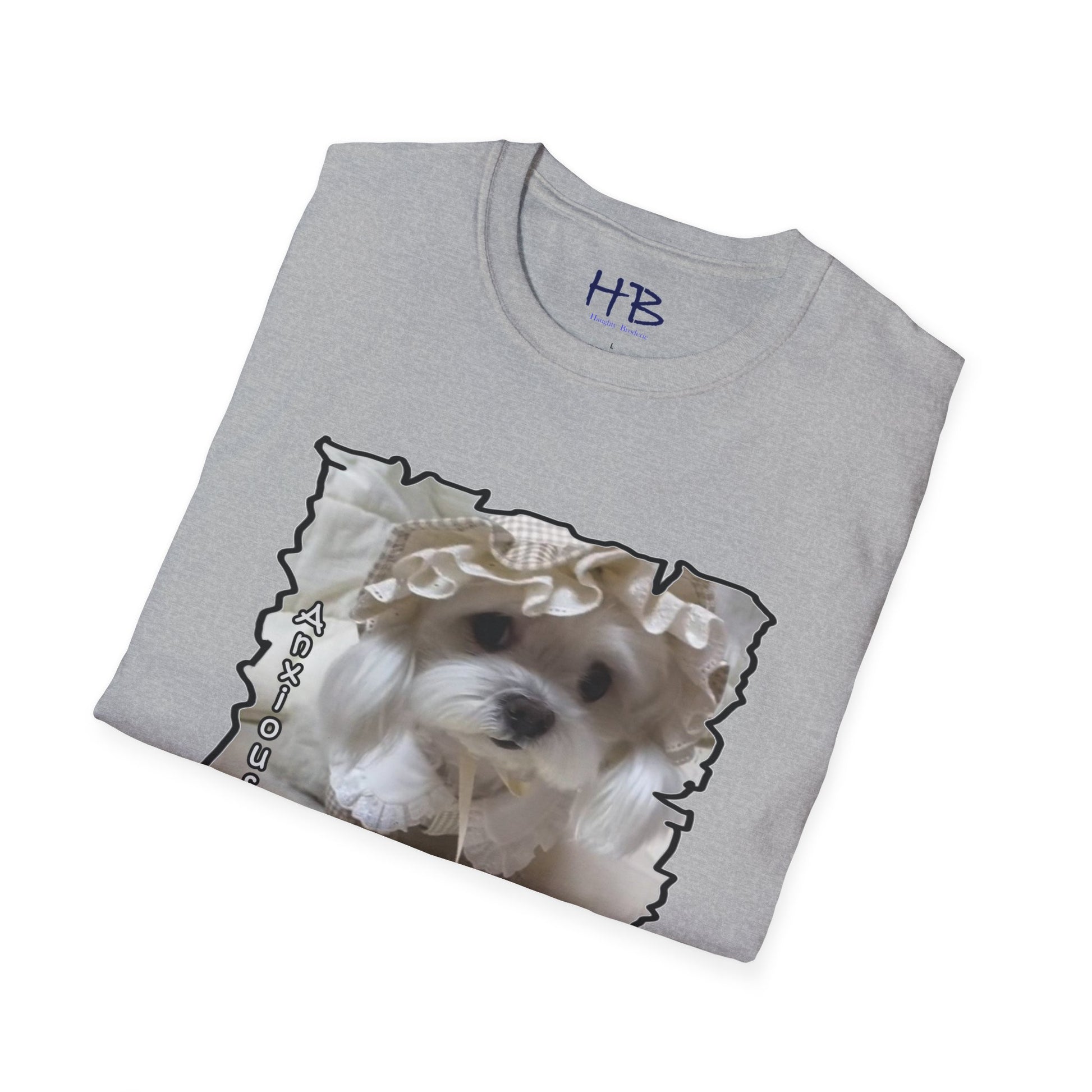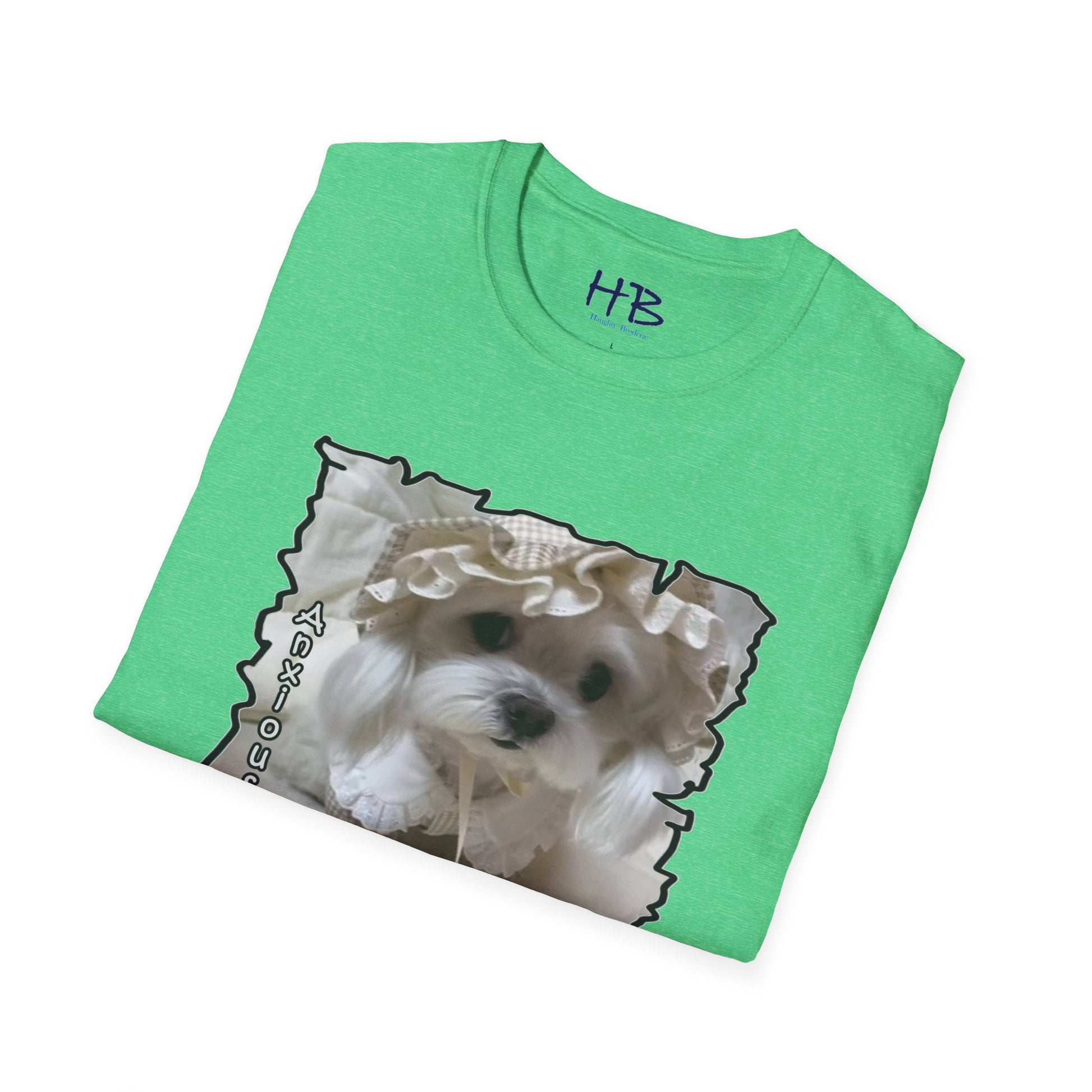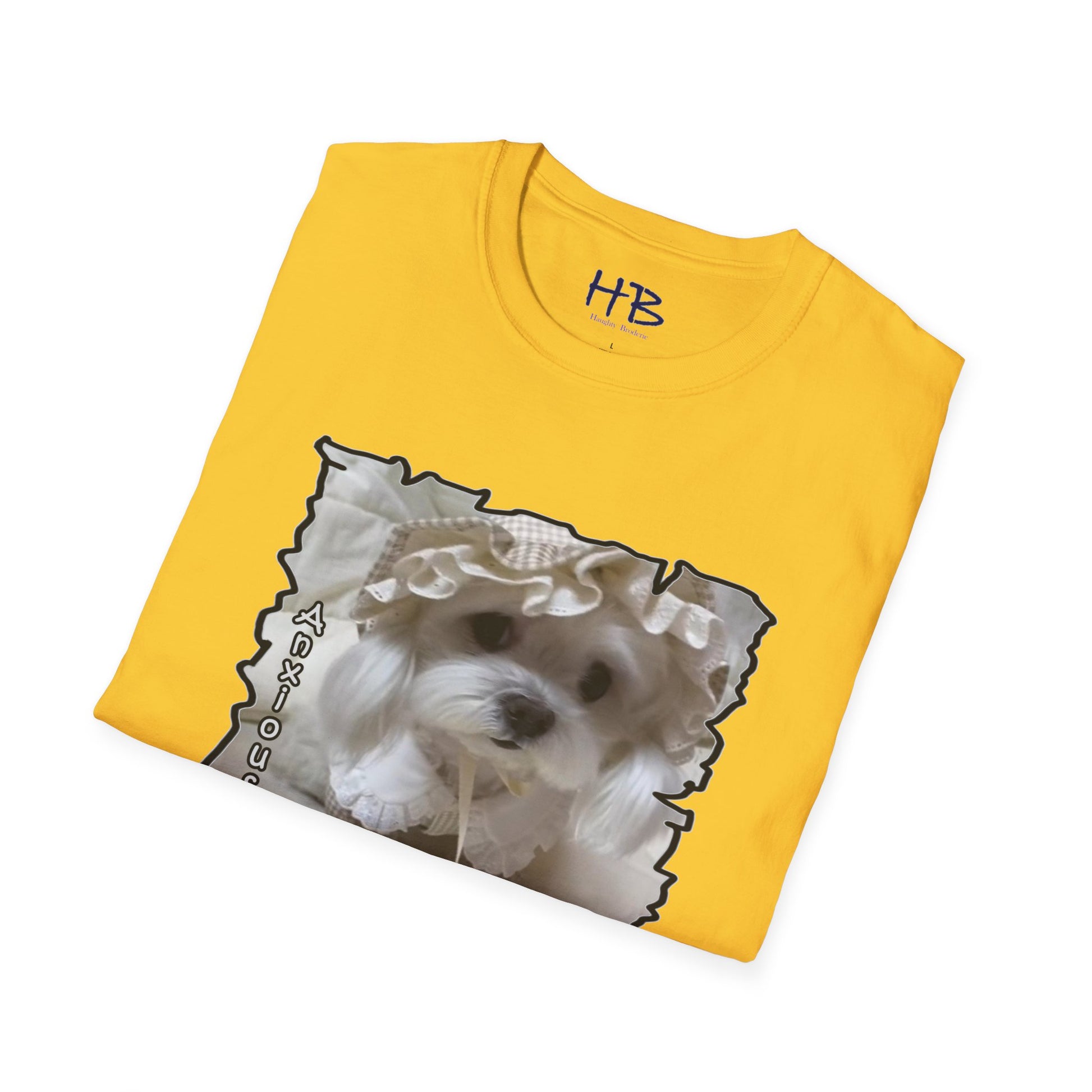 Introducing our latest tee shirt featuring a darling and adorable little Maltese puppy, with a snowy white coat and a dainty size that will surely melt your heart. This cute and charming bichon is captured wearing a fancy and elegant hat and night uniform that complements its delicate features perfectly. The image showcases a look of anxiety in the puppy's eyes, which adds to the cuteness factor and makes it all the more endearing.
