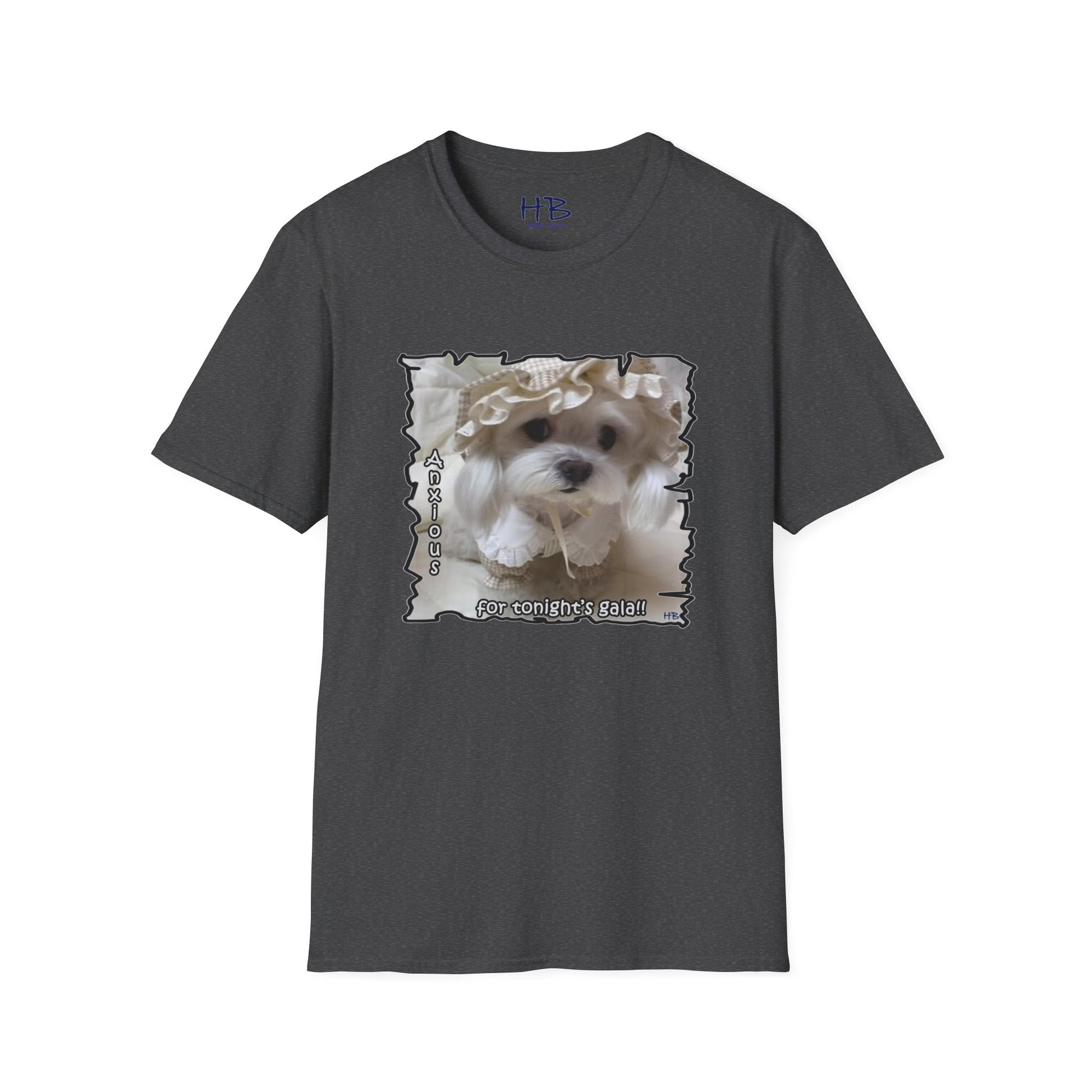 This tee shirt is a must-have for any dog lover or anyone looking for a fun and unique piece of clothing that will make them stand out. It's the perfect gift for someone who adores cute and cuddly animals or someone who appreciates a good sense of humor. So why wait? Order yours today and let everyone know that you're anxious for tonight's gala, just like our little bichon Maltese.