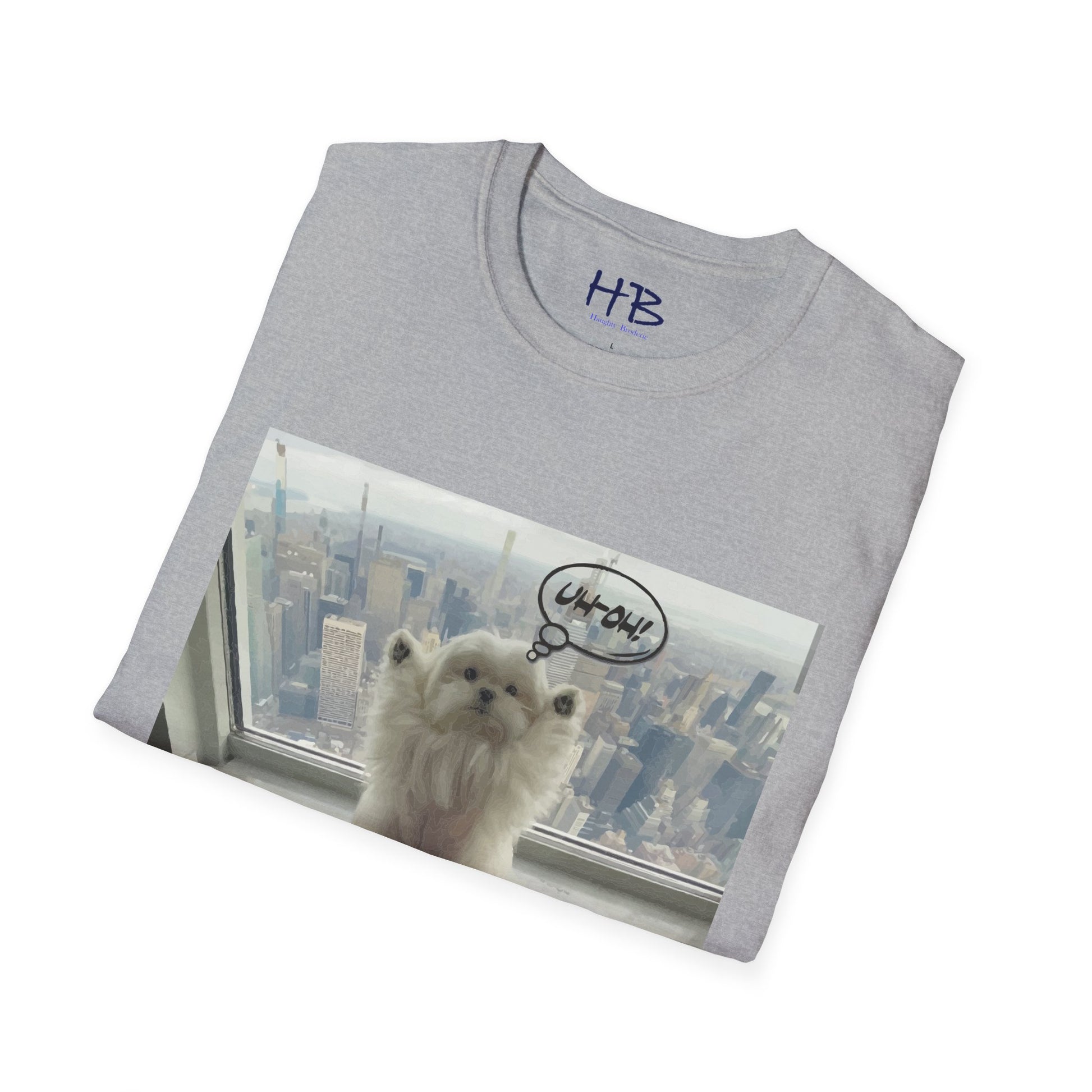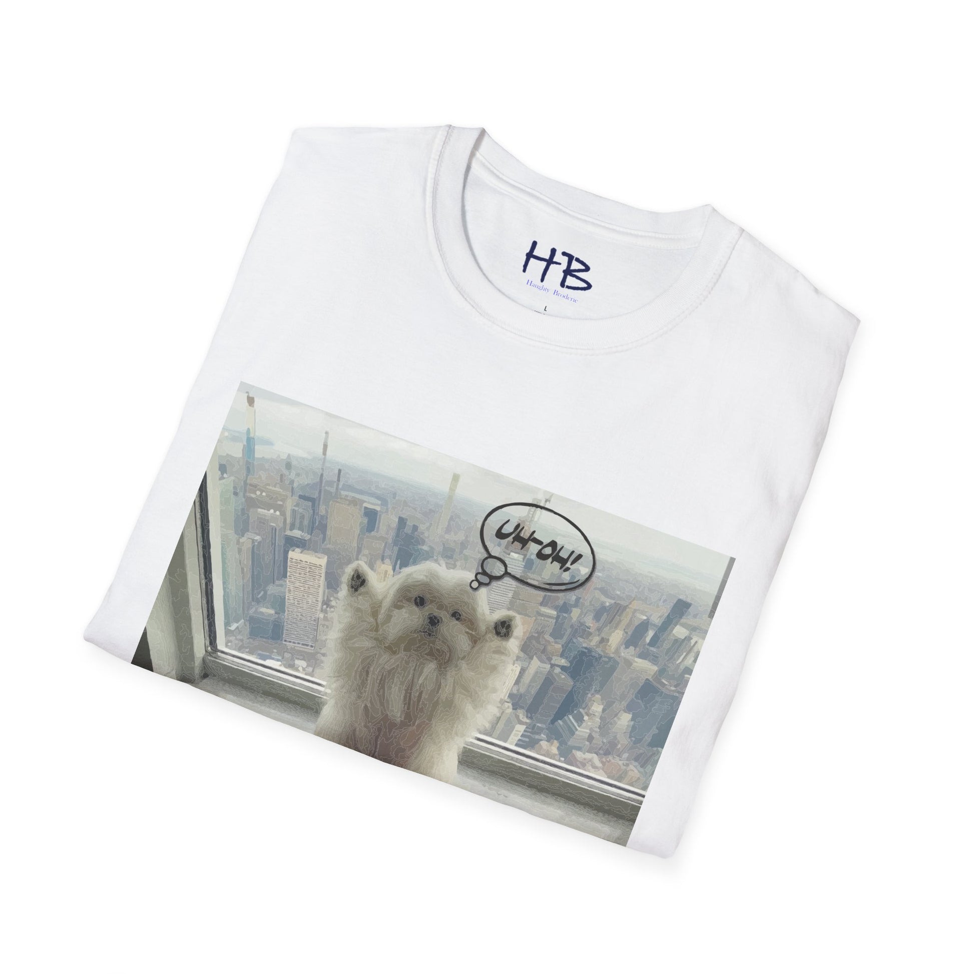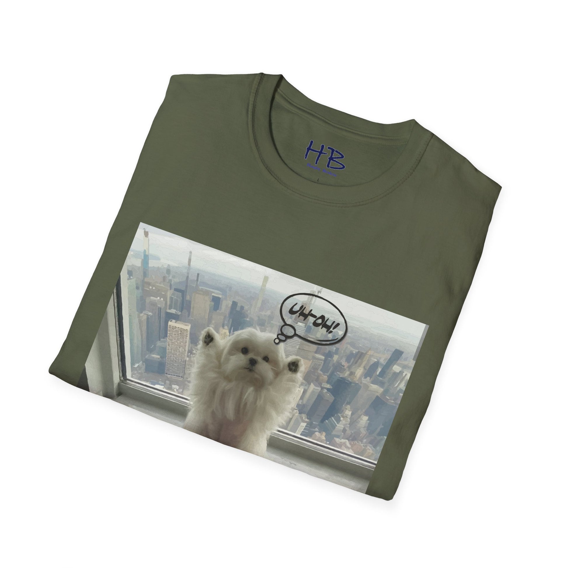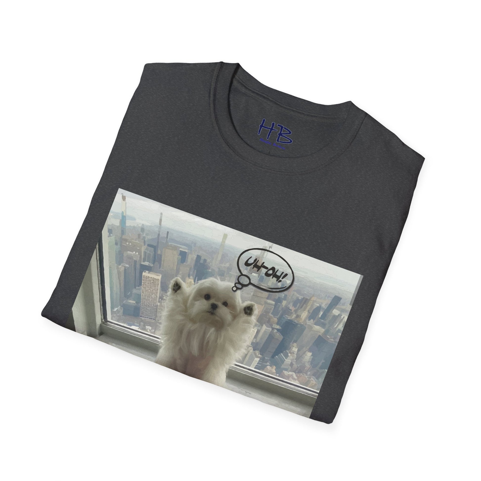 This tee showcases an adorable pup standing on his hind legs with his front paws raised in the air, as if in trouble with the police. The pup is set against a stunning backdrop of towering skyscrapers, indicating that he's in a penthouse.