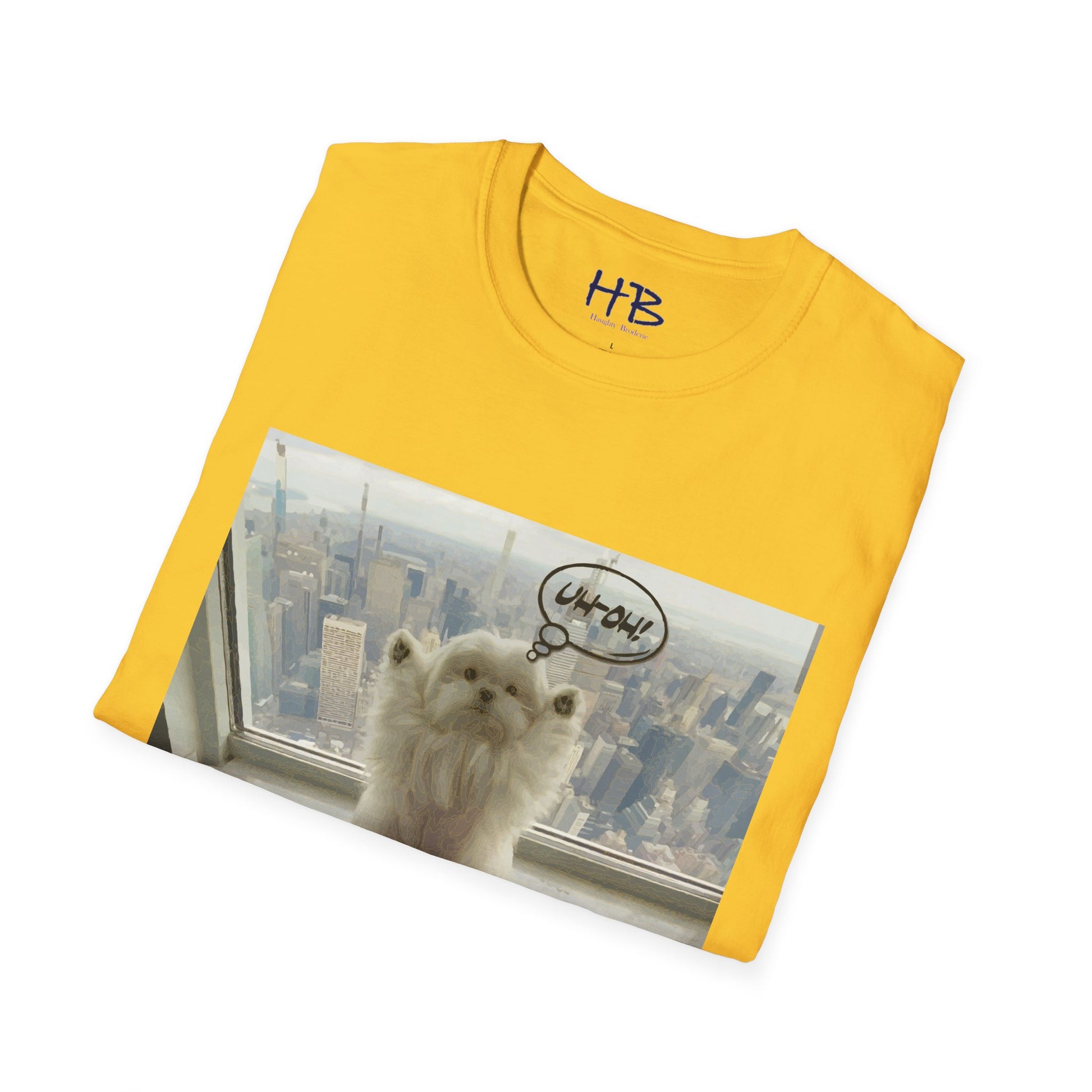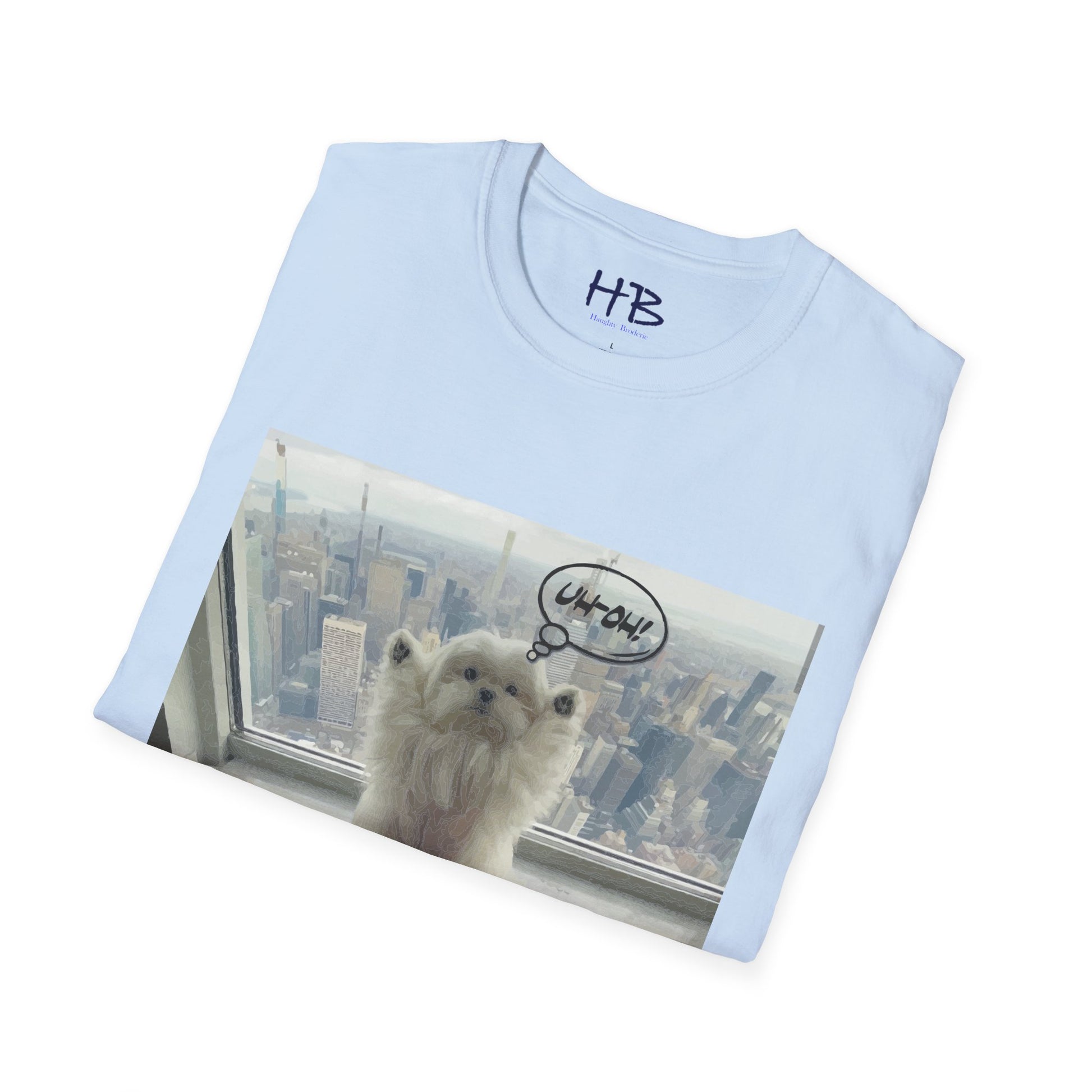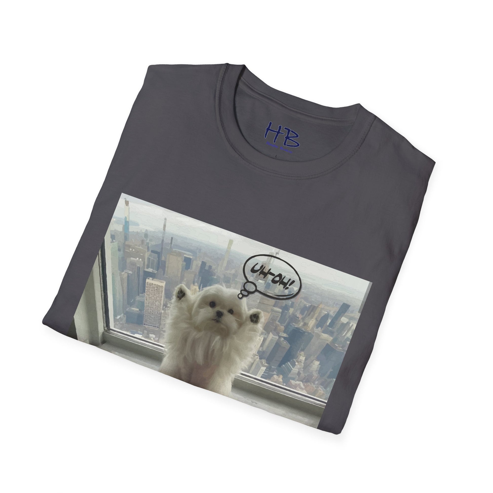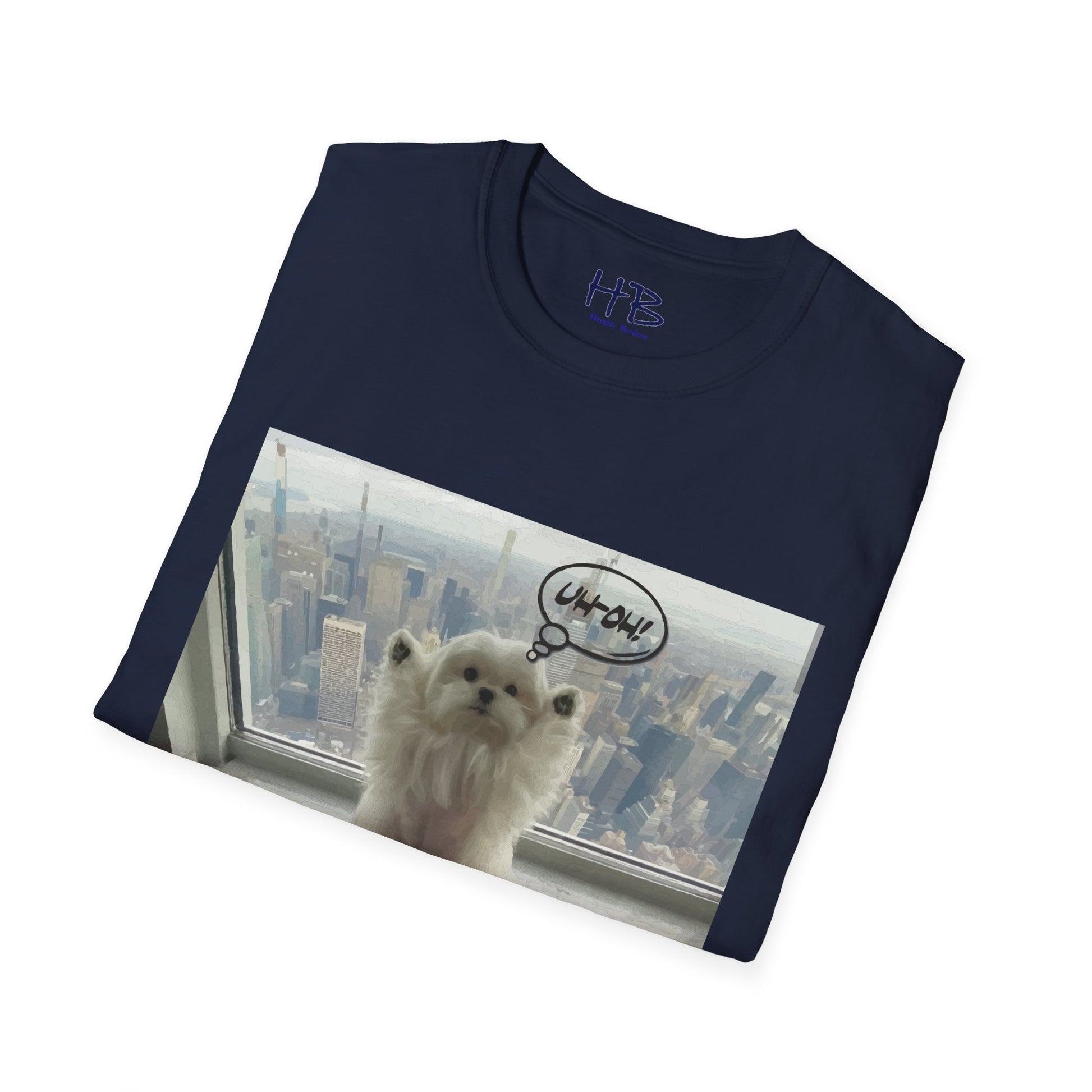 This tee showcases an adorable pup standing on his hind legs with his front paws raised in the air, as if in trouble with the police. The pup is set against a stunning backdrop of towering skyscrapers, indicating that he's in a penthouse.