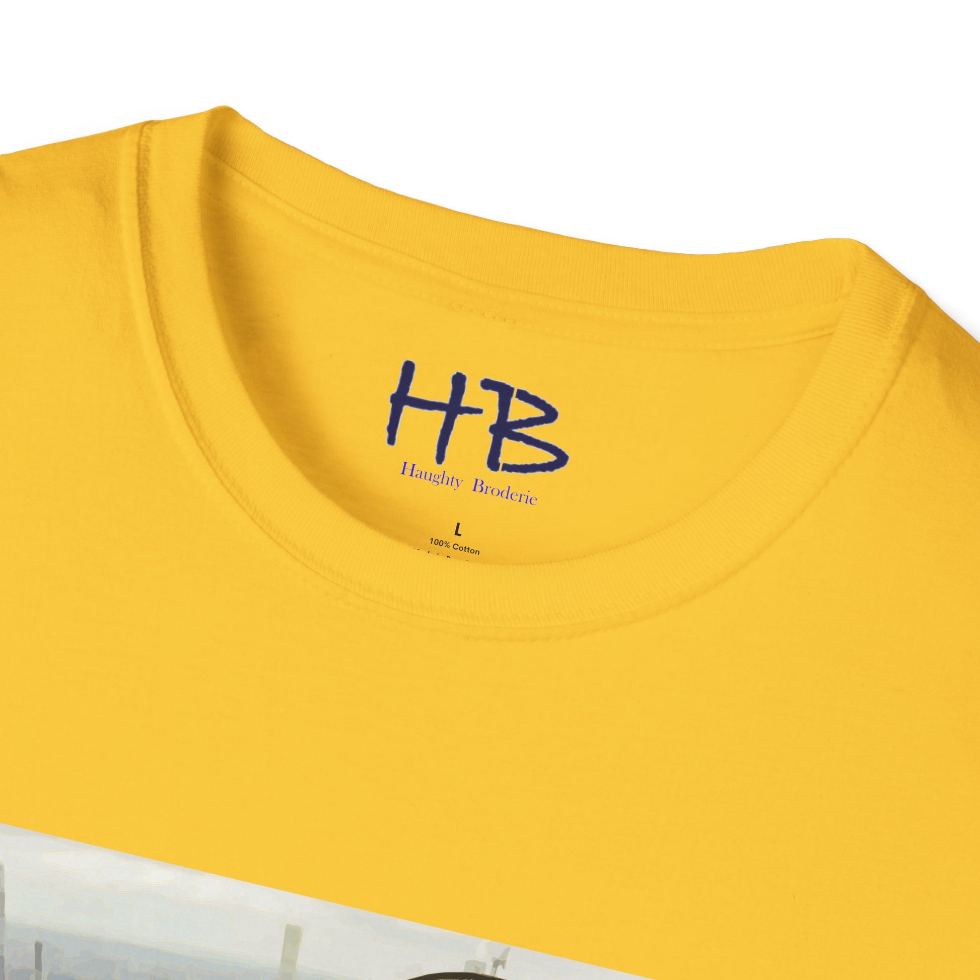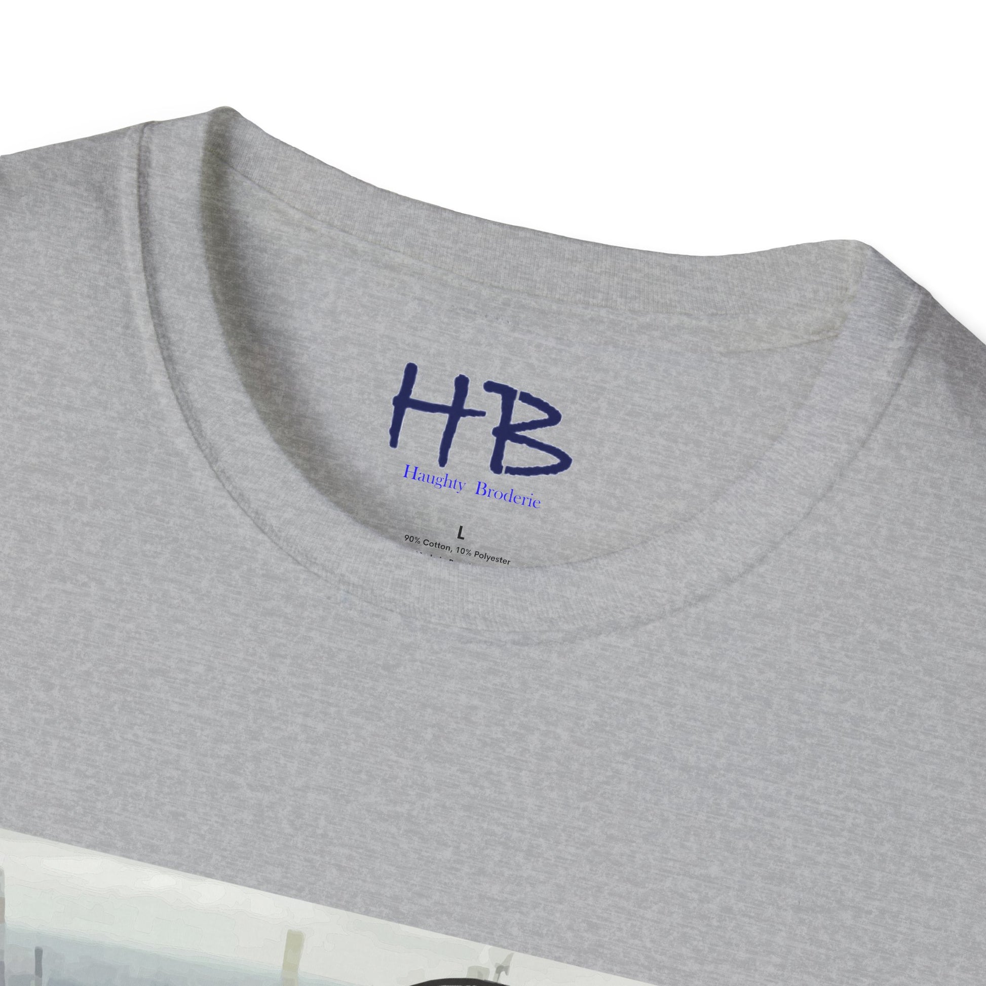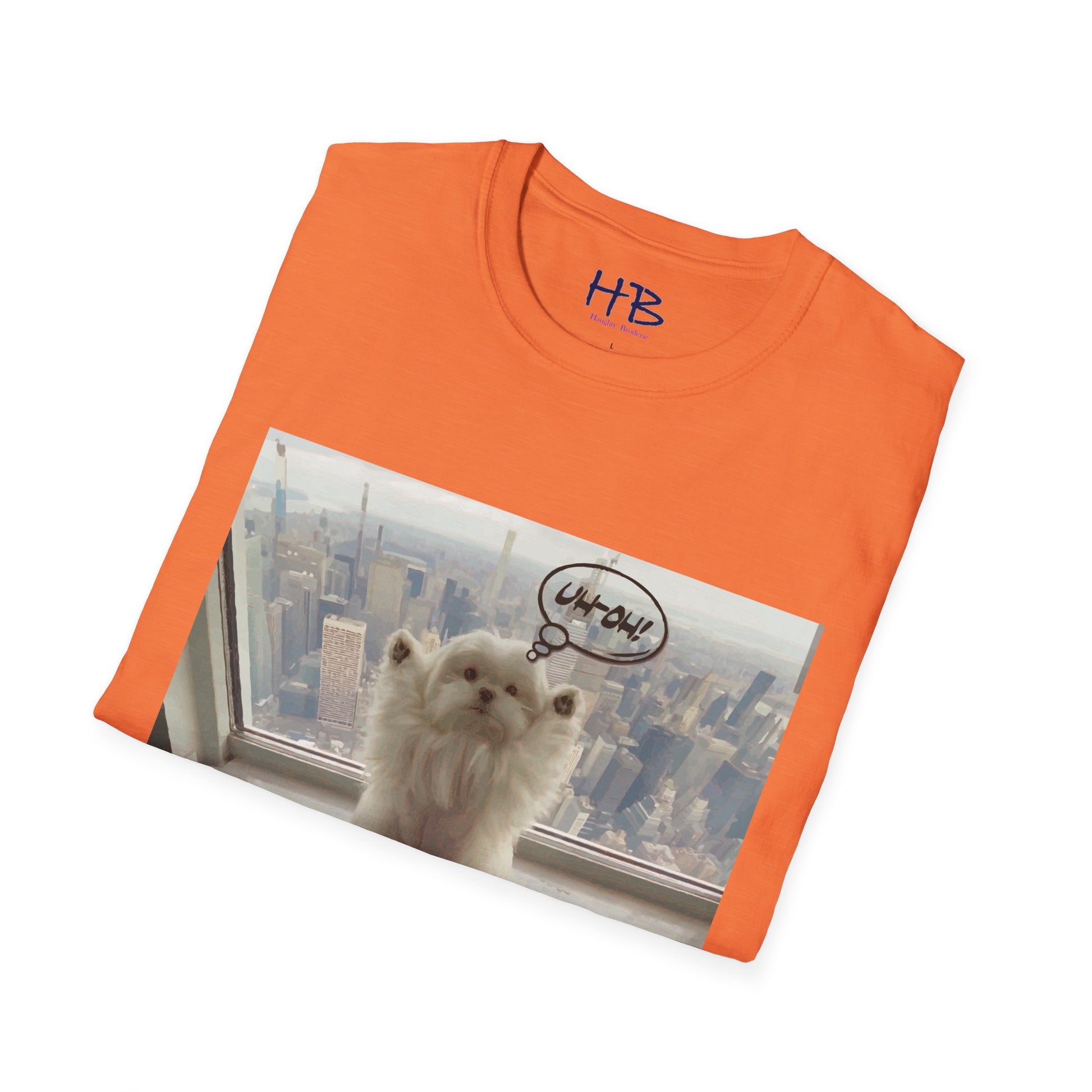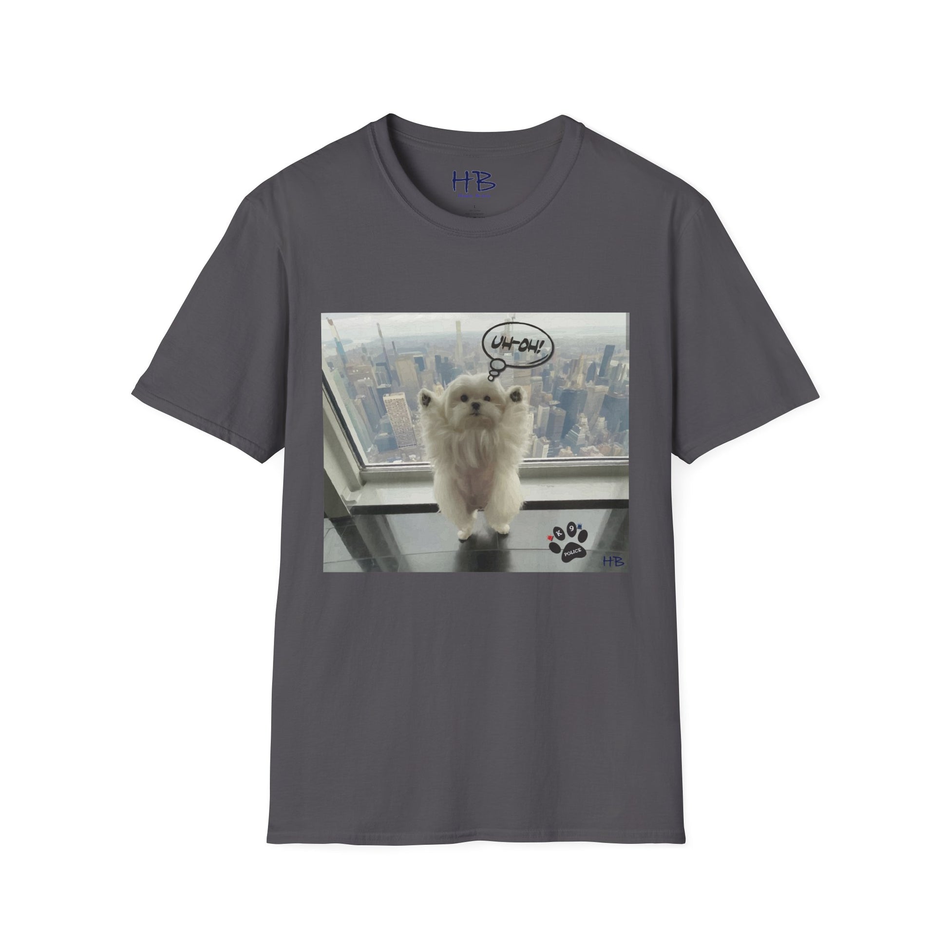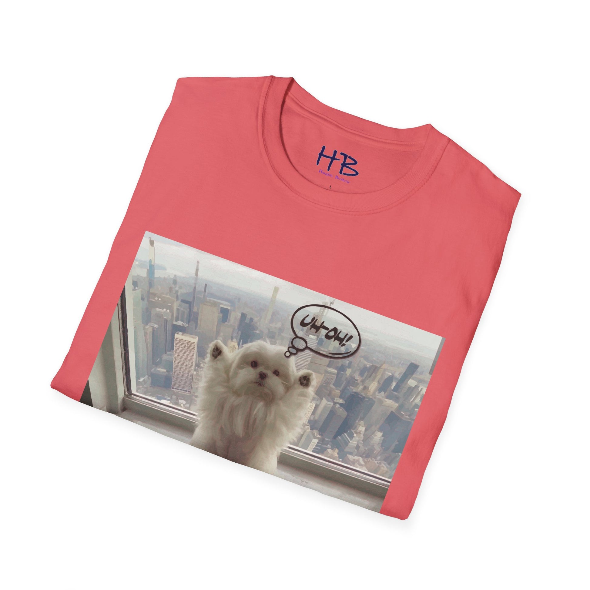 This tee showcases an adorable pup standing on his hind legs with his front paws raised in the air, as if in trouble with the police. The pup is set against a stunning backdrop of towering skyscrapers, indicating that he's in a penthouse.