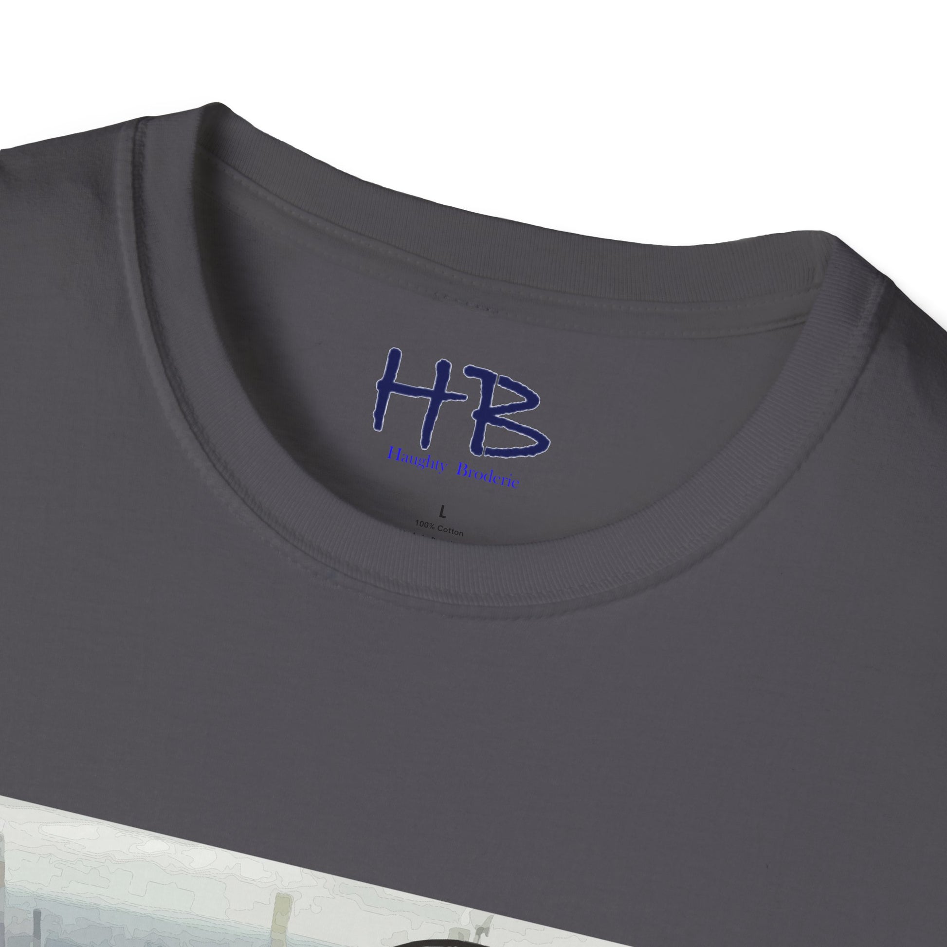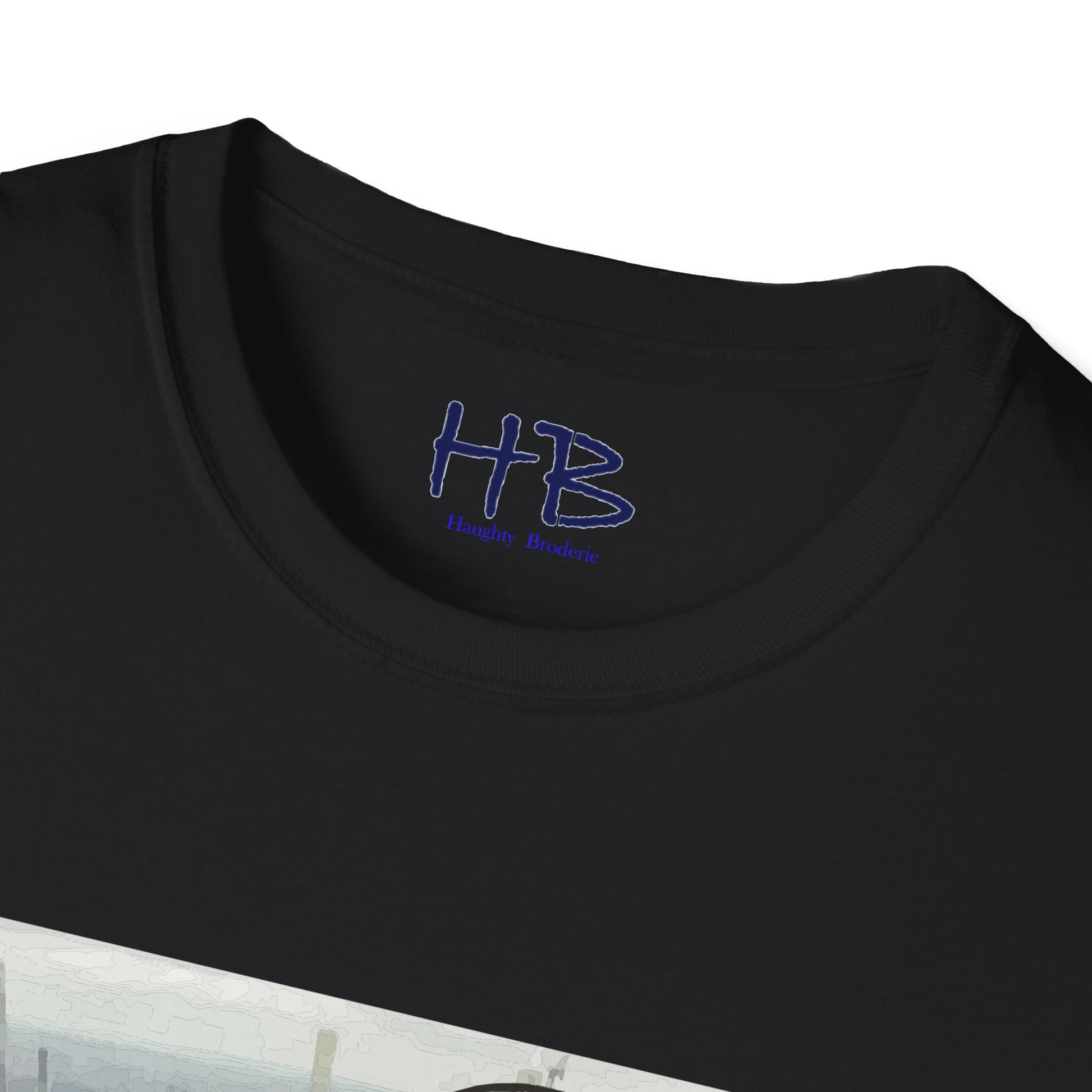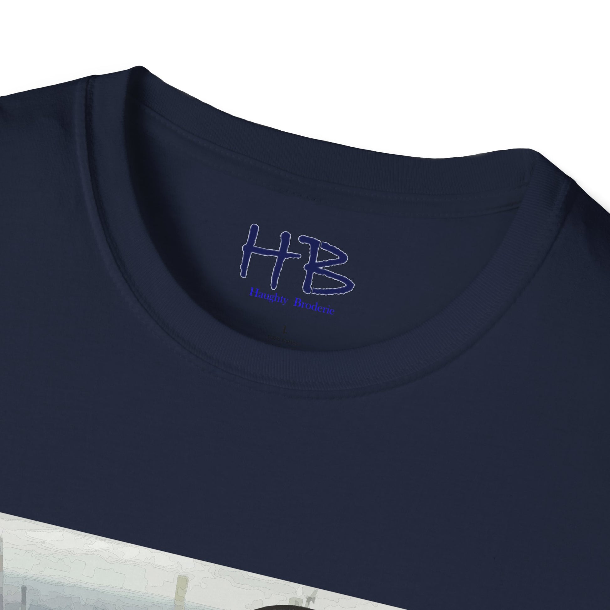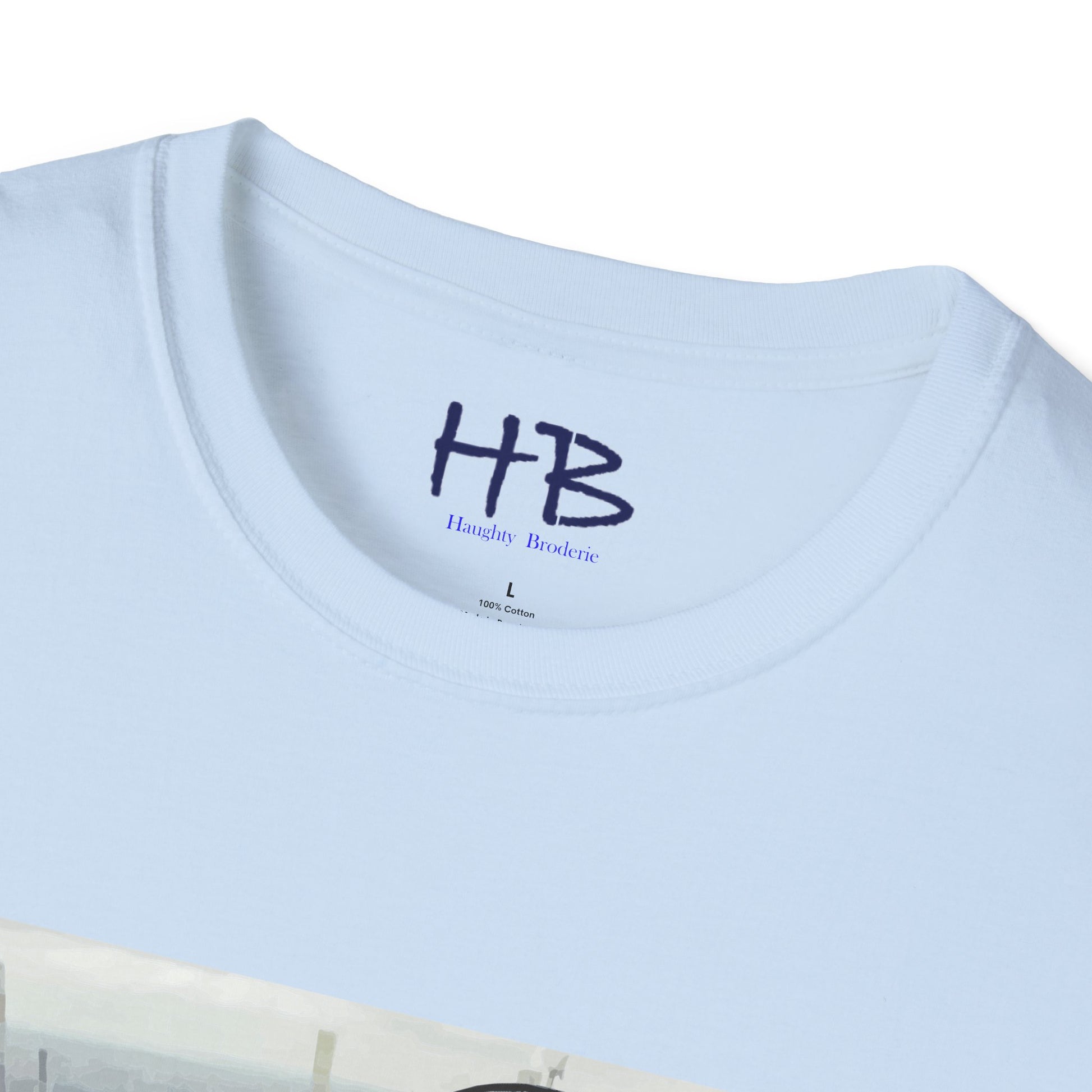 This tee showcases an adorable pup standing on his hind legs with his front paws raised in the air, as if in trouble with the police. The pup is set against a stunning backdrop of towering skyscrapers, indicating that he's in a penthouse.