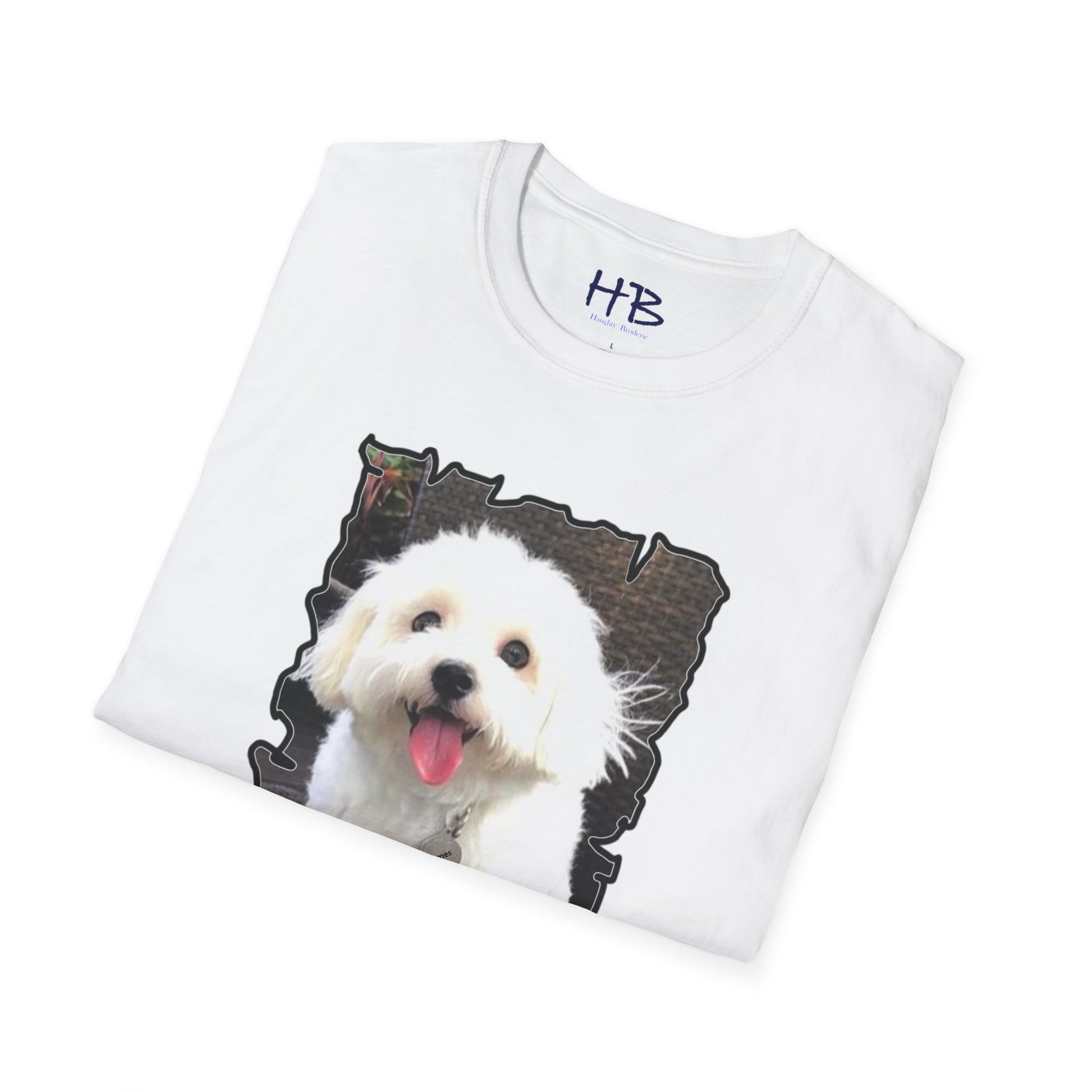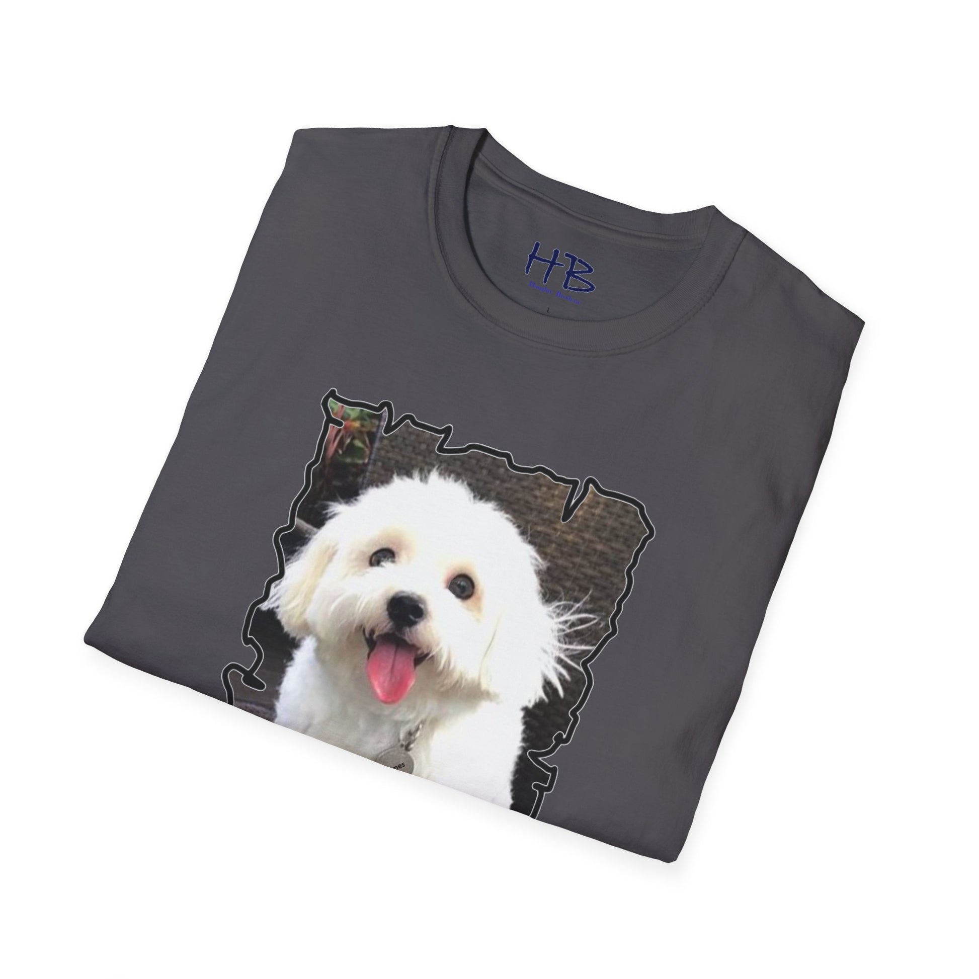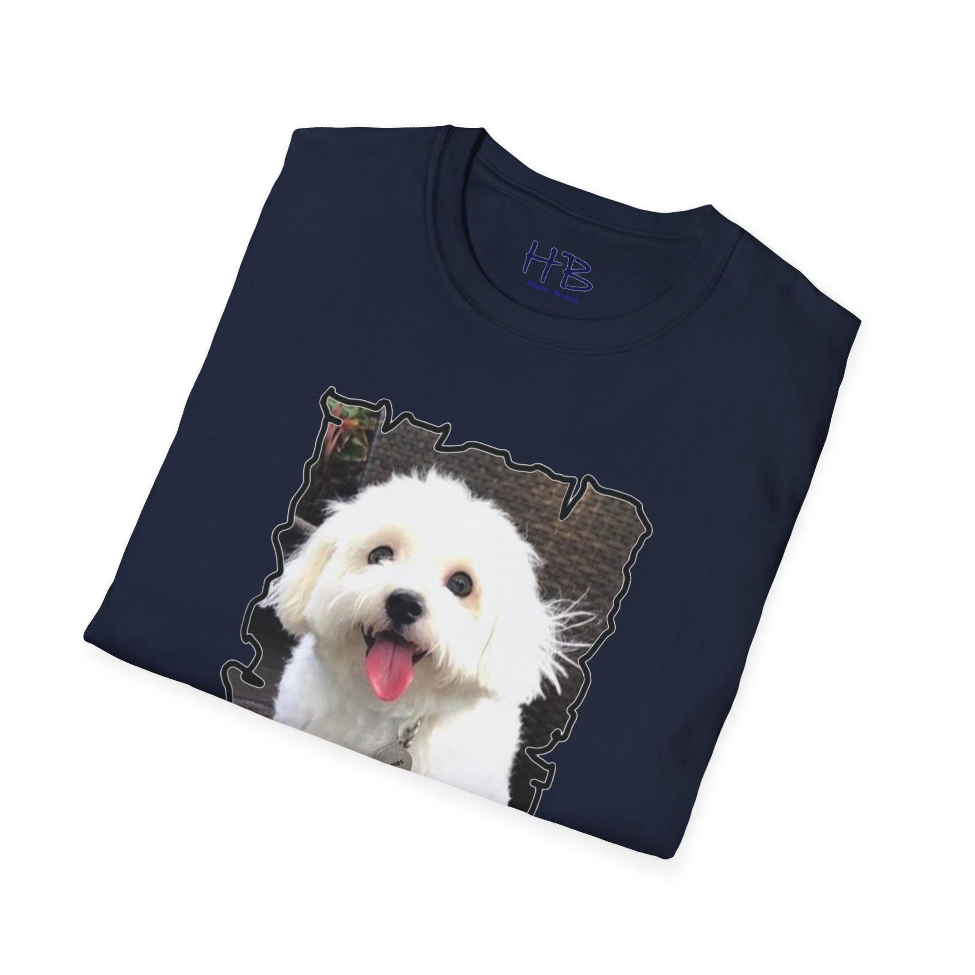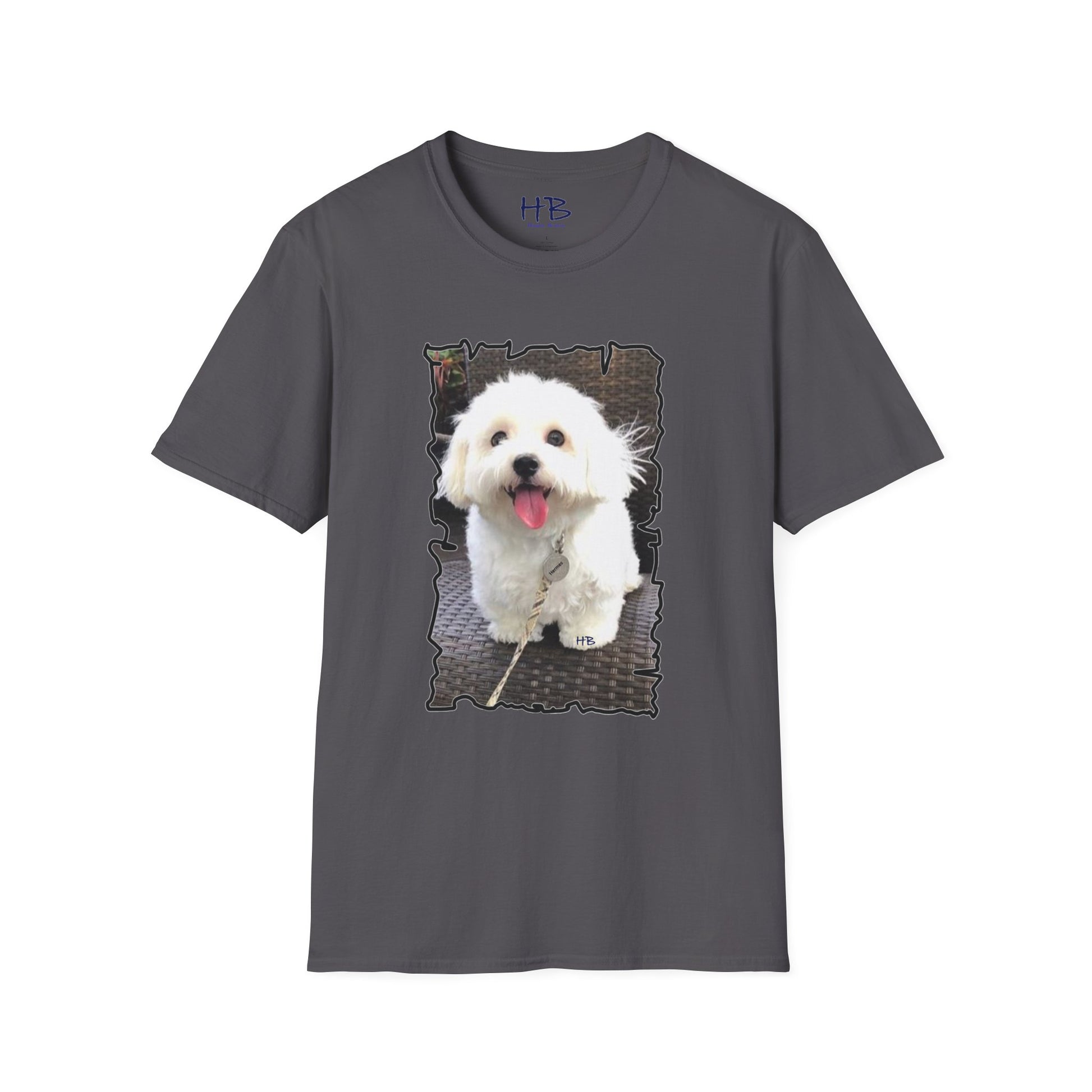 Introducing our latest tee shirt design featuring an adorable Bichon Maltese by the name of Hermes. This charming little dog has a bright and radiant smile that's sure to bring joy to anyone's day. With a tongue as pink as a rose, Hermes is a true delight to behold.