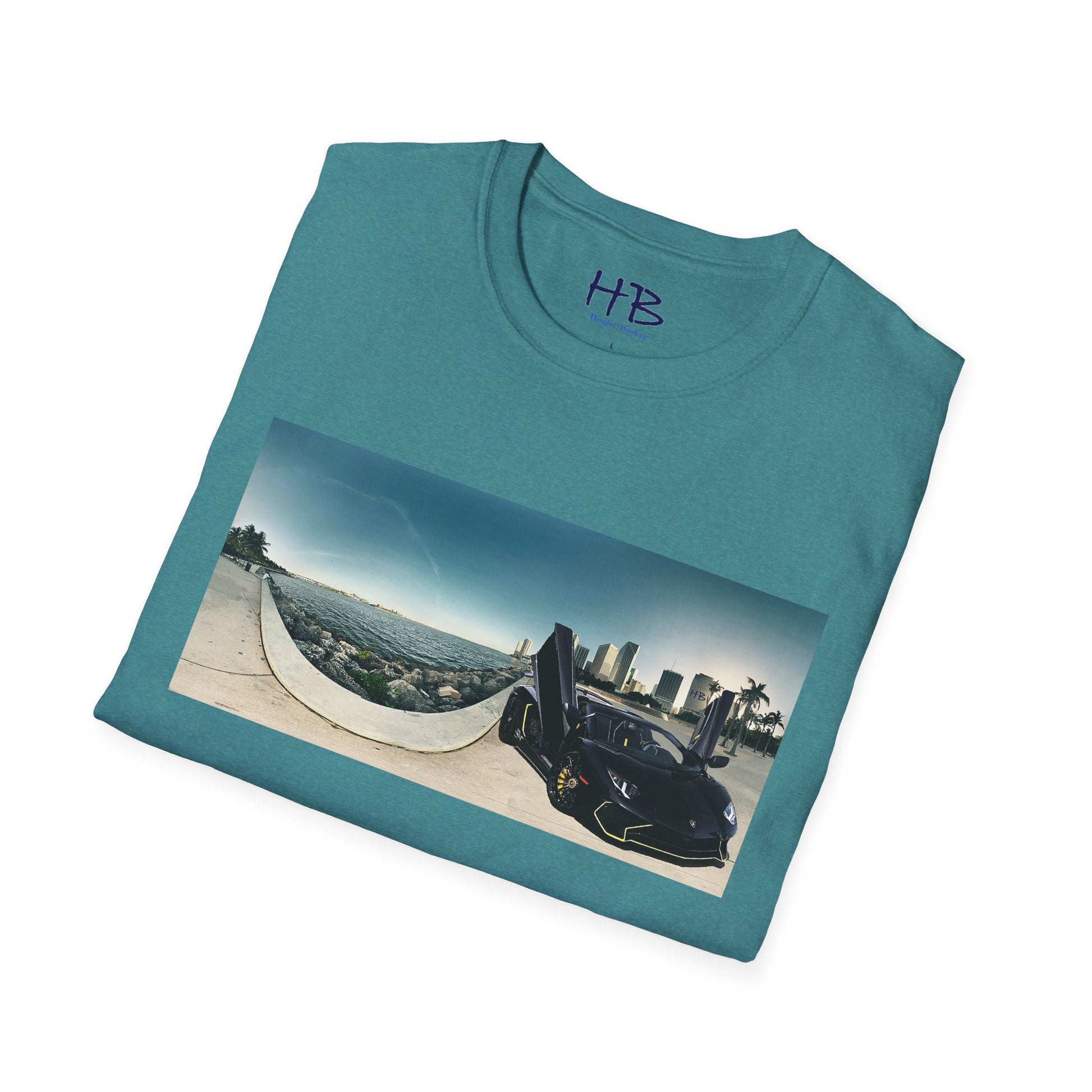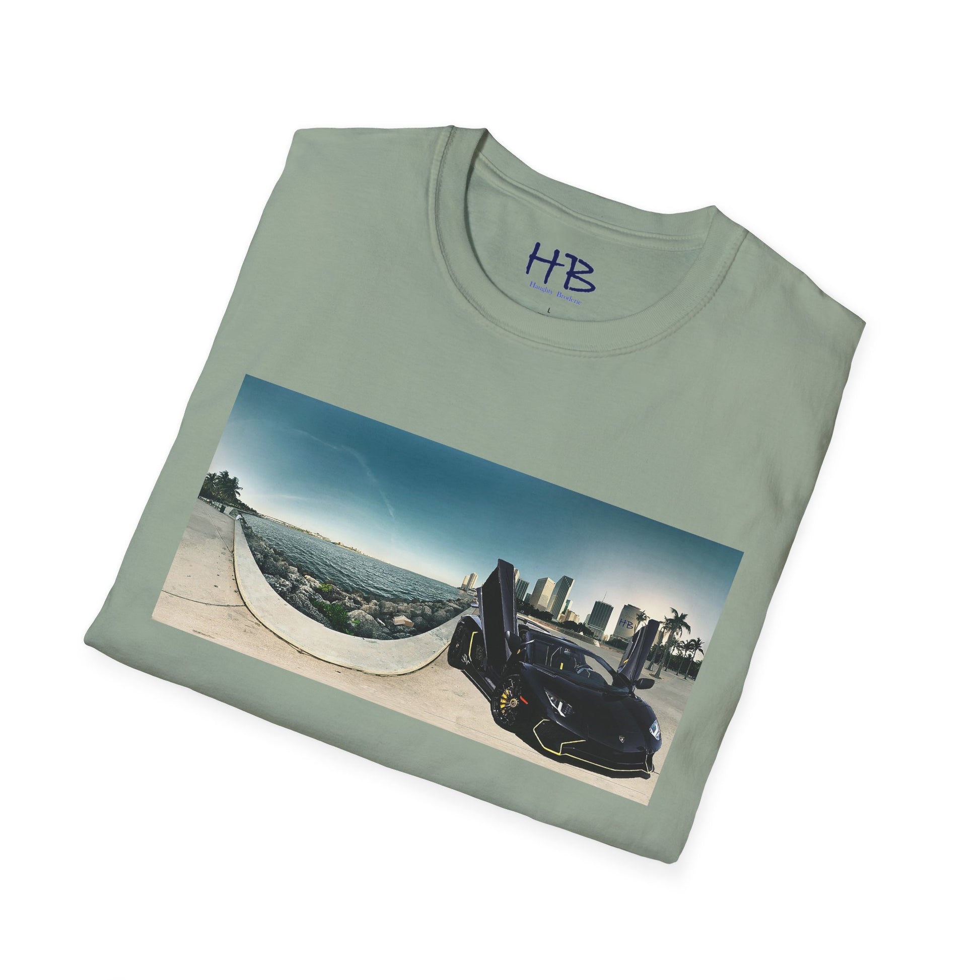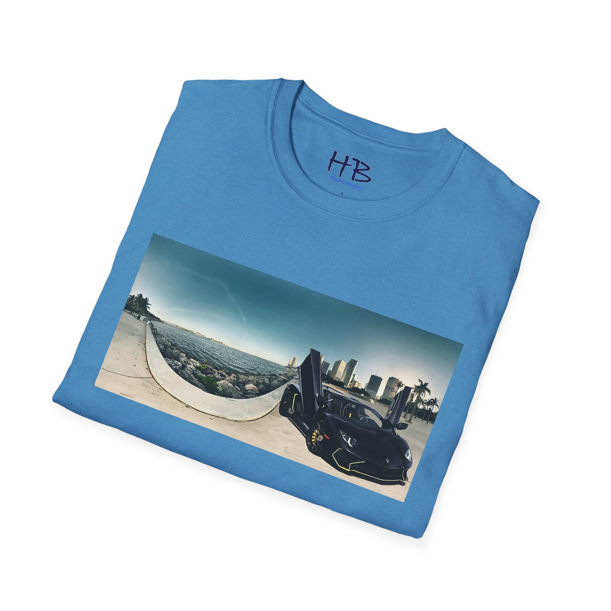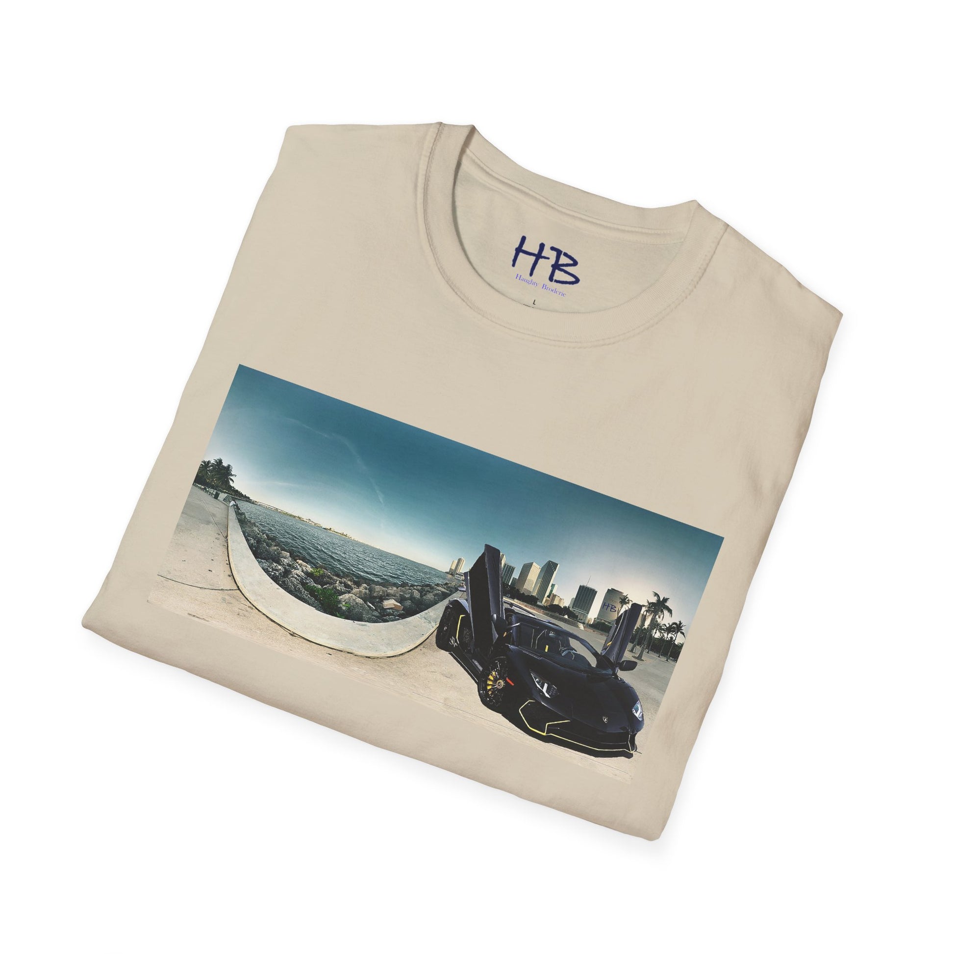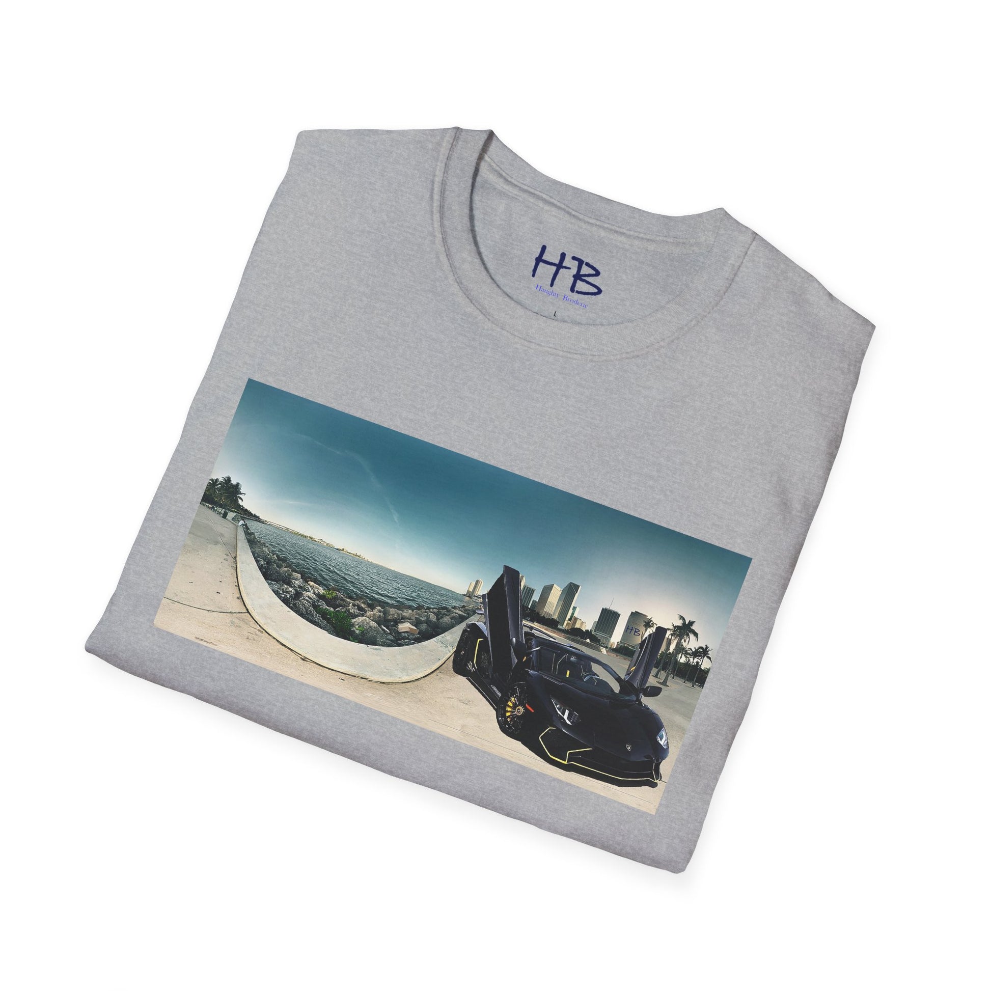 Introducing our stunning tee shirt that features a magnificent vista of the city center alongside the glistening waterfront. The scene is further accentuated by the presence of a sleek and stylish black Lamborghini Aventador, parked with its doors ajar, facing away from the sparkling ocean. This t-shirt is the perfect way to commemorate your love for luxury cars and picturesque landscapes. With this tee, you can carry a piece of this awe-inspiring sight with you wherever you go. Don't miss out on the opportunity to own a piece of wearable art that embodies the epitome of urban sophistication and breathtaking natural beauty.
