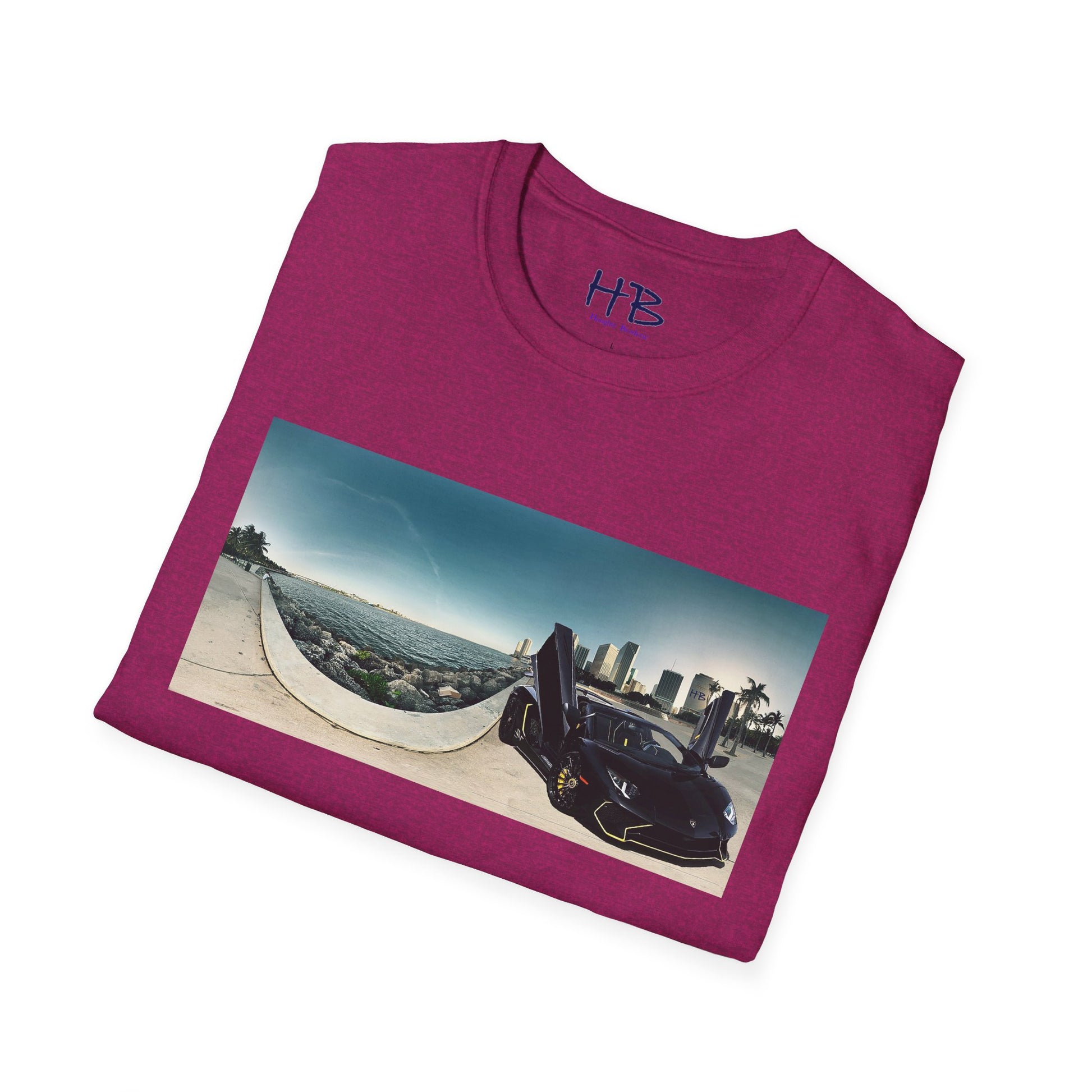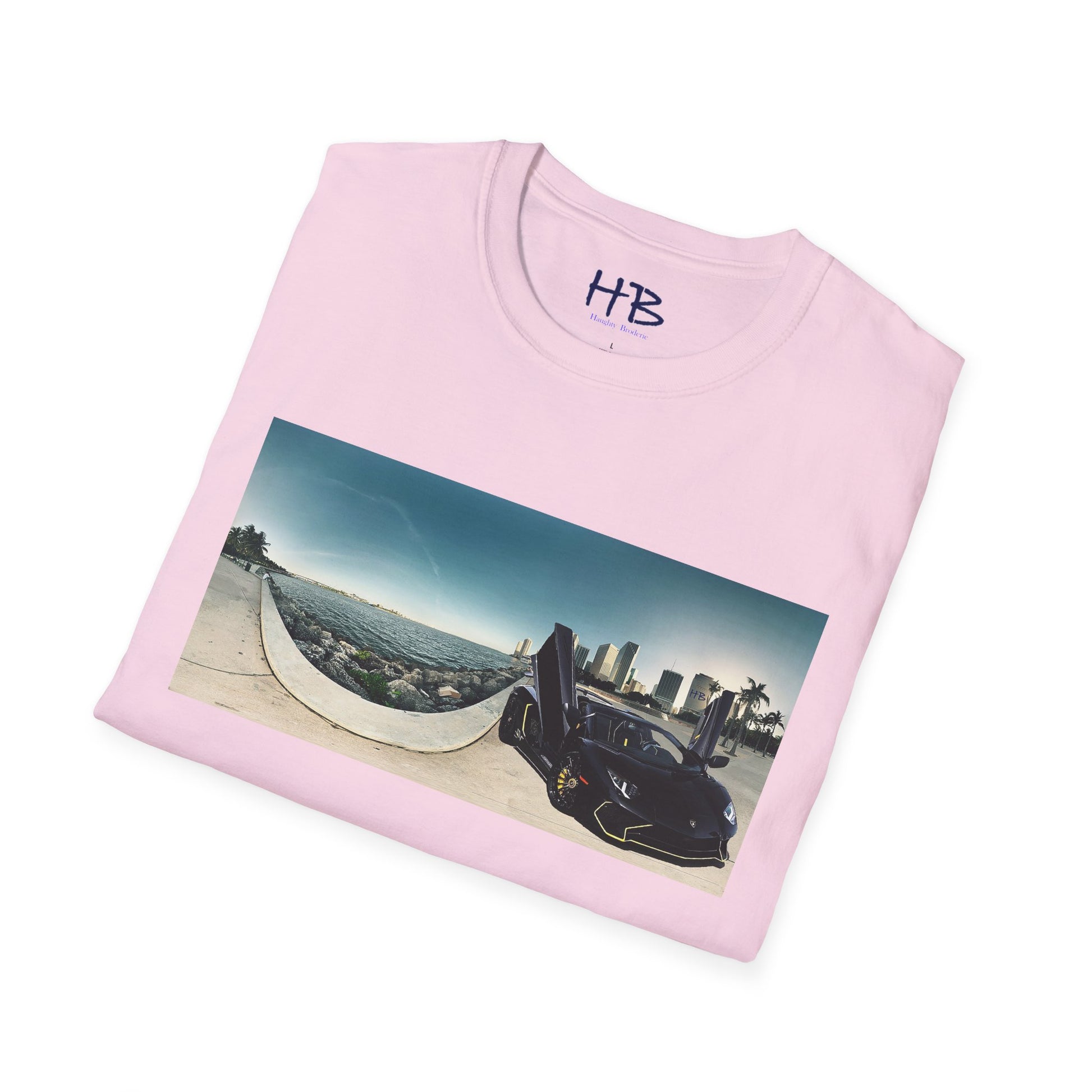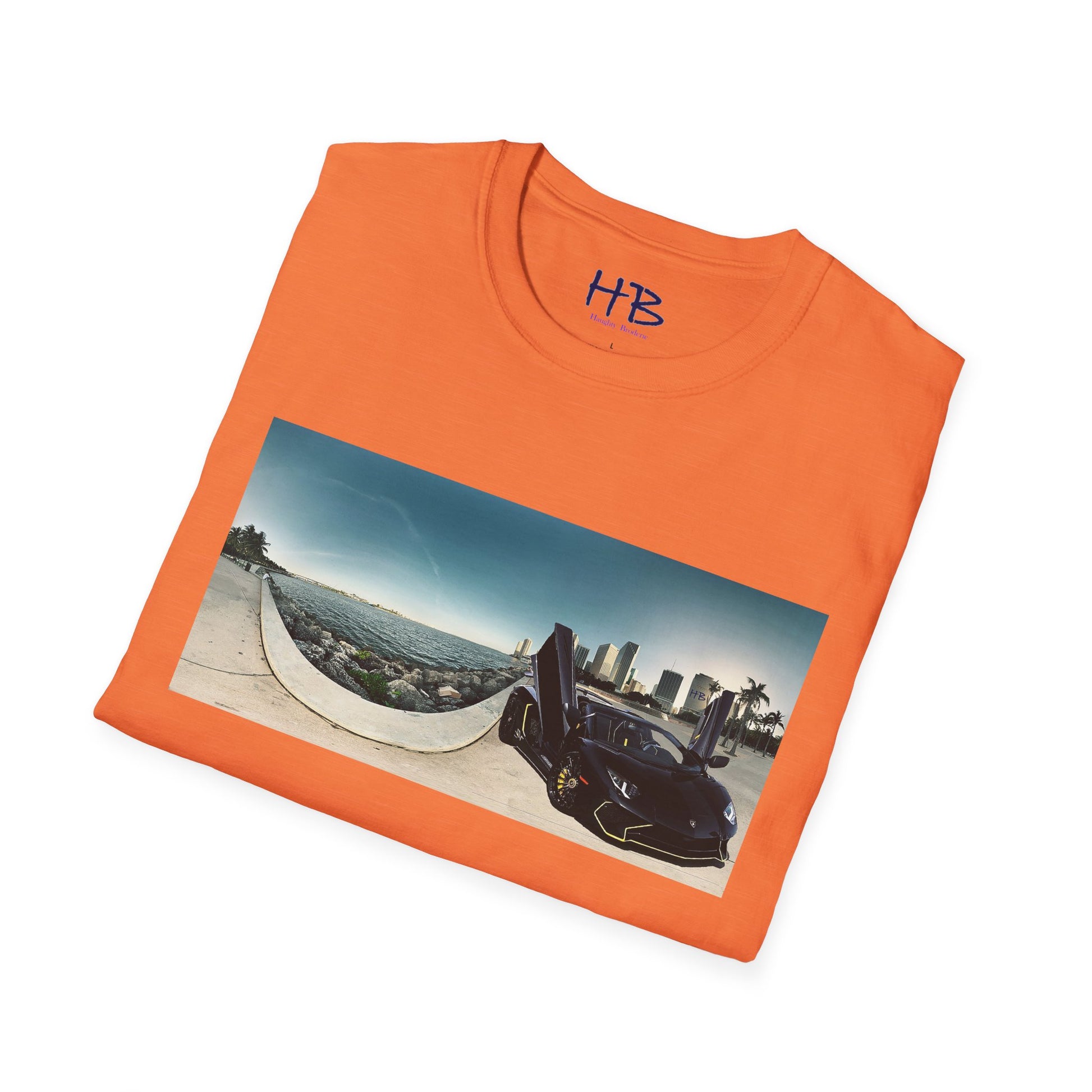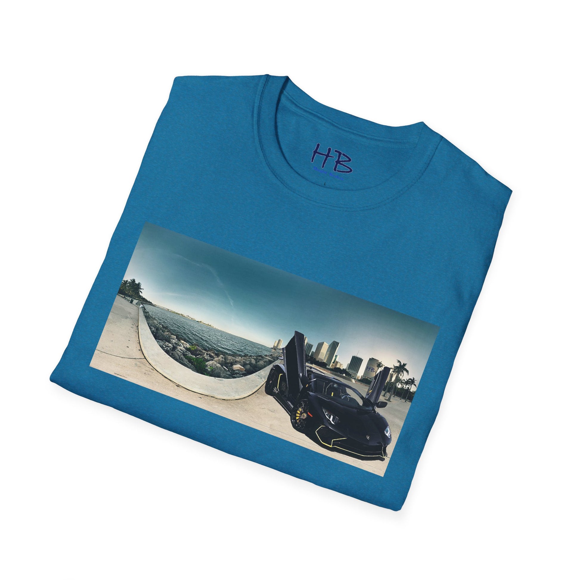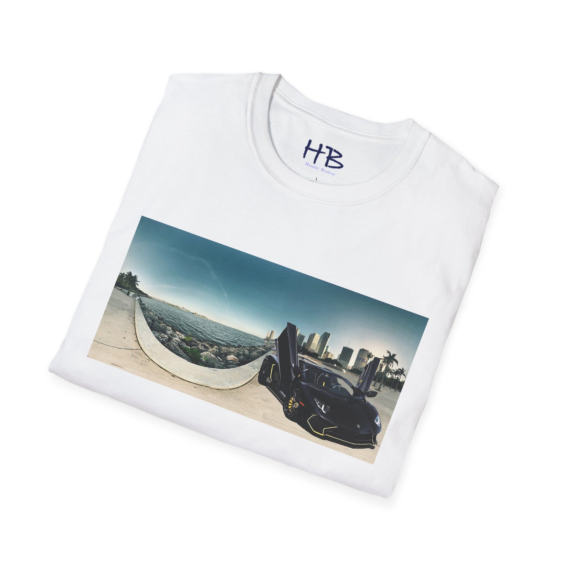Introducing our stunning tee shirt that features a magnificent vista of the city center alongside the glistening waterfront. The scene is further accentuated by the presence of a sleek and stylish black Lamborghini Aventador, parked with its doors ajar, facing away from the sparkling ocean. This t-shirt is the perfect way to commemorate your love for luxury cars and picturesque landscapes. With this tee, you can carry a piece of this awe-inspiring sight with you wherever you go. Don't miss out on the opportunity to own a piece of wearable art that embodies the epitome of urban sophistication and breathtaking natural beauty.