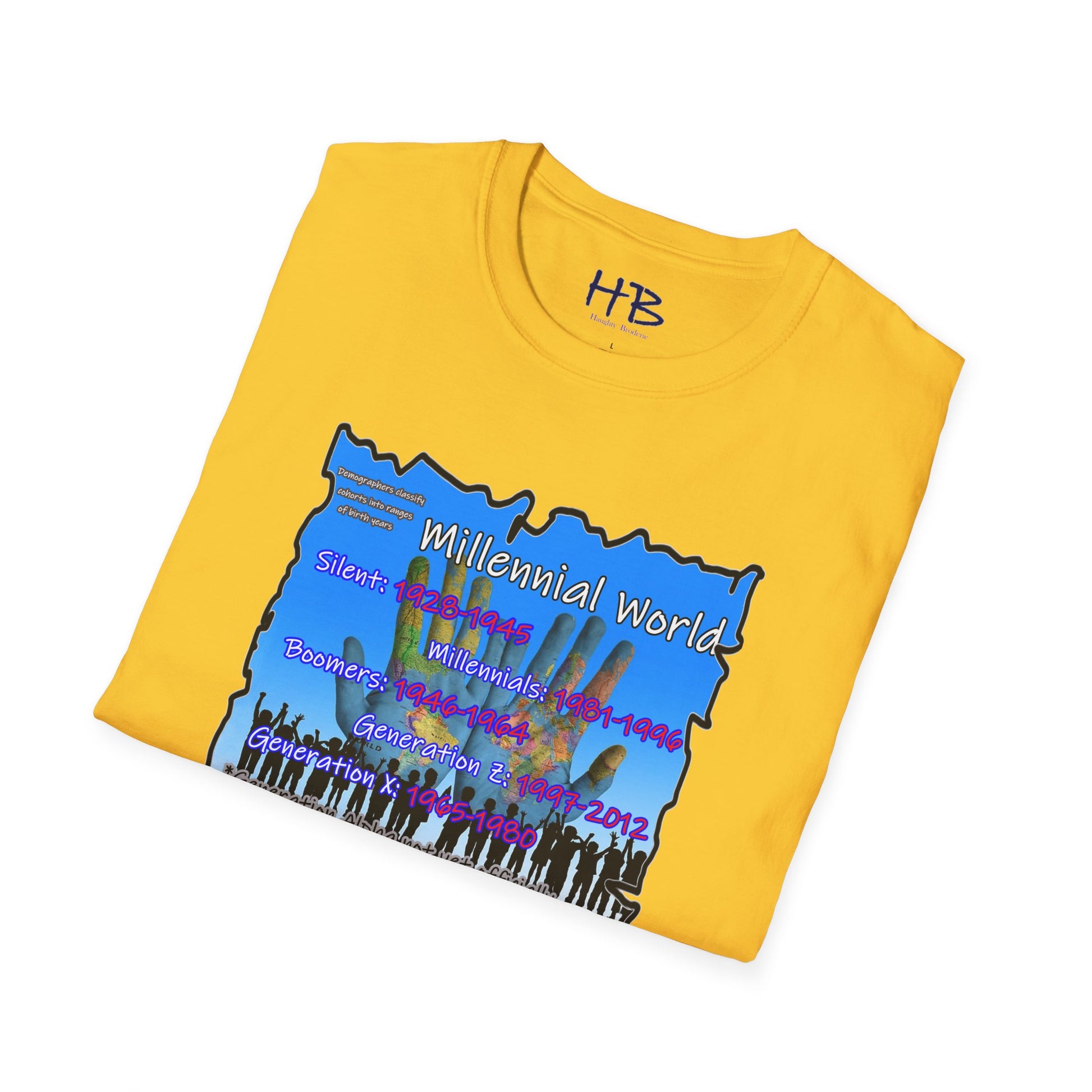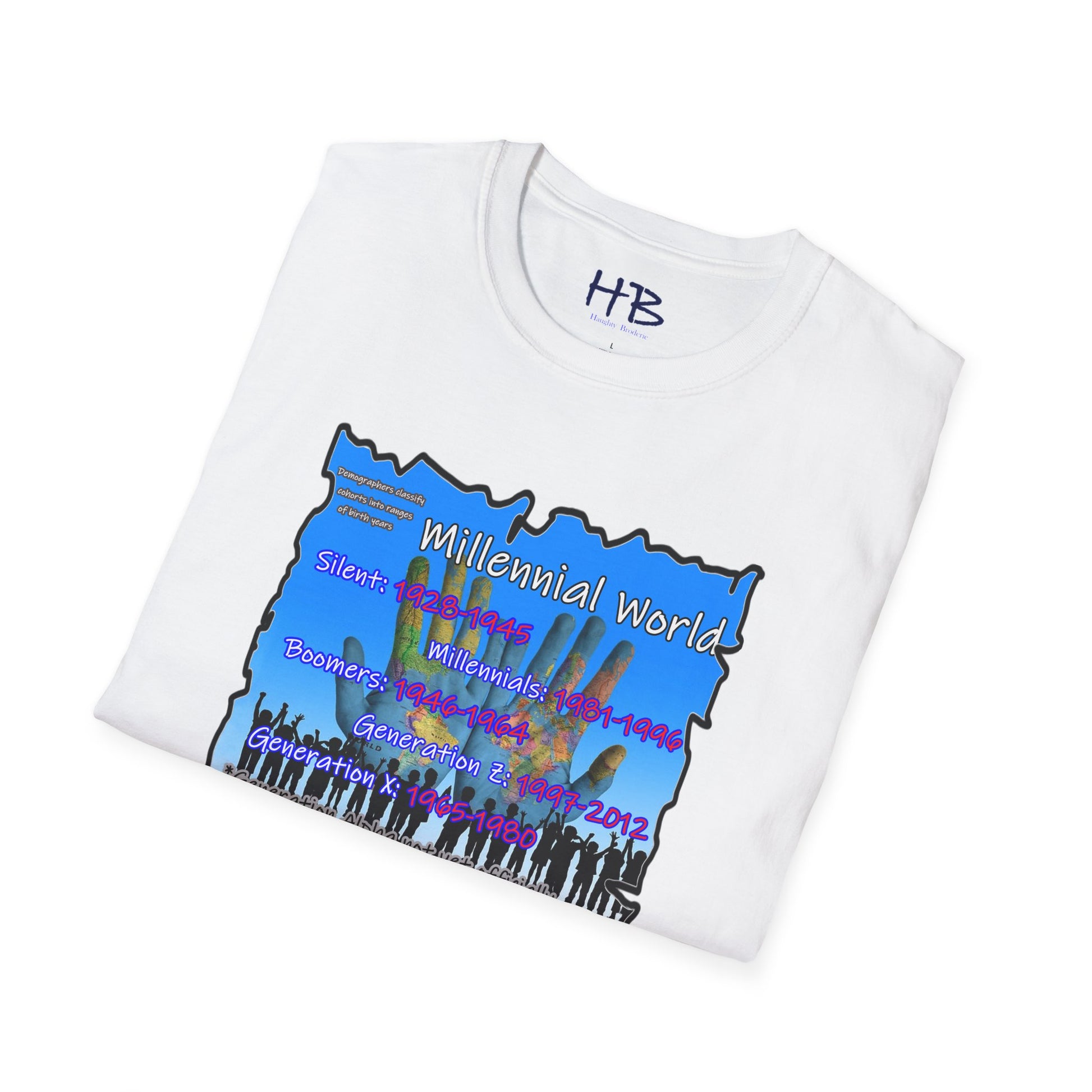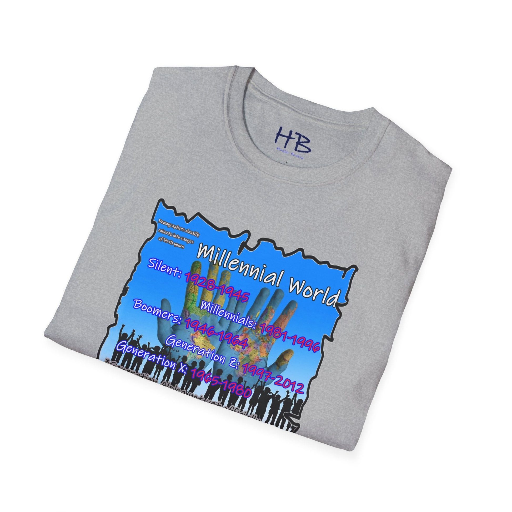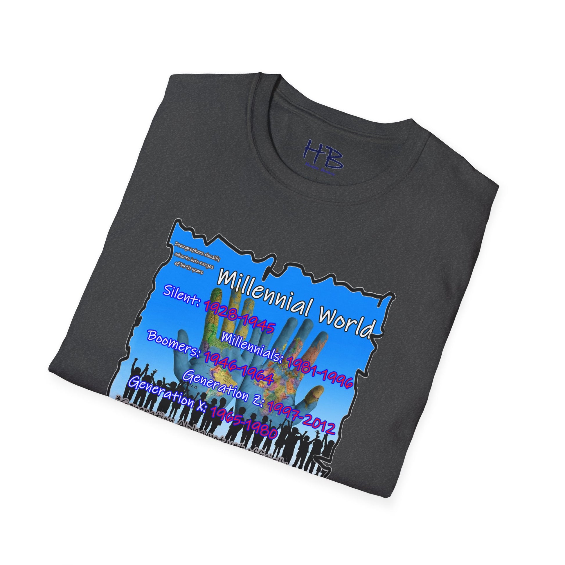 In the bottom corner of the image, you'll find the intriguing text "Demographers classify cohorts into ranges of birth years." This subtle addition adds a touch of educational value, subtly reminding us of the various generational cohorts that have shaped our society. The bold and colorful letters spell out "Millennial World," underscoring the central focus of this tee shirt.