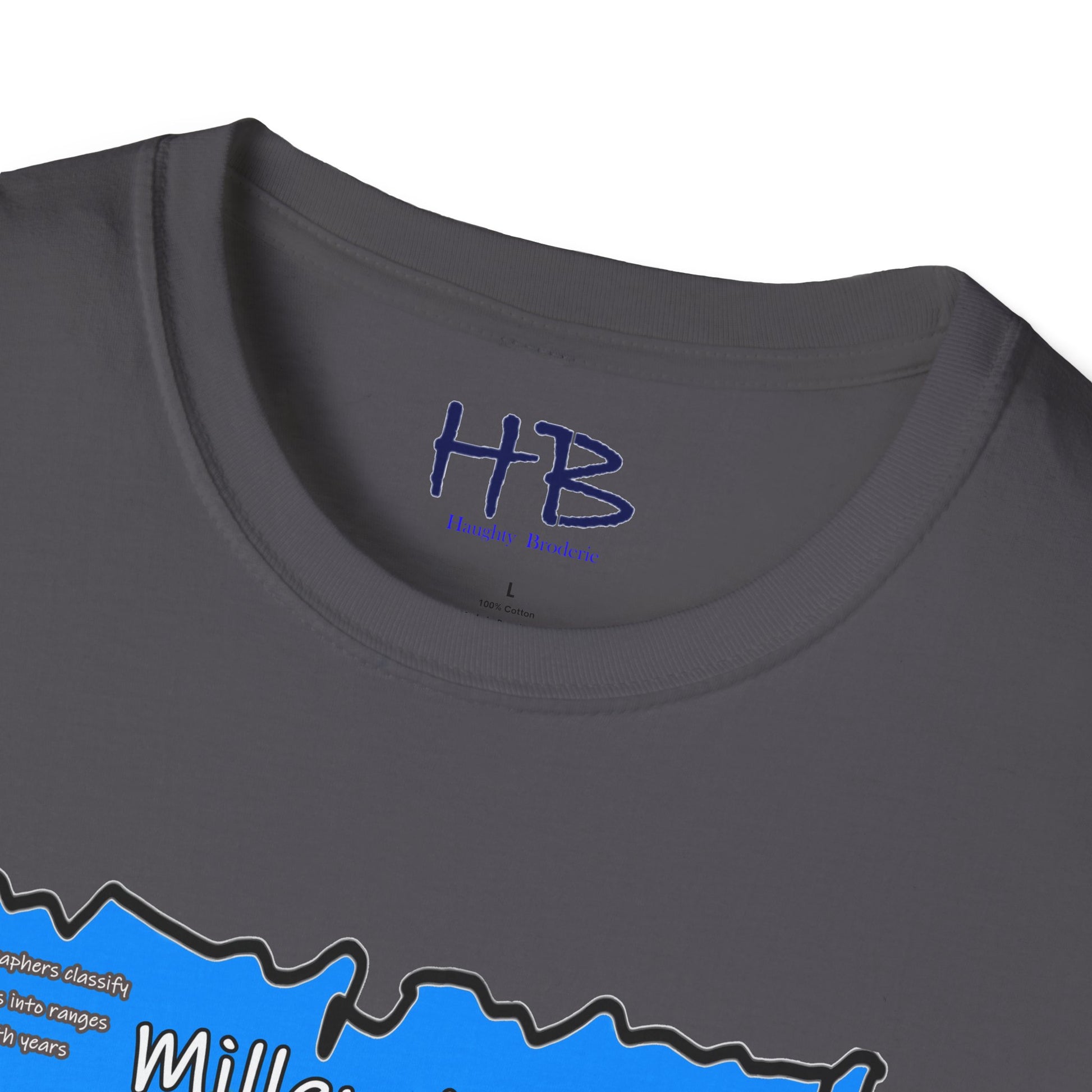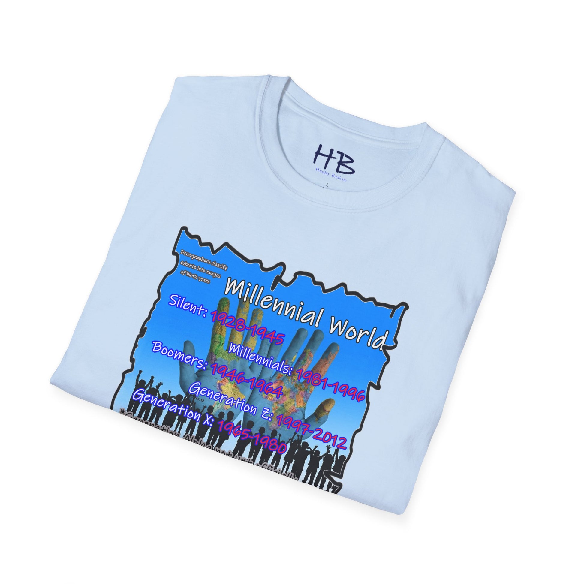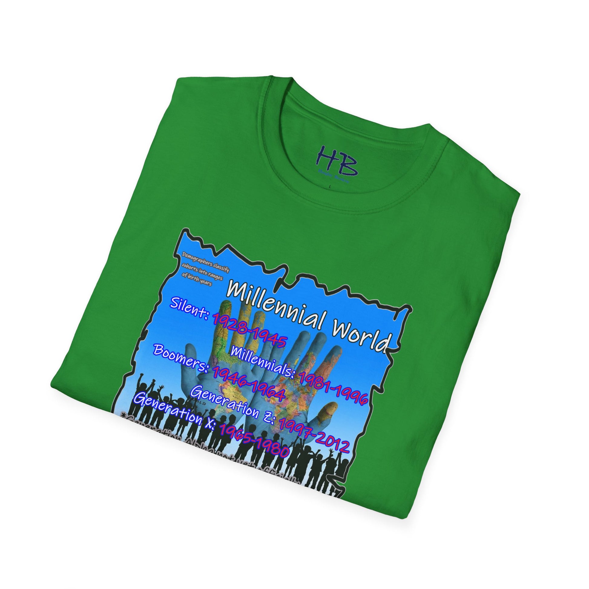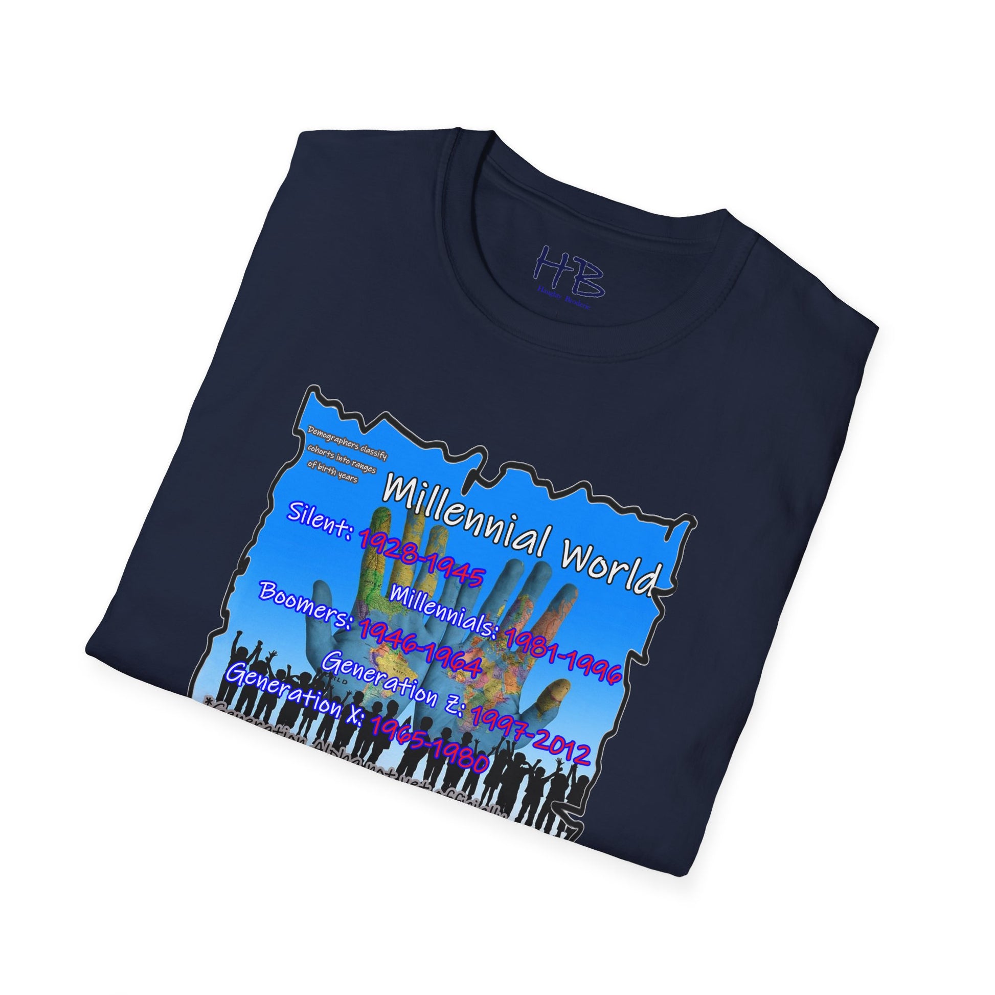 In the bottom corner of the image, you'll find the intriguing text "Demographers classify cohorts into ranges of birth years." This subtle addition adds a touch of educational value, subtly reminding us of the various generational cohorts that have shaped our society. The bold and colorful letters spell out "Millennial World," underscoring the central focus of this tee shirt.