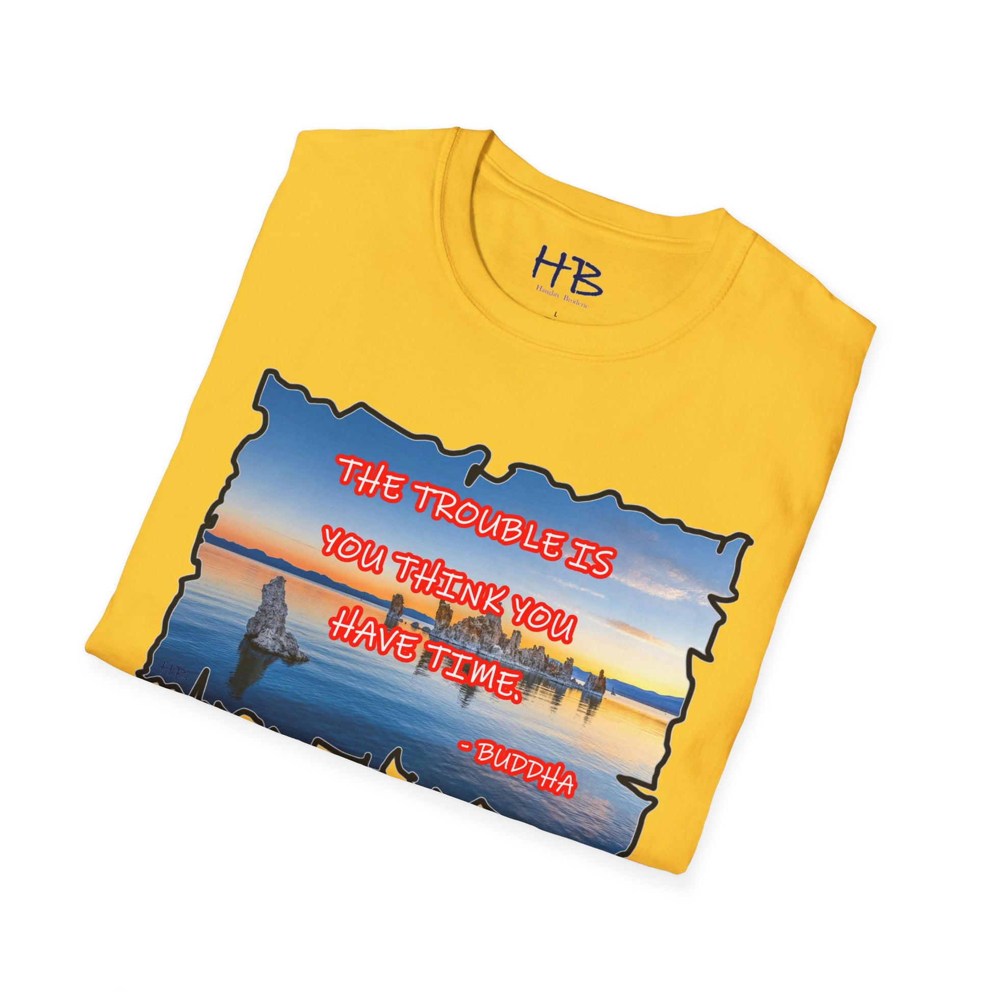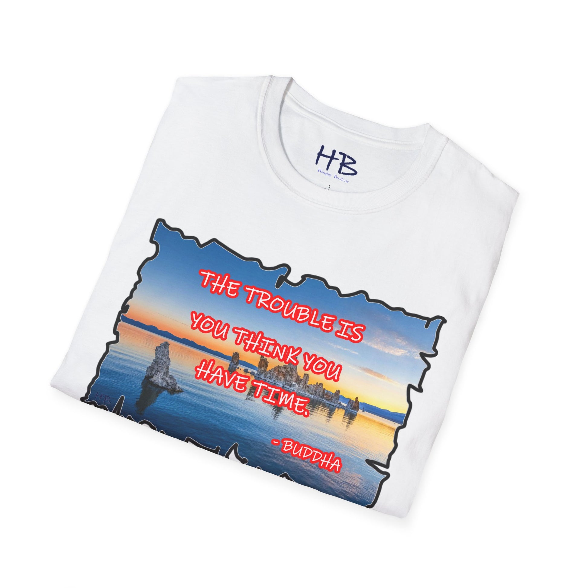 At the heart of this picturesque panorama, the profound words of Buddha echo with timeless wisdom: "The truth is you think you have time." These words, elegantly inscribed amidst the rocks, serve as a poignant reminder of life's fleeting moments. The synergy of visual and philosophical elements creates a garment that transcends fashion, becoming a wearable piece of art that sparks introspection.