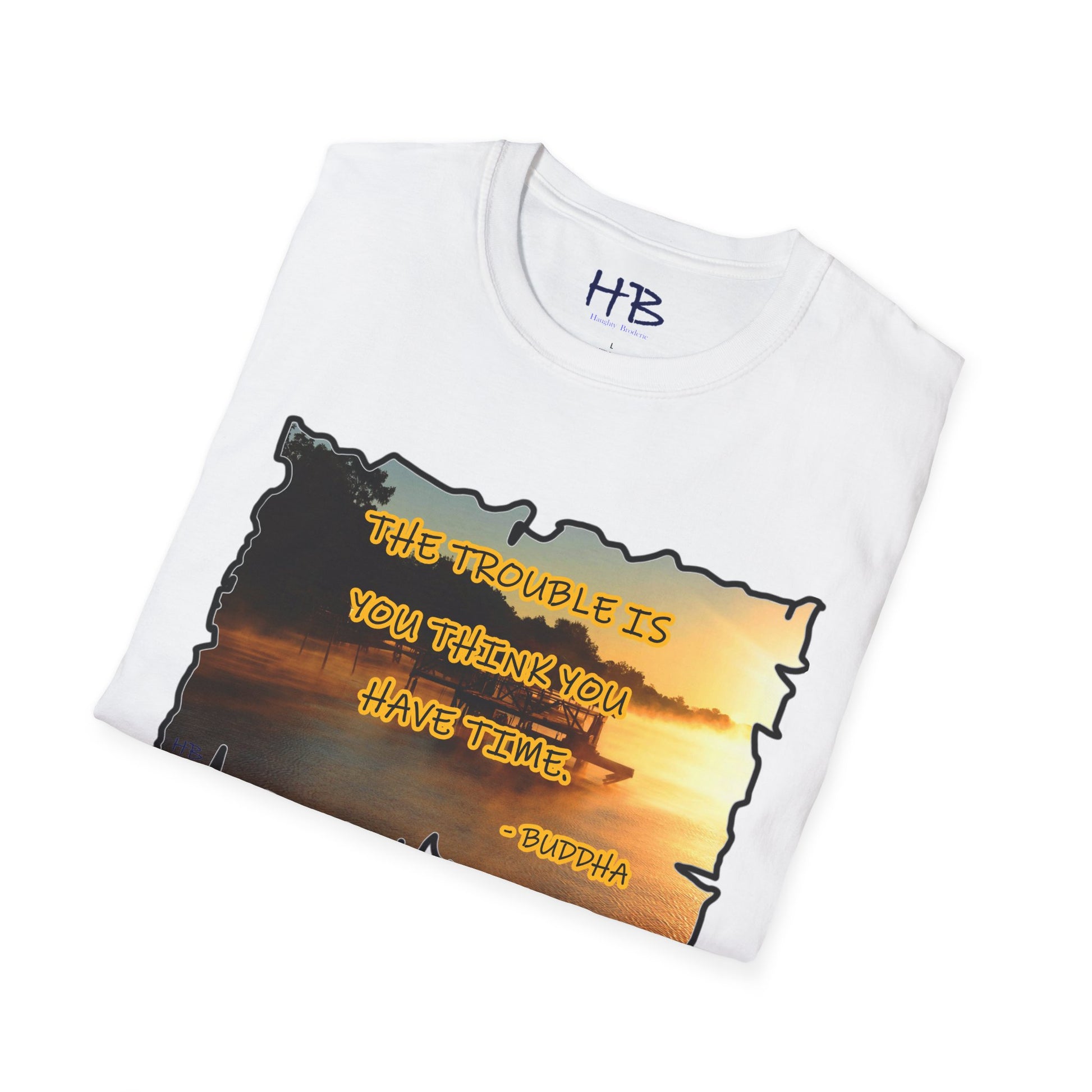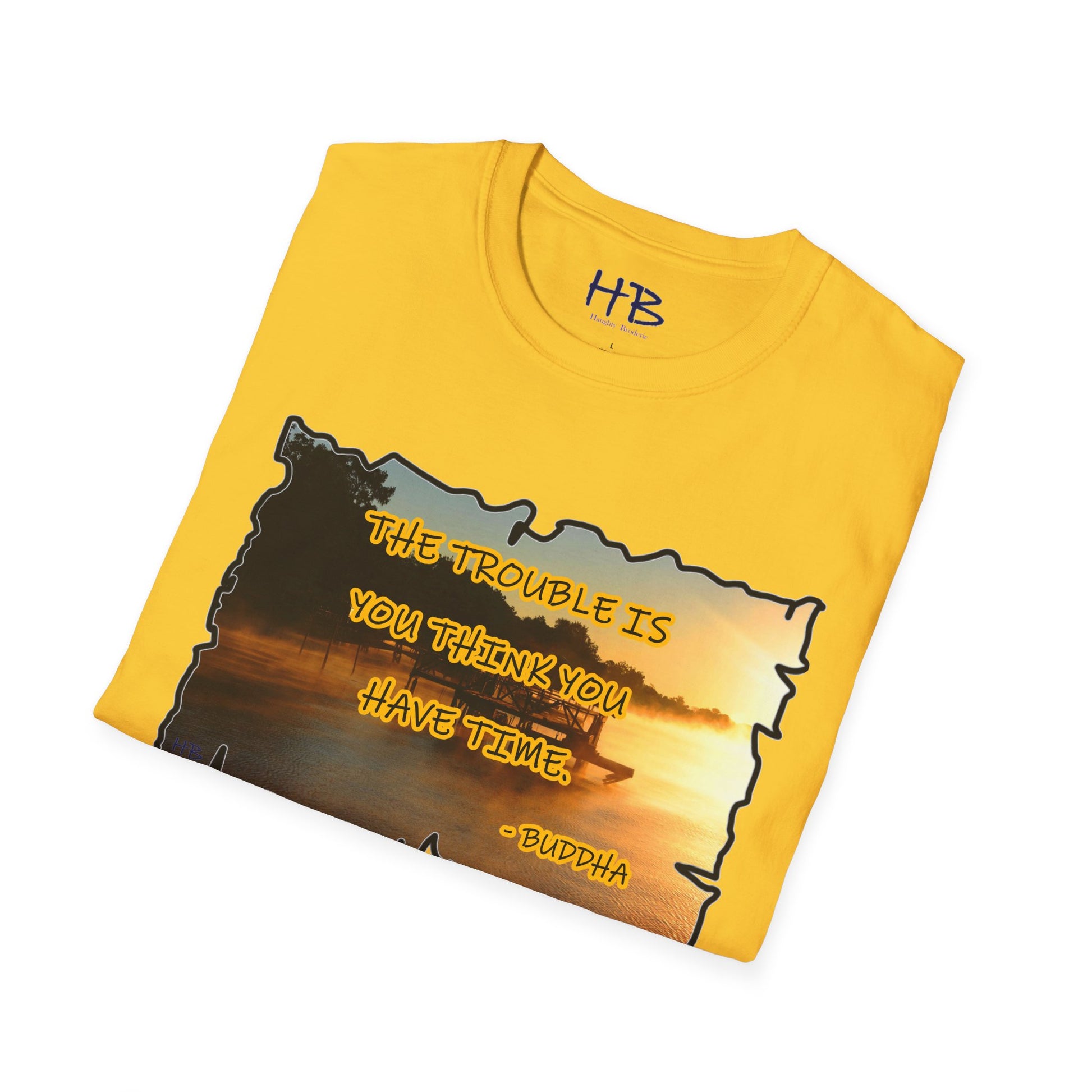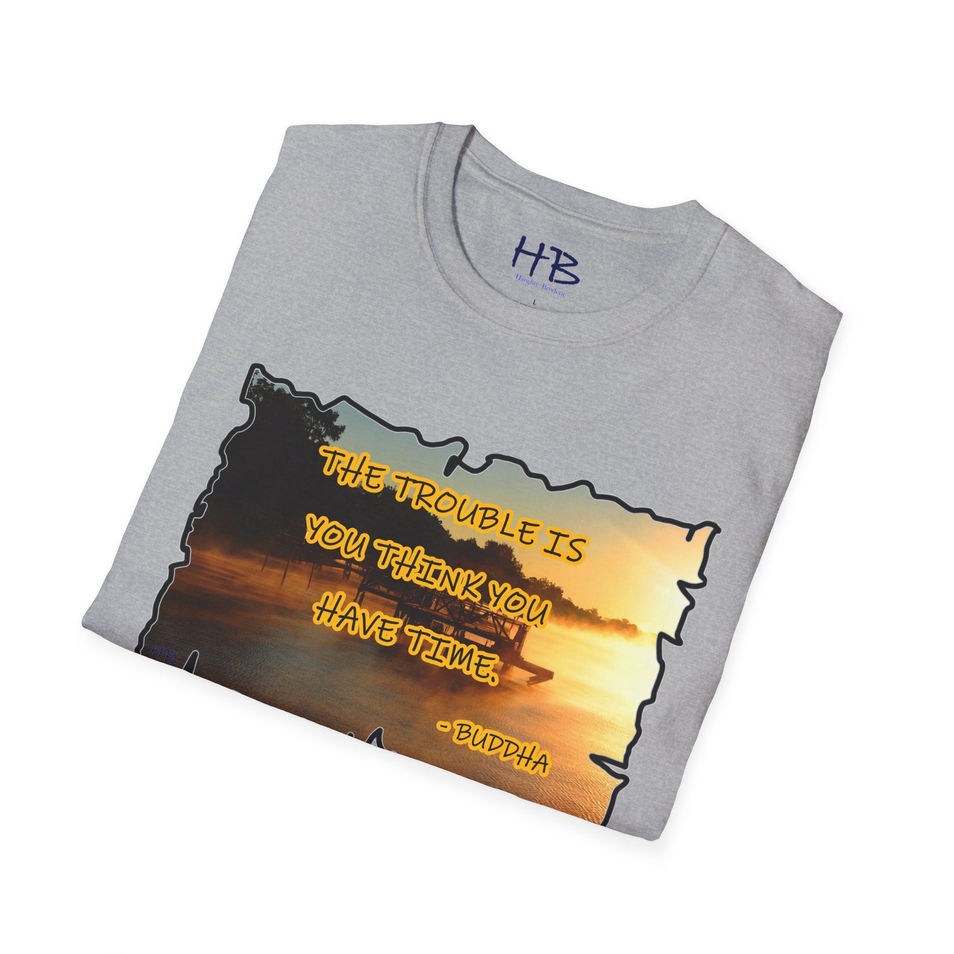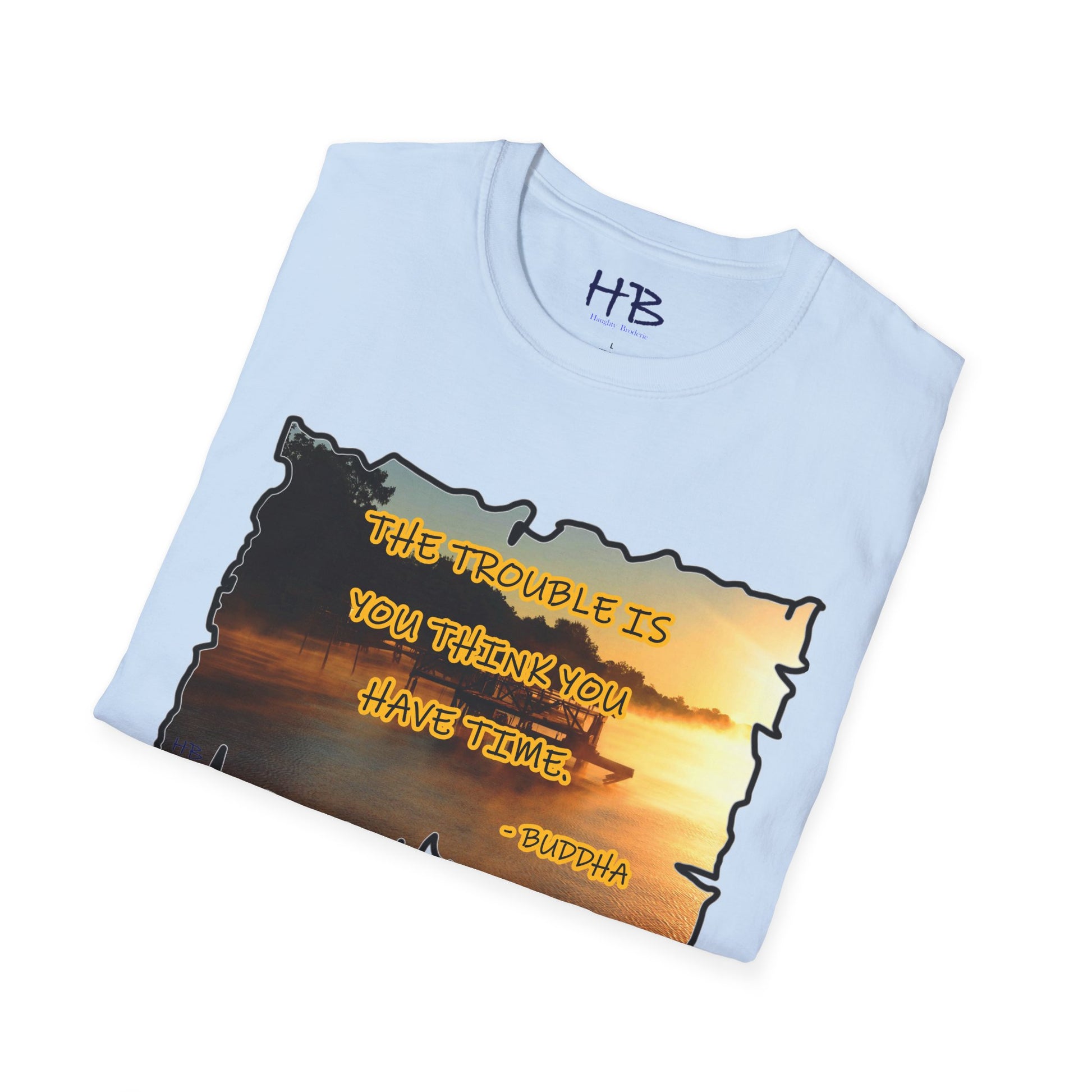Introducing our exclusive "Ephemeral Tranquility" T-shirt, a wearable masterpiece that captures the essence of fleeting moments and profound wisdom. Picture this: a serene lake veiled in mist, a rustic wooden dock stretching into the hazy abyss. The entire scene bathed in a warm, golden glow, echoing the timeless words of Buddha: "The truth is you think you have time."