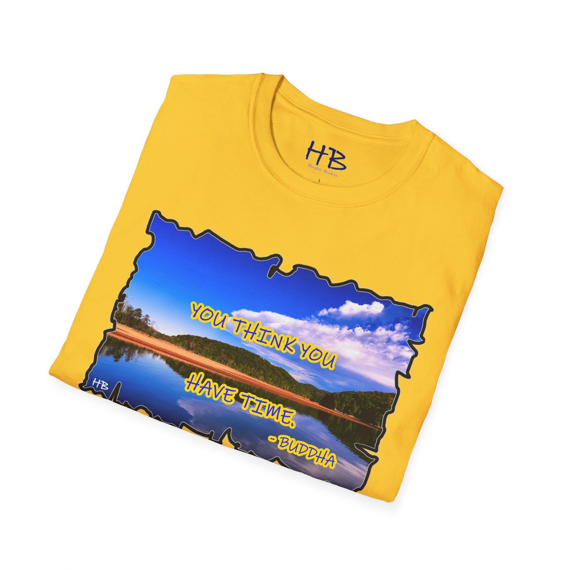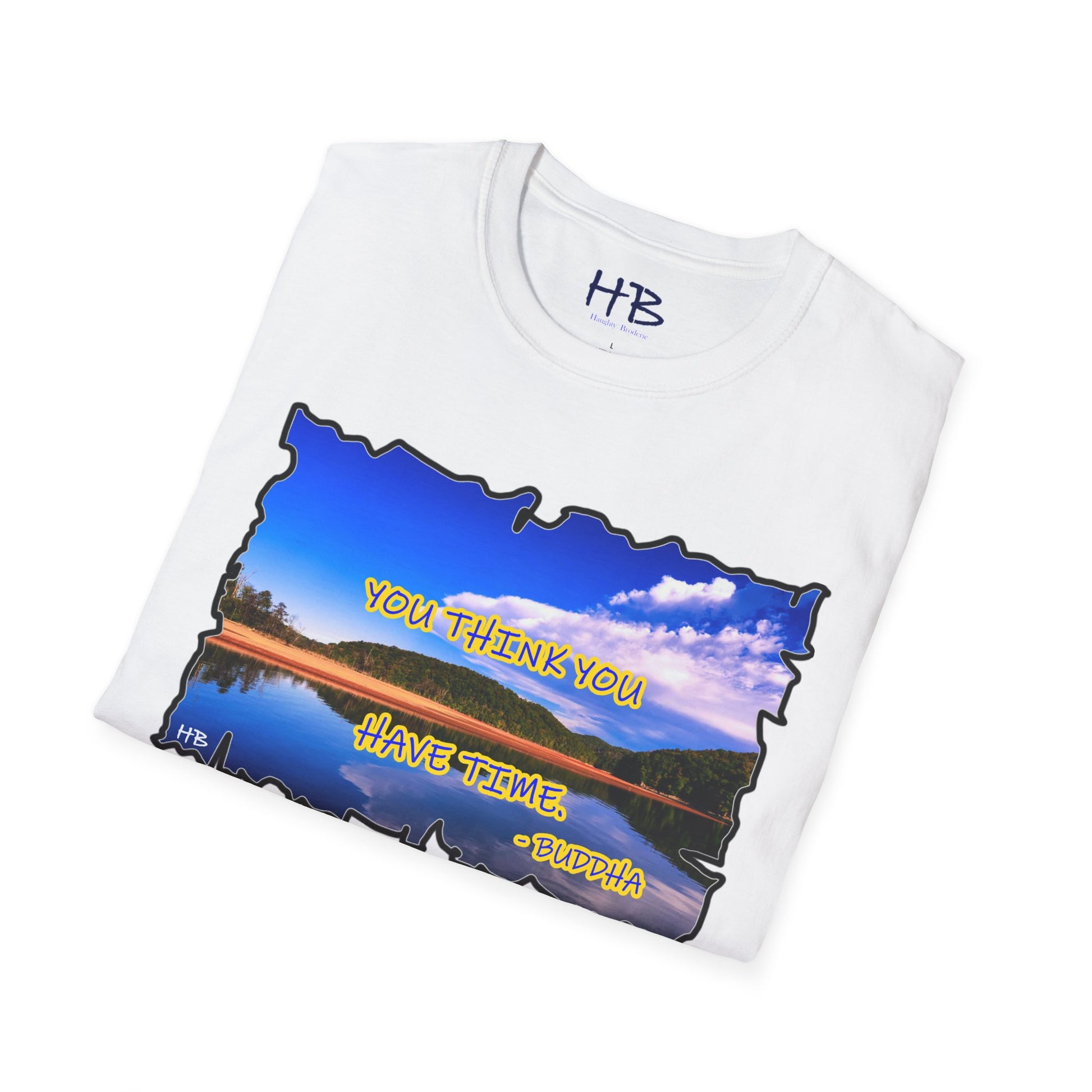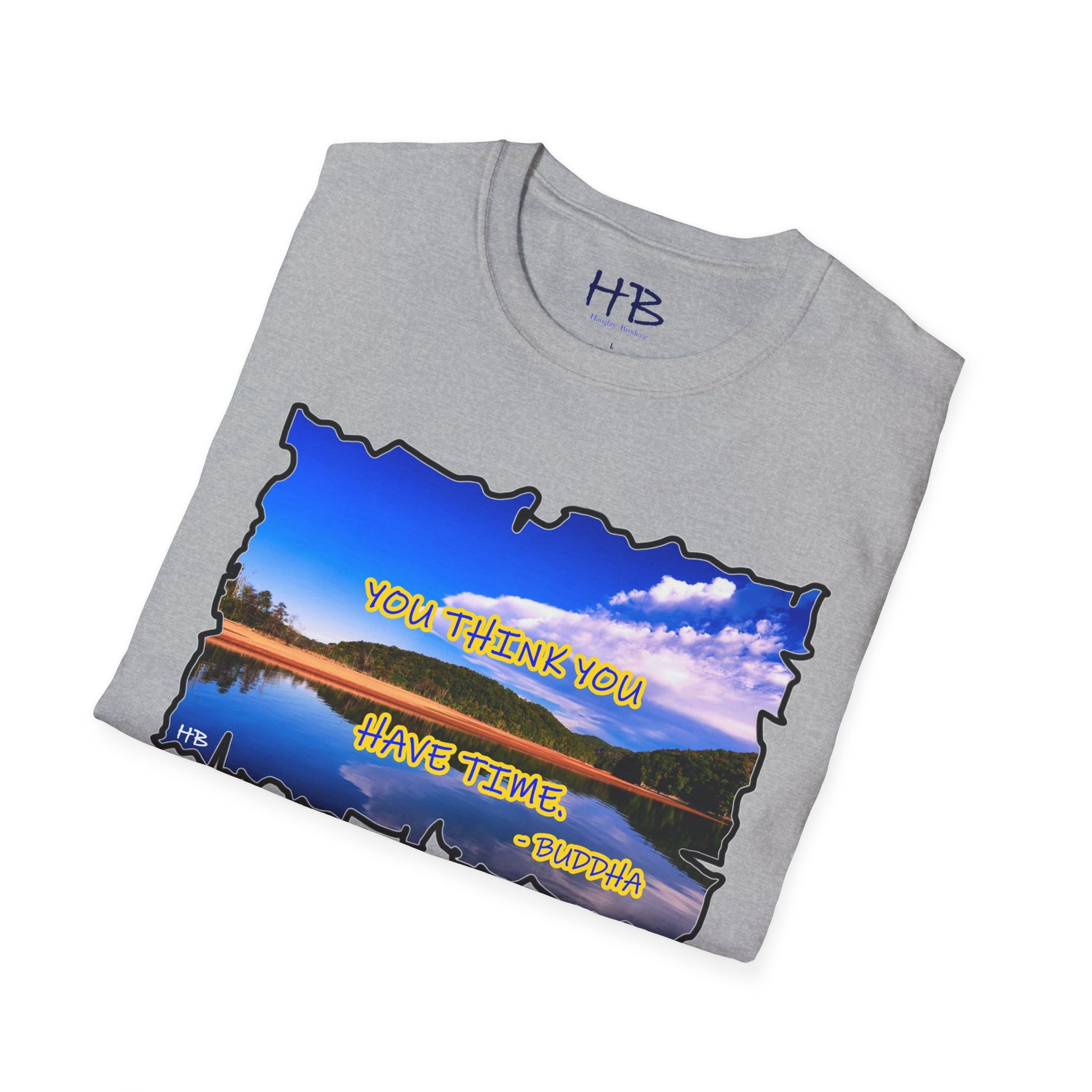Introducing our latest masterpiece, the Azure Tranquility Essence Unveiled Tunic! Envelop yourself in the sublime allure of nature's canvas, where the cerulean sky embraces a lake's gentle coast adorned with a myriad of trees. This picturesque scene not only captures the essence of serenity but also imparts profound wisdom through the poignant words, "The truth is you think you have time - Buddha."