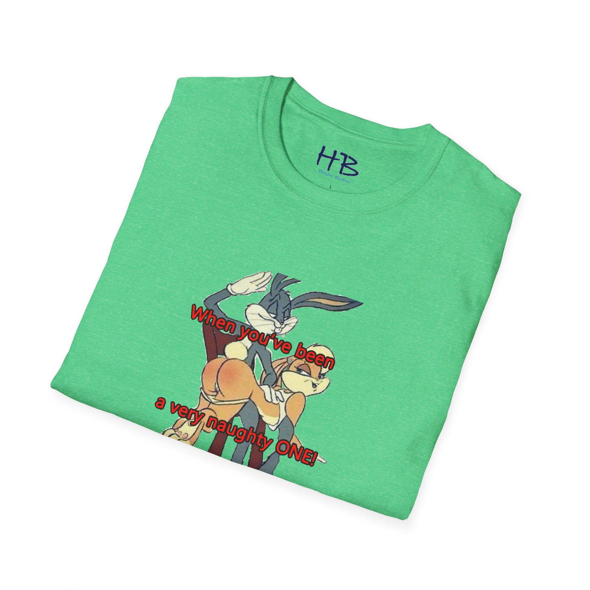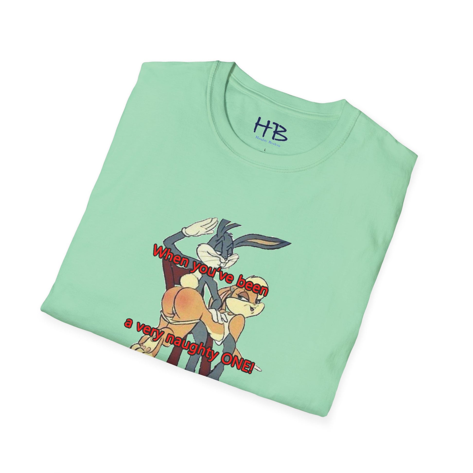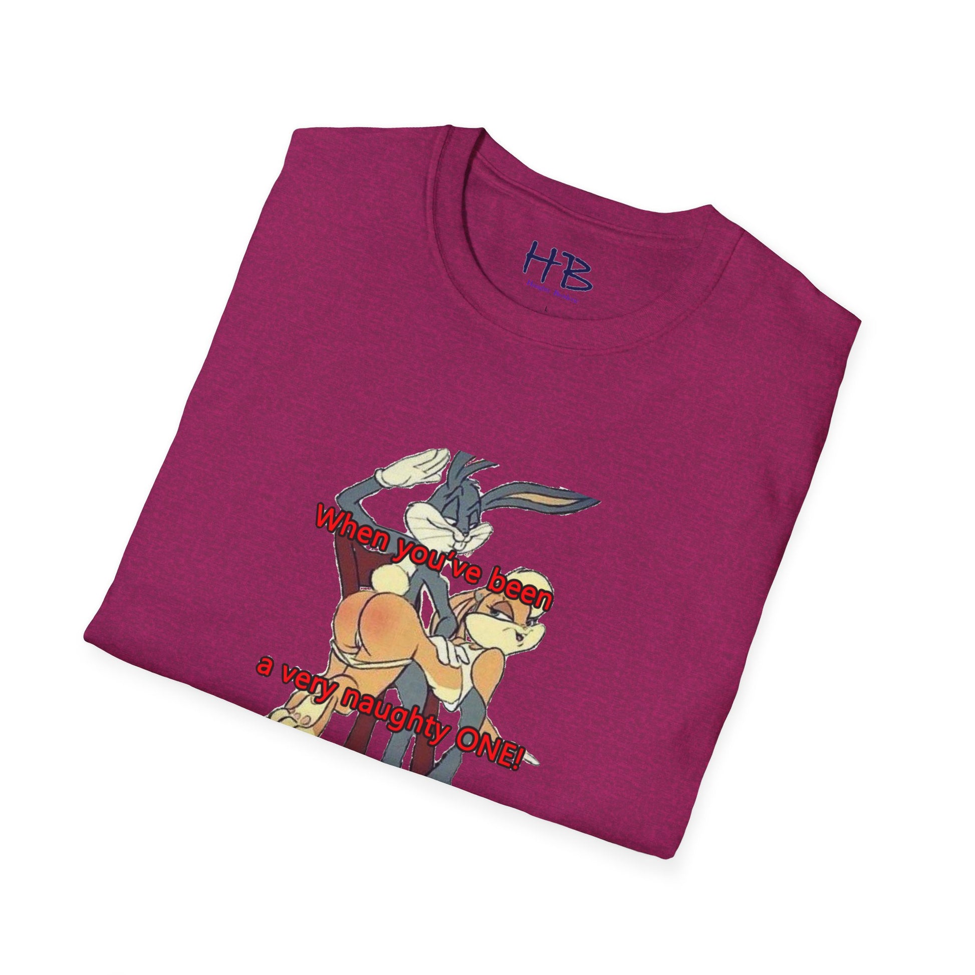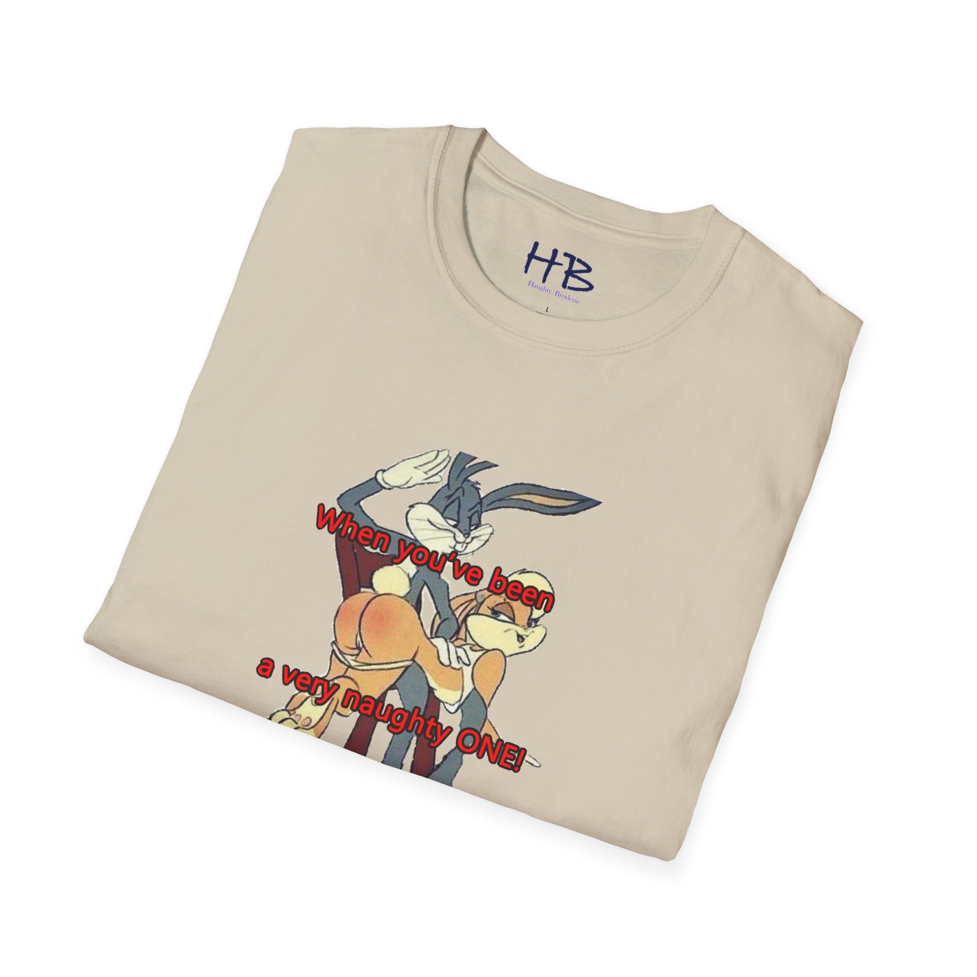The design is completed with the text "When you've been a naughty ONE!!" which adds a touch of fun and playfulness to the overall design. This tee shirt is made of high-quality materials that are soft and comfortable to wear, making it perfect for any casual occasion. The fabric is breathable and lightweight, allowing you to wear it for long hours without any discomfort.